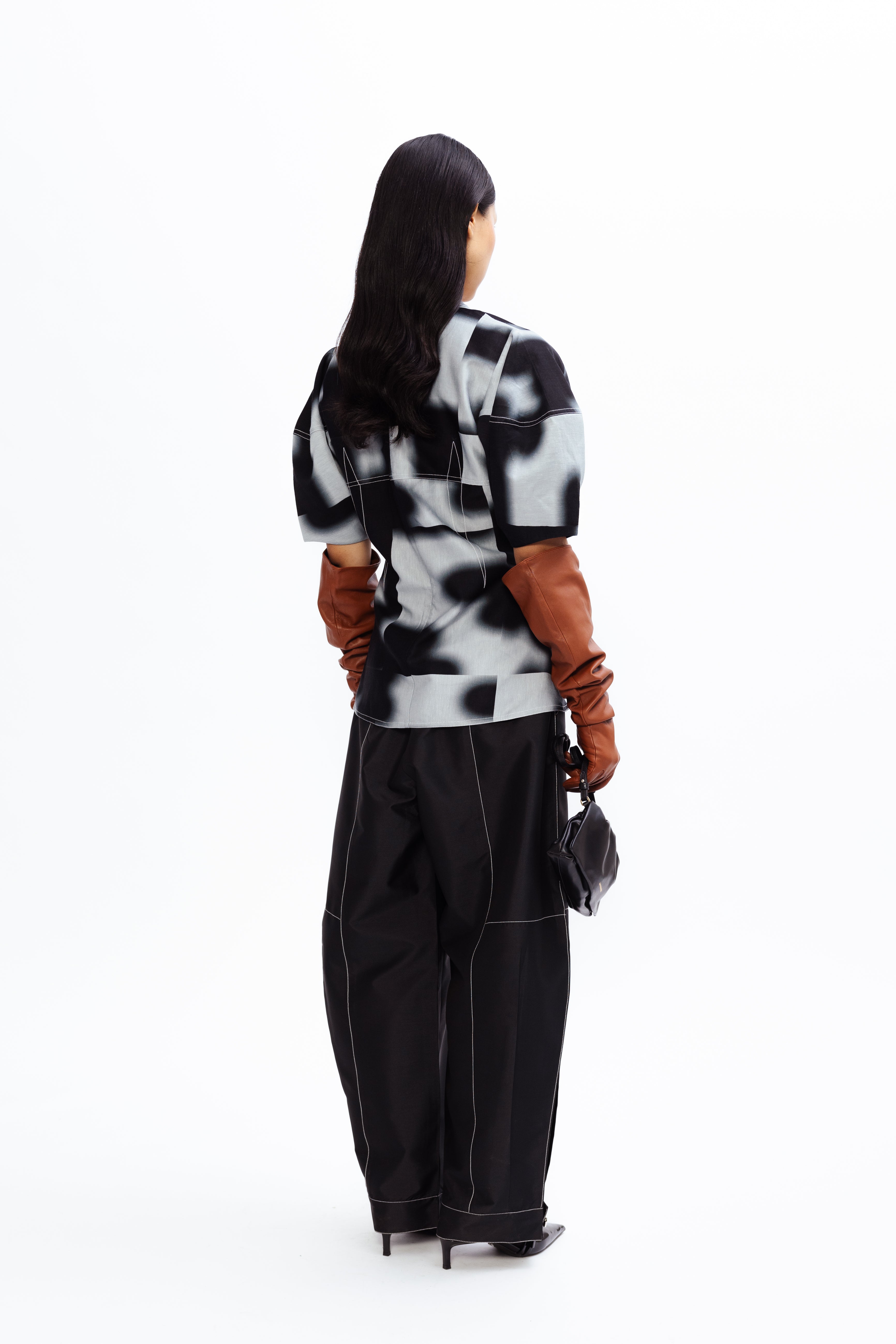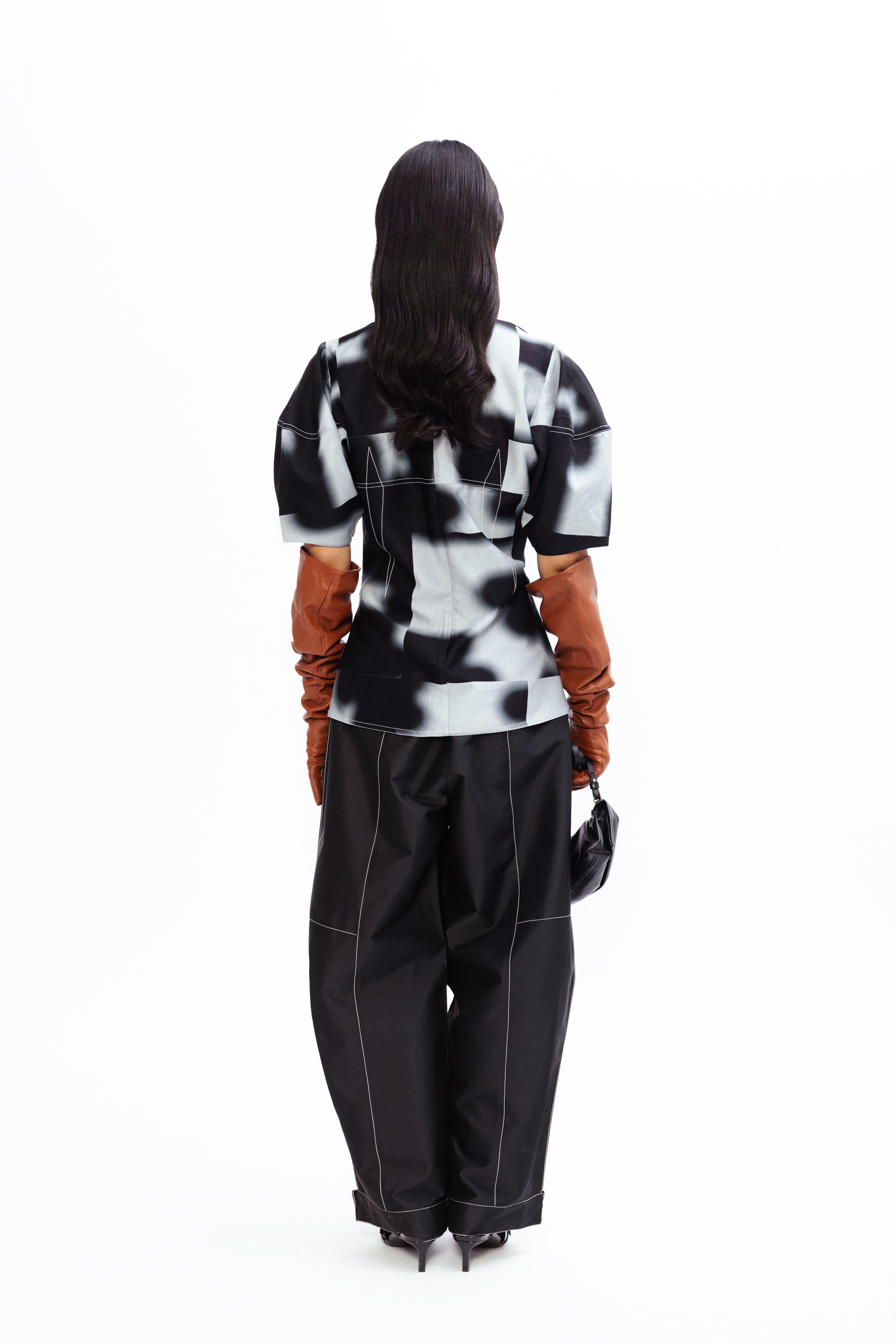A graceful top featuring short puff sleeves. The fluid drape and subtle sheen of the fabric add an effortless elegance, creating a perfect blend of sophistication and ease for both day and evening wear.