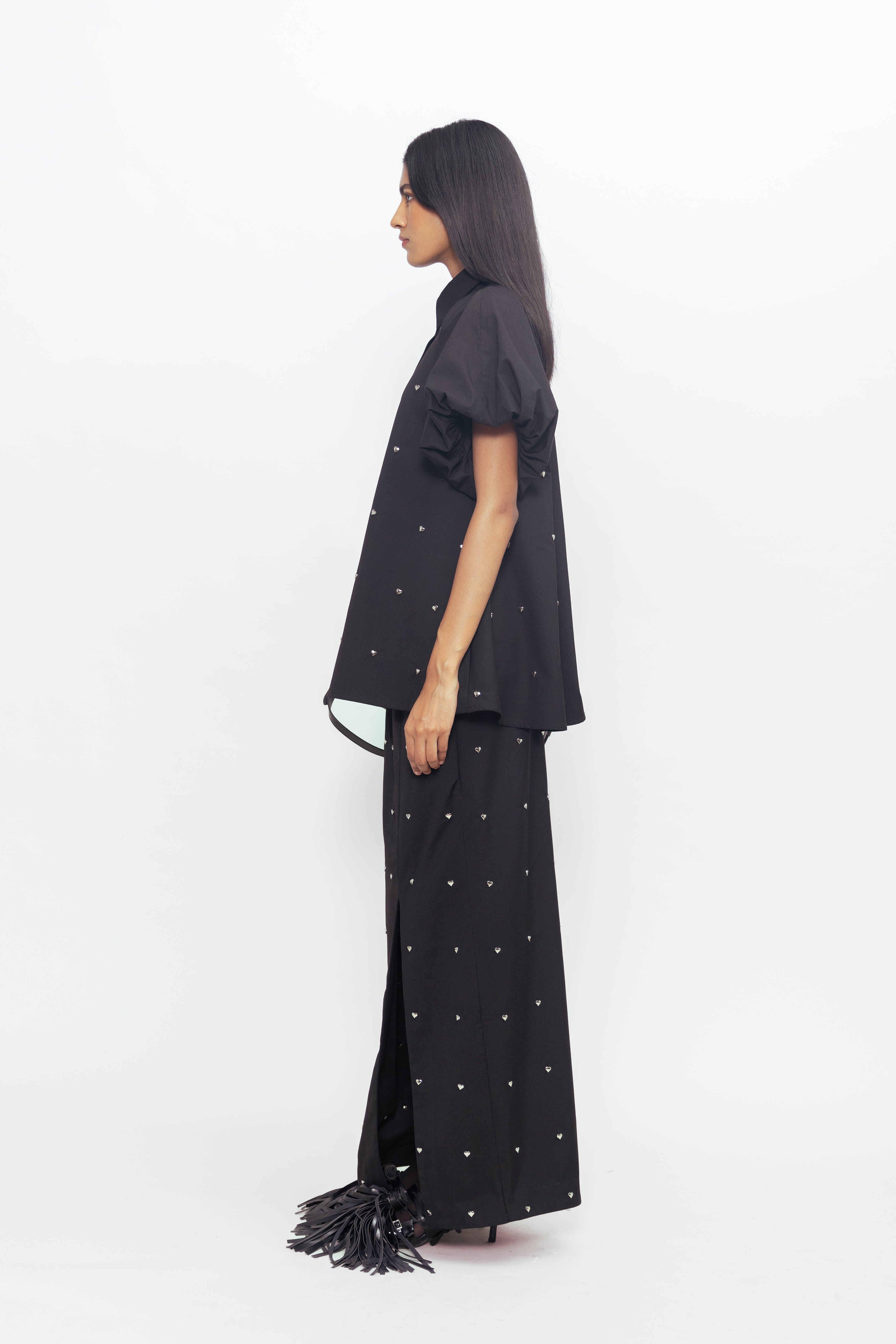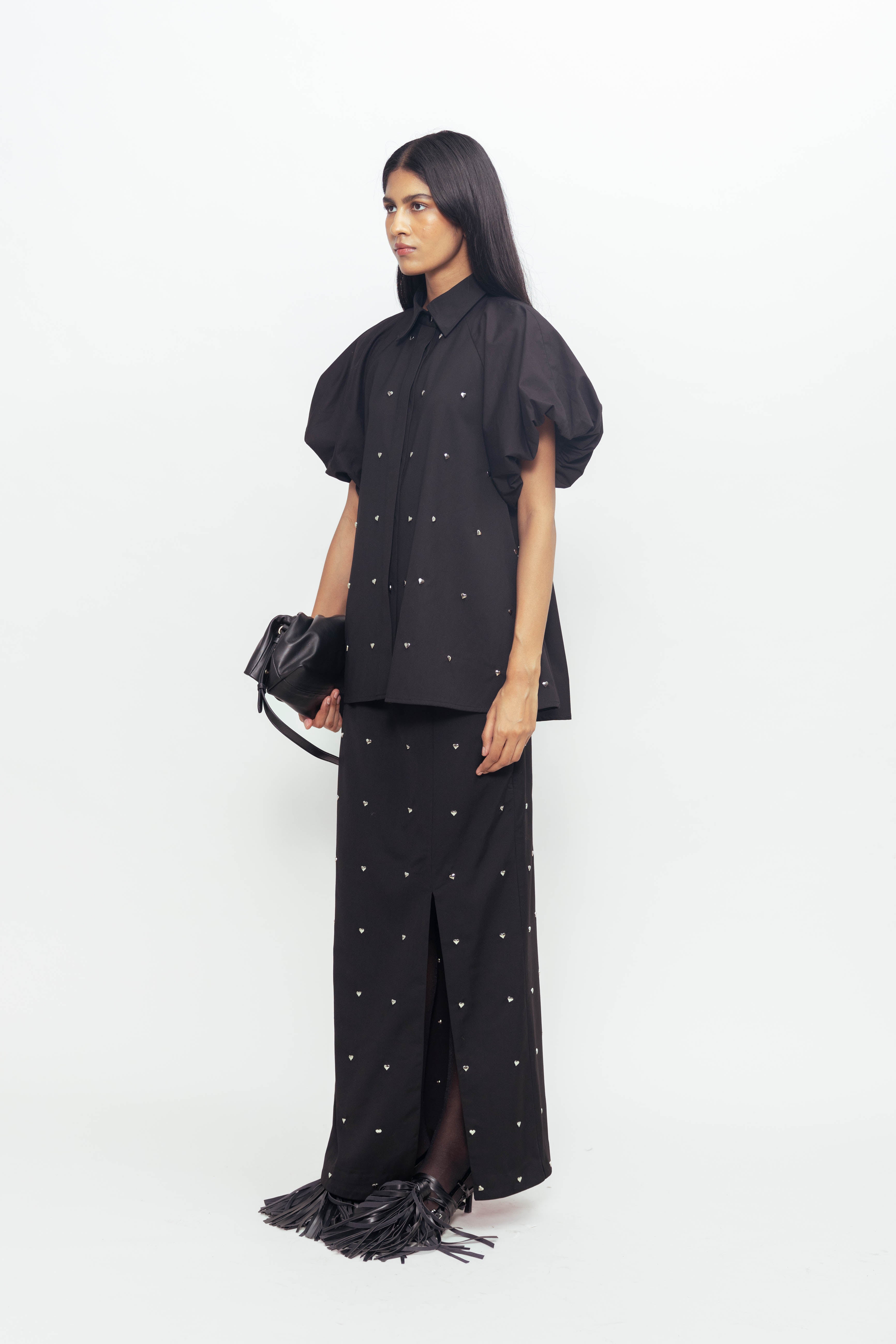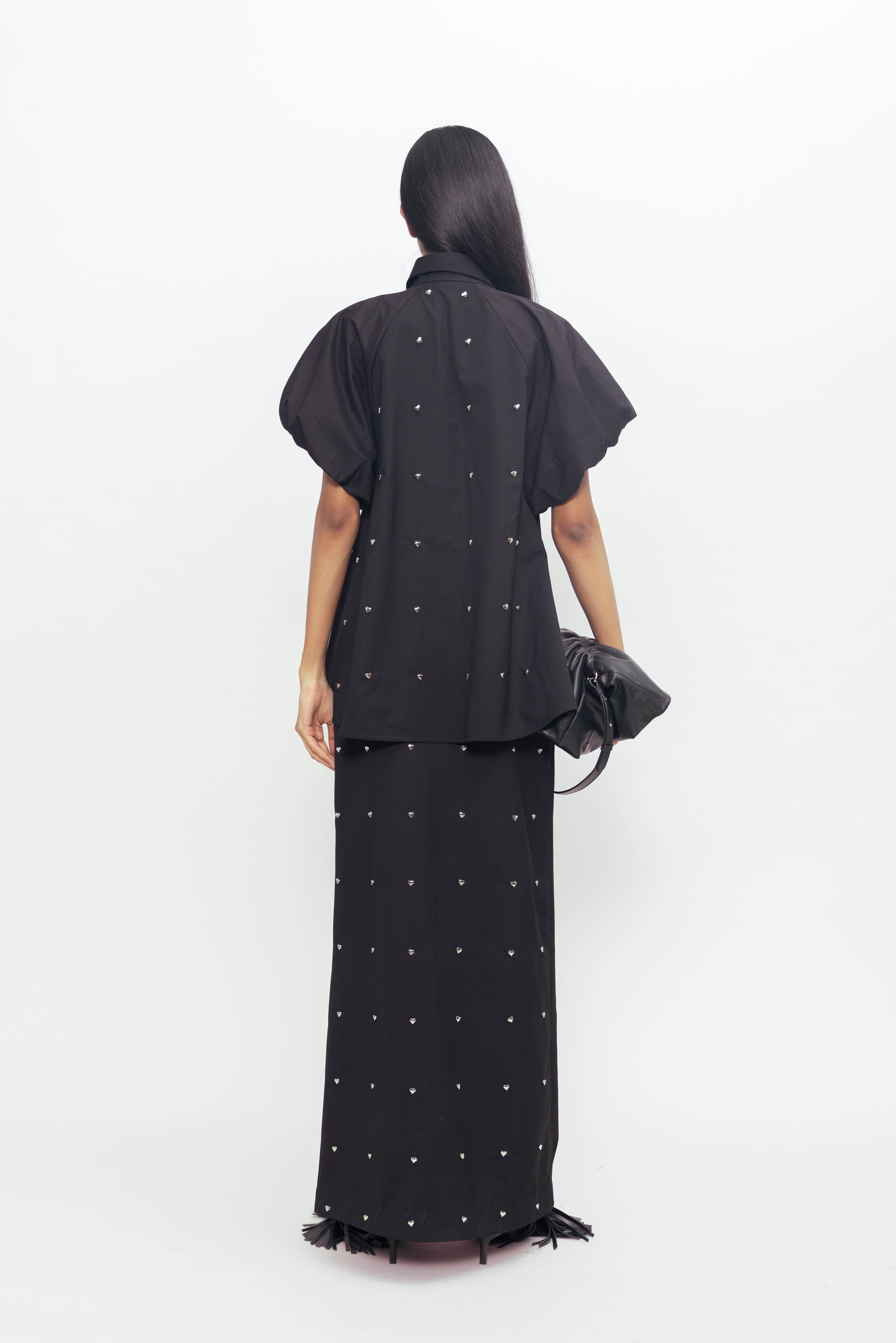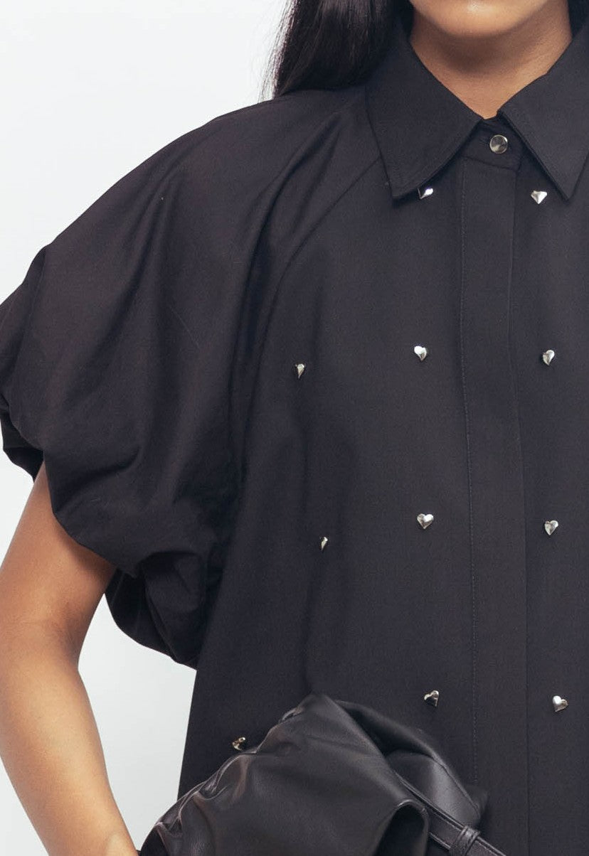 Romantic yet refined, this statement piece features delicately puffed sleeves and eye-catching heart-shaped rivets that add a touch of playful edge. Designed with clean lines and a soft drape, it offers a flattering silhouette that transitions effortlessly from day to night. Whether styled with tailored trousers or your favorite denim, it brings an effortless charm to any outfit.
