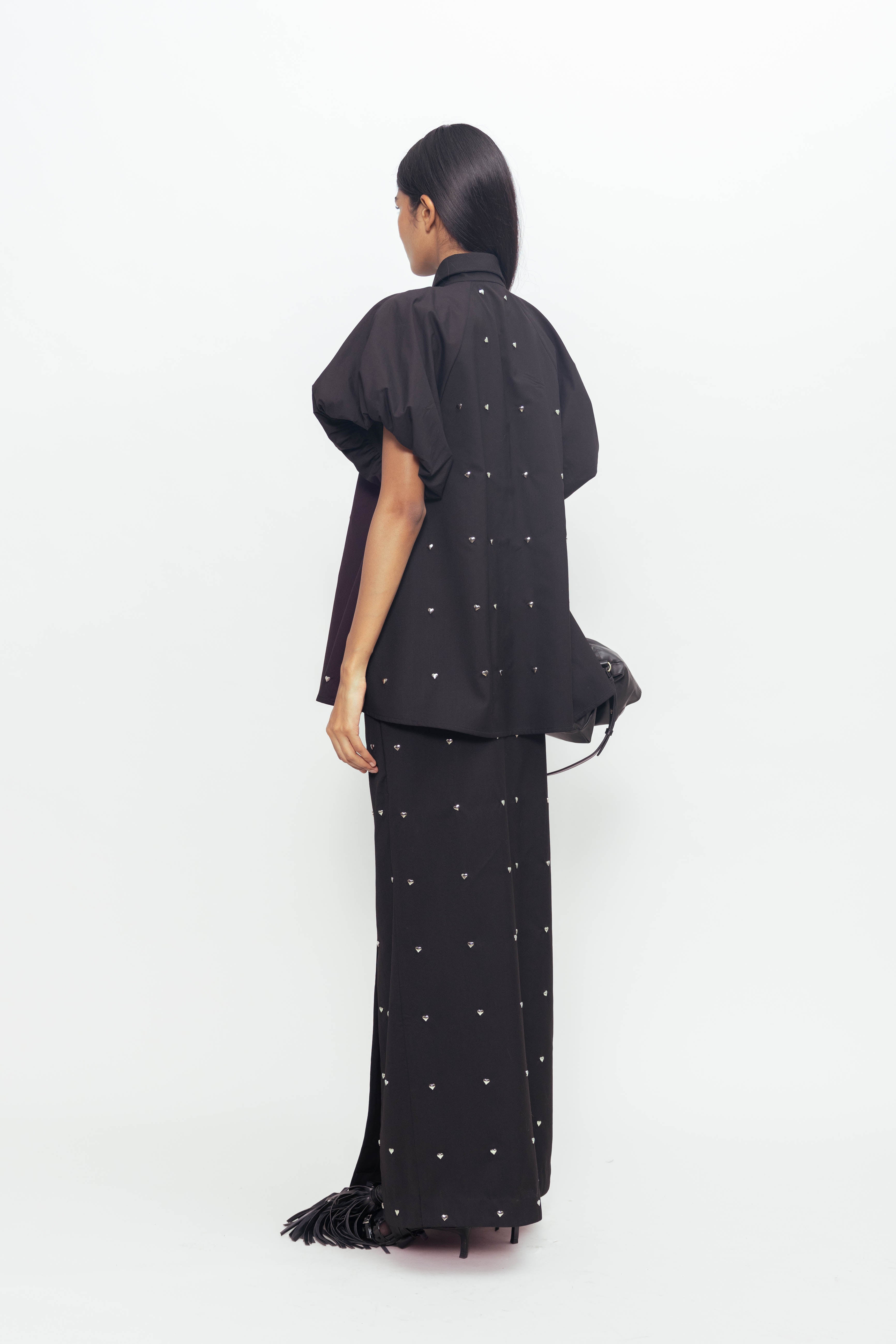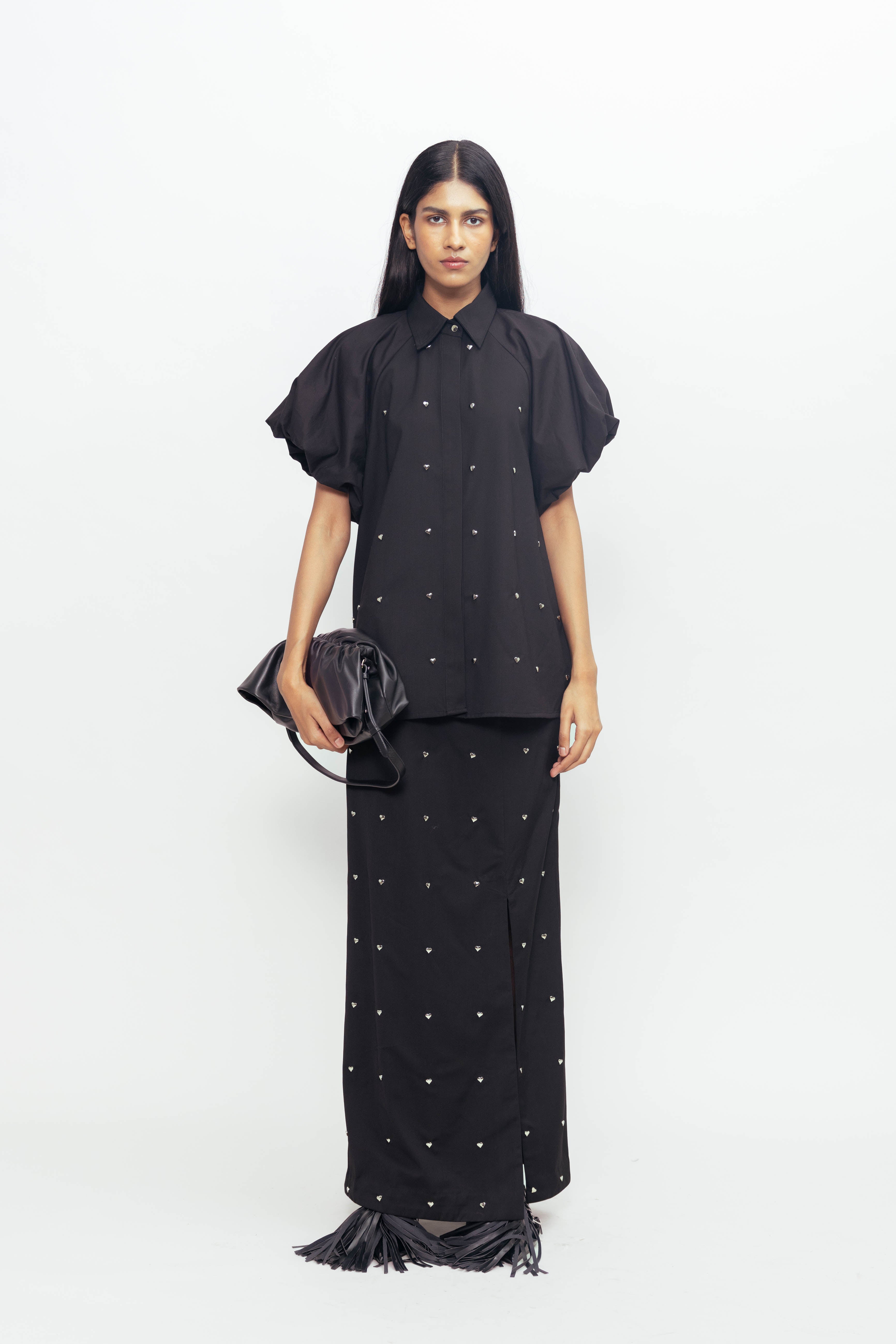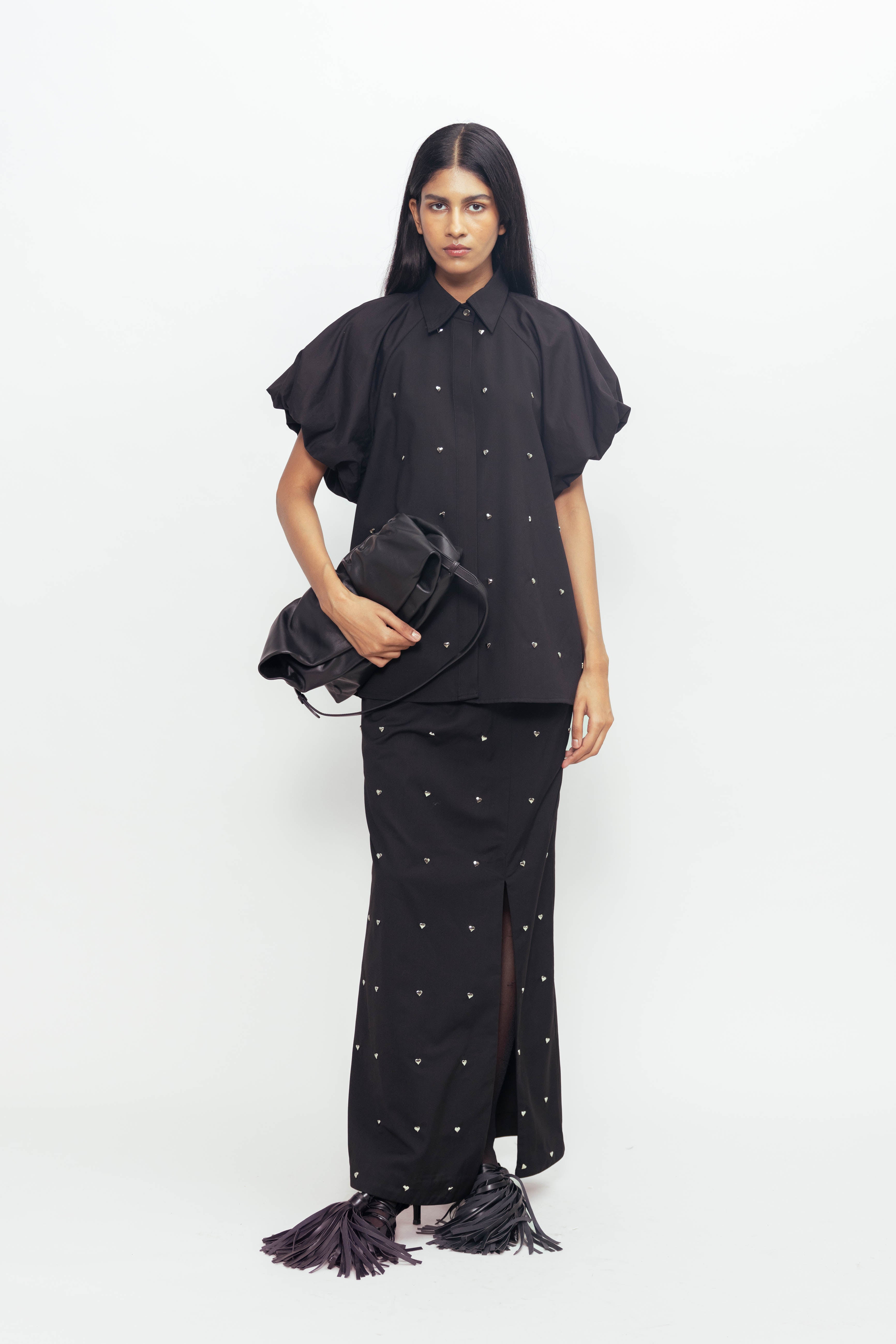 Romantic yet refined, this statement piece features delicately puffed sleeves and eye-catching heart-shaped rivets that add a touch of playful edge. Designed with clean lines and a soft drape, it offers a flattering silhouette that transitions effortlessly from day to night. Whether styled with tailored trousers or your favorite denim, it brings an effortless charm to any outfit.