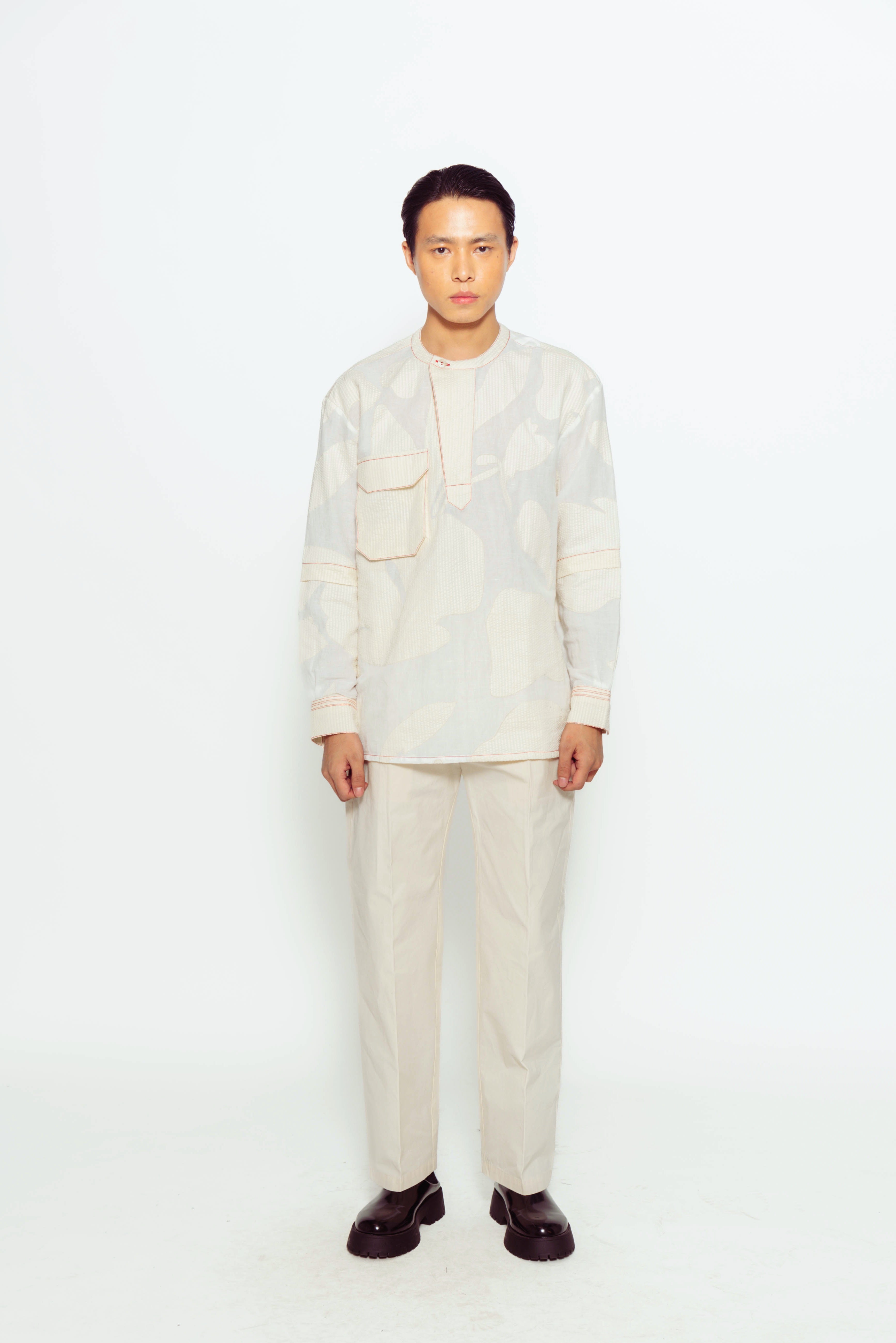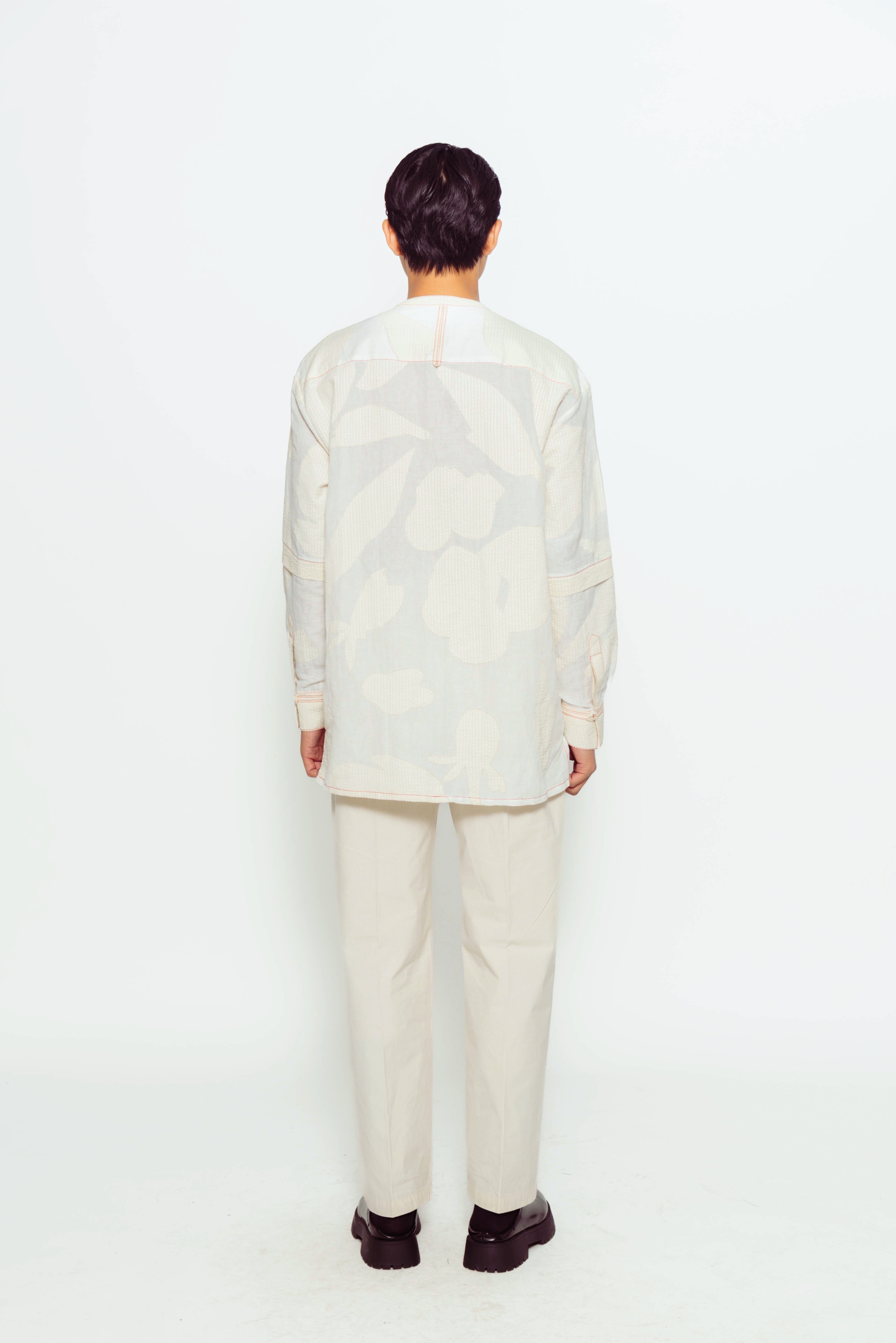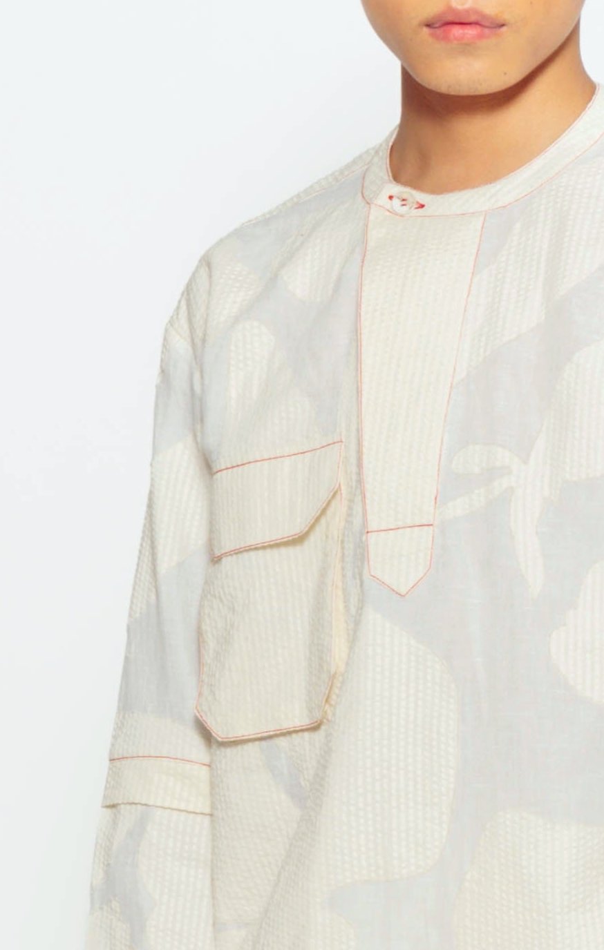 This floral appliqued full-sleeve shirt features a soft, textured design with intricate floral patterns. It has chest patch pockets, a round neck, and a half placket, combining comfort with a stylish, cozy look ideal for casual wear.