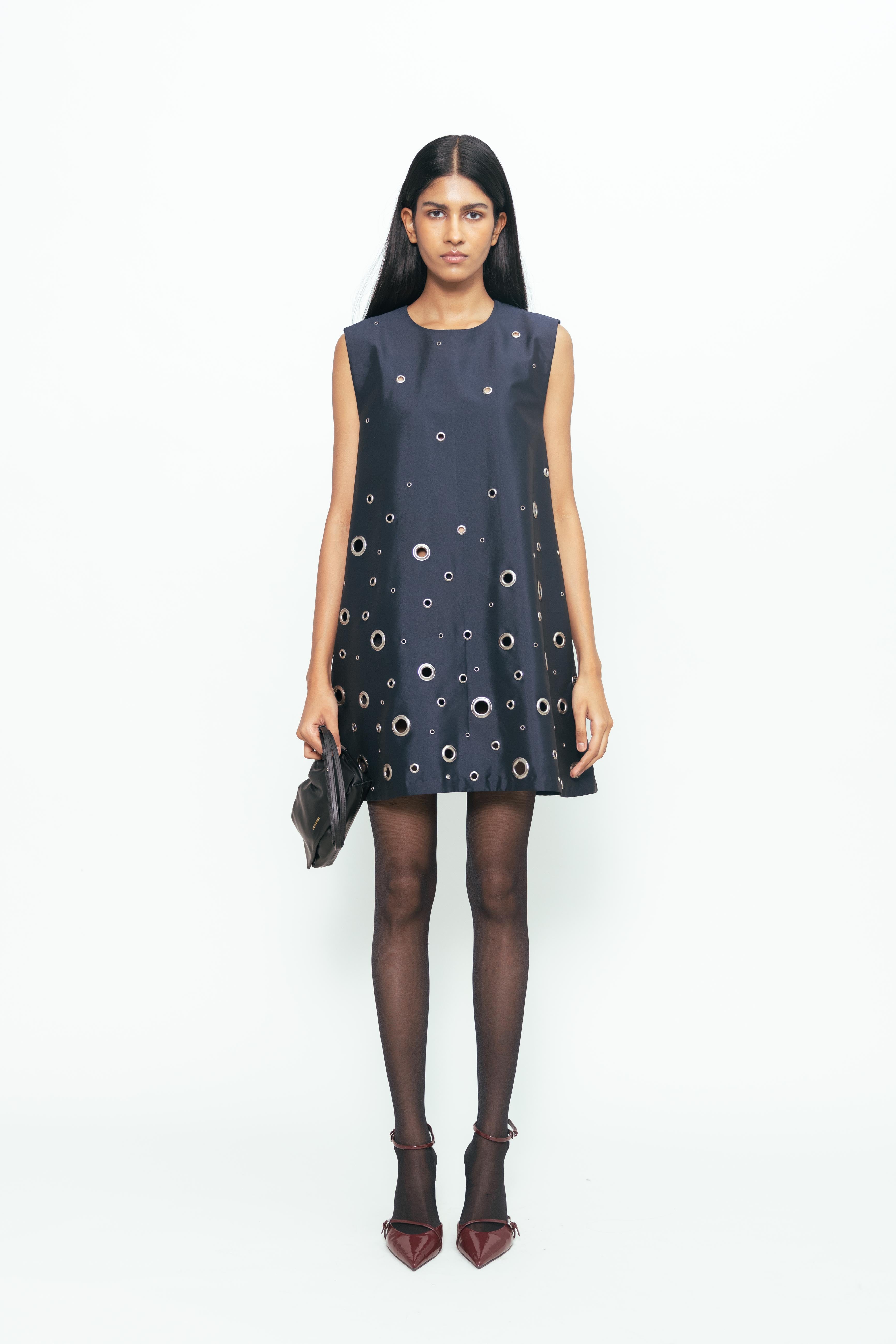 This Cocktail Dress with Rivets Burst features a sleek, body-contouring fit with a bold rivet burst design across the bodice. Crafted in Taffeta, it offers both comfort and structure for evening wear.