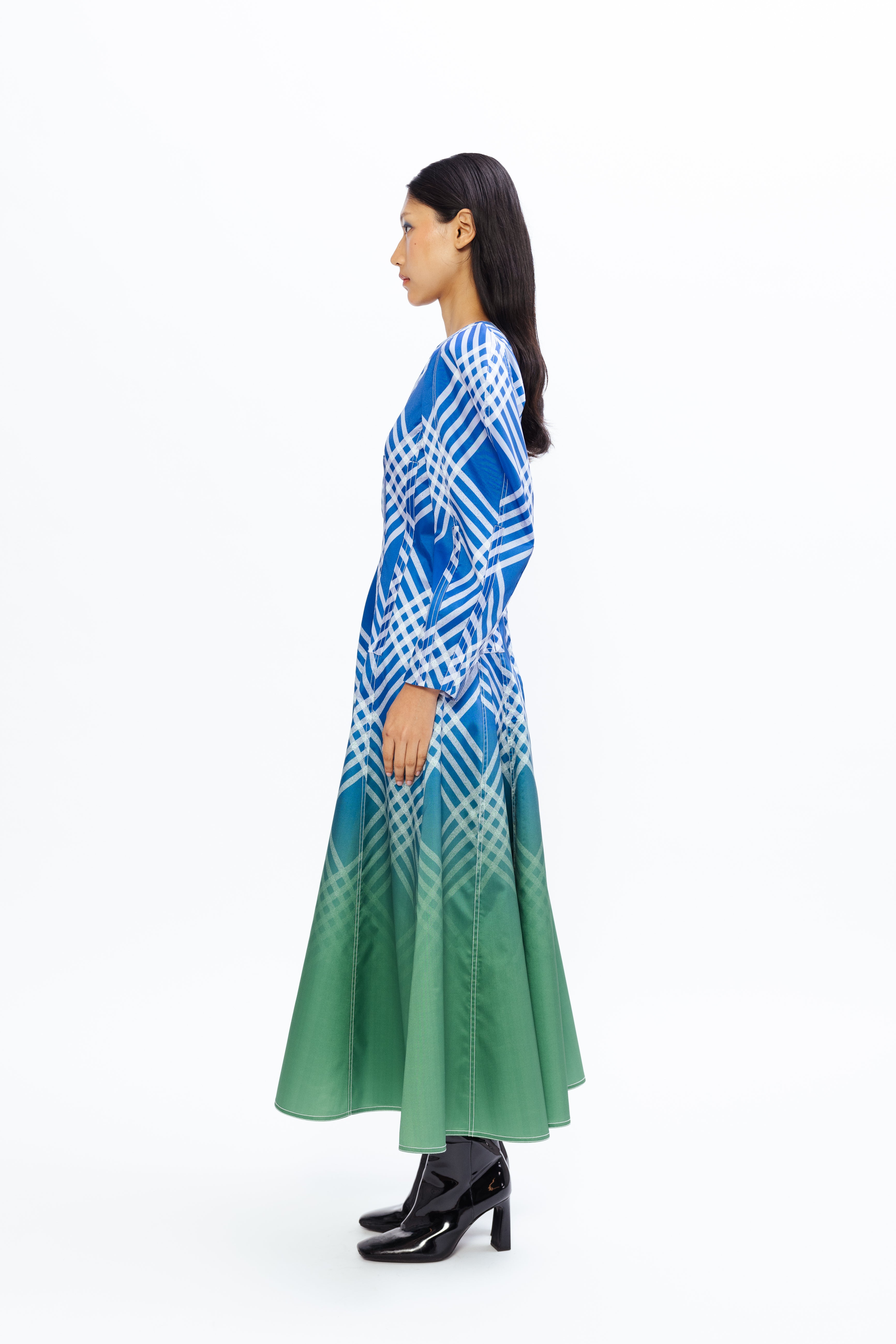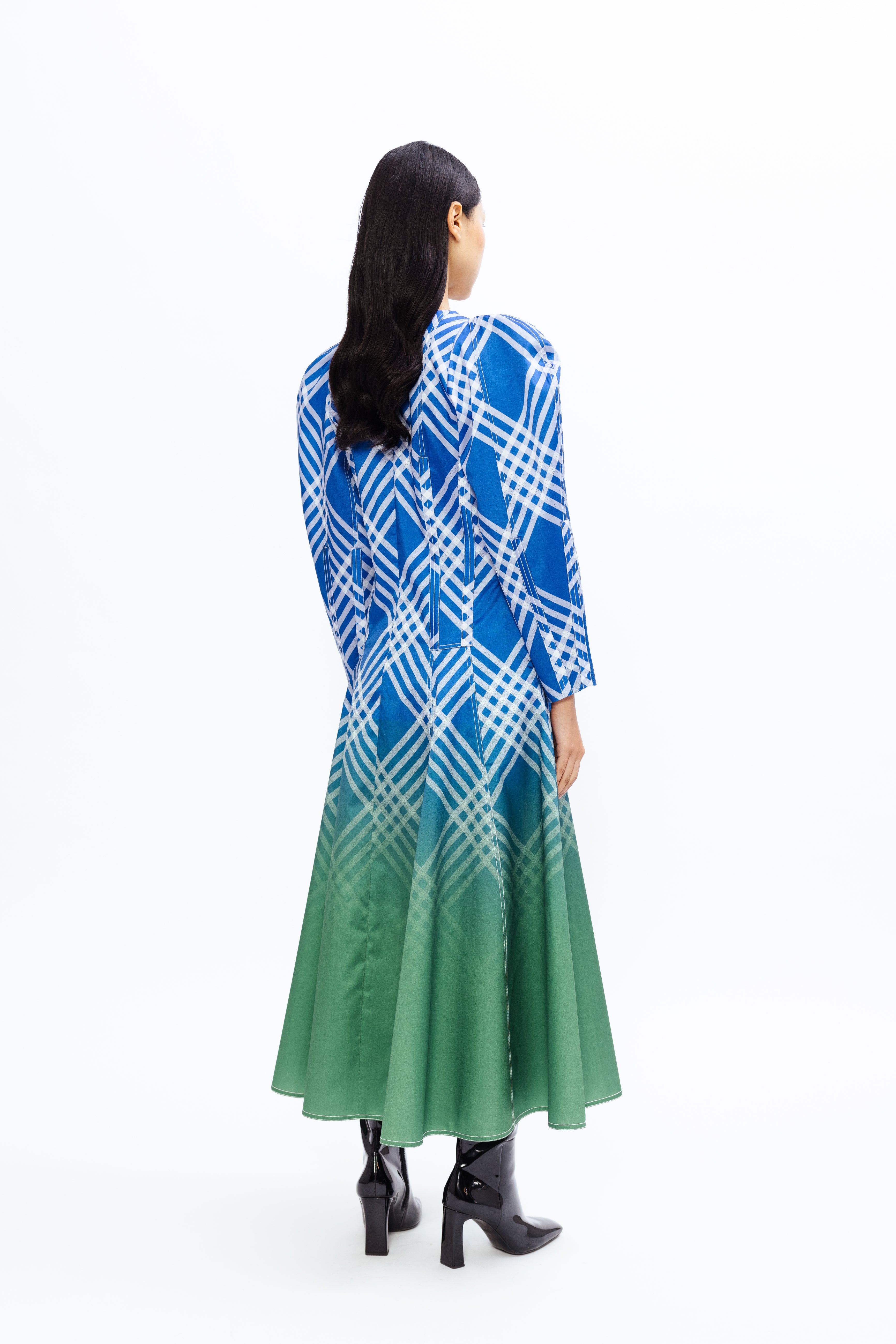 This elegant midi dress features a classic fit-and-flare silhouette with leg-of-mutton sleeves that add a touch of vintage charm. The tartan ombré pattern brings playful vibrancy, while the full sleeves provide understated sophistication. Perfectly balancing style and comfort, it’s ideal for both daytime outings and evening events.