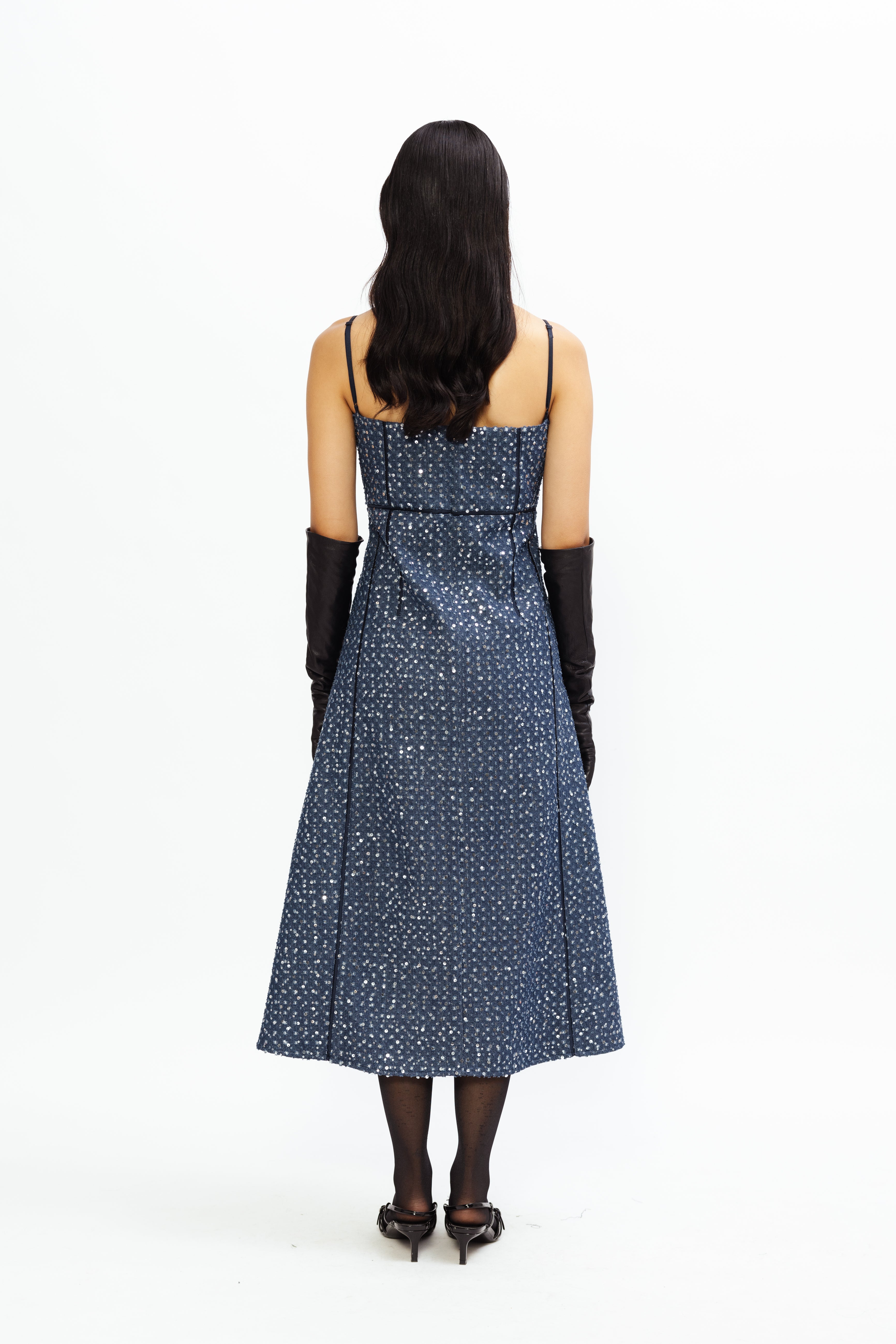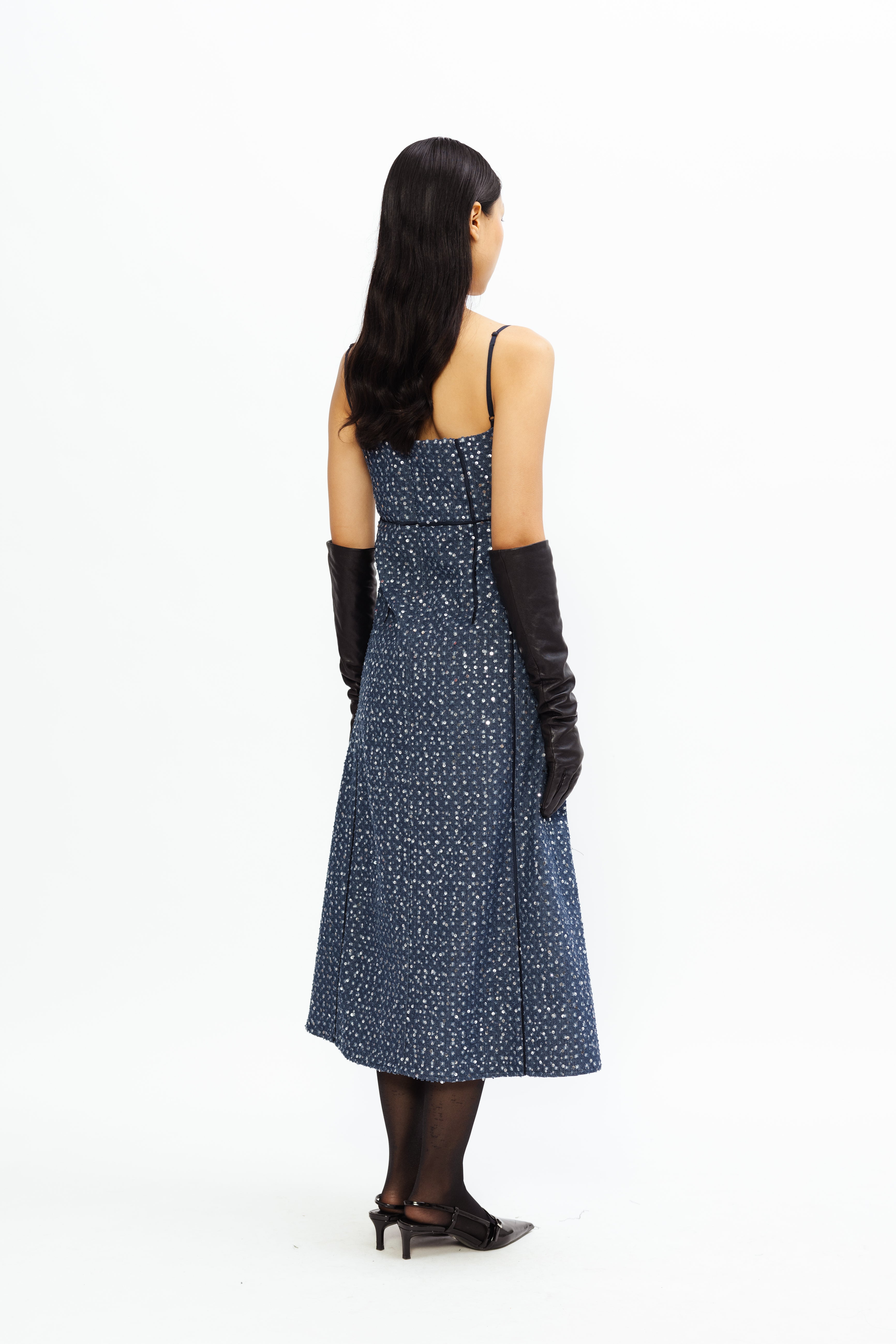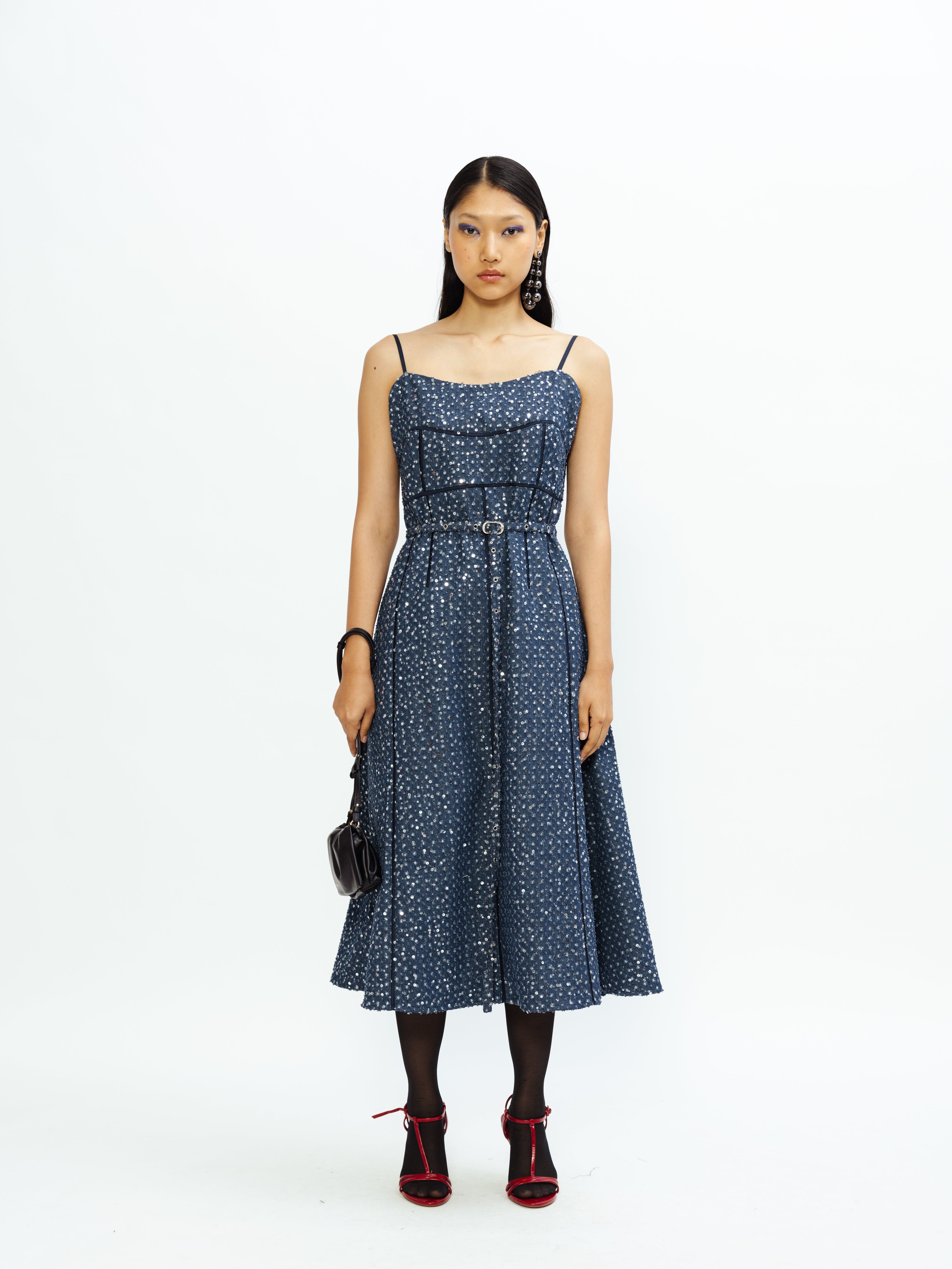 Featuring an all-over scattered dot pattern, this dress adds texture and visual intrigue while maintaining a refined aesthetic. The defined waist seam accentuates the waistline, creating a flattering, tailored silhouette. With its blend of modern charm and subtle vintage inspiration, it’s a chic and versatile addition to any wardrobe.