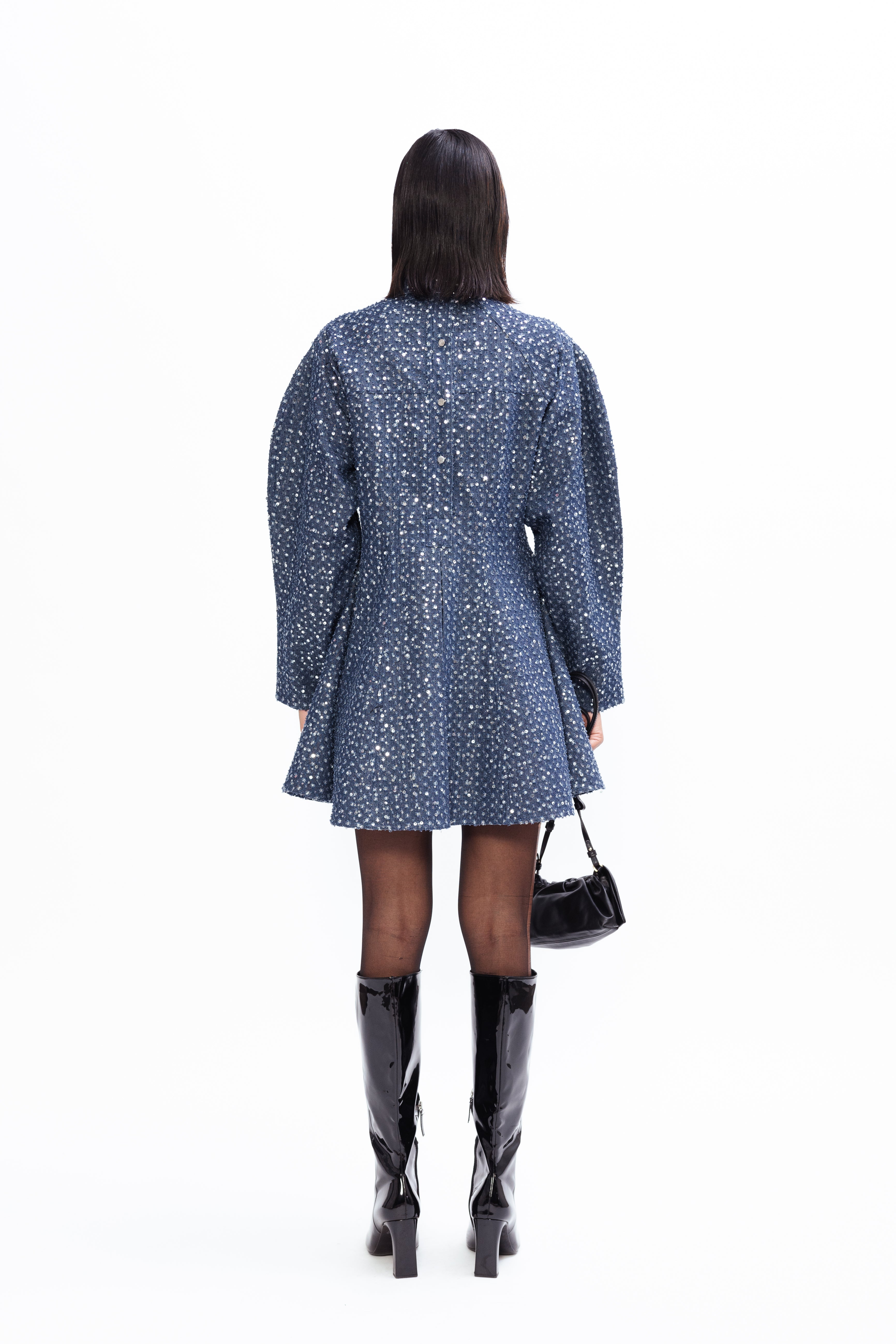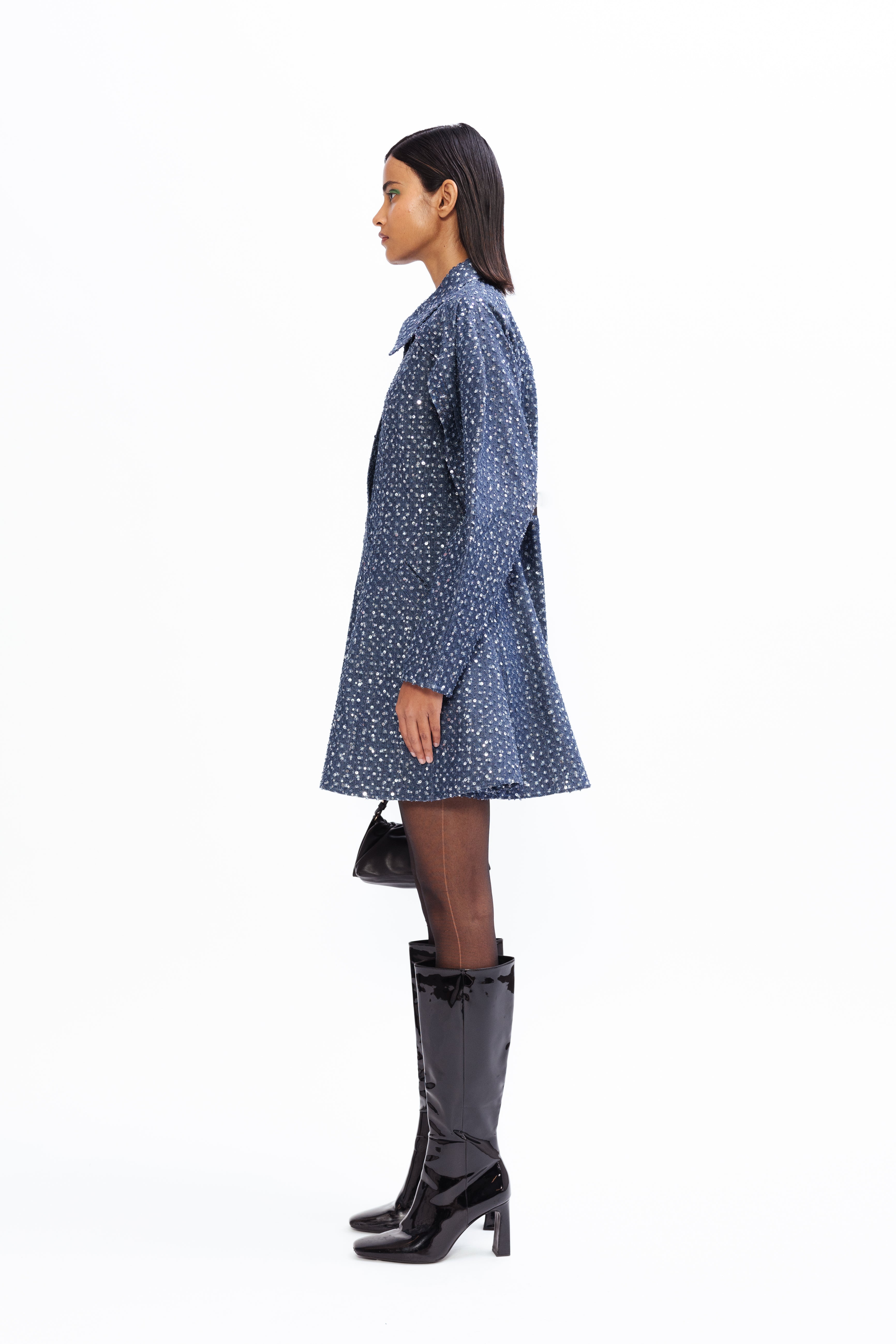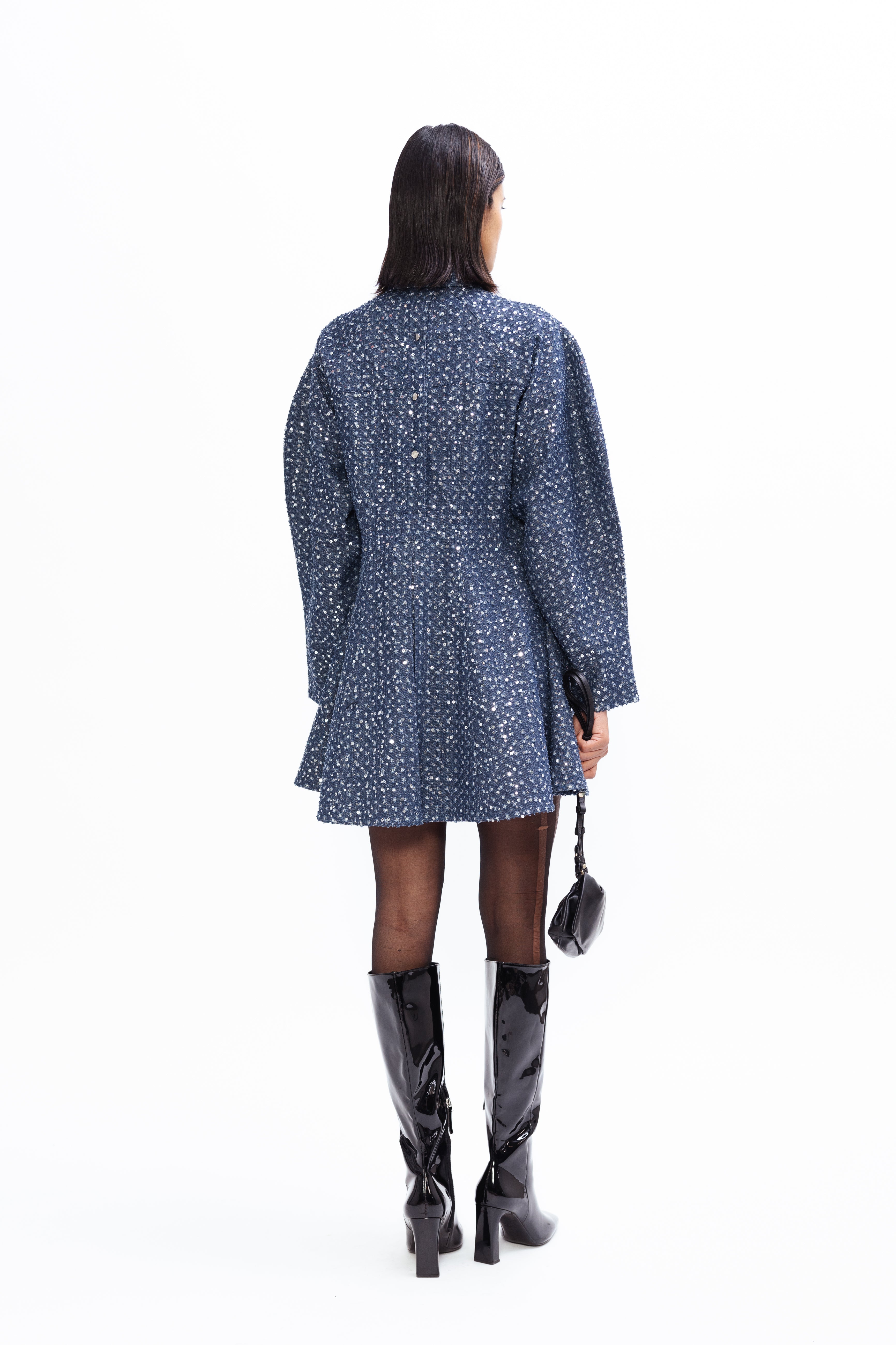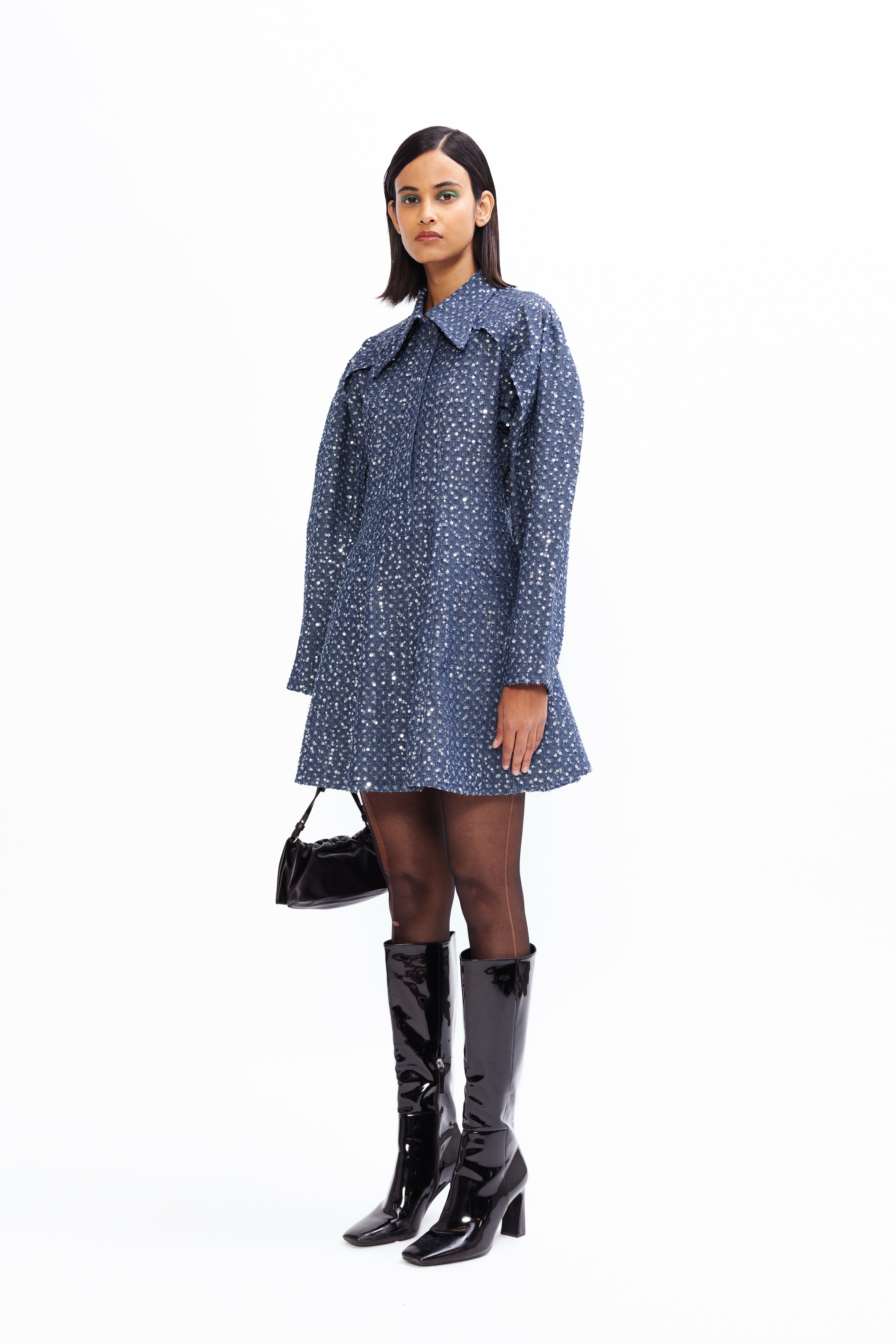 This dress features a structured, fitted bodice and shoulders that create a sharp, tailored silhouette. The oversized pointed collar adds a bold, vintage-inspired touch, blending classic elegance with modern flair. Perfect for semi-formal events, parties, or evening outings, it’s a statement piece that embodies refined sophistication.