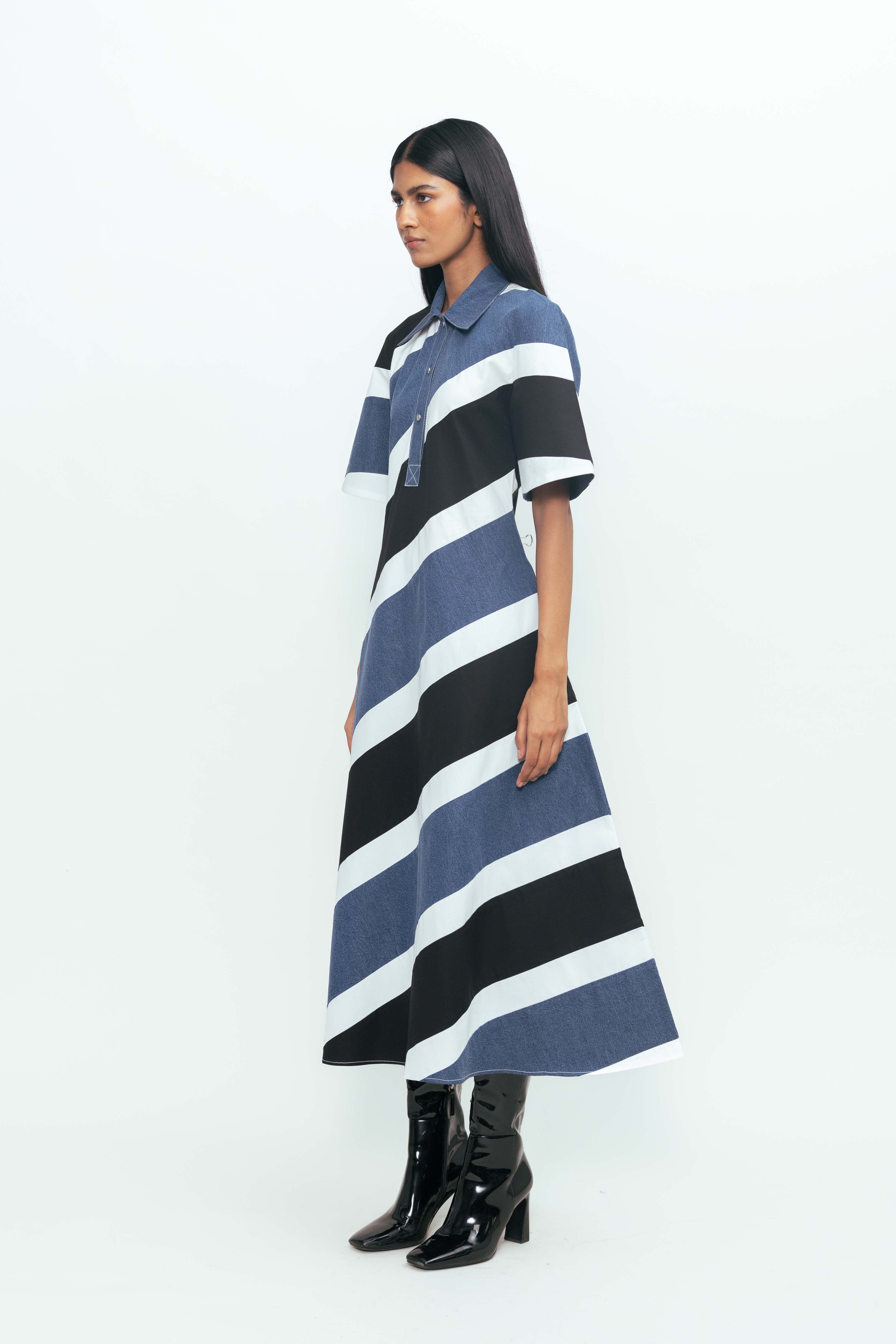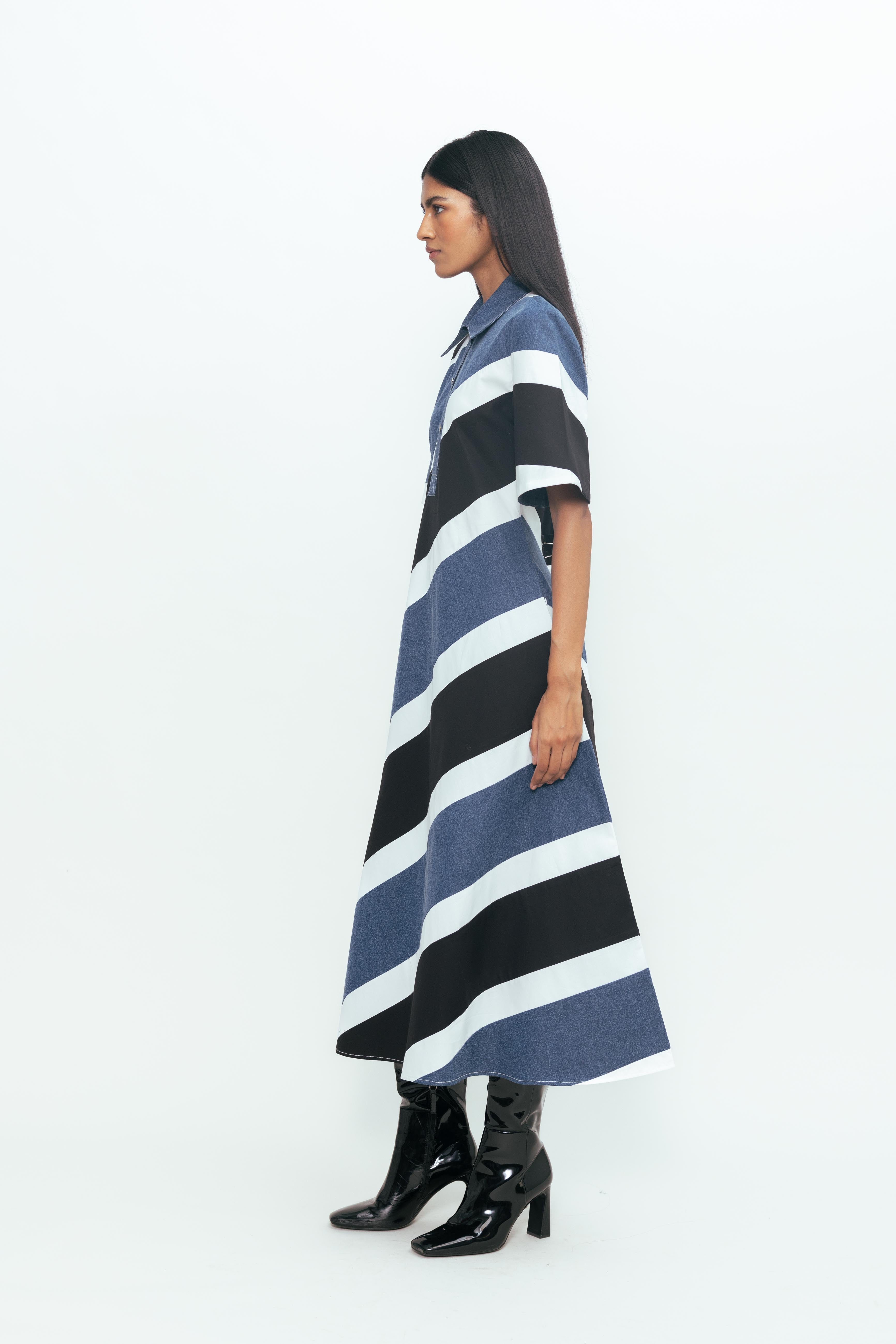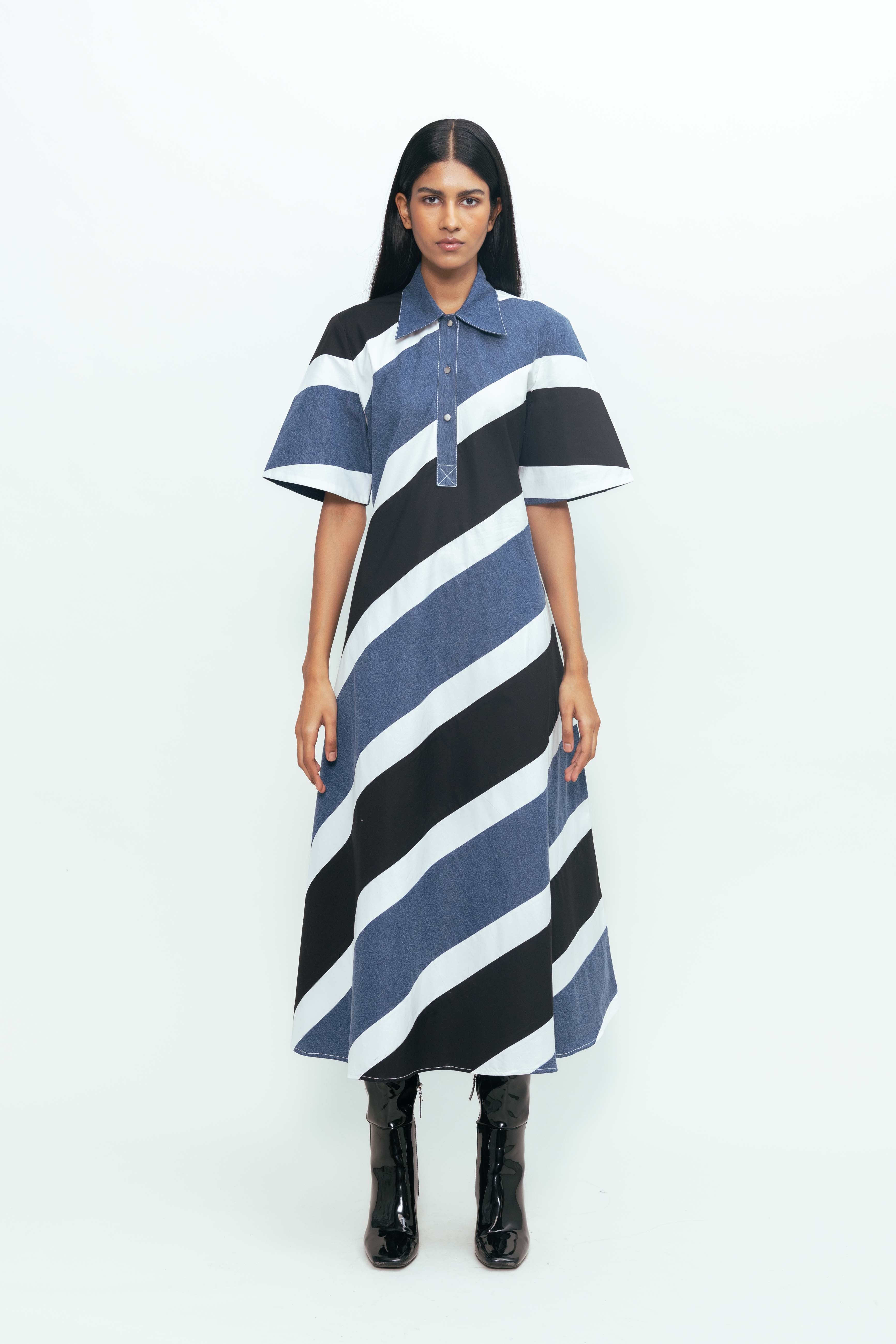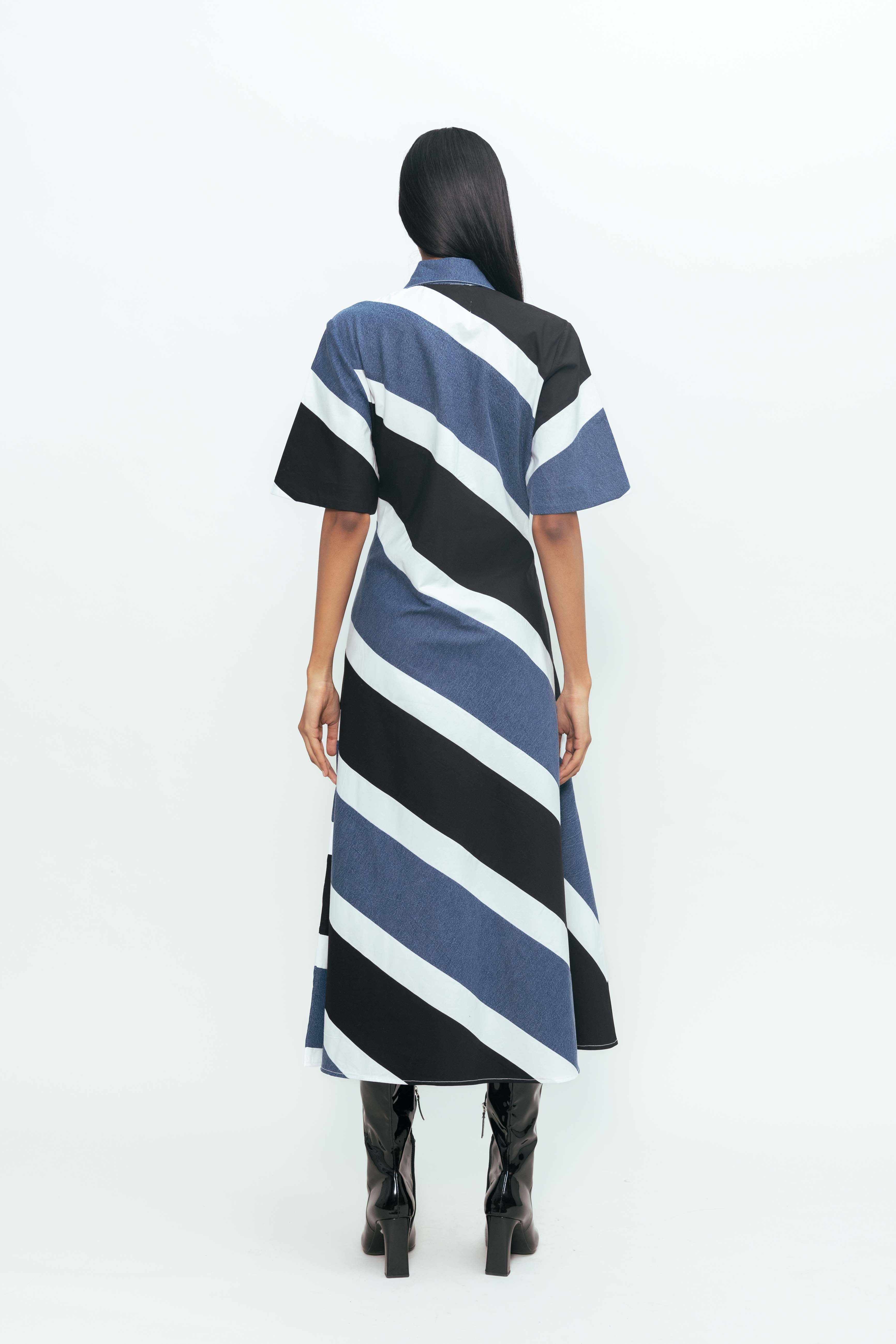 The Diagonal Colour-Blocked Midi Dress offers a refined take on contemporary style. Defined by sharp, asymmetrical paneling, it creates a visually lengthening effect while maintaining a clean, tailored silhouette. The midi cut balances structure with ease, making it a versatile choice for polished daywear or understated evening looks.