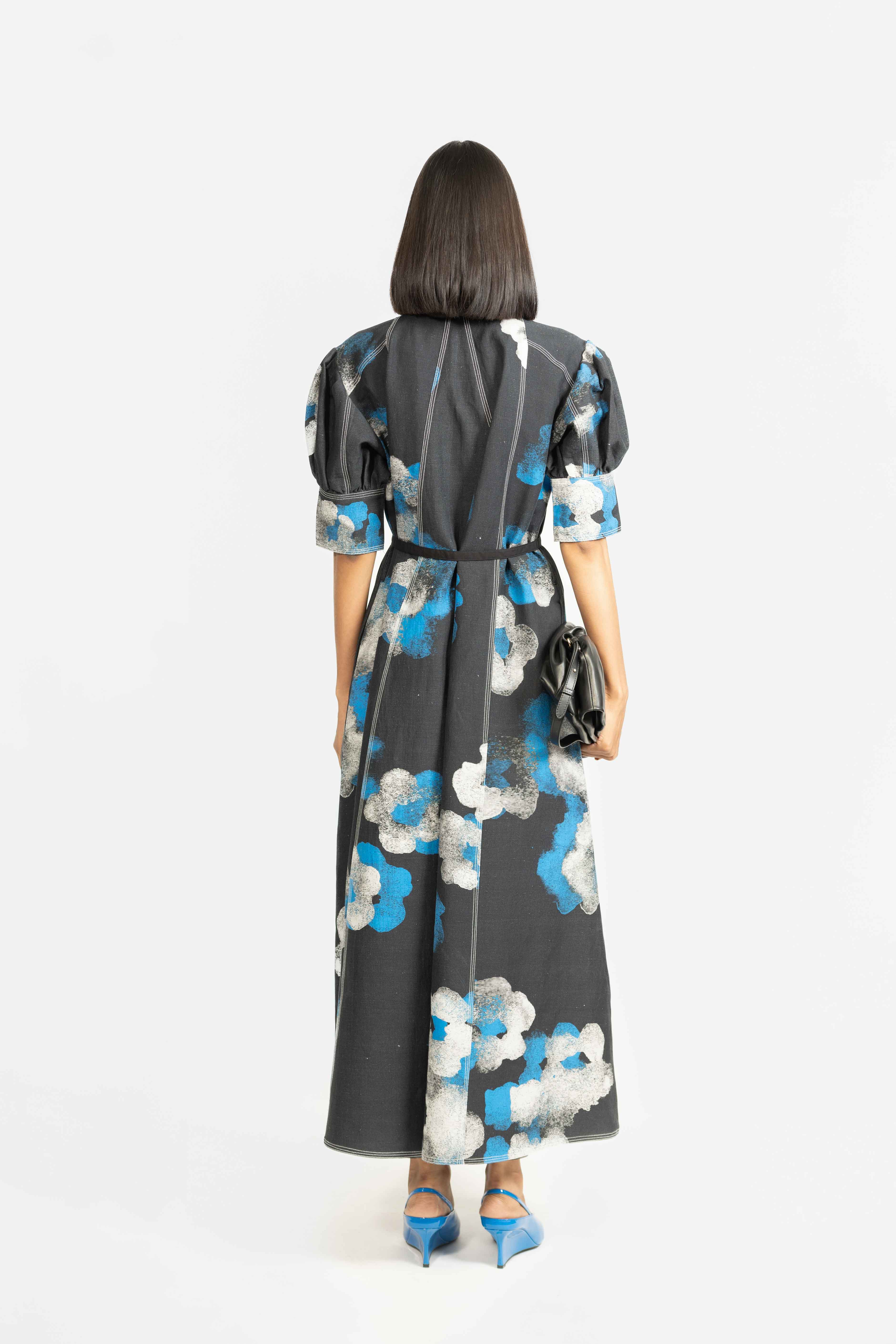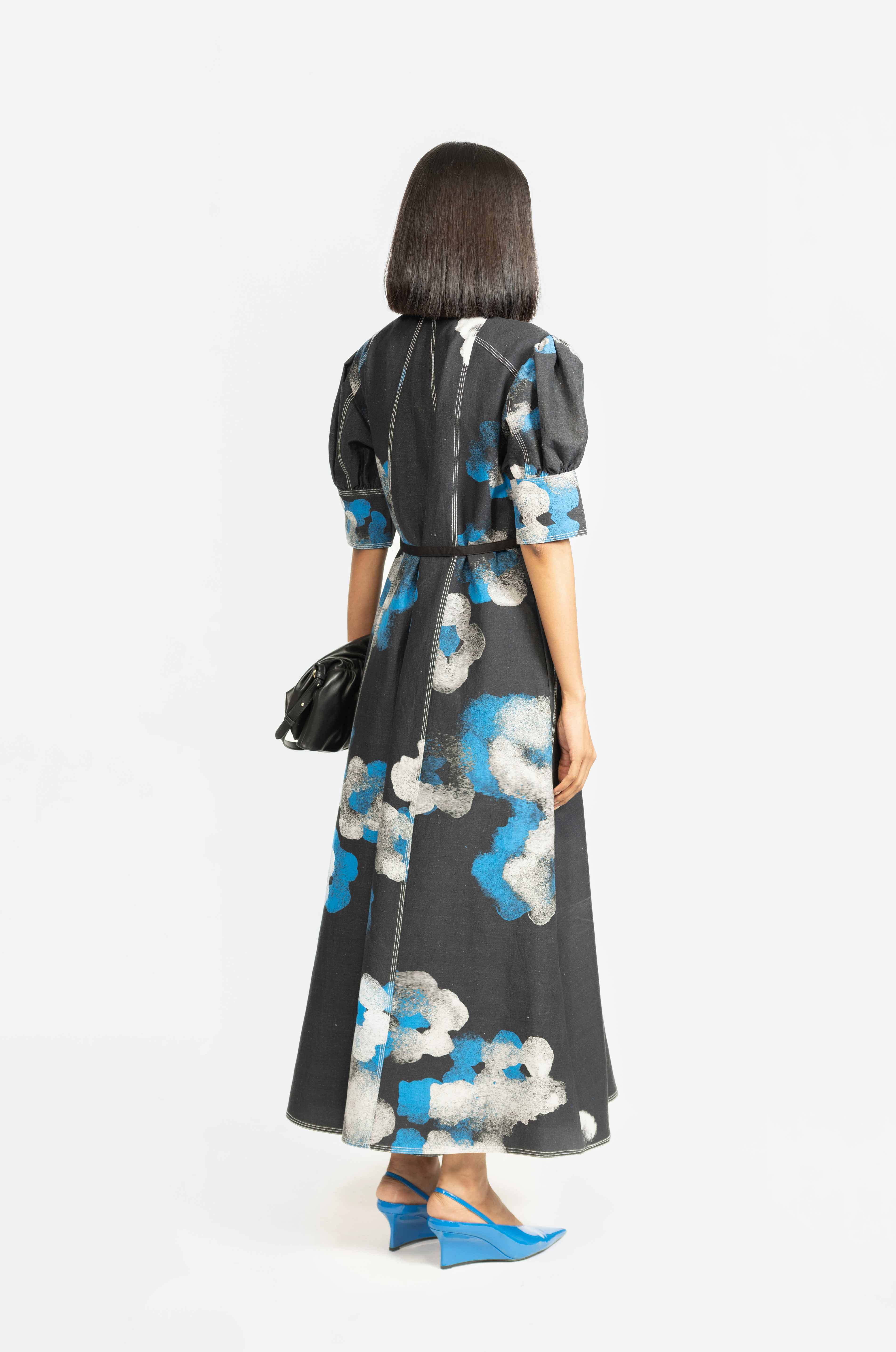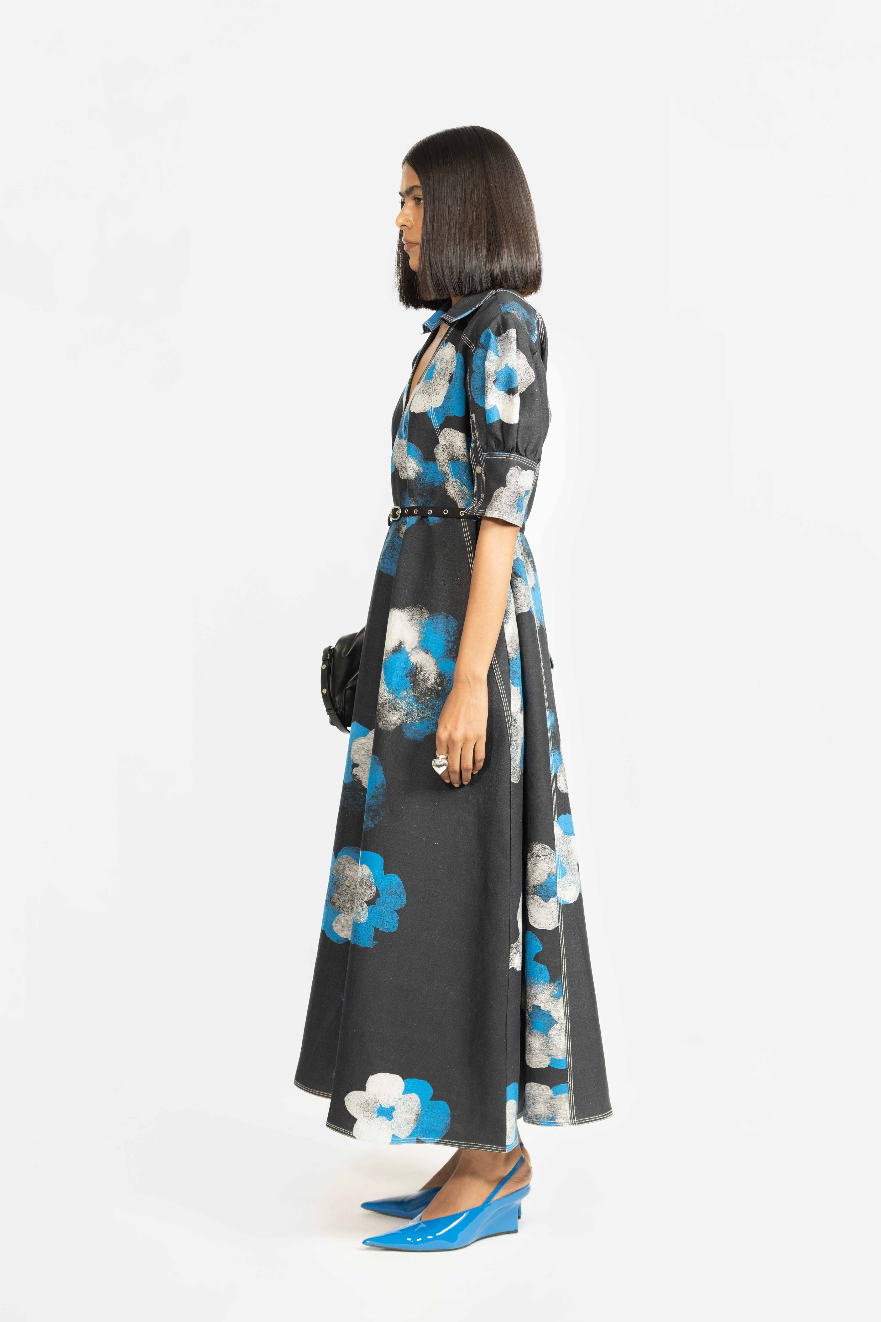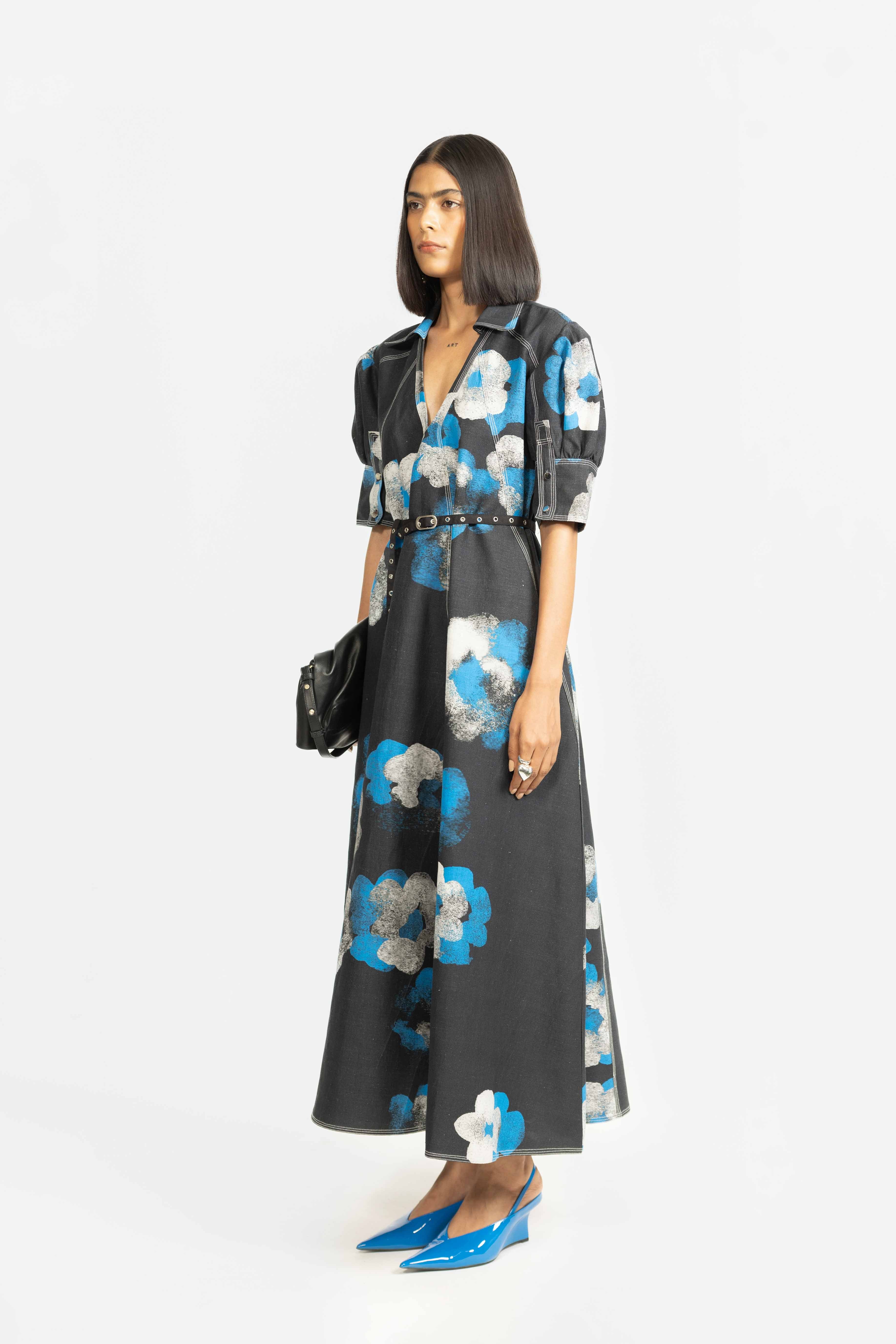 An ankle-length dress with a V-neck and collar, featuring slots all over, offers a blend of elegance and allure. The V-neckline adds a flattering touch, while the collar adds a refined detail. The slots all over the dress provide a unique and eye-catching design element, creating visual interest and movement. With plackets at the sleeves, the dress achieves a structured look. Paired with a belt, it offers versatility in styling and enhances the waistline. This combination creates a sophisticated and chic ensemble suitable for various occasions, from formal events to casual outings.