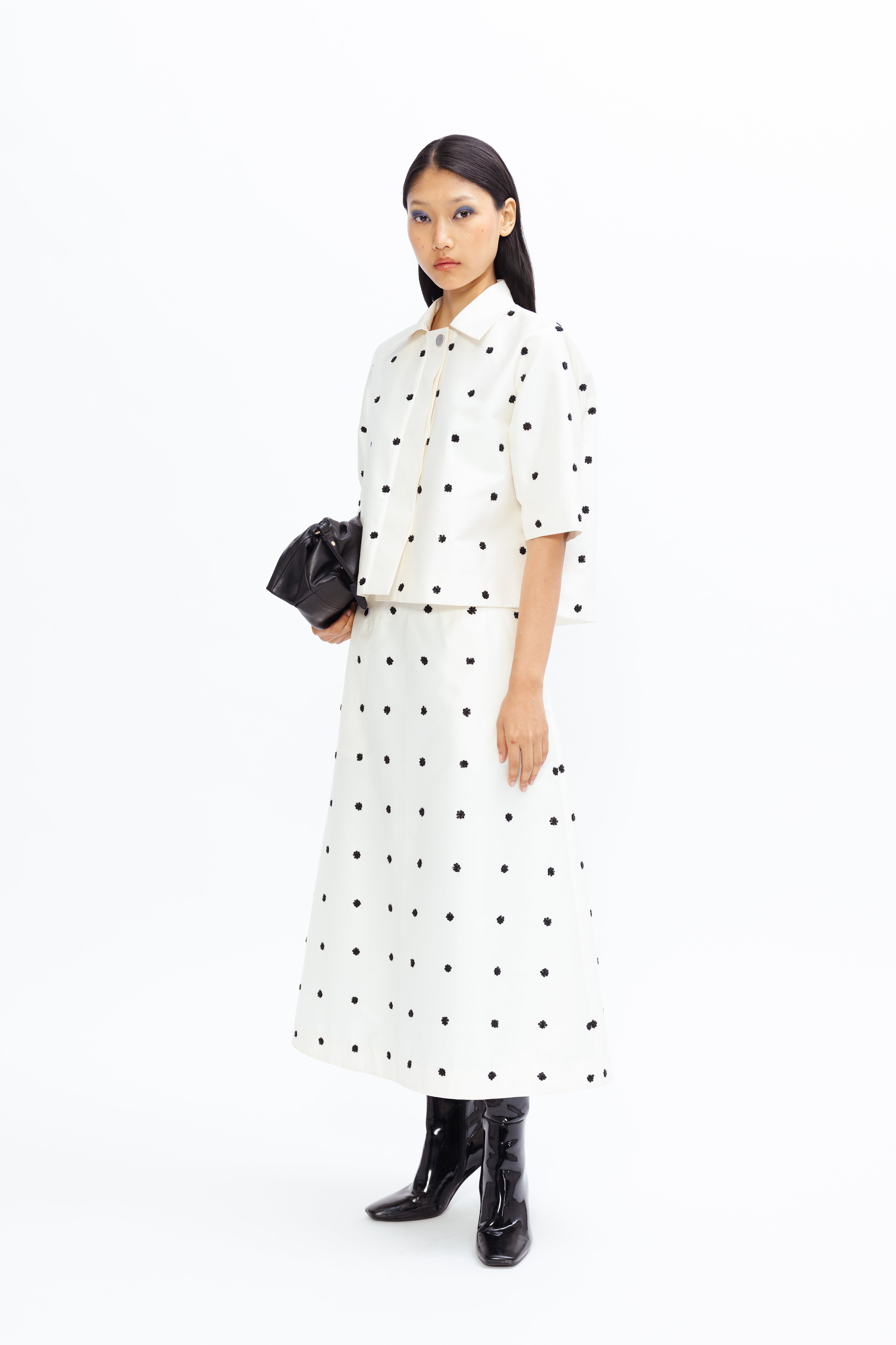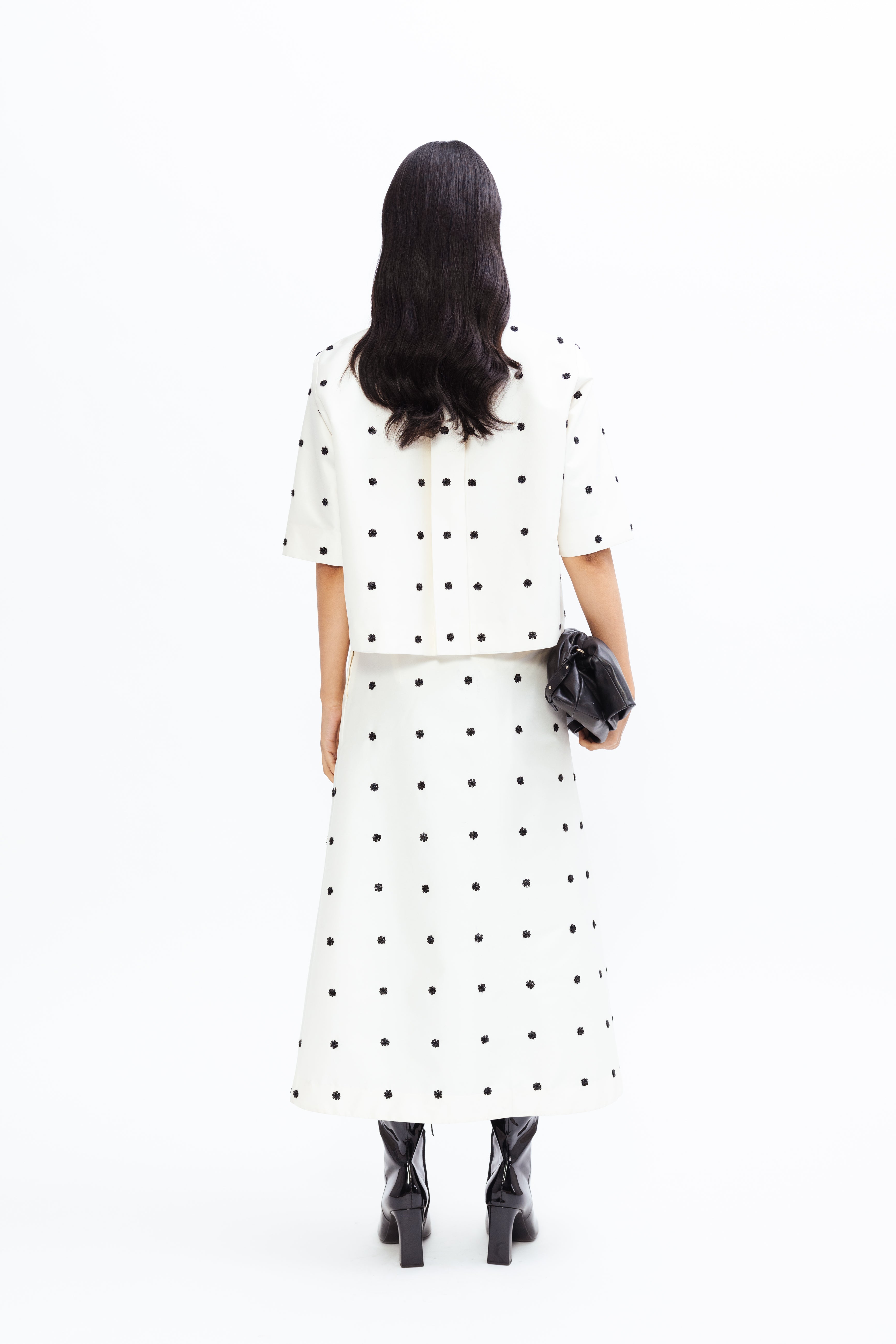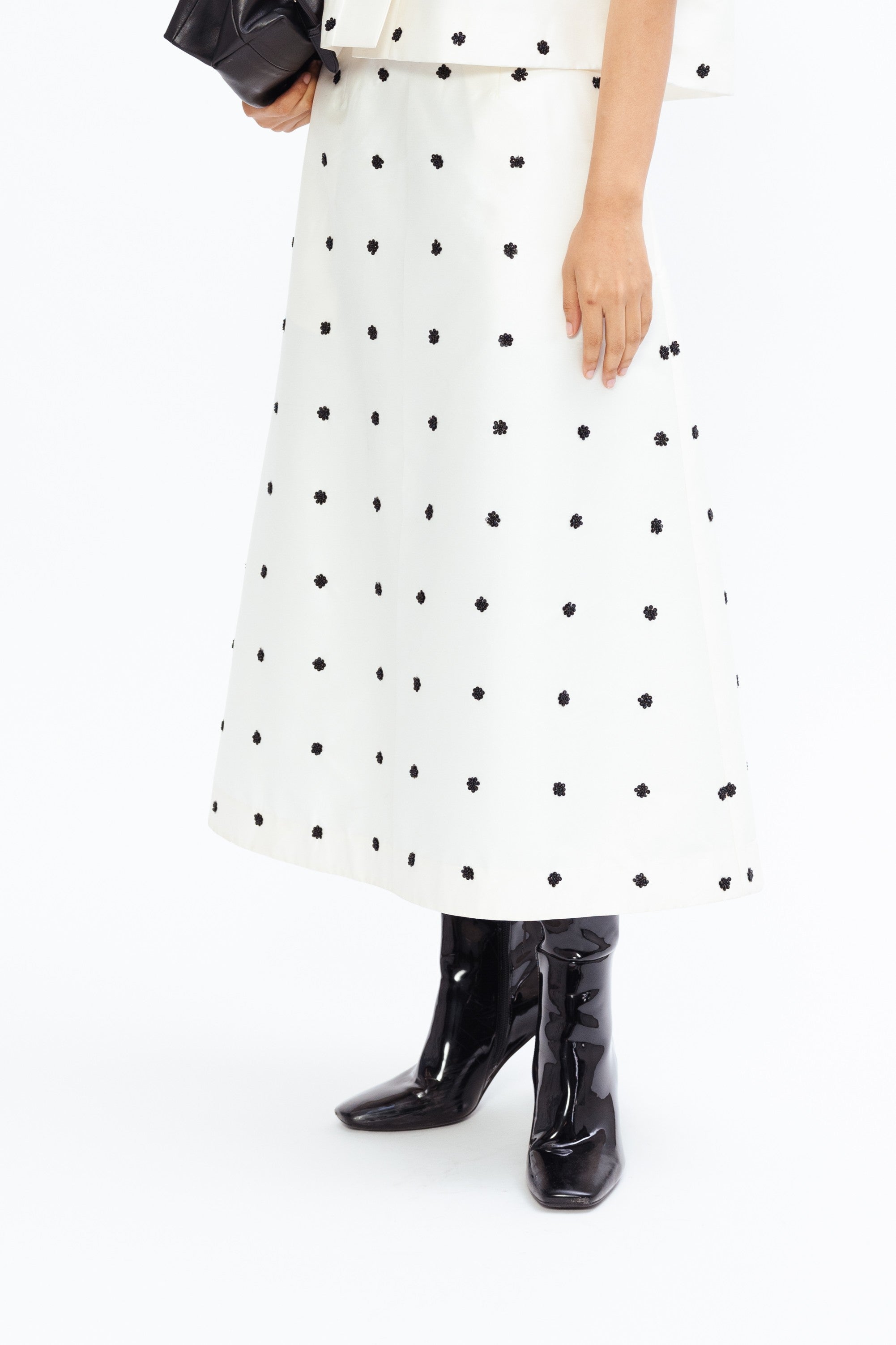 Flower dot sequined midi skirt featuring an elegant straight silhouette adorned with delicate floral dot sequin work. Designed to add subtle shimmer and refined charm, it’s perfect for both festive and evening looks.