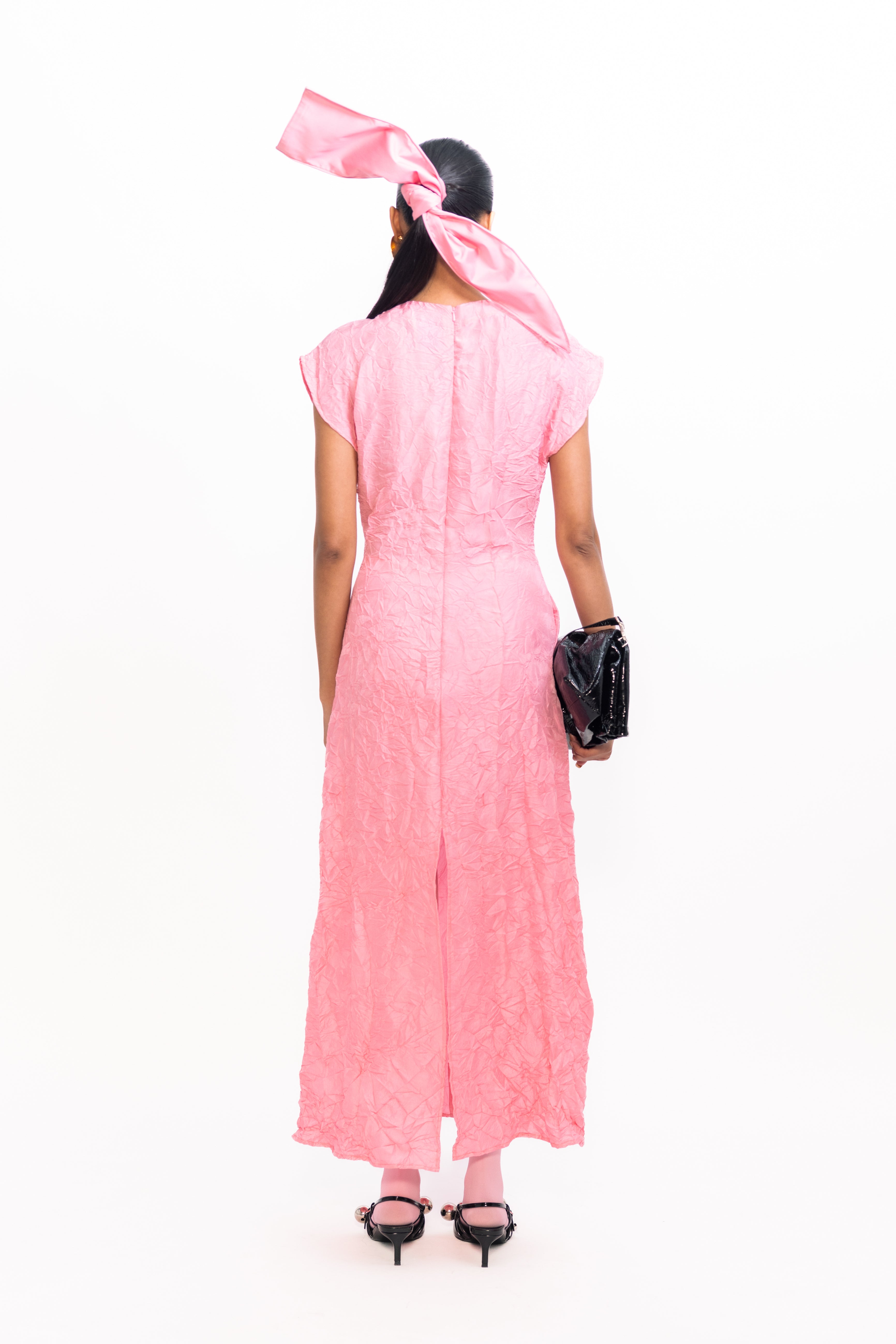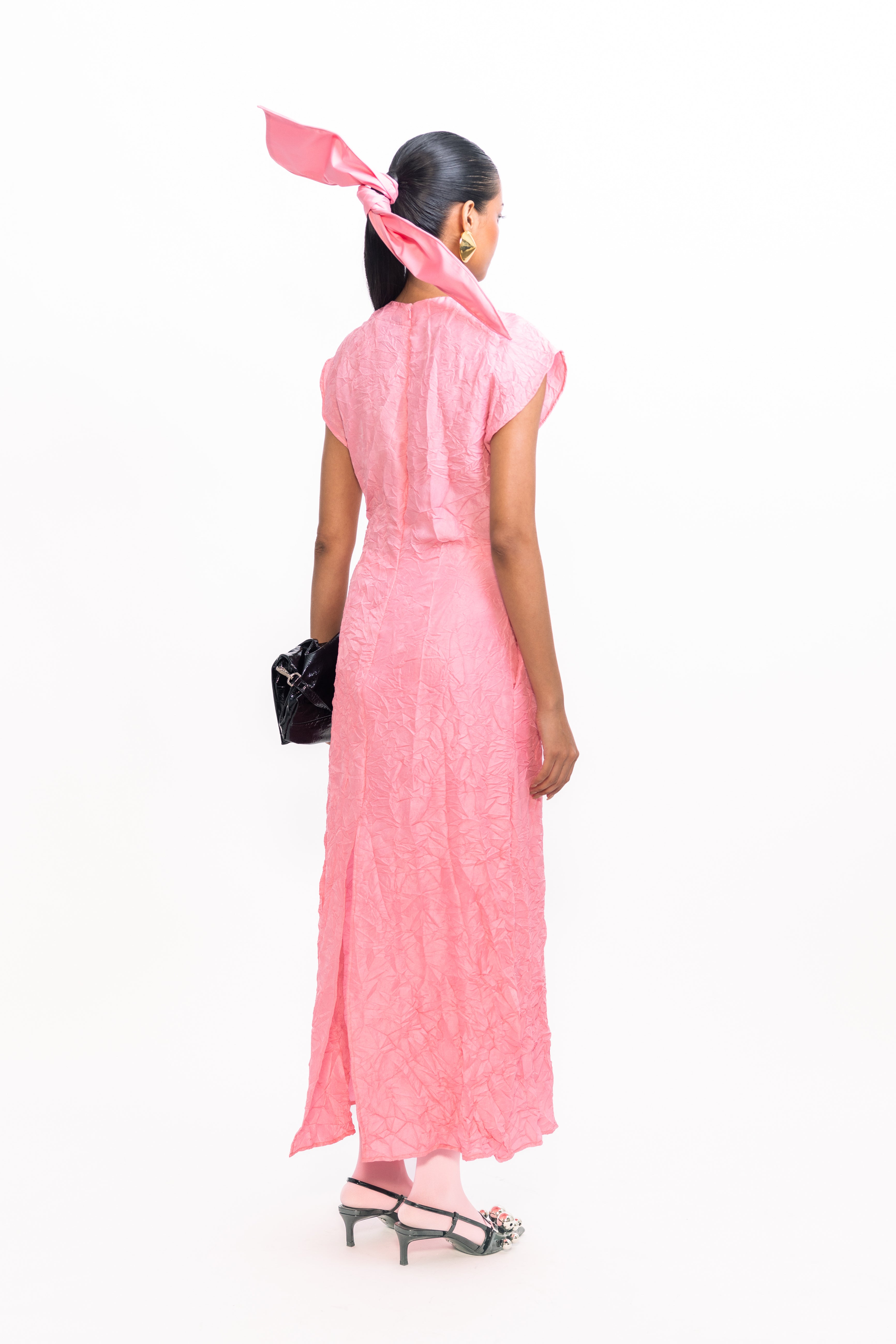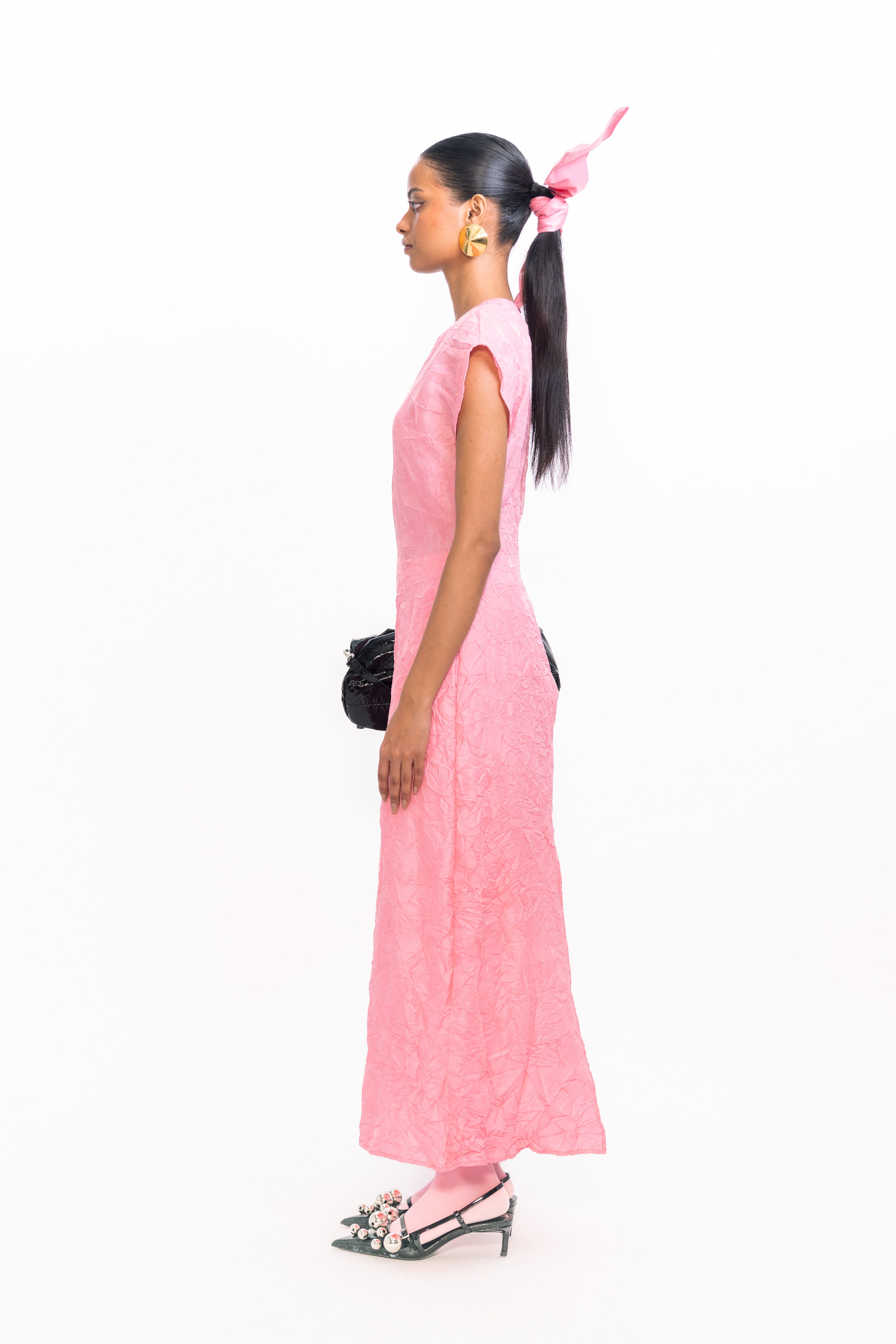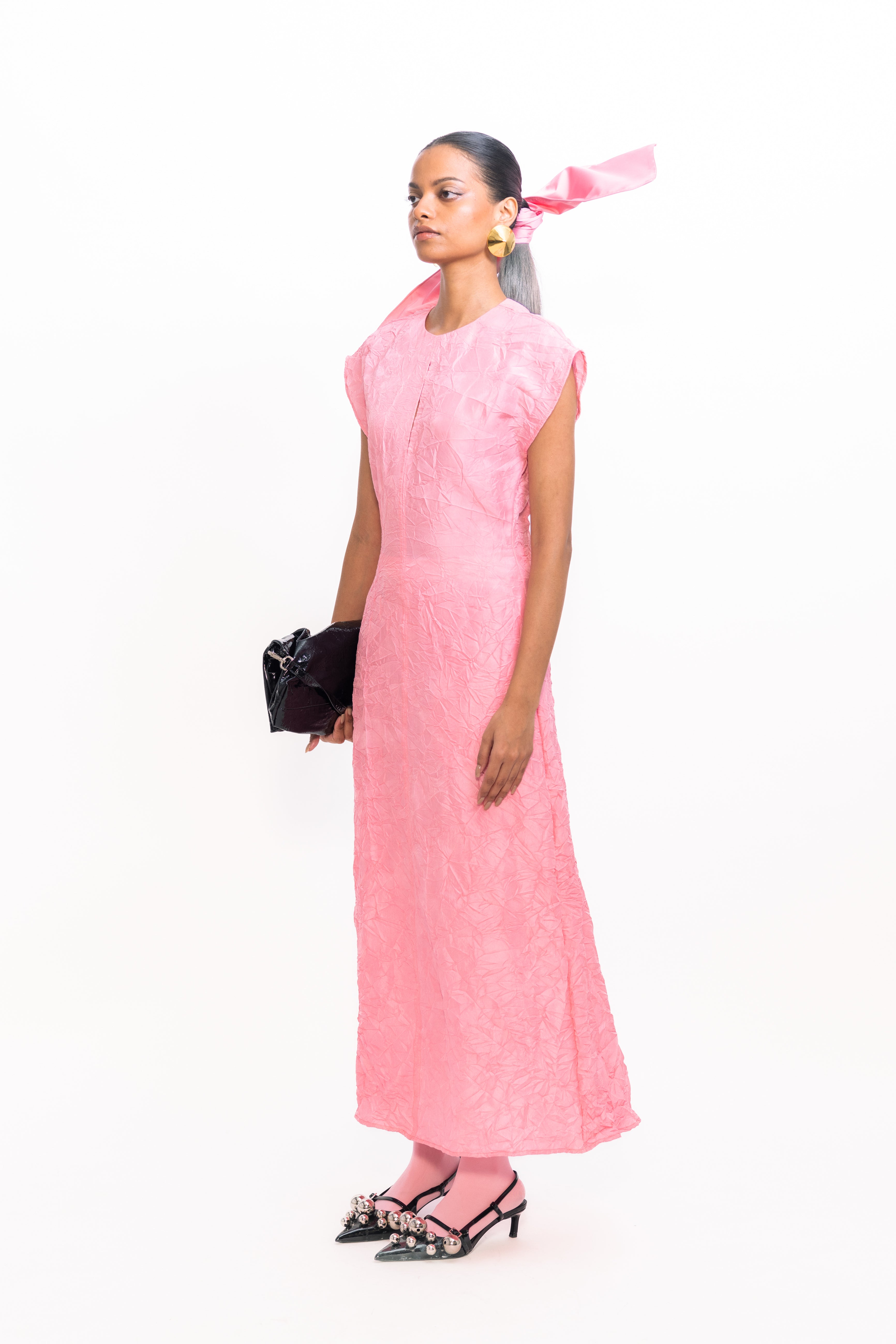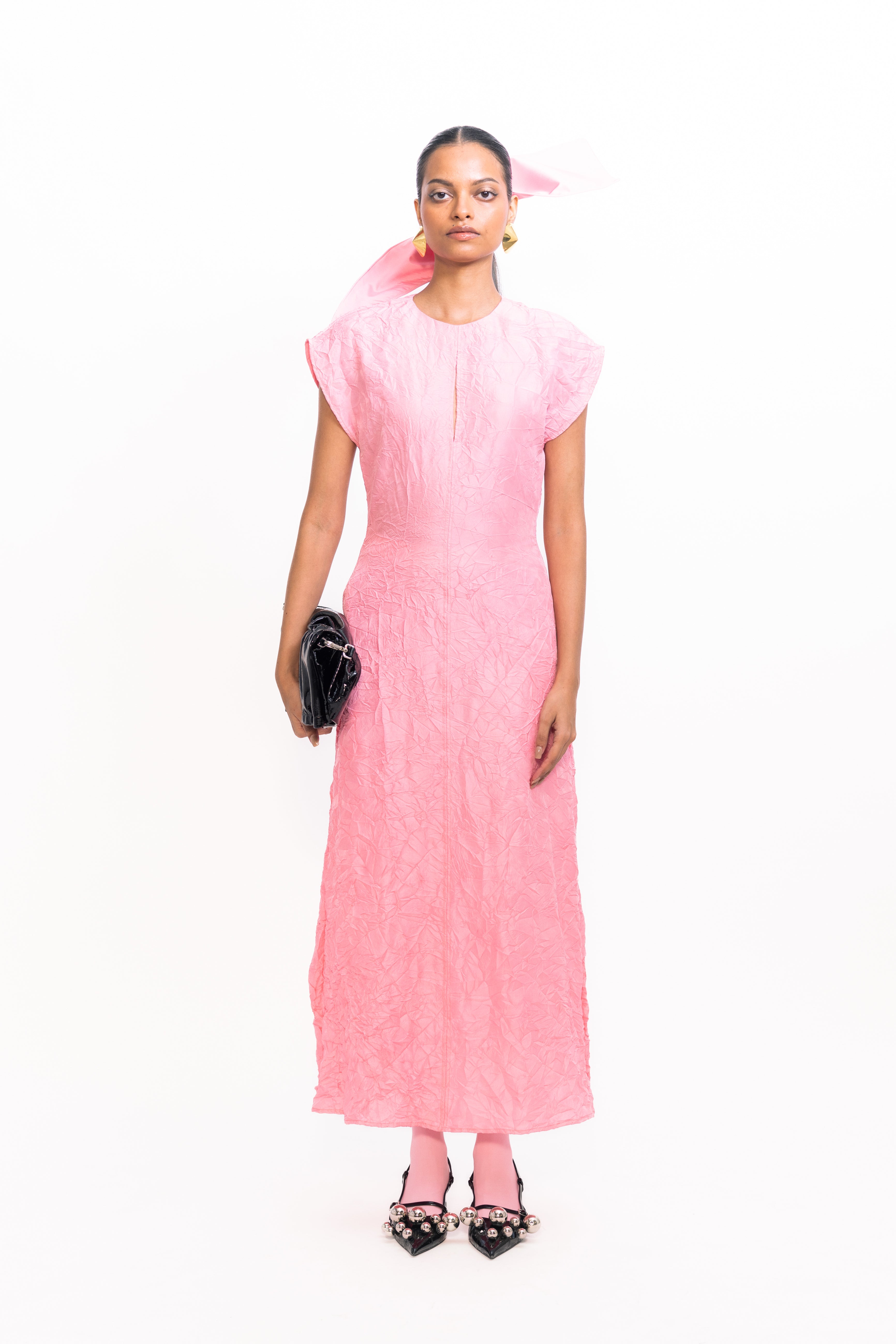 This elegant fit-and-flare dress is crafted from luxuriously textured wrinkled silk, offering a relaxed yet sophisticated drape. Cap sleeves add a delicate, feminine touch, while the cinched waist flows into a gracefully flared skirt—perfect for daytime events or evening gatherings.