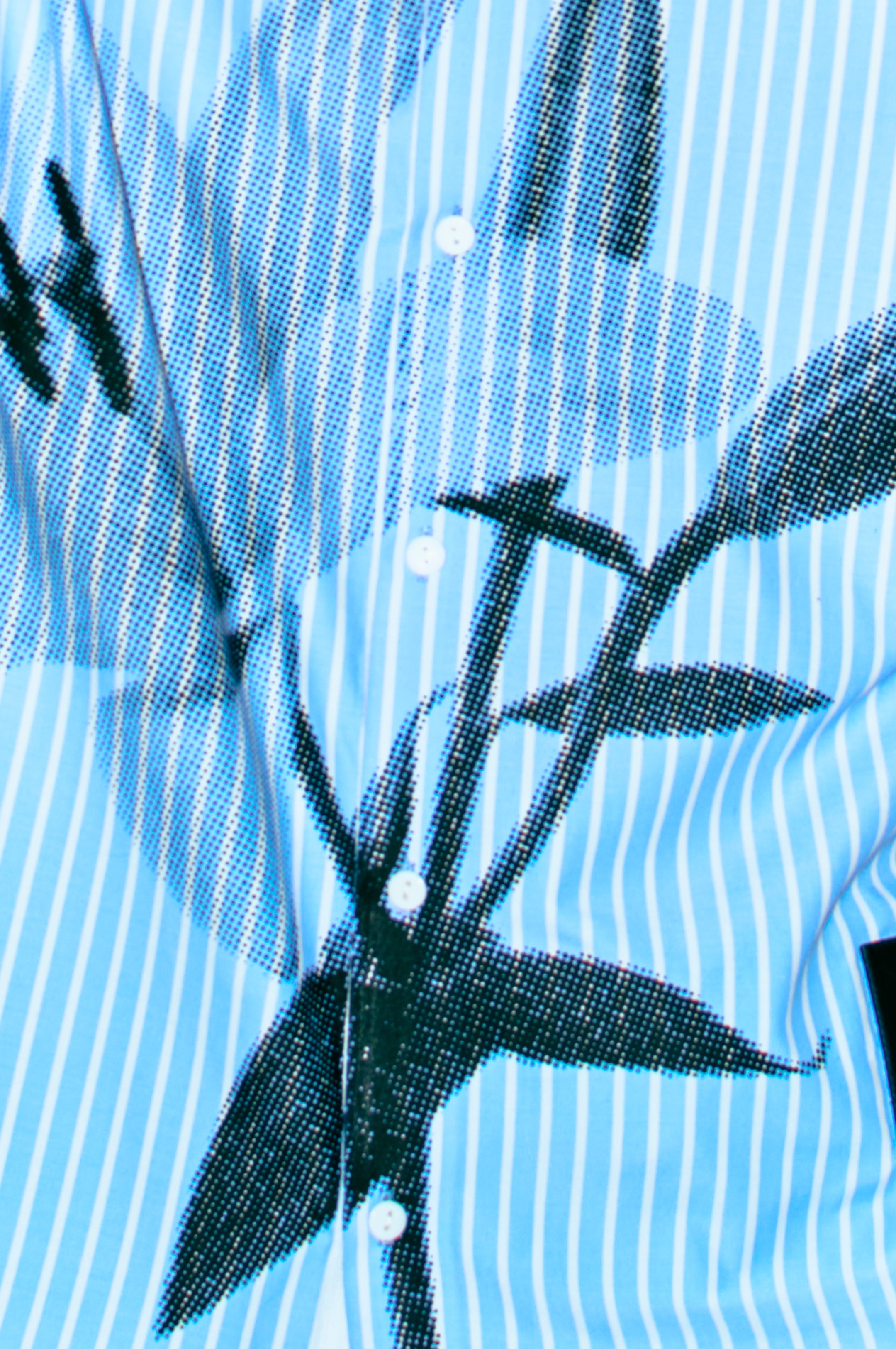 - Oversized floral graphic print creates a bold, artistic statement against the classic striped backdrop.