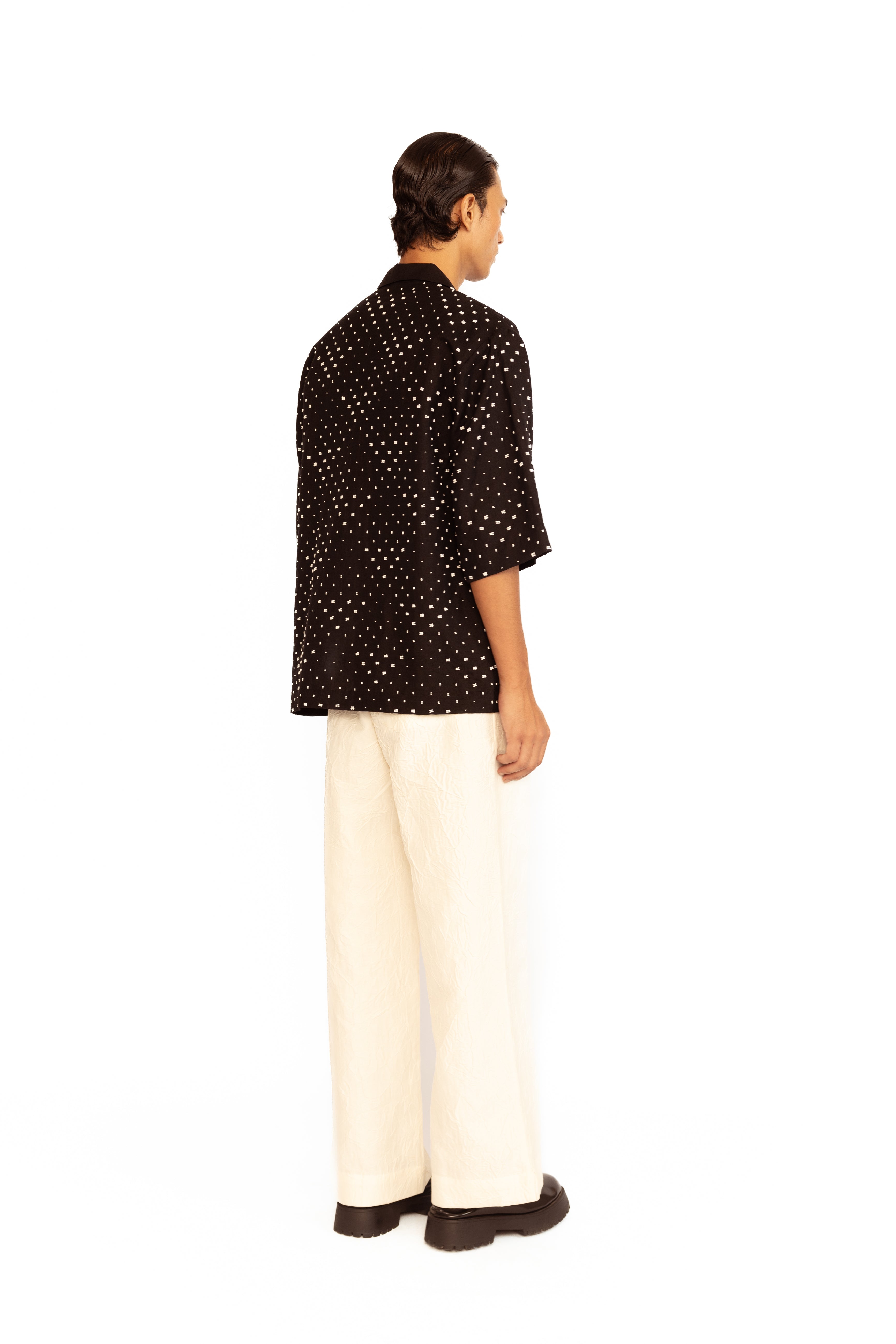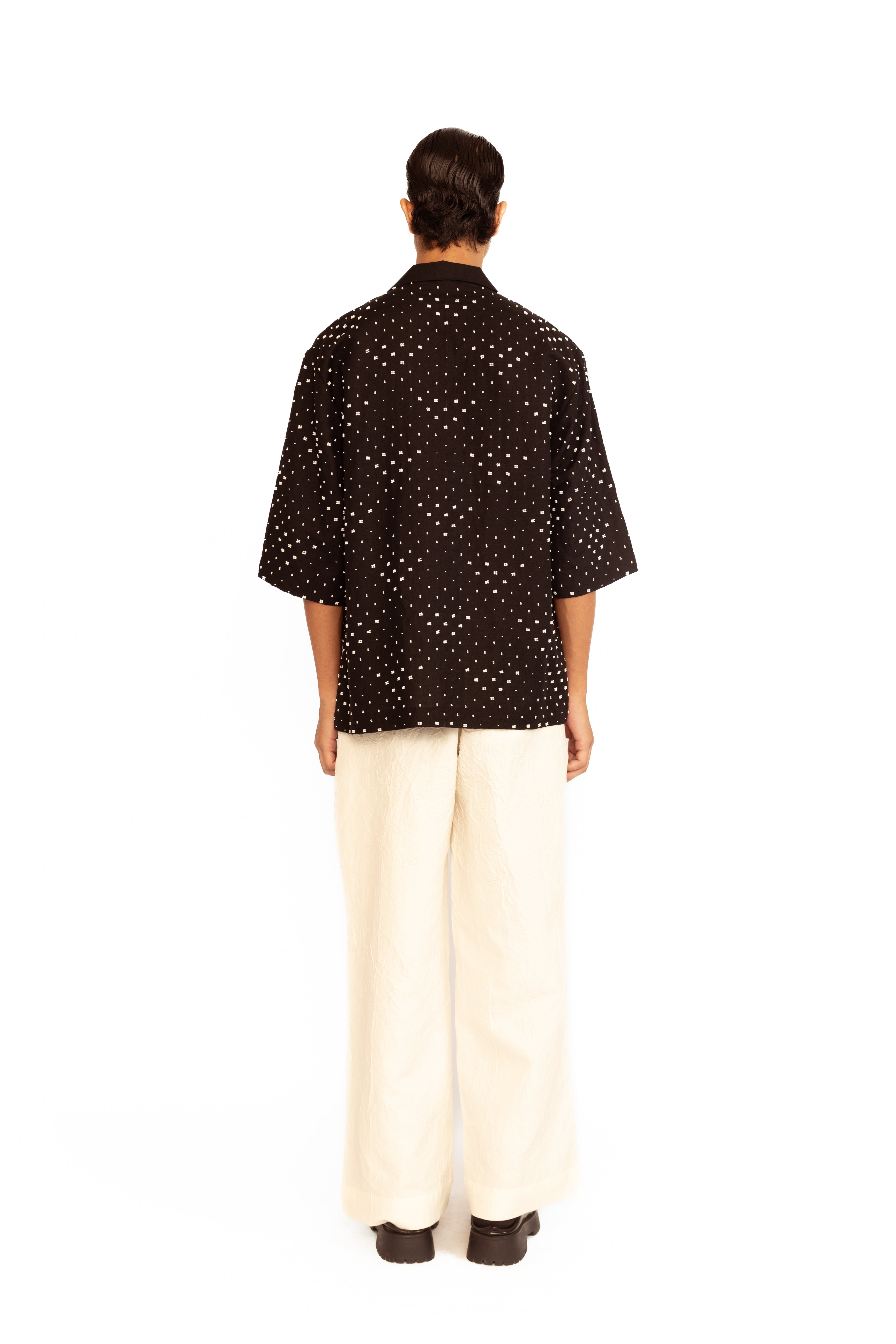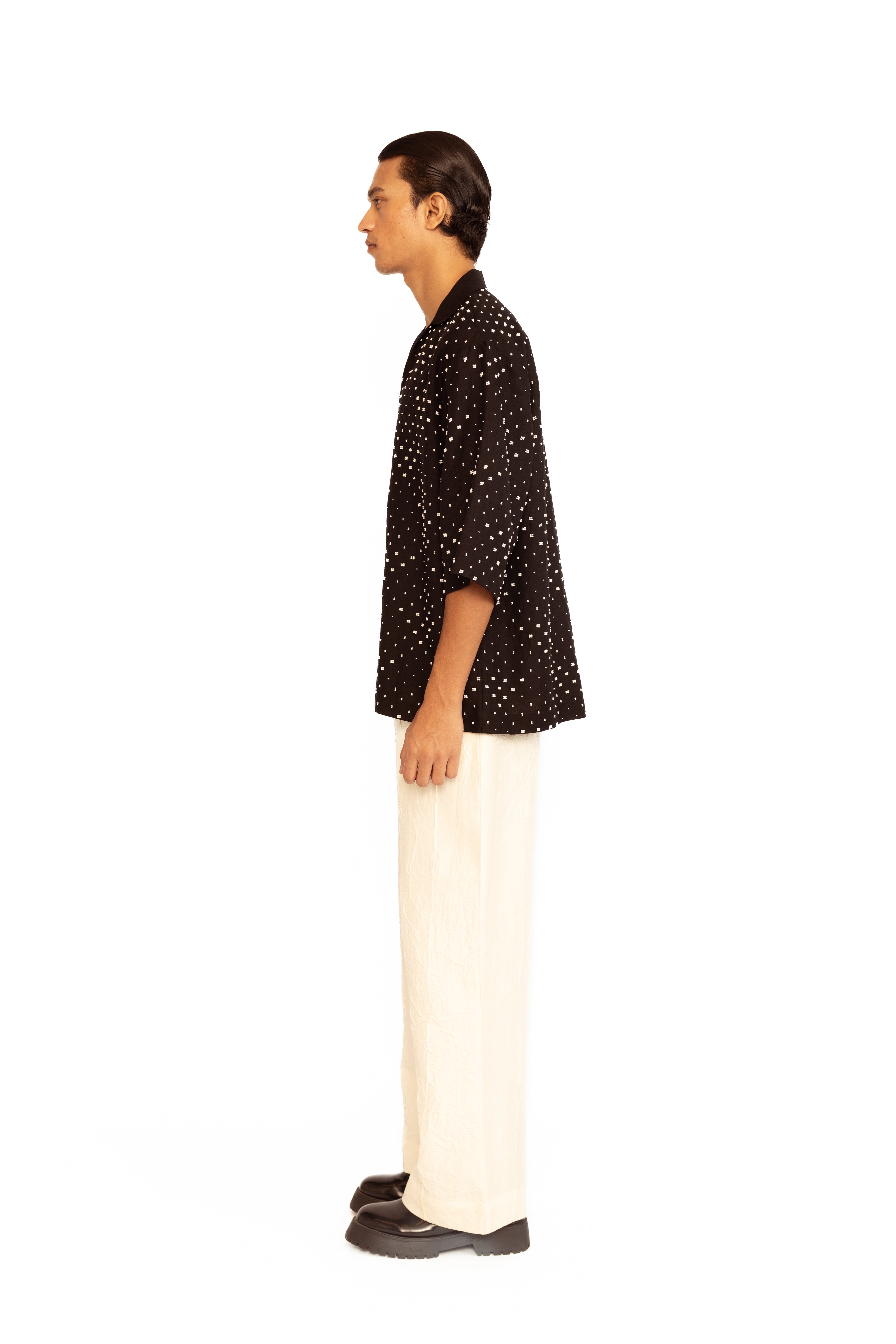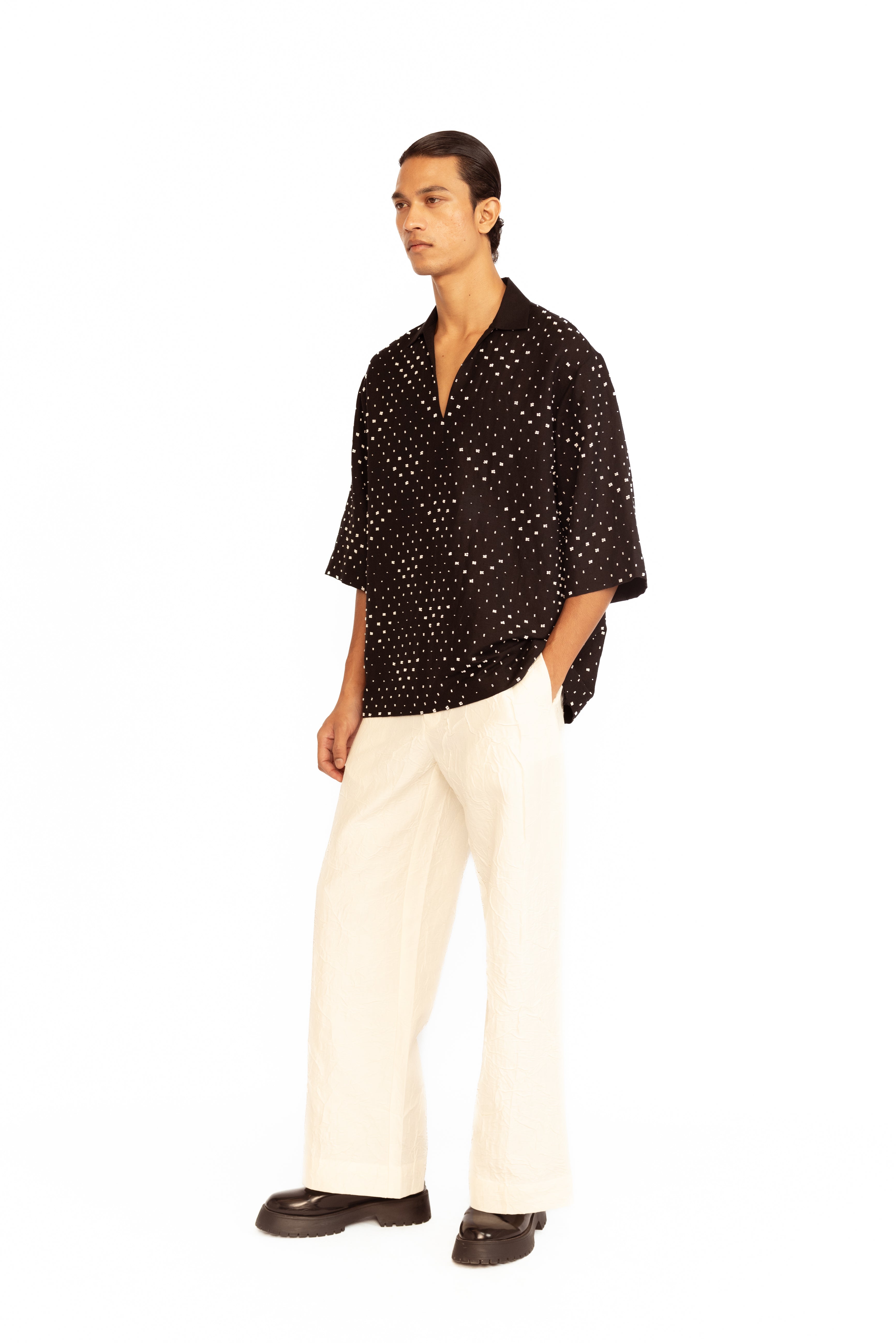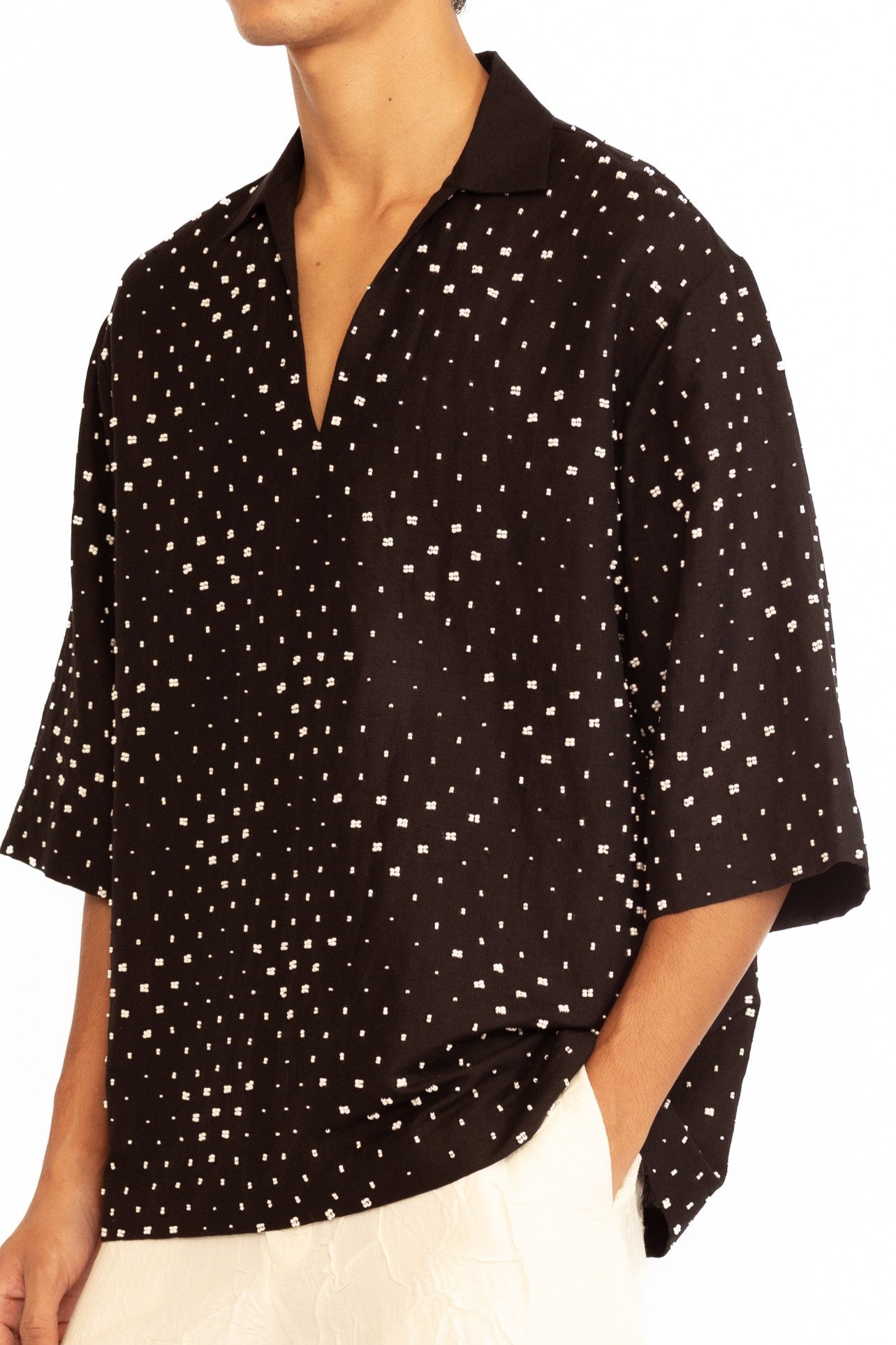 A contemporary statement piece, this V-neck shirt is elevated with intricate diamond bead embroidery, adding a touch of understated elegance. Tailored for a clean, modern fit, it blends classic craftsmanship with a refined decorative finish — perfect for both festive and evening occasions.