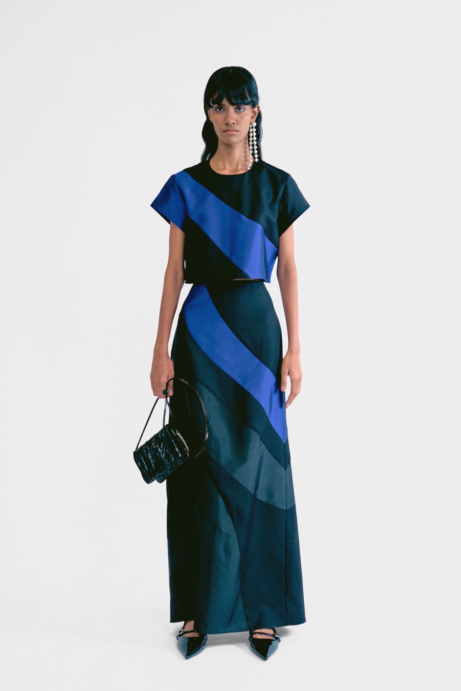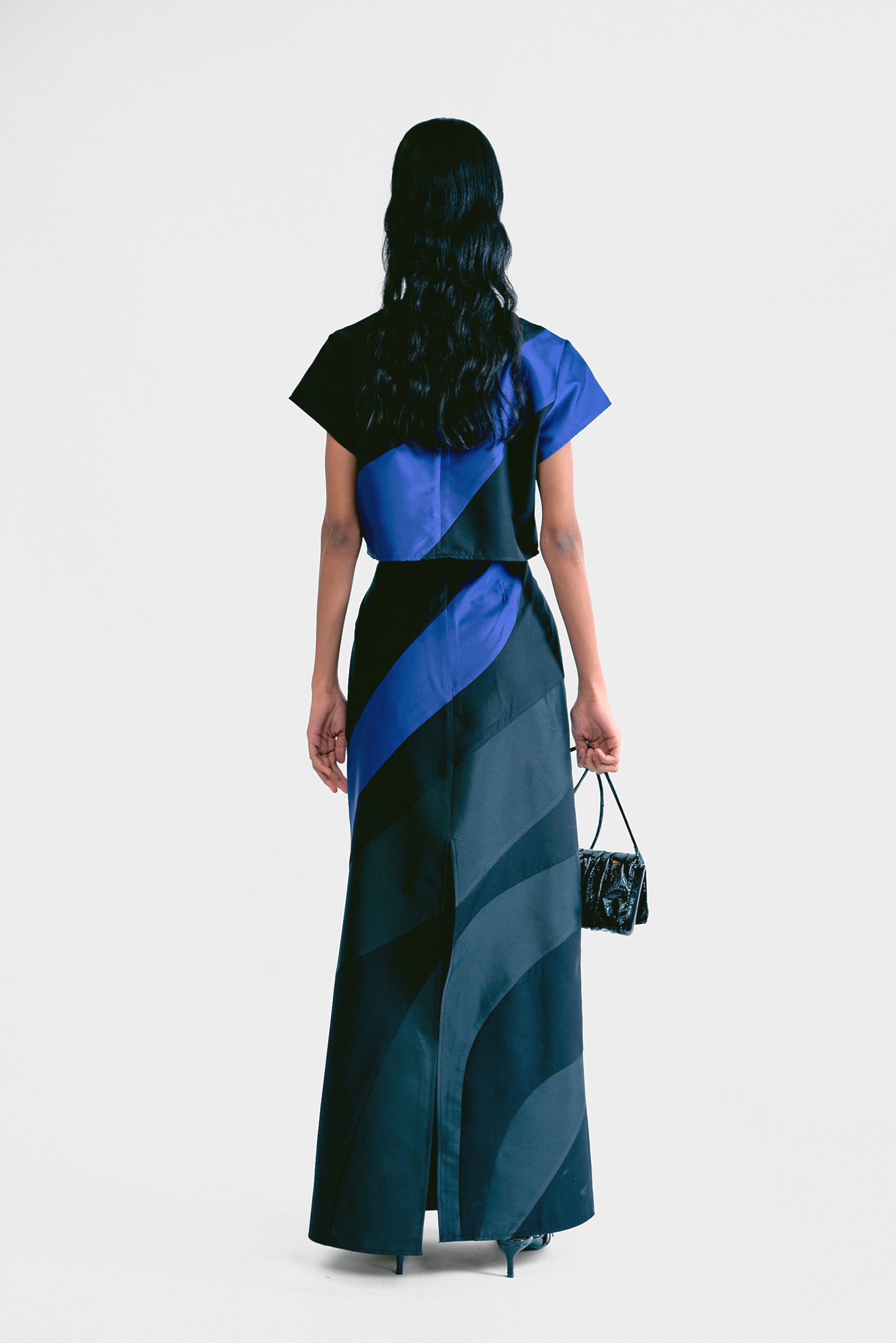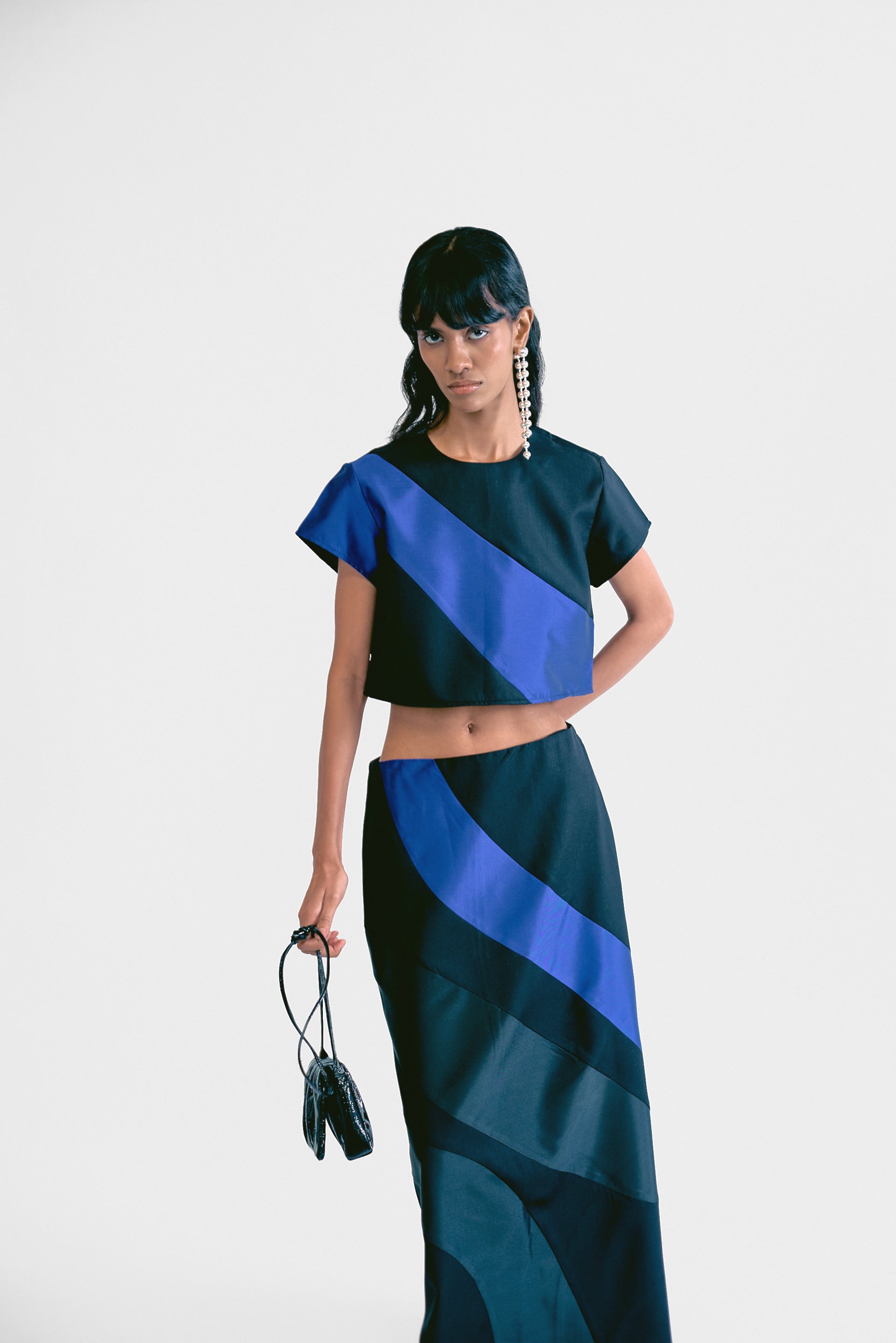 The cropped top adds an edgy touch, while the skirt’s side slit offers fluid movement and contemporary flair. Perfect for statement styling that’s both versatile and effortlessly chic.