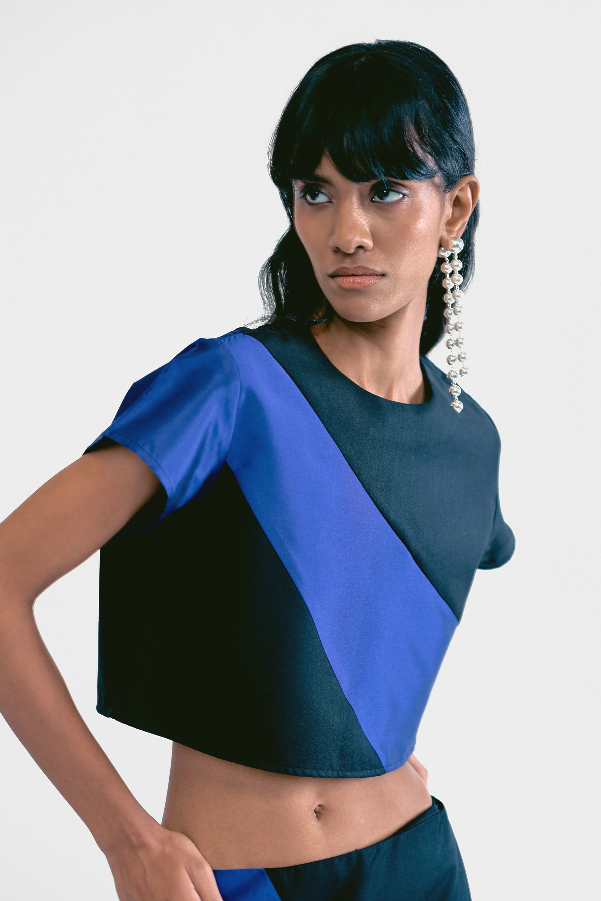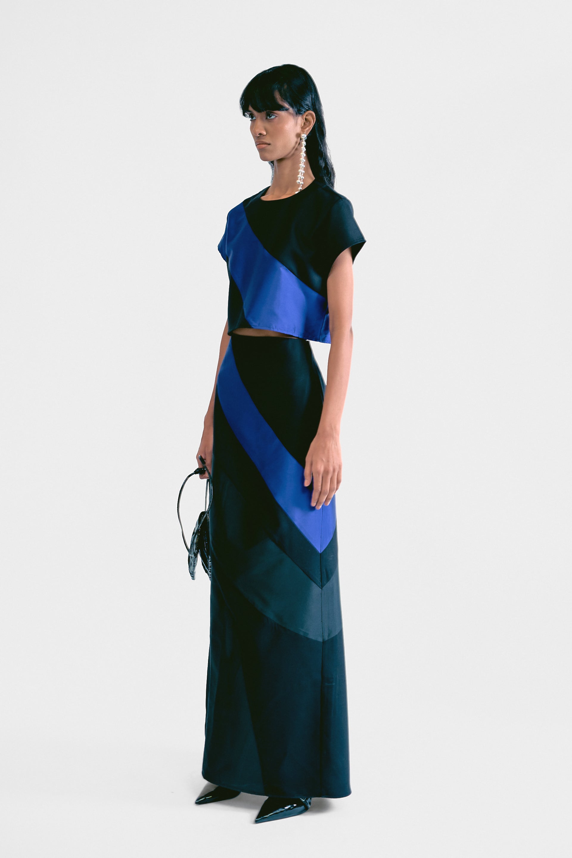 Turn heads with this bold co-ord set, featuring a Diagonal Color-Blocked Cropped Top and matching Slit Skirt. Designed with striking contrast panels, the set brings dynamic energy to a sleek, modern silhouette.