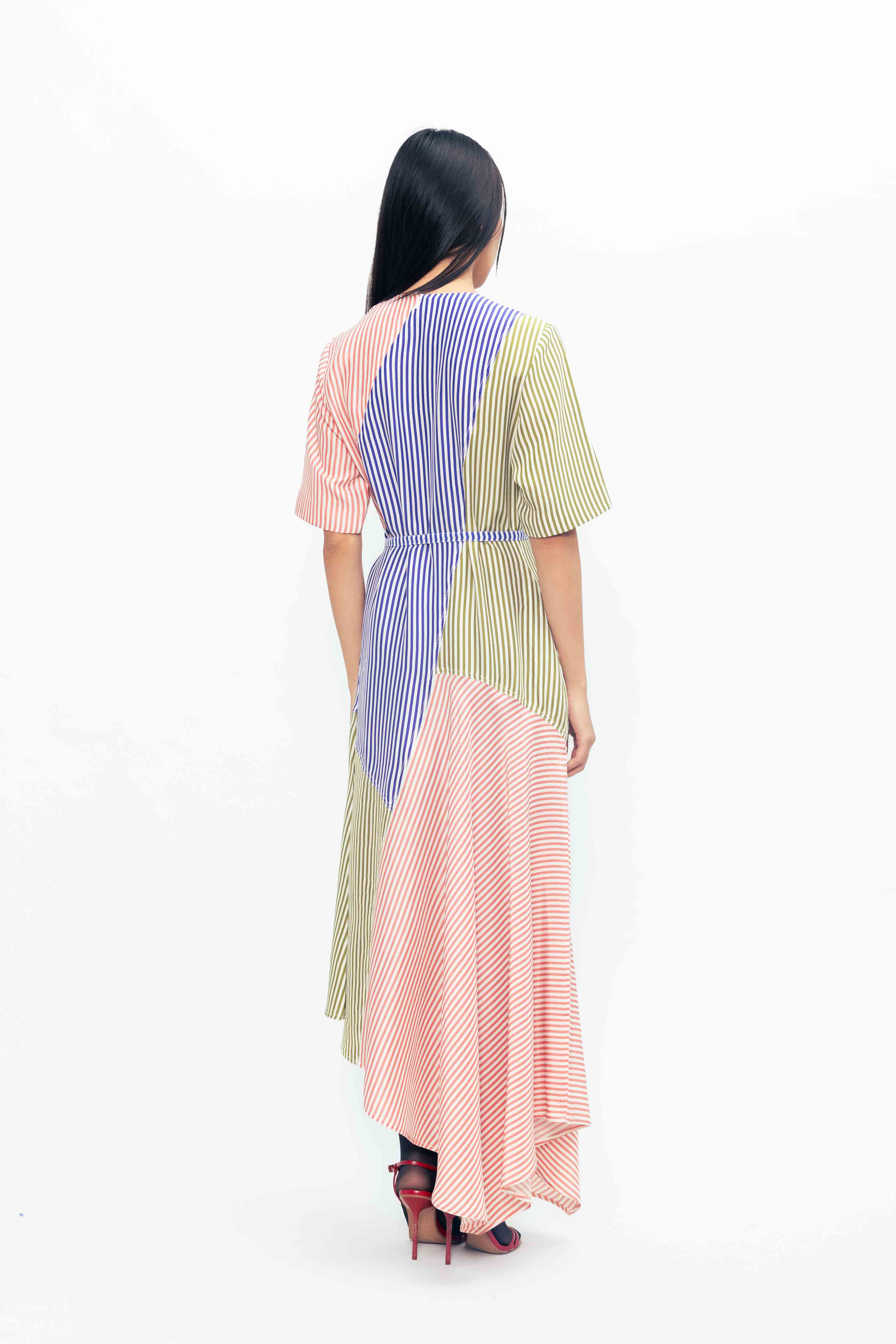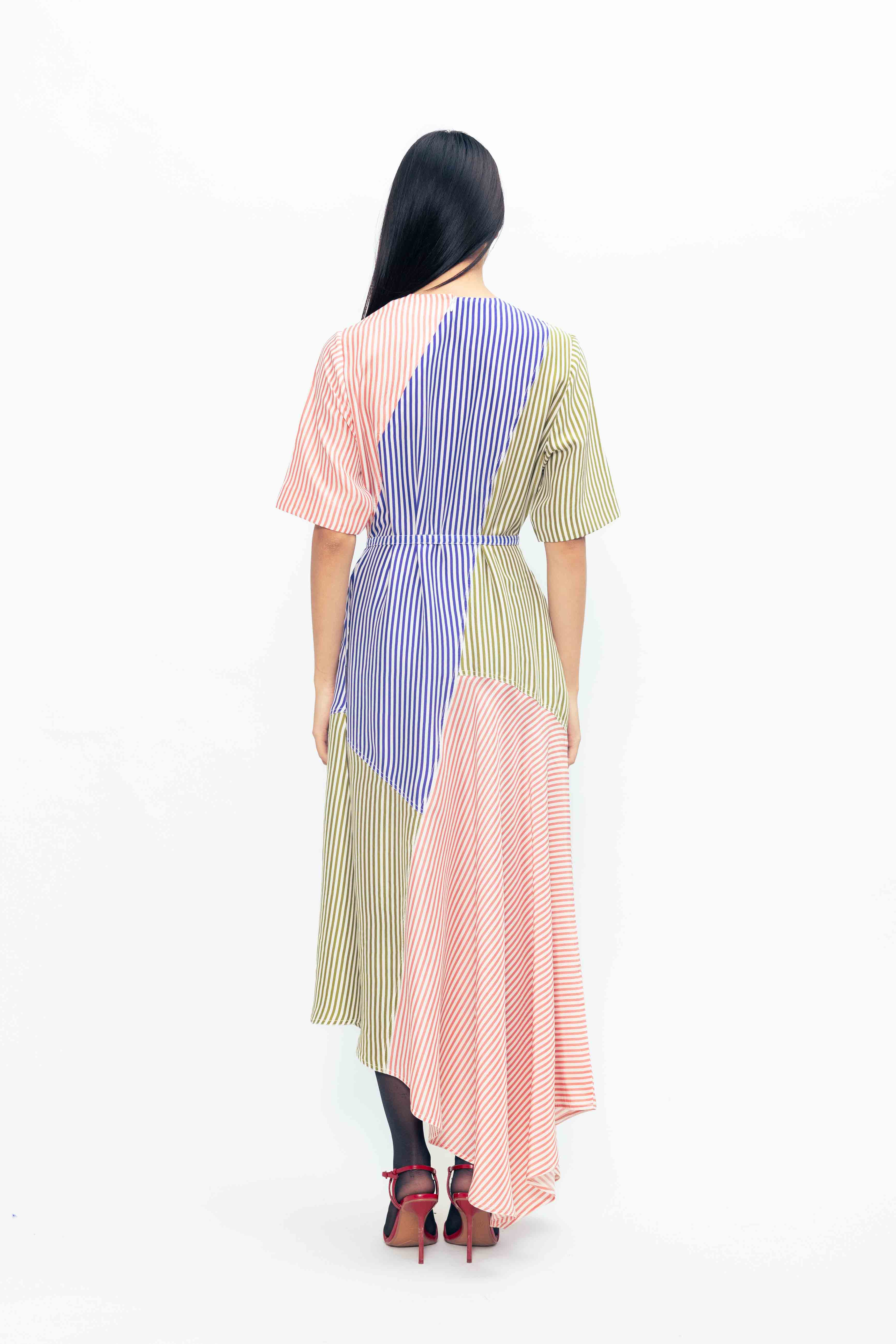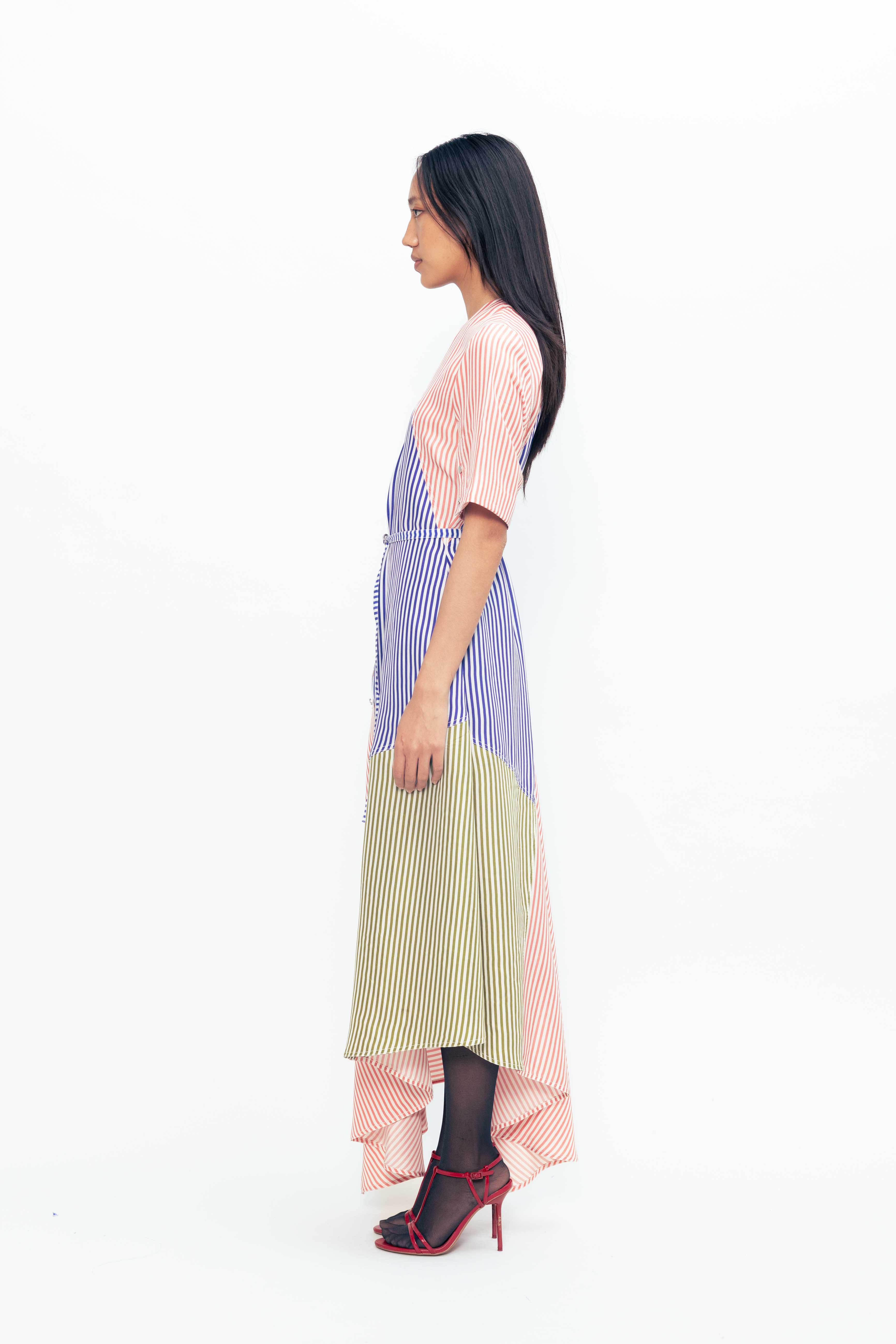 This fluid, asymmetric dress reimagines classic shirting with a modern twist. A tilted placket adds unexpected structure, while the mix of linear patterns creates visual rhythm and movement. With its soft drape and lightweight feel, the silhouette flows effortlessly, making it a refined yet expressive choice for day-to-evening transitions.