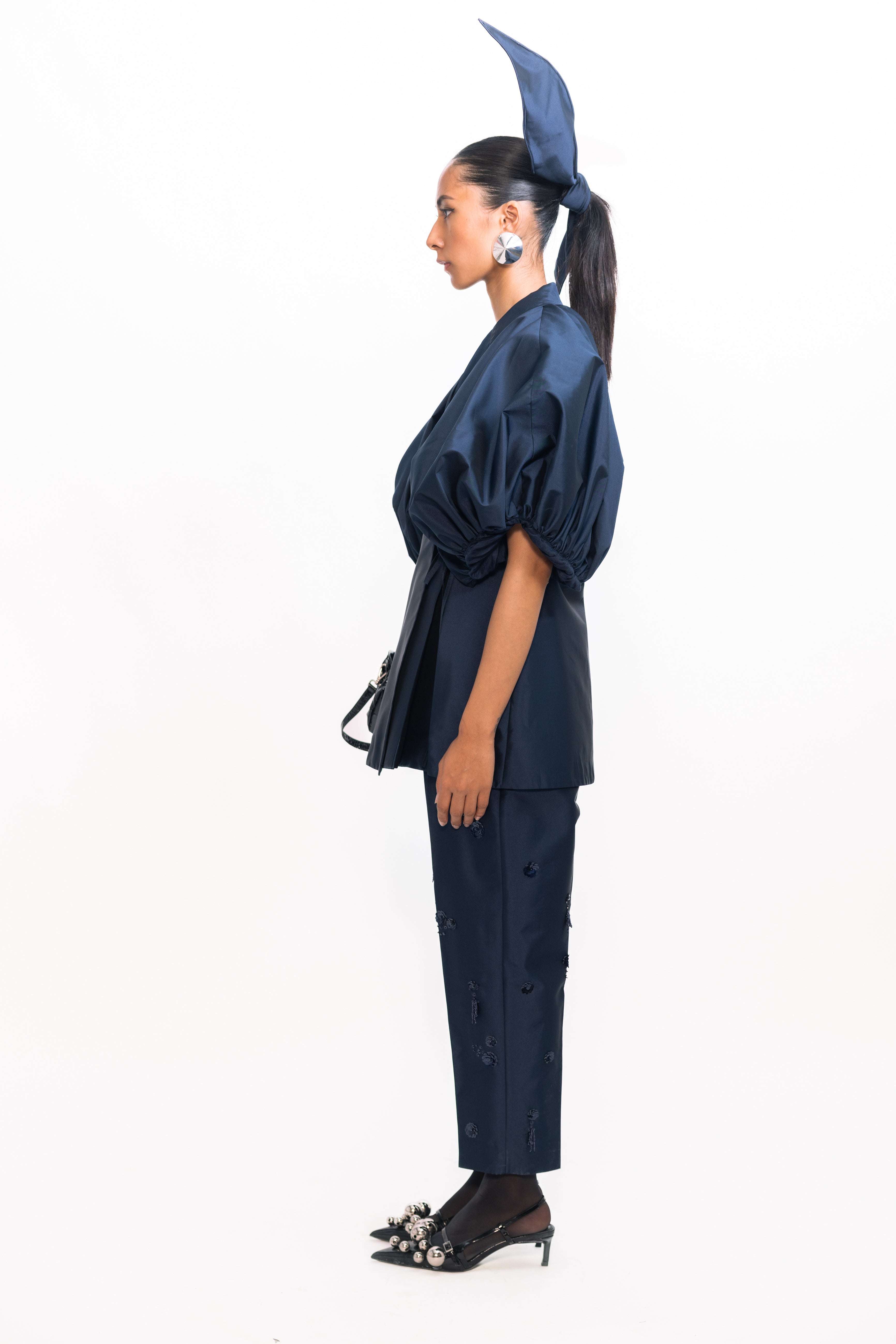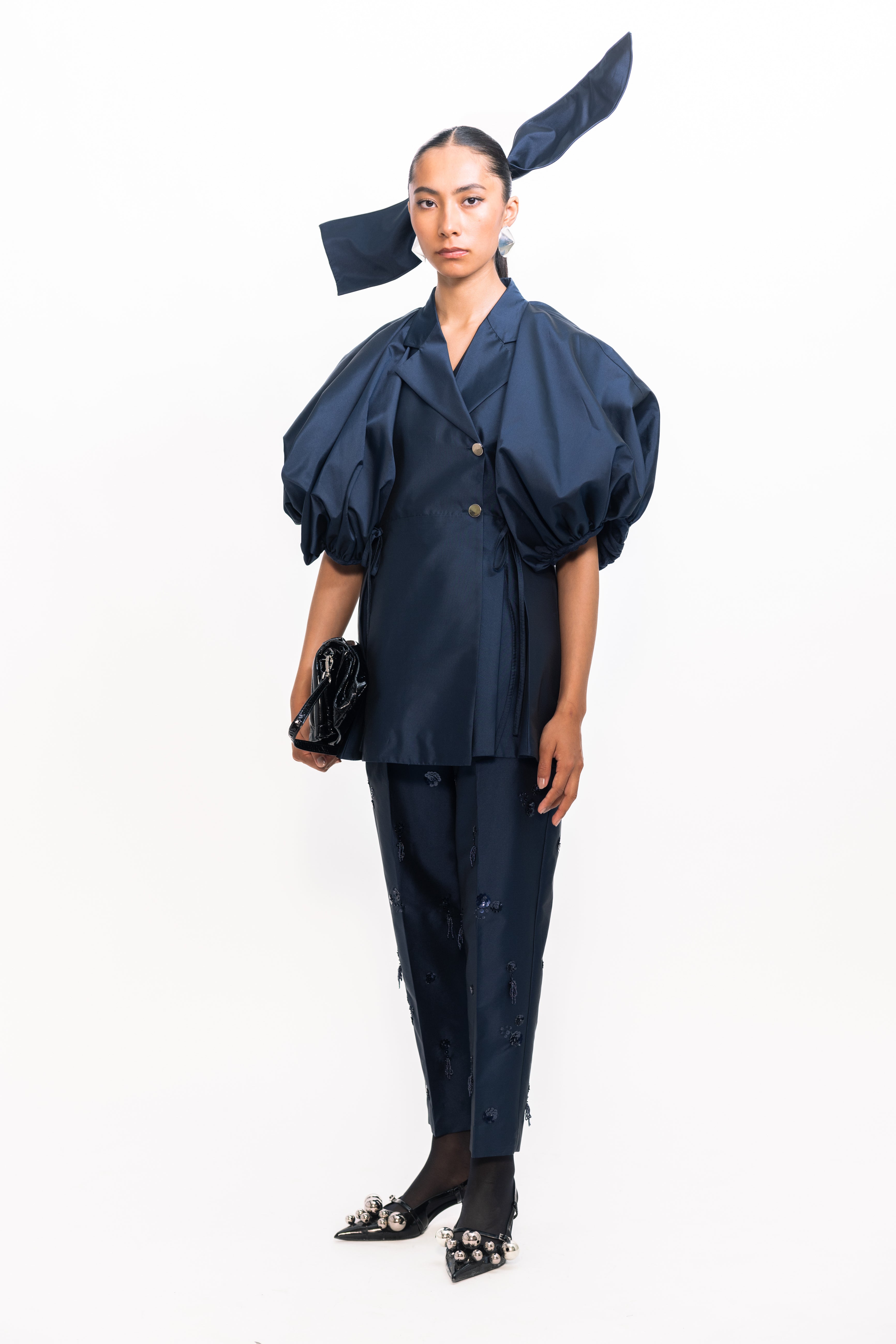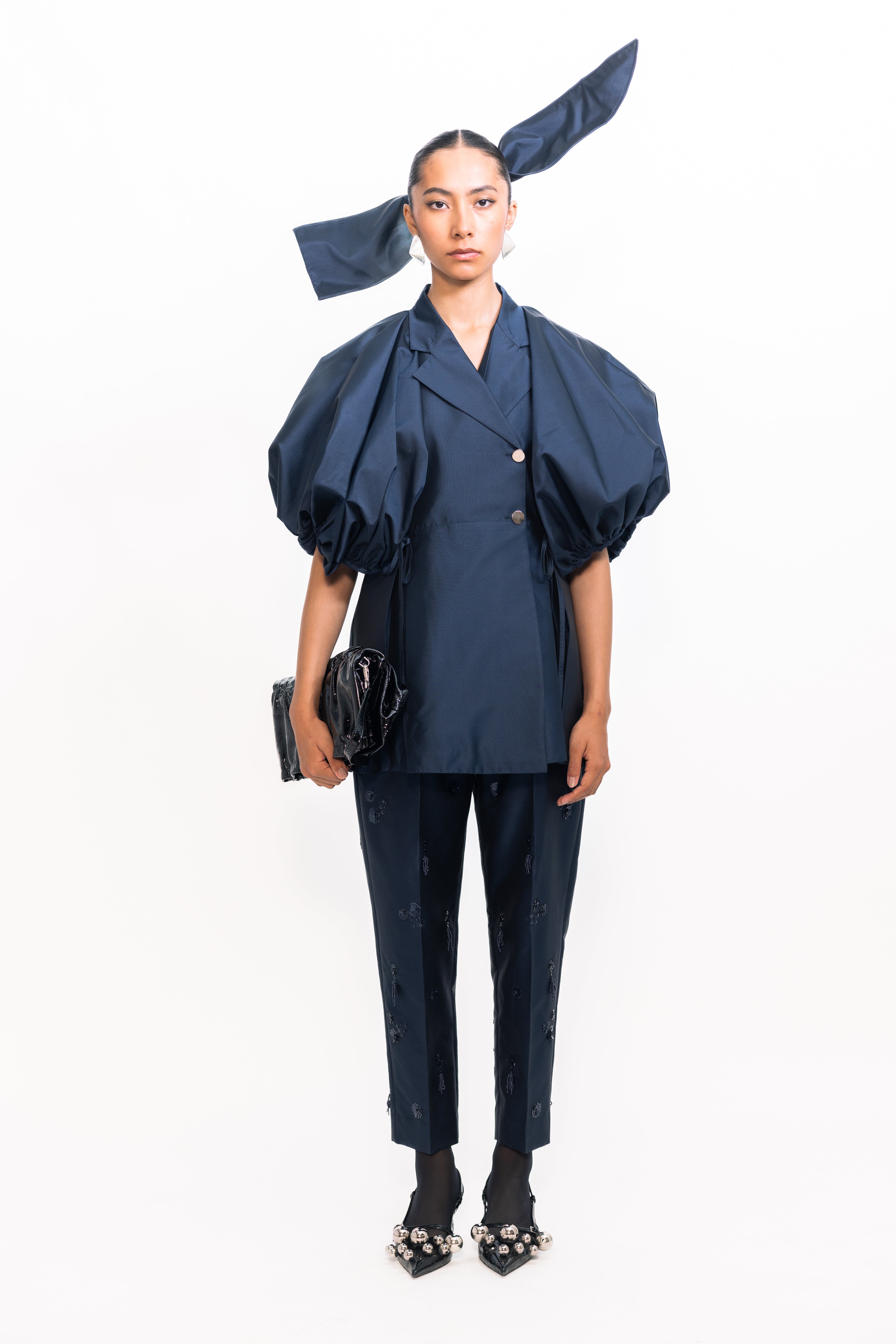 Make a statement with this overlap blazer, tailored with a contemporary wrap-front design for a sleek, flattering fit. Voluminous balloon sleeves add a bold, fashion-forward twist, balancing sharp structure with dramatic shape—perfect for elevating both workwear and evening looks.