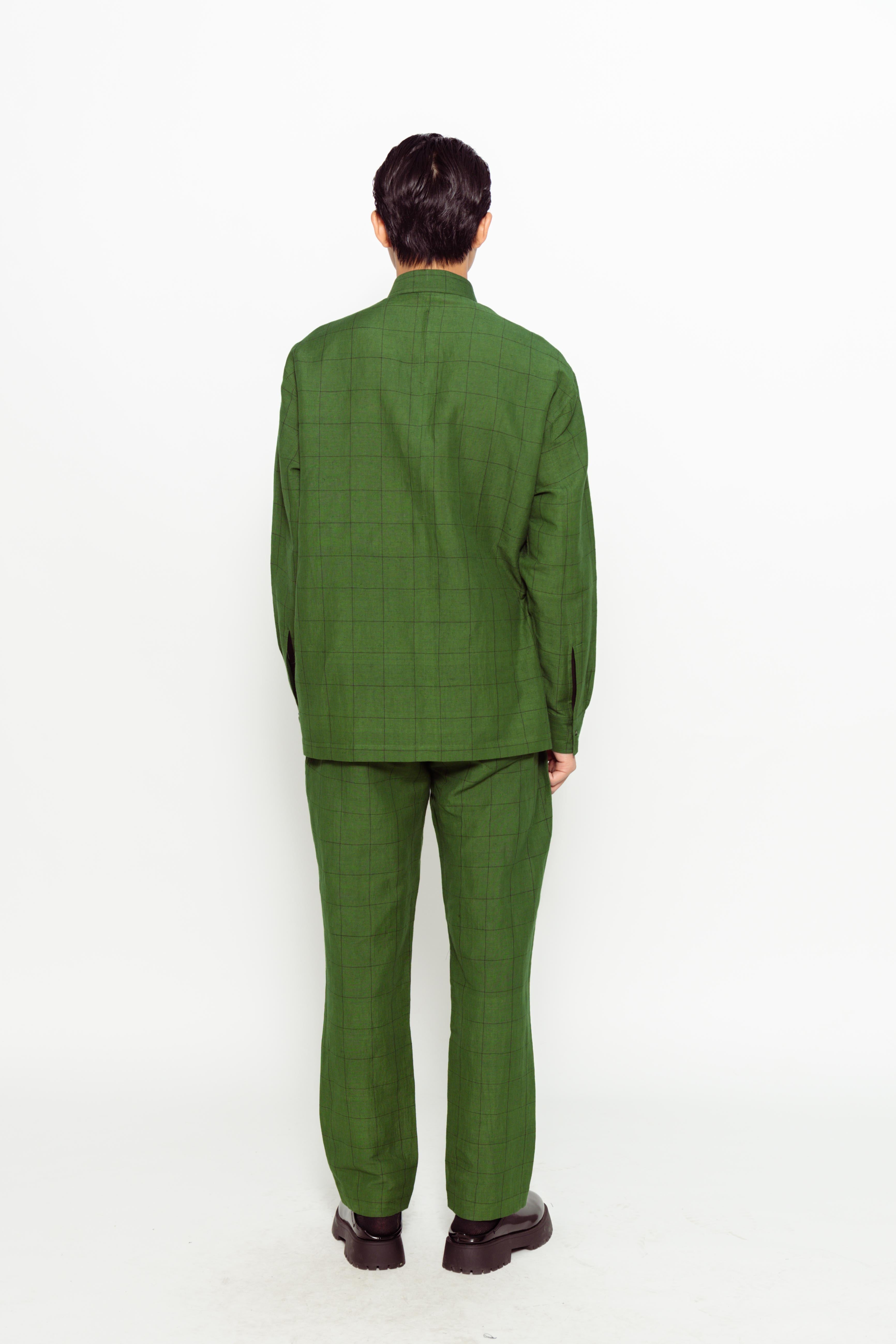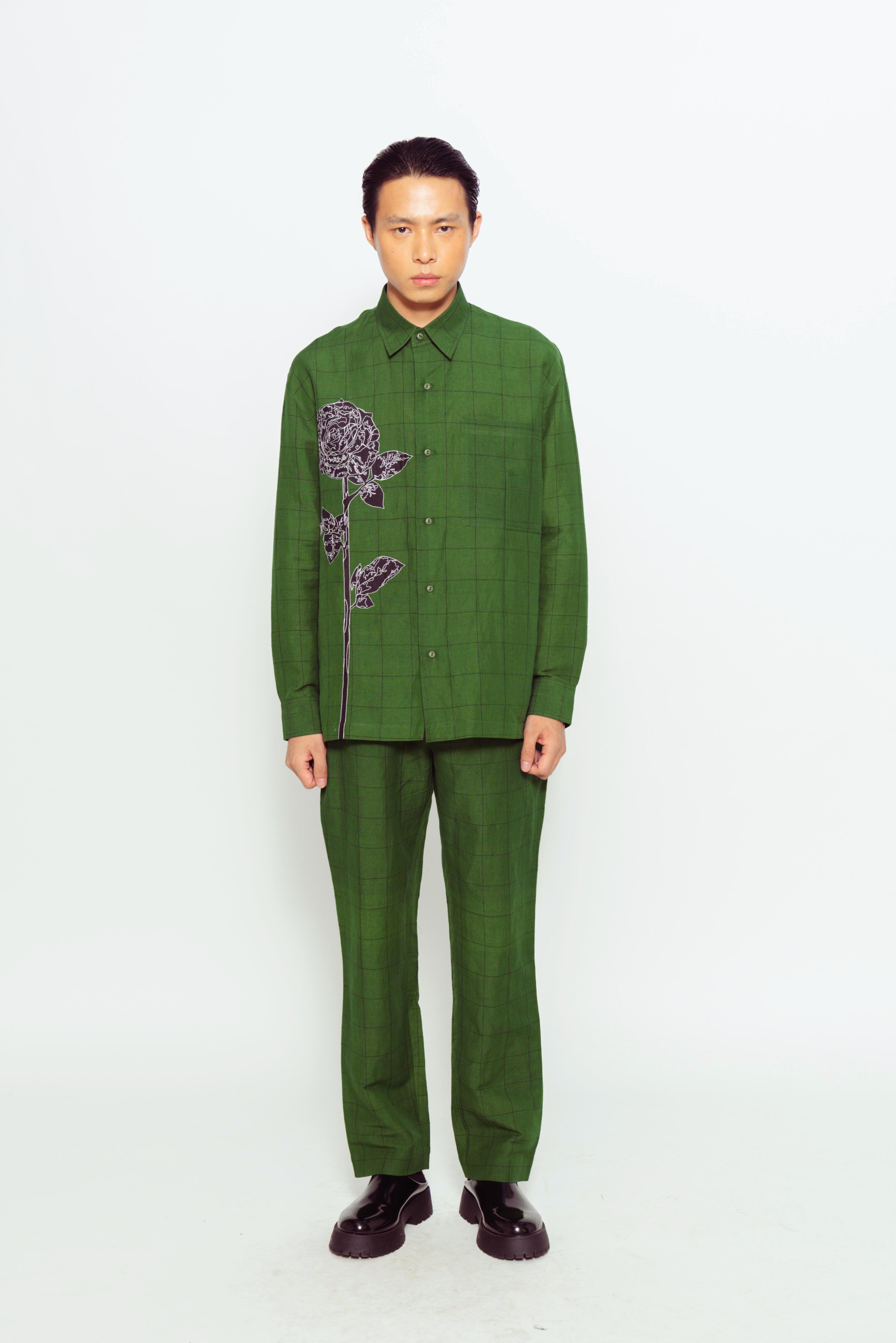 This self-checkered handloom linen full-sleeve shirt features a subtle woven pattern and is adorned with delicate applique embroidery. The breathable linen fabric and intricate detailing make it a stylish choice for casual or semi-formal wear.