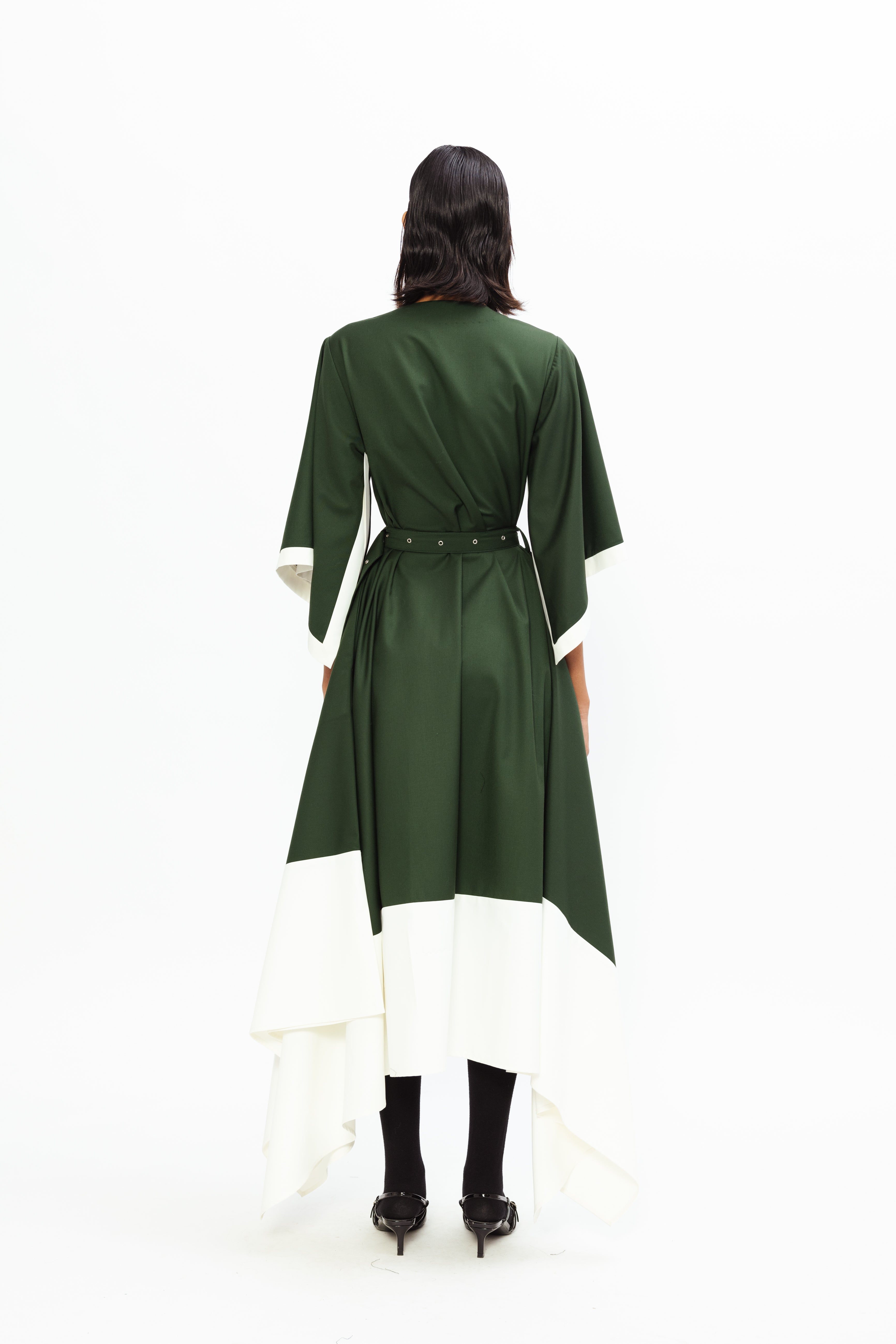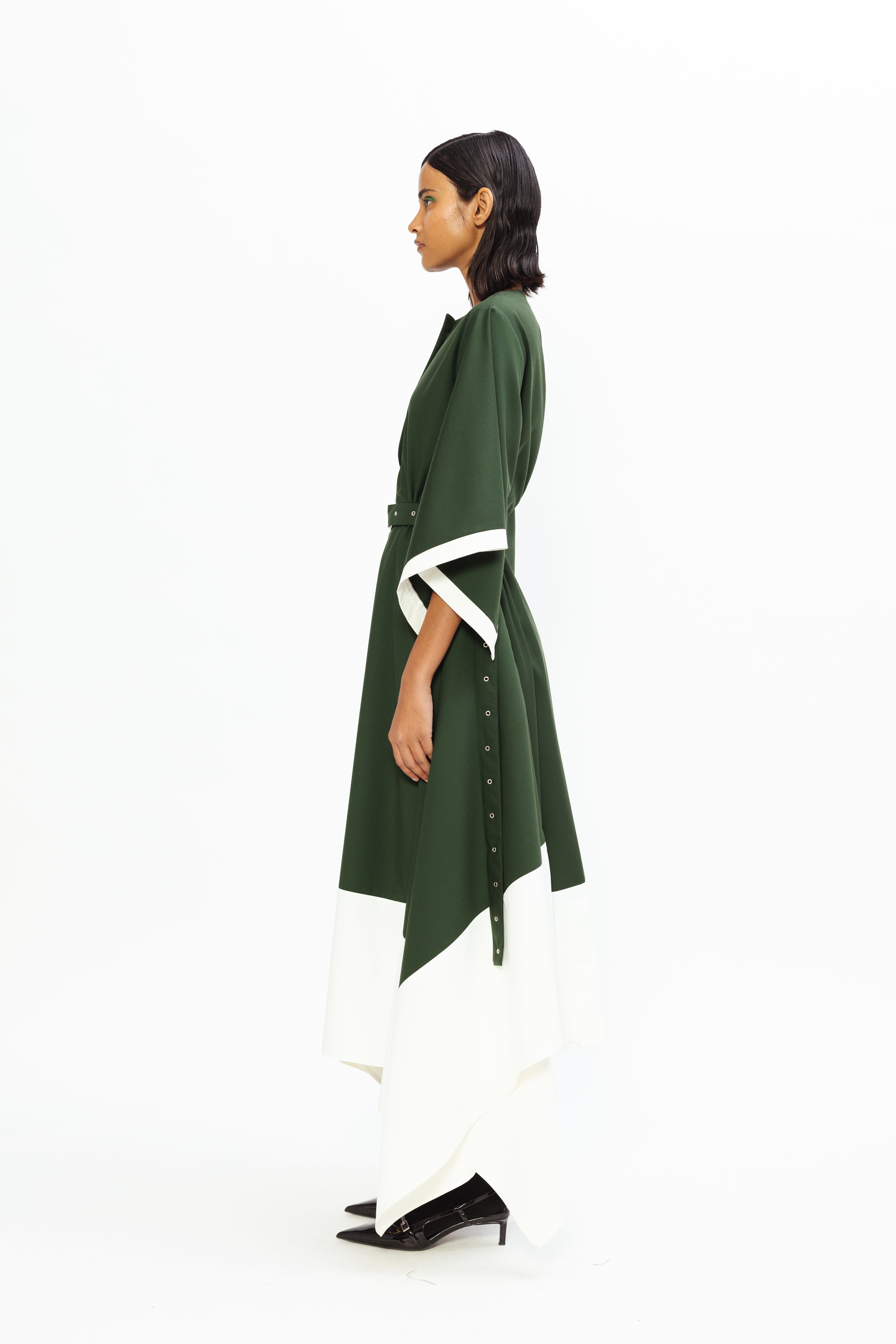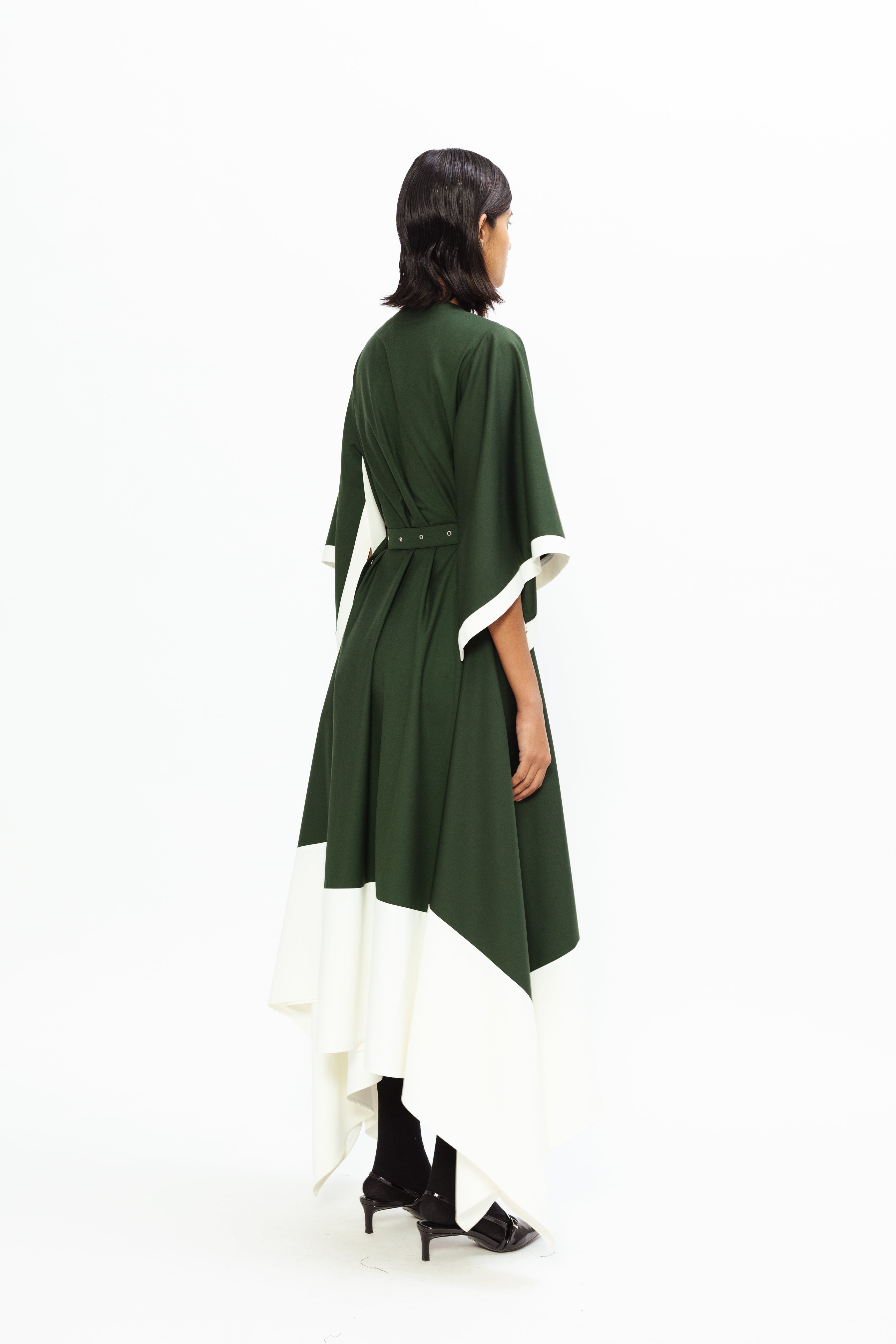 An asymmetrical dress featuring bold colour-blocking in hunter green and ivory. The angled hemline and fluid silhouette create a striking, dynamic look, while the clean lines and contrasting panels add a modern sense of style and elegance.