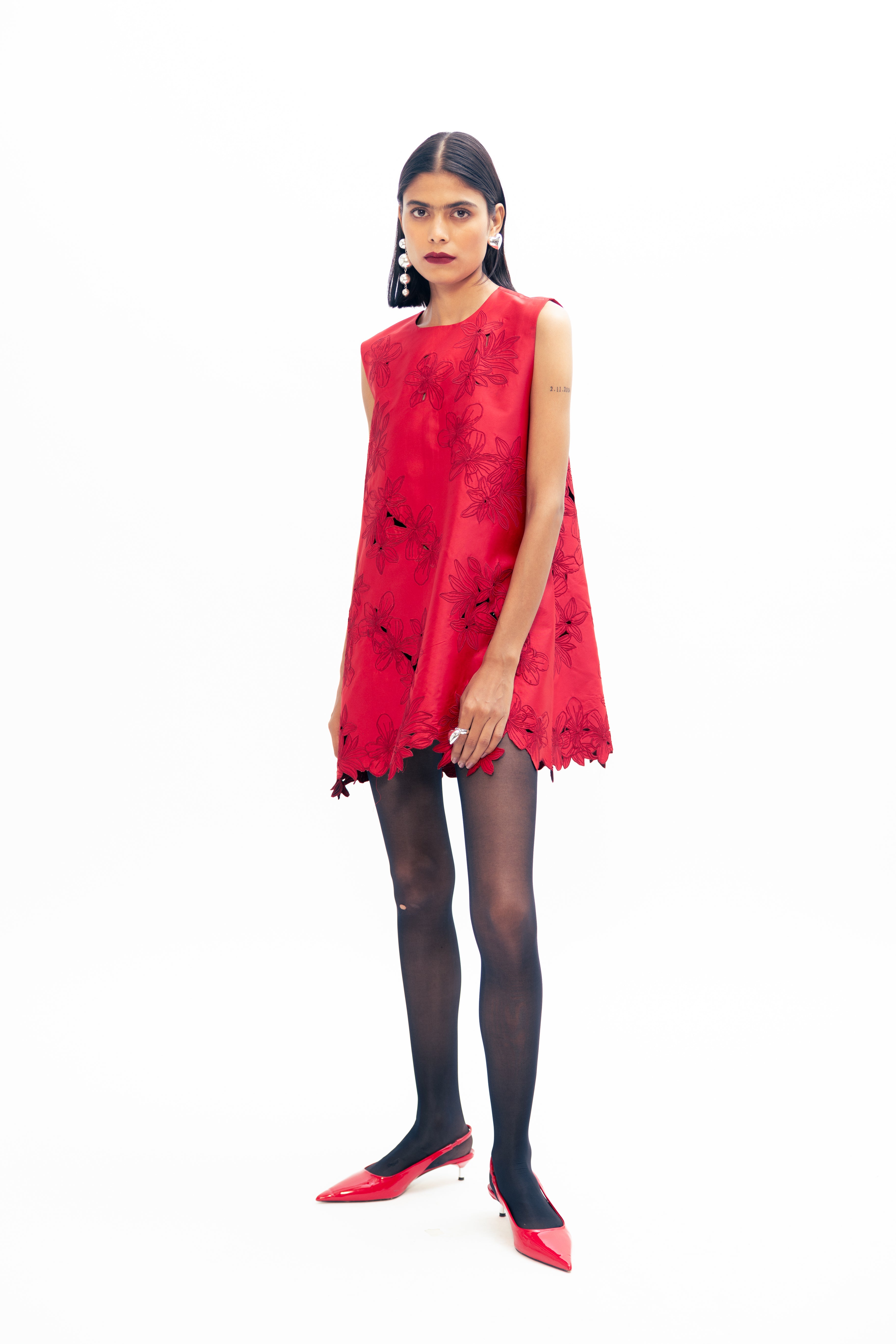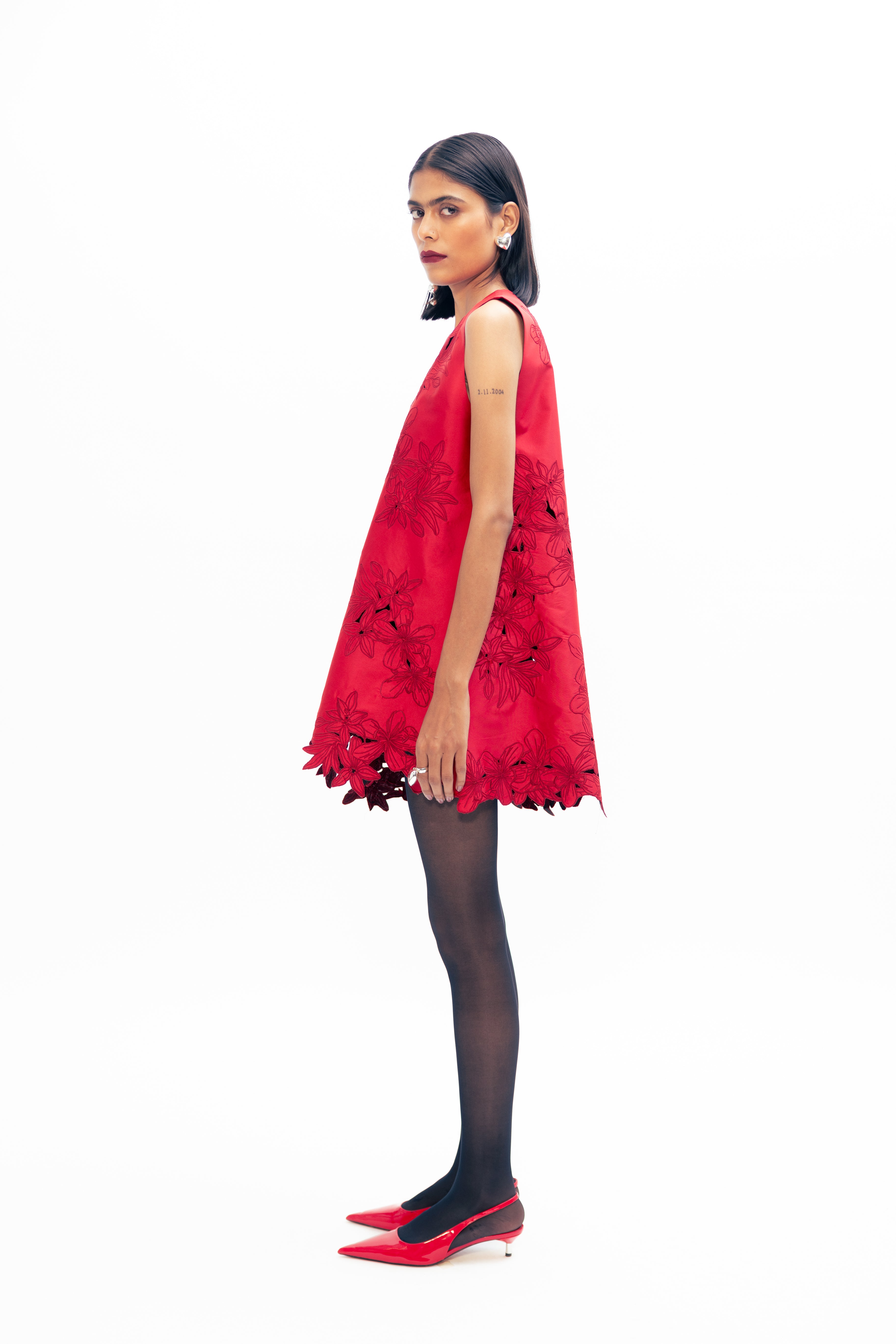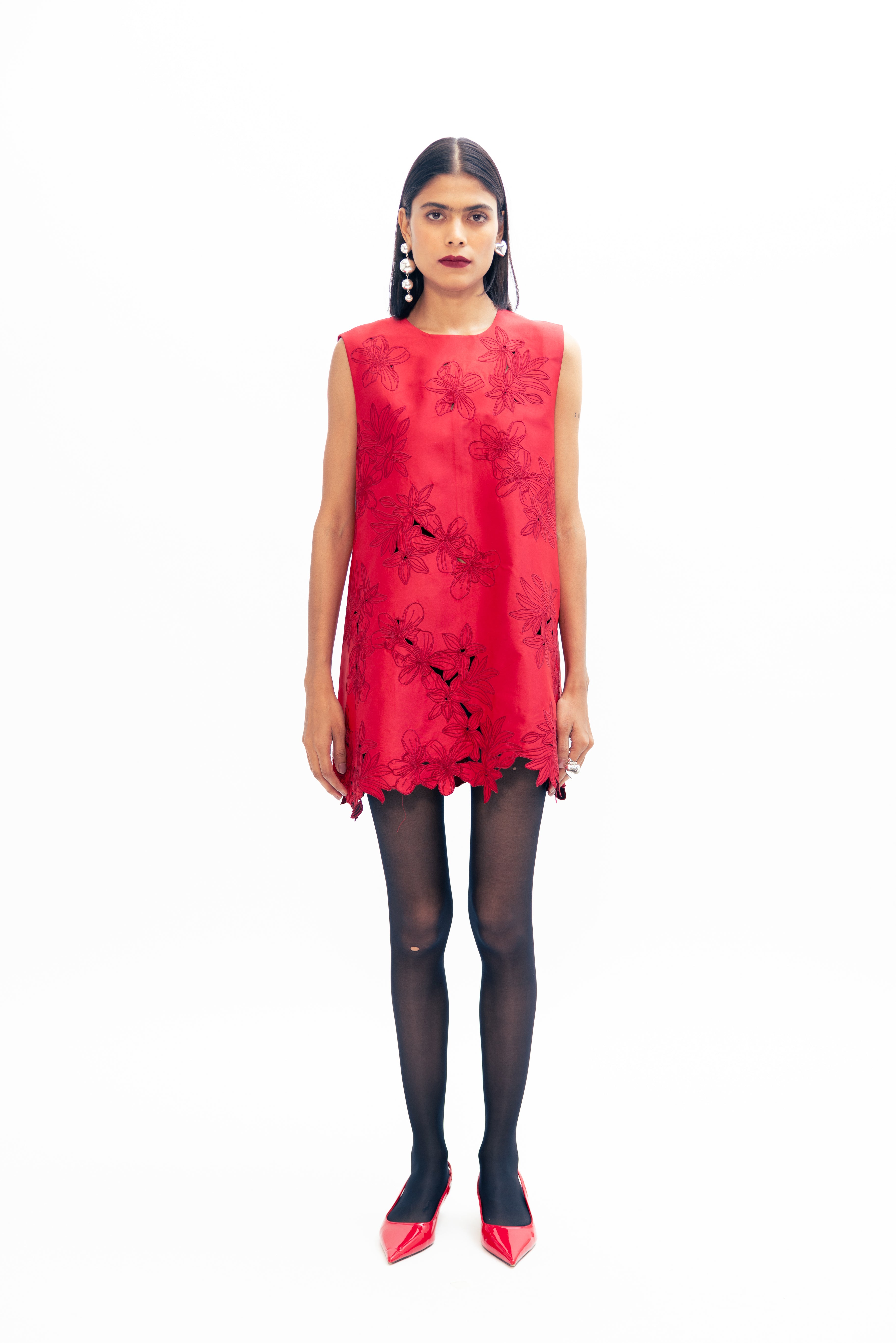 A study in shadow and intricacy, this piece is defined by its openwork surface—delicate yet deliberate. Negative space becomes pattern, with every cut and curve revealing just enough. Its form is fluid, shaped to follow the body with quiet elegance, while the surface shifts between opacity and air. A bold softness runs through it, offering both strength and lightness in one considered gesture.