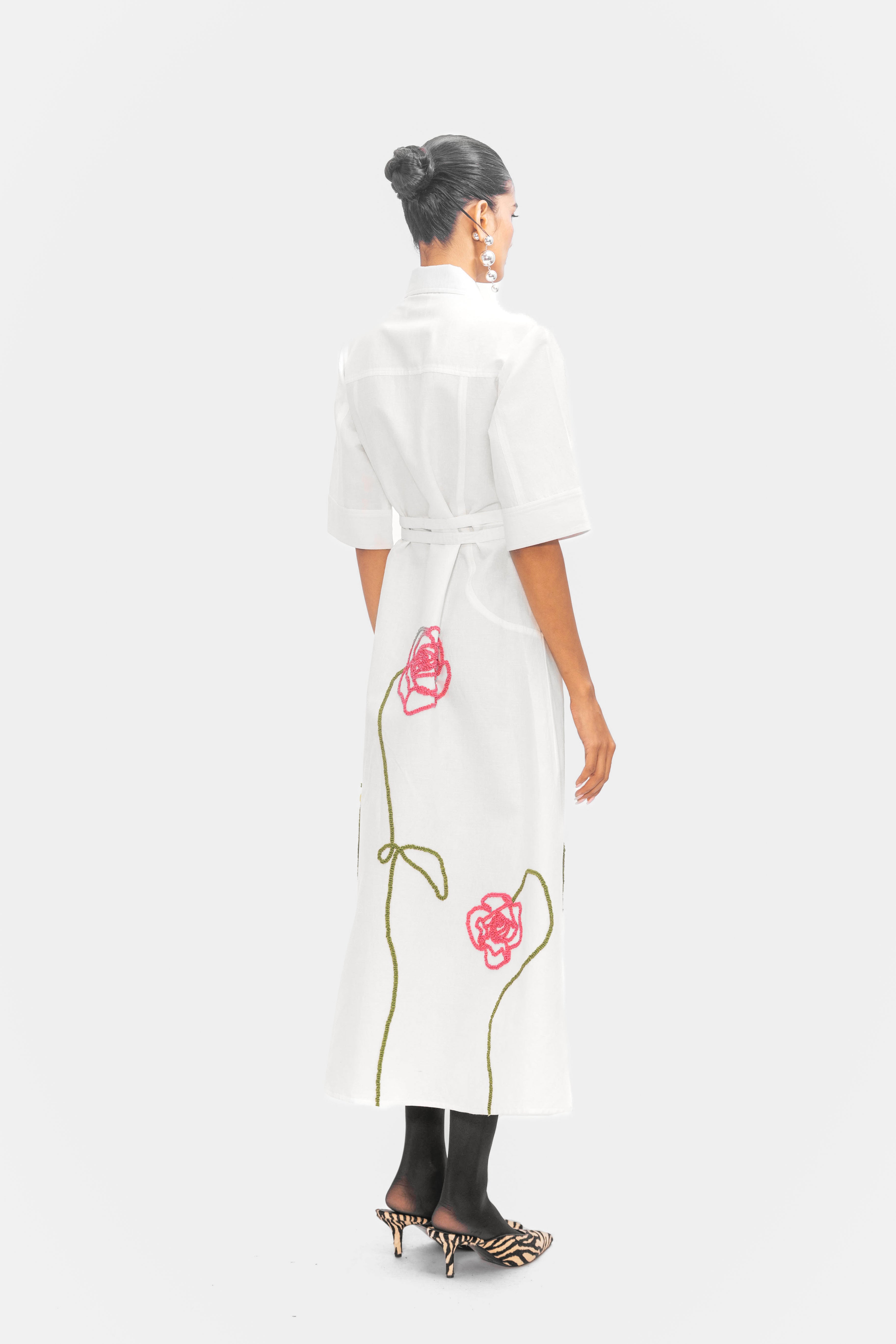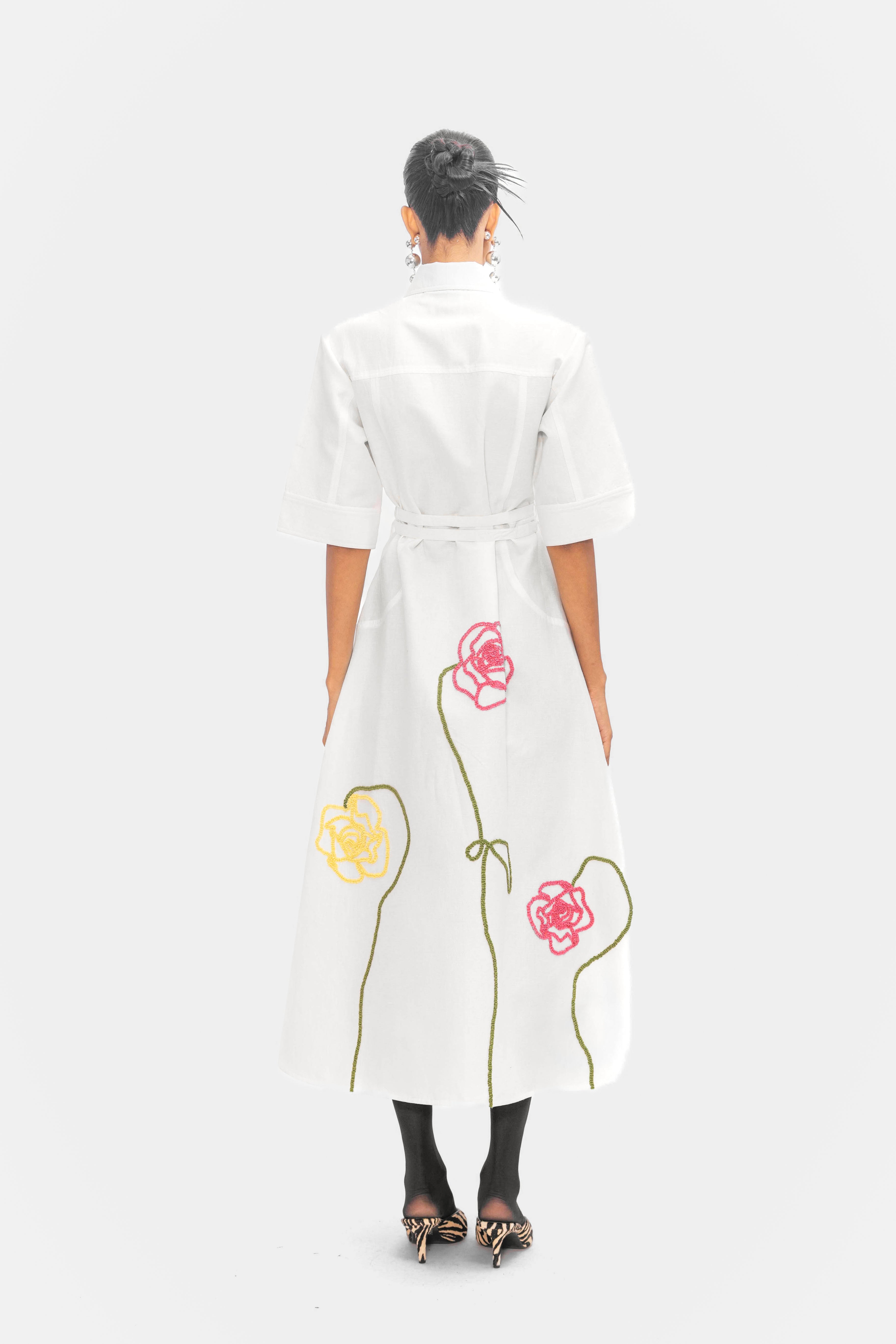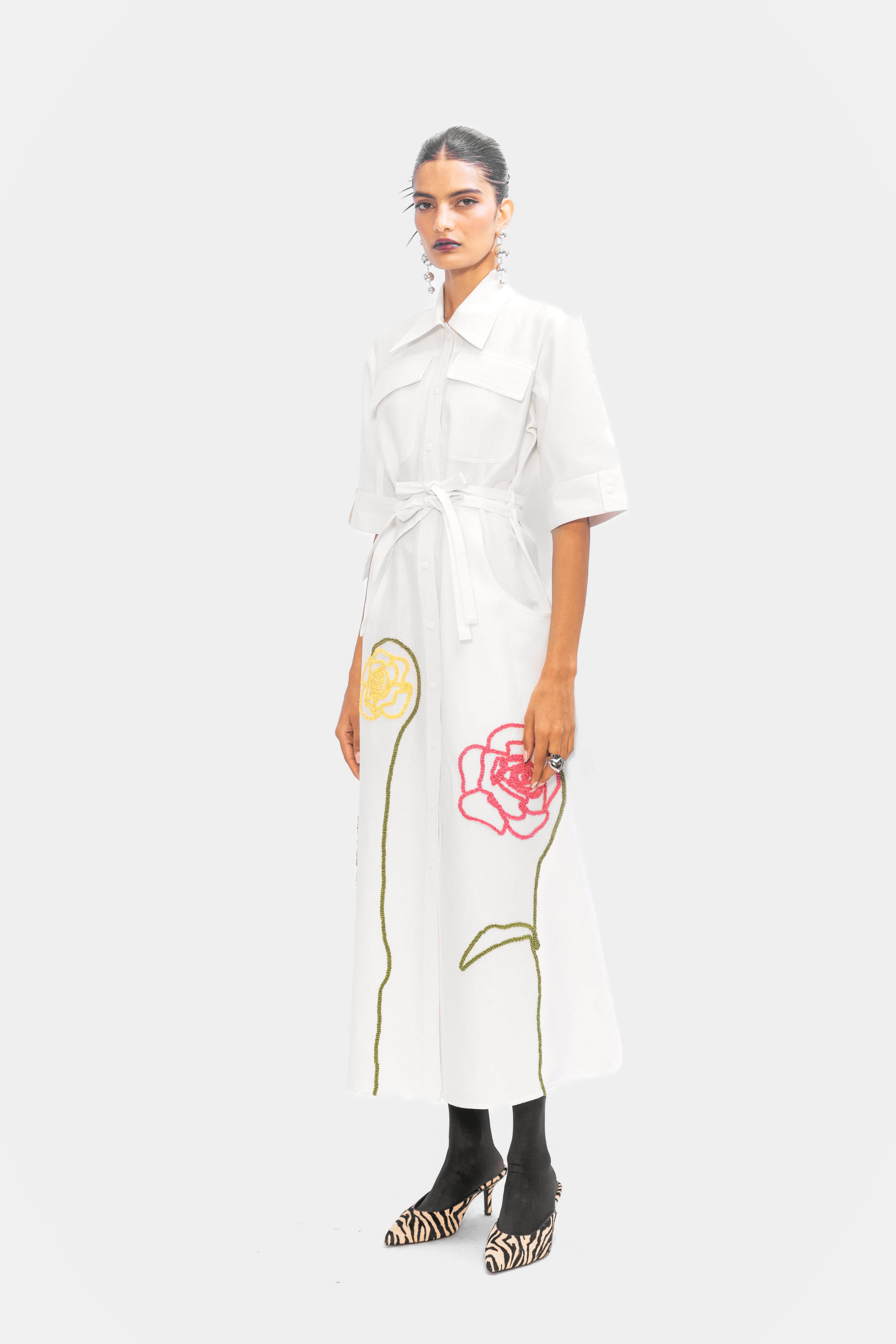 A ivory full-length shirt dress featuring a structured collar and clean, tailored silhouette. It is detailed with ivory floral embroidery, adding a refined artisanal touch. Blending utility-inspired design with elegance, it’s perfect for both everyday wear and elevated occasions.