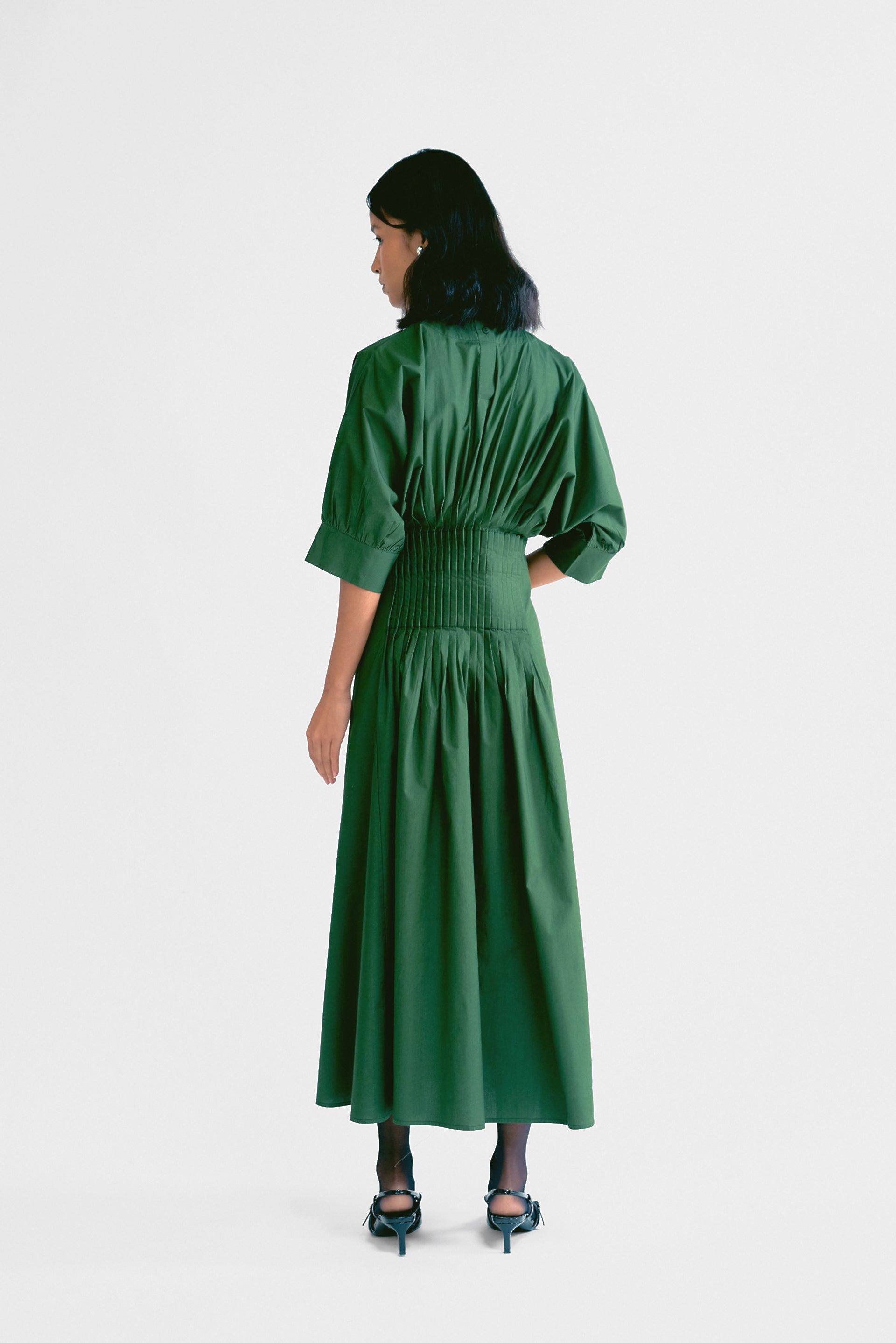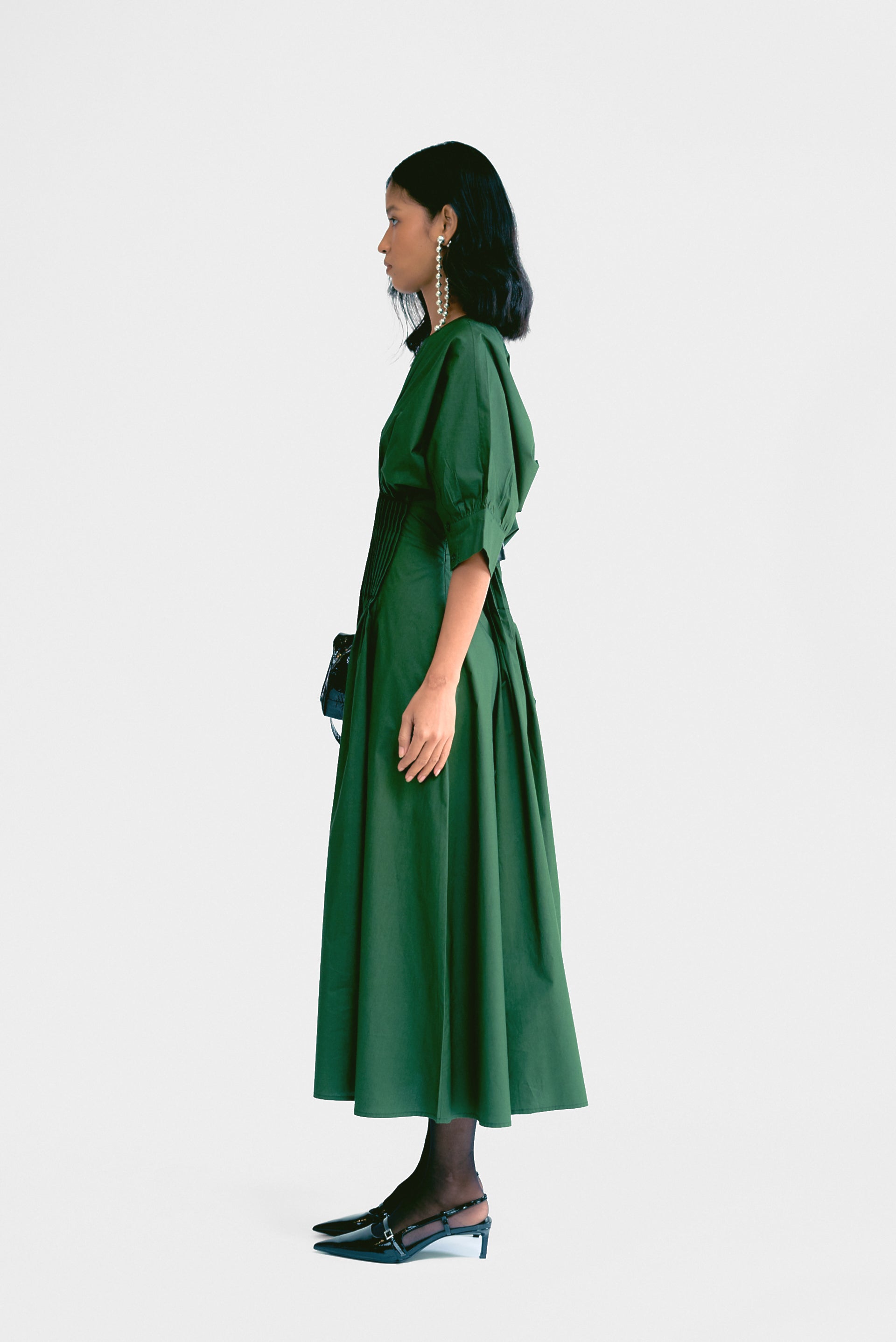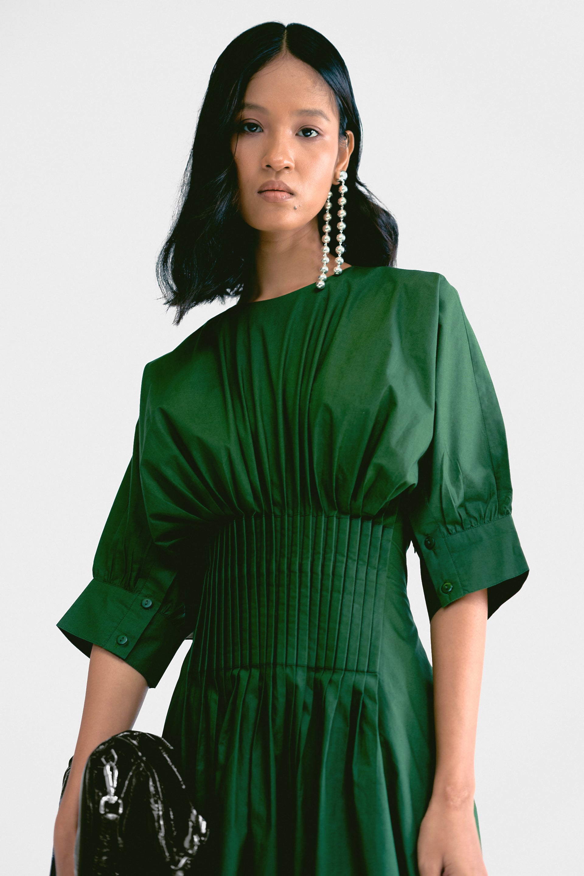 A timeless look with modern details. This pleated front dress features buttoned sleeves, offering effortless elegance for any occasion.