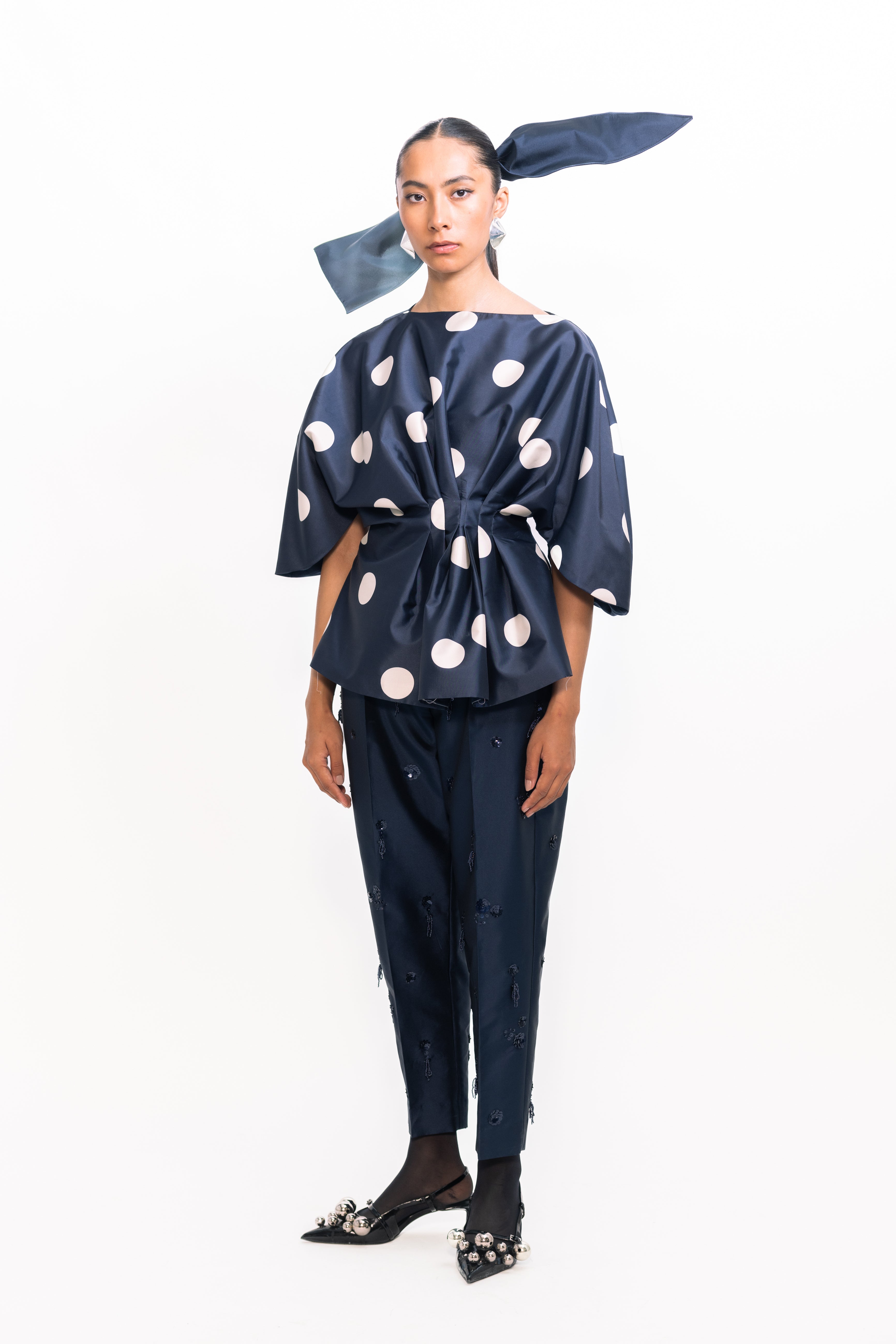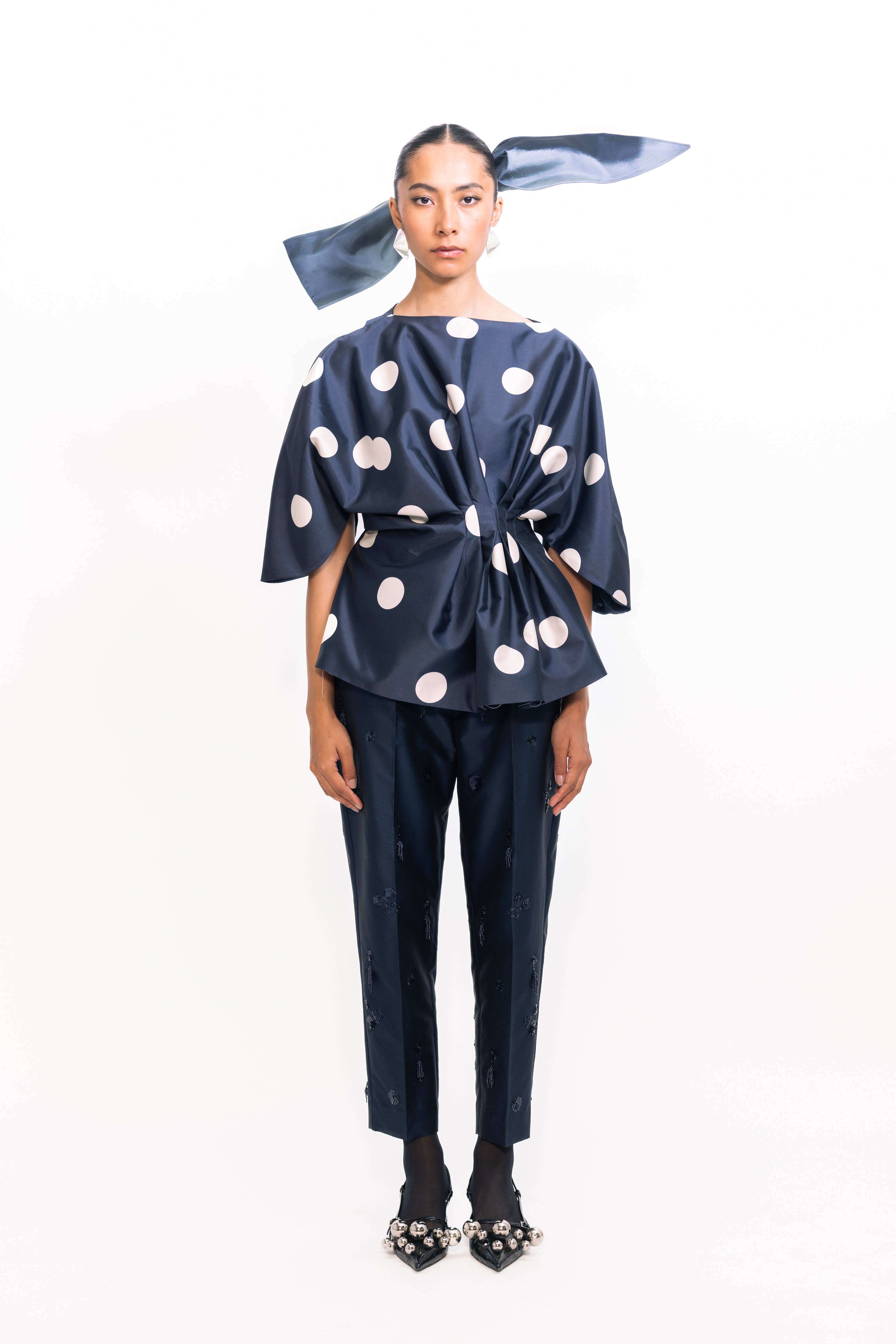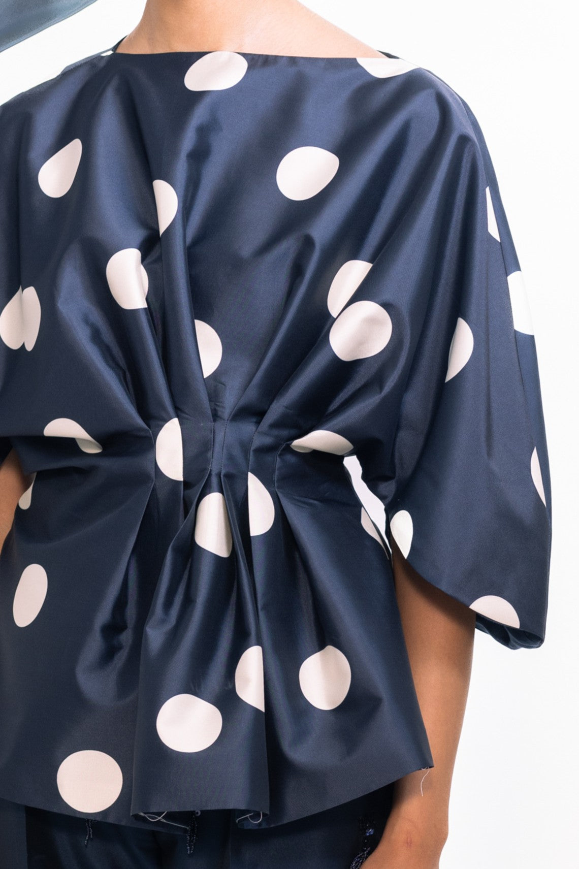 A timeless look with modern details, this top features a drape at the waist for a subtle cinch effect that beautifully defines the silhouette. Classic polka-dot accents add playful charm and texture, while buttoned sleeves lend a refined finish—perfect for both daytime celebrations and evening occasions.