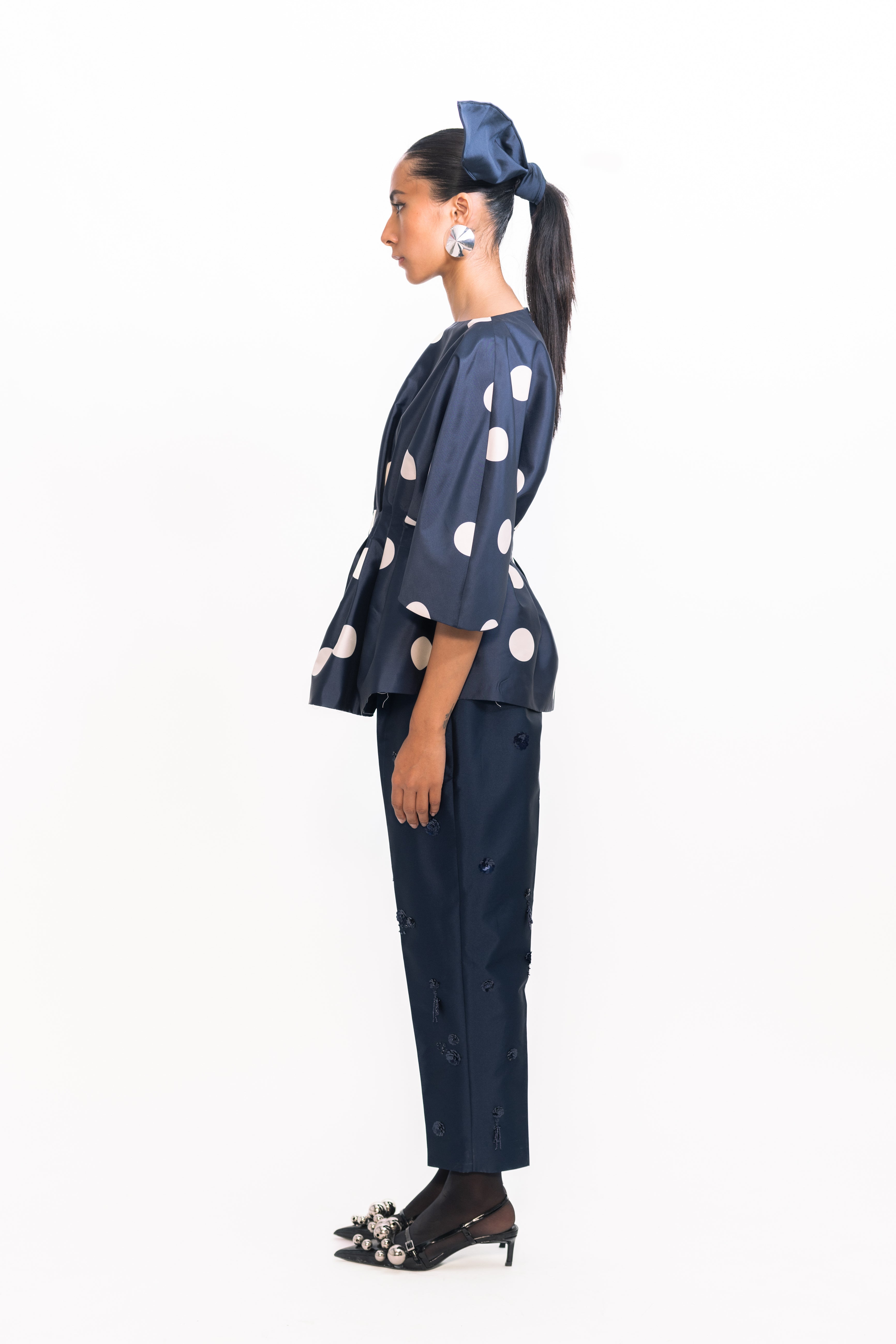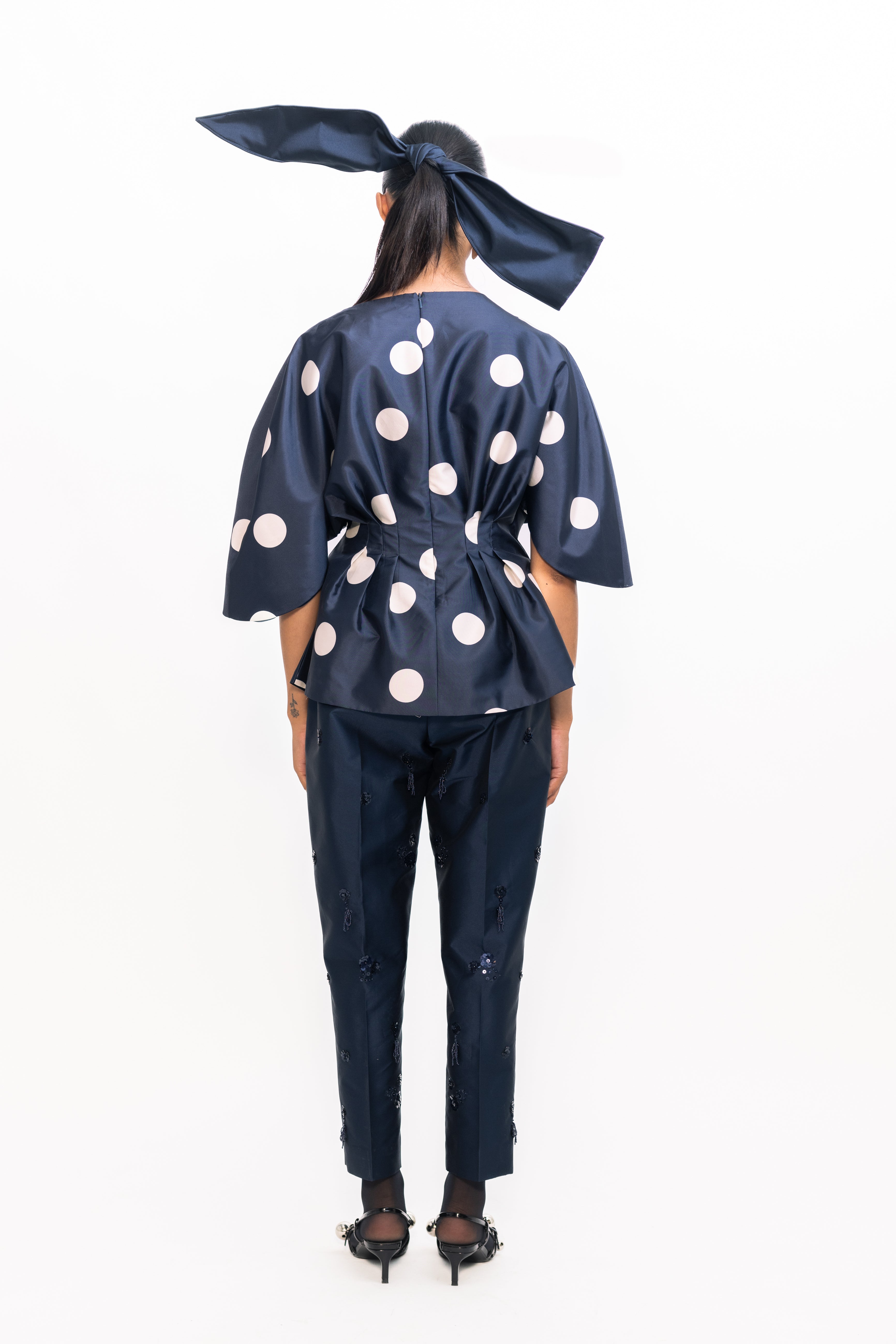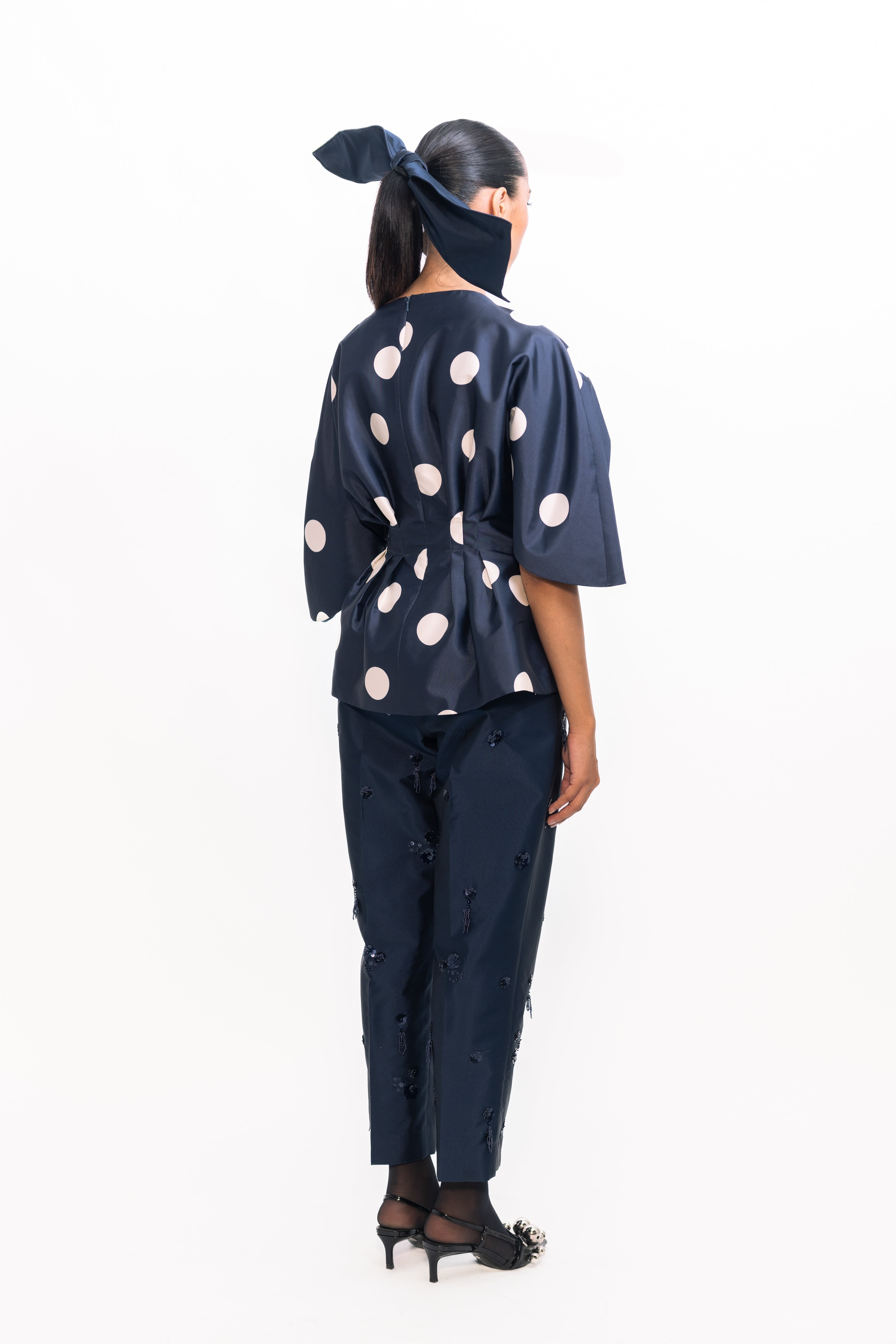 A timeless look with modern details, this top features a drape at the waist for a subtle cinch effect that beautifully defines the silhouette. Classic polka-dot accents add playful charm and texture, while buttoned sleeves lend a refined finish—perfect for both daytime celebrations and evening occasions.