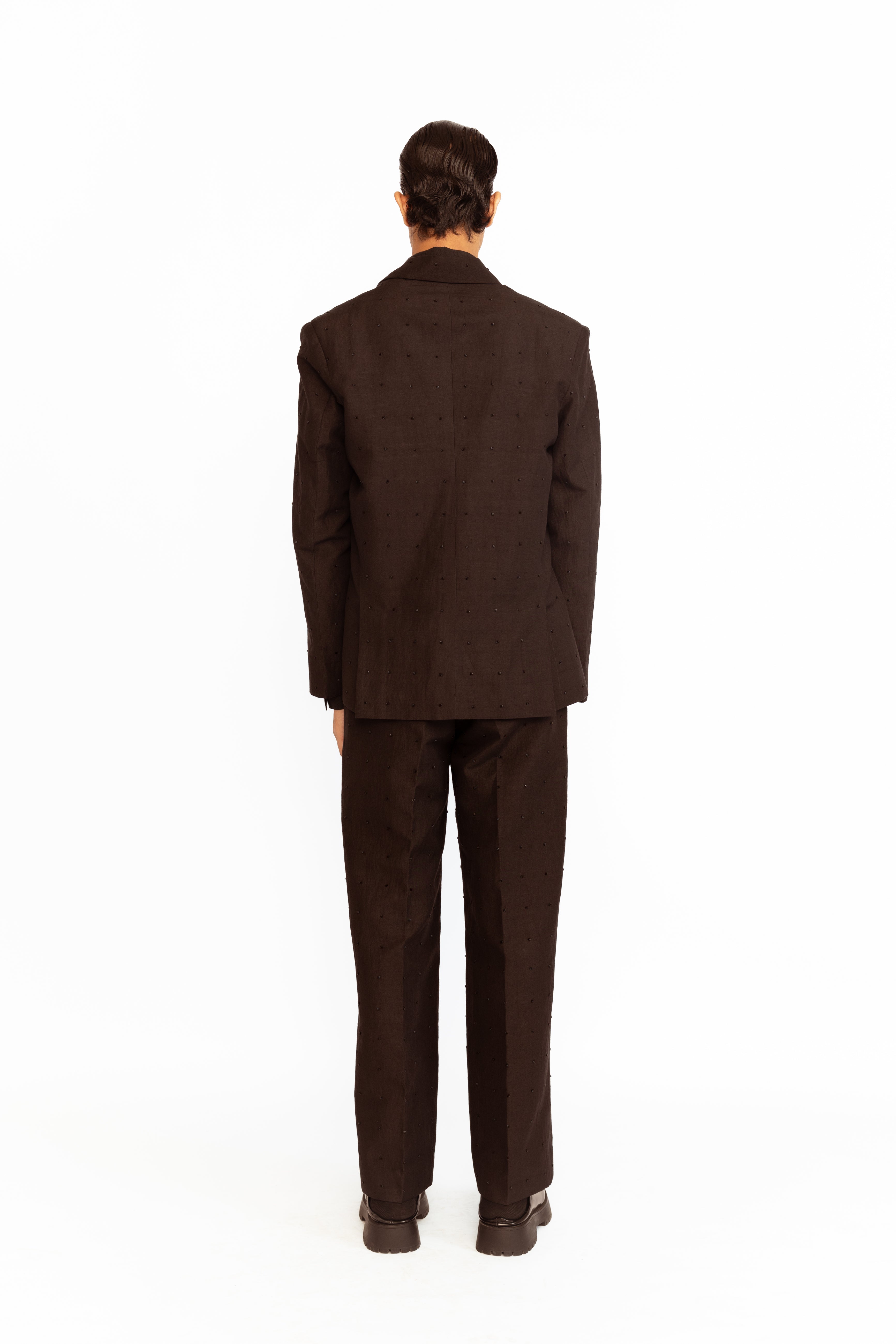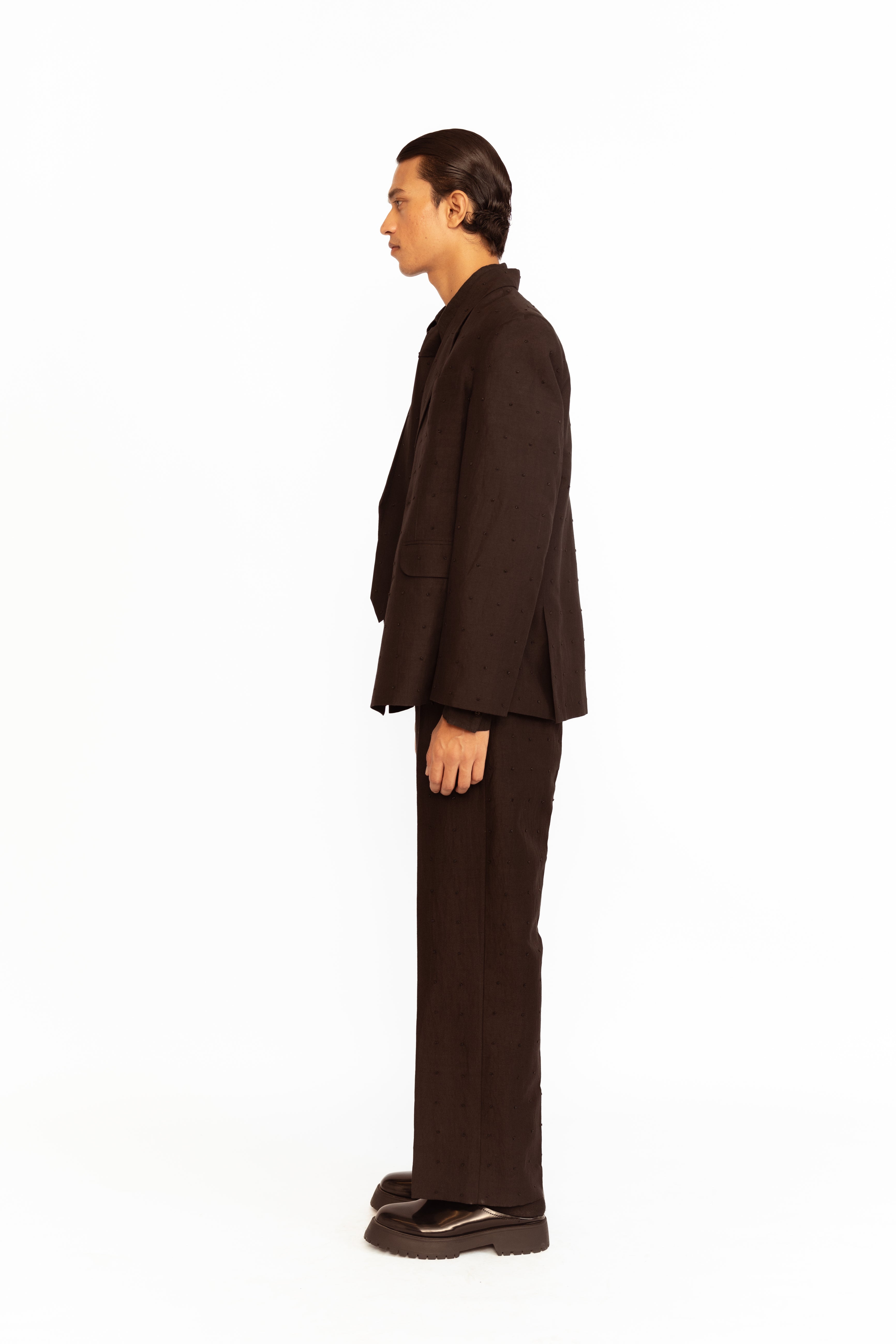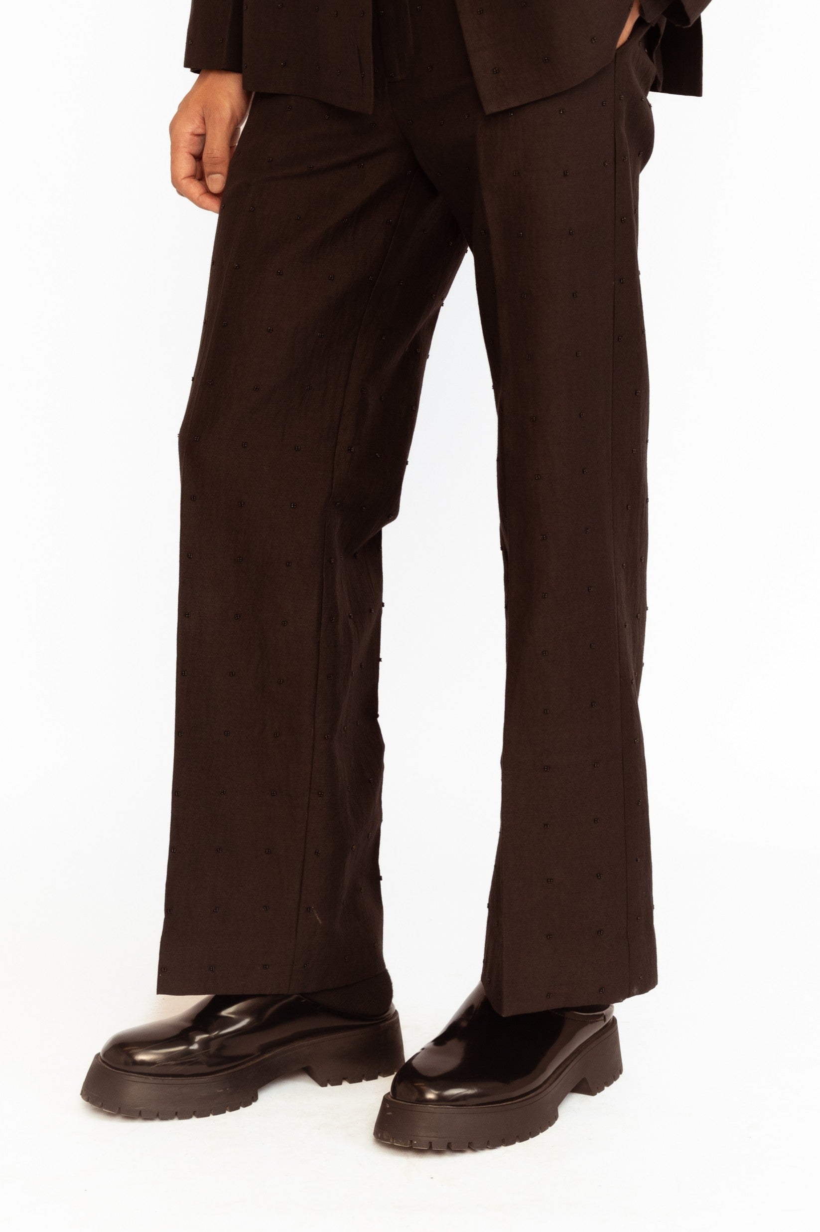 A contemporary classic, these straight linen trousers are adorned with detailed grid bead and sequin embroidery, complemented by side pockets and a back pocket for a sophisticated, refined silhouette.