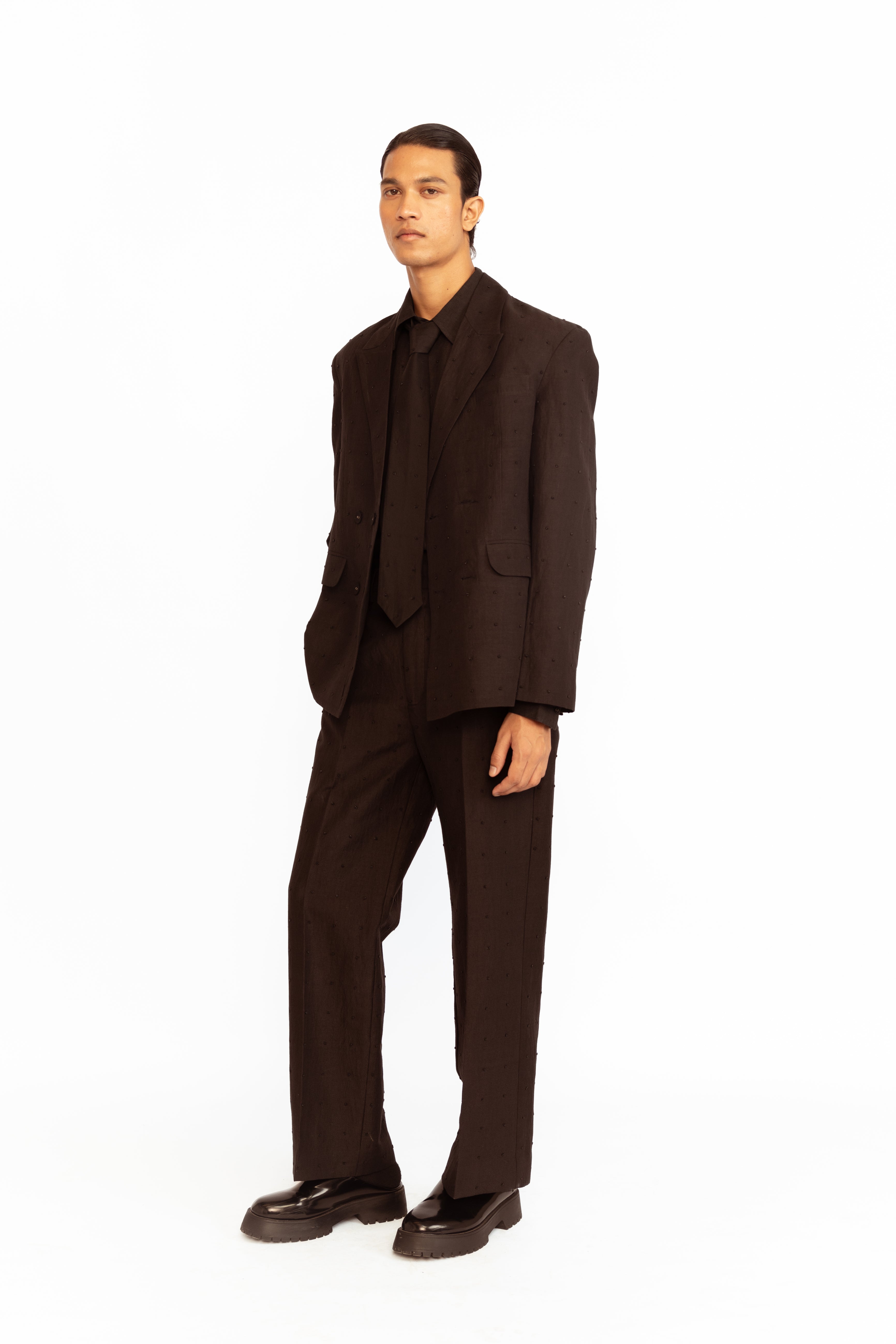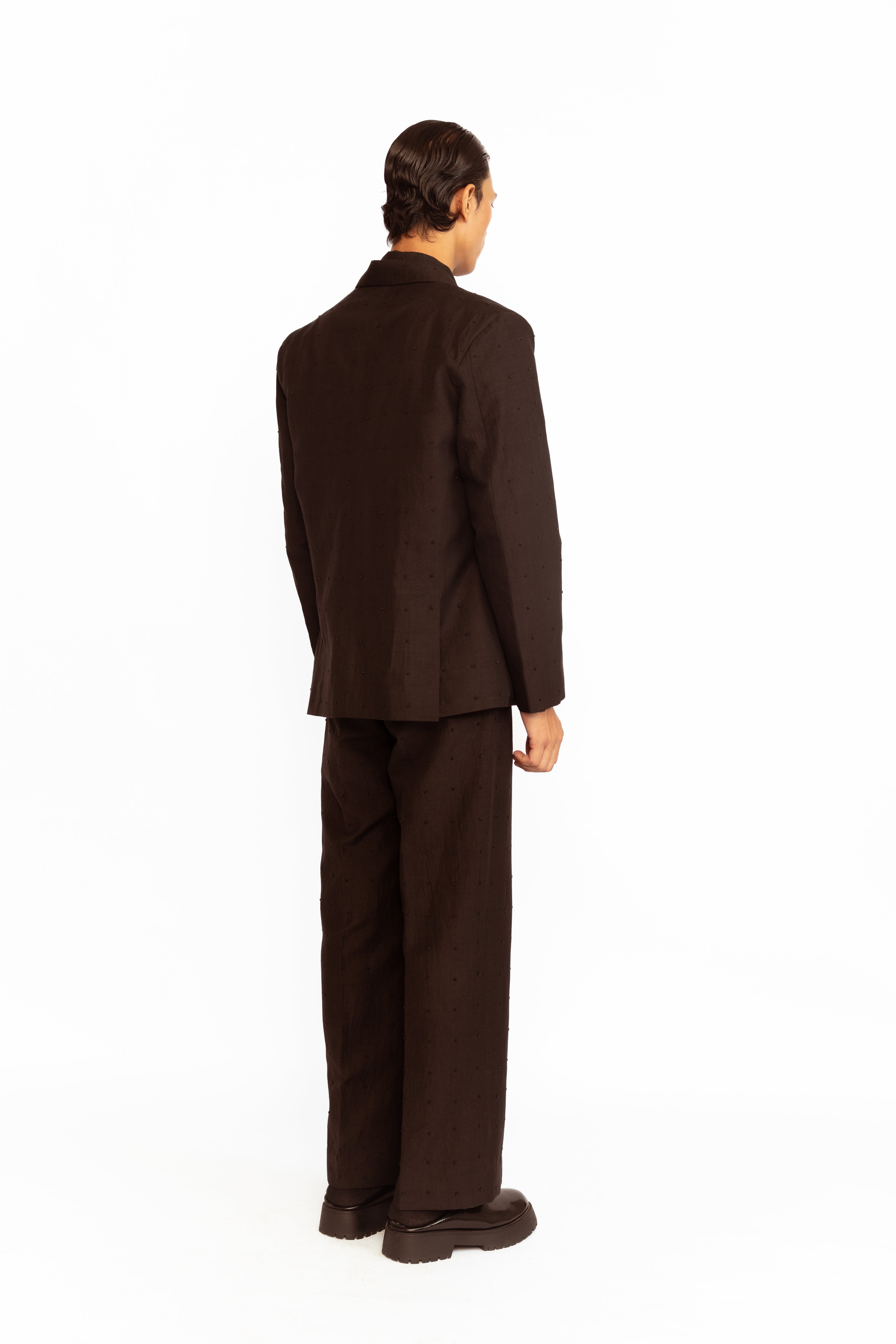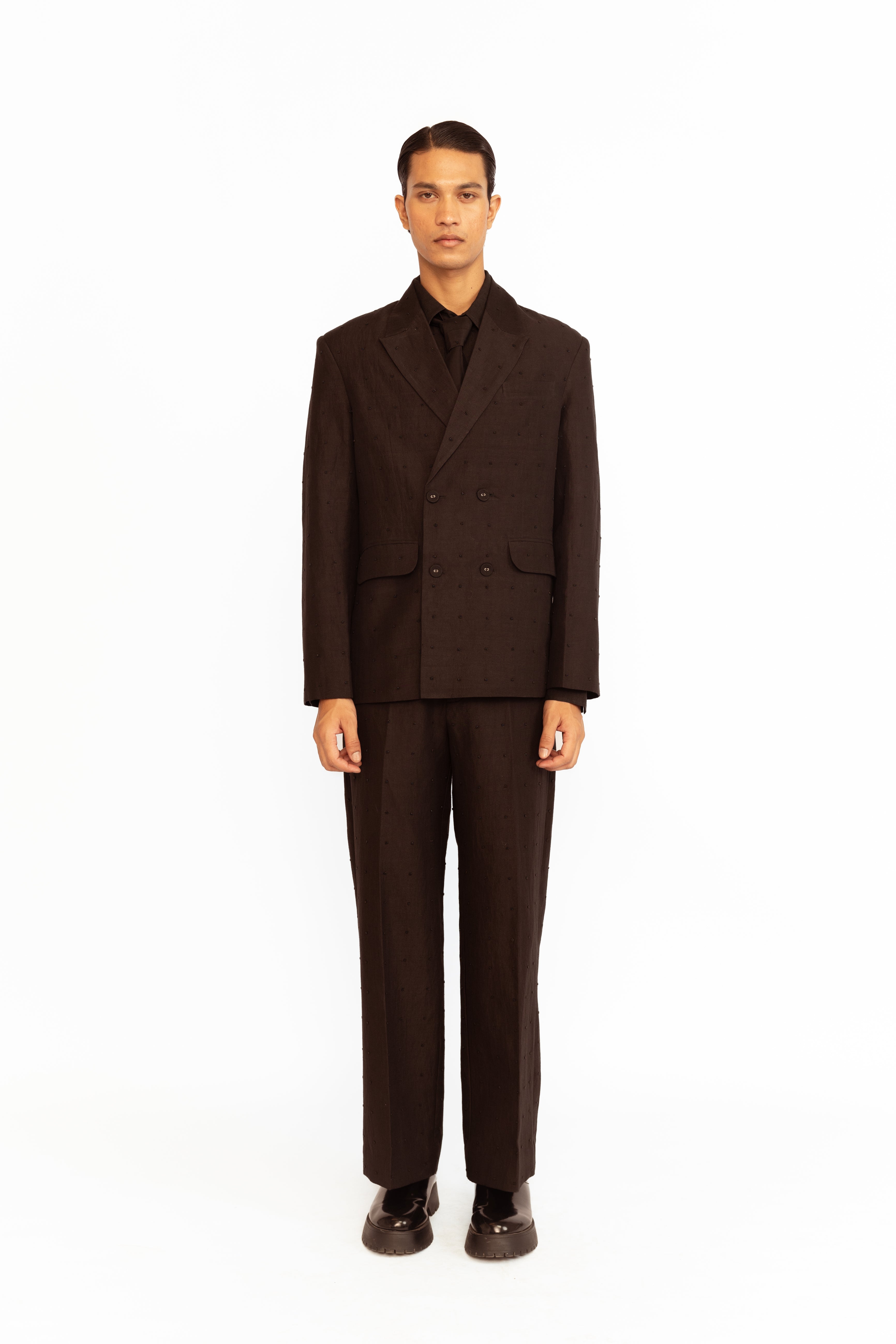 A contemporary classic, these straight linen trousers are adorned with detailed grid bead and sequin embroidery, complemented by side pockets and a back pocket for a sophisticated, refined silhouette.