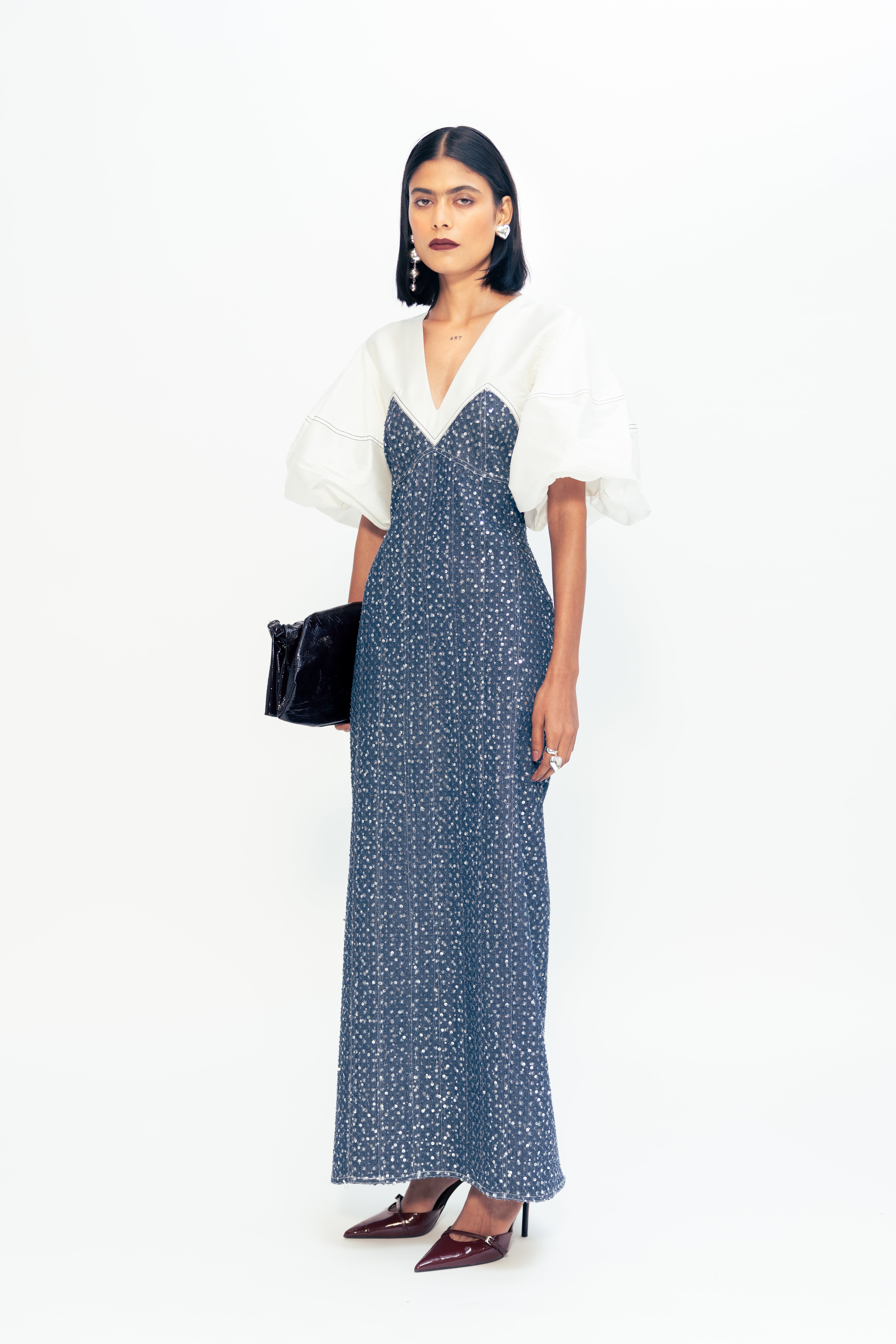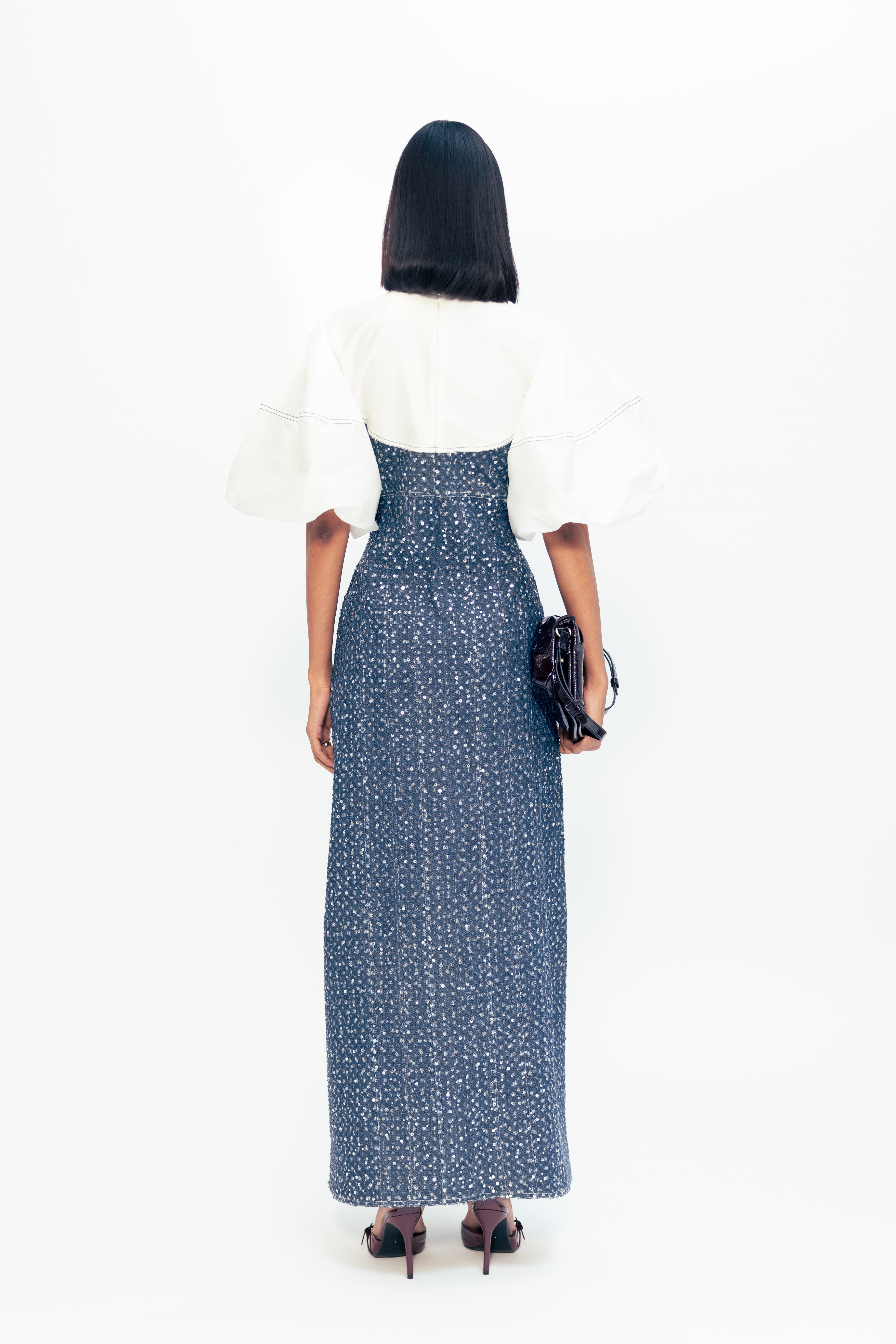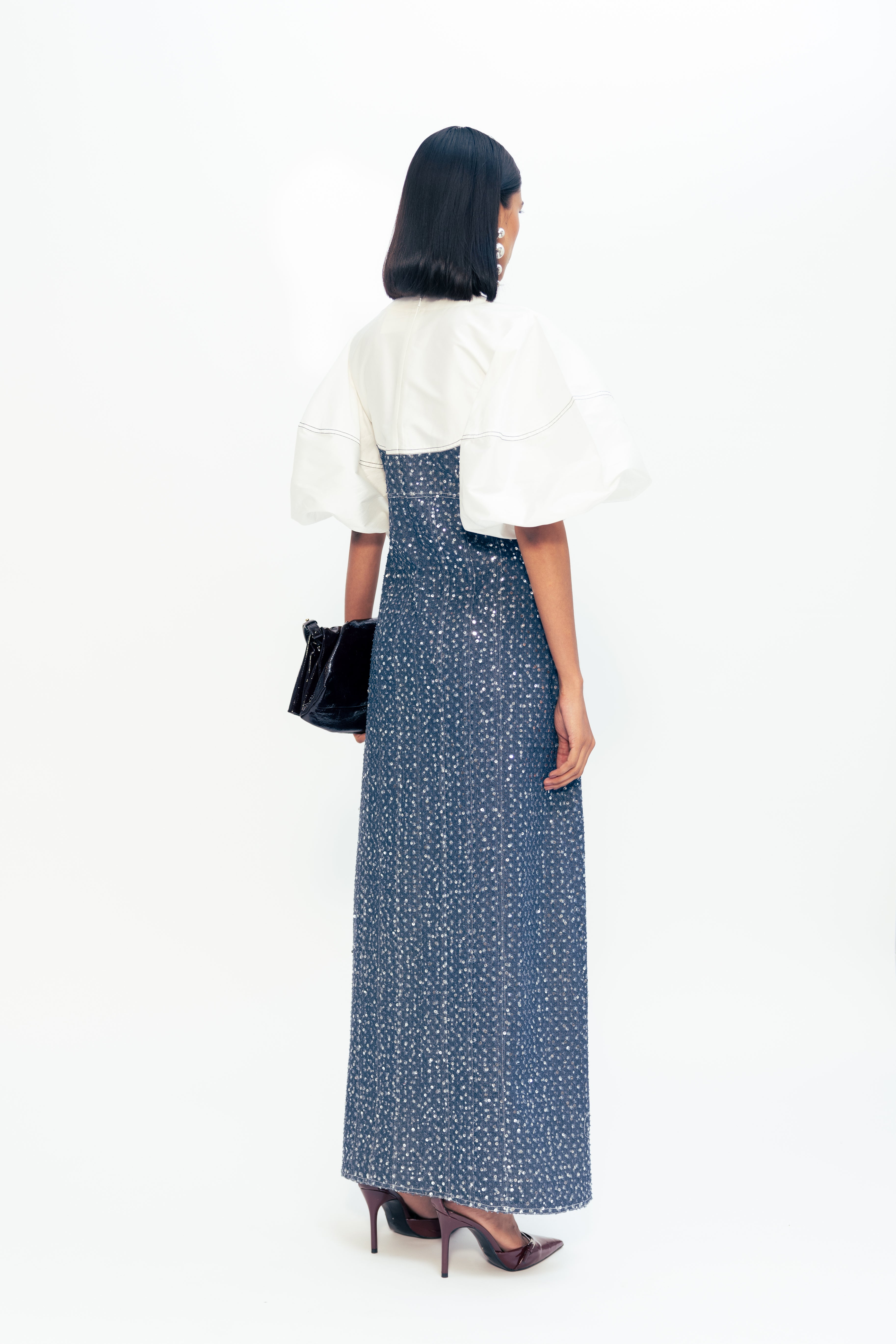 A mid-length dress with big puff sleeves and sequined denim offers a blend of vintage-inspired charm and contemporary flair. The big puff sleeves add drama and volume to the silhouette, creating a bold statement. The sequined denim adds a modern and stylish detail, highlighting the dress's structure and design. This combination creates a unique and eye-catching ensemble suitable for a variety of occasions, from casual gatherings to more formal events, while ensuring a fashionable and chic look.