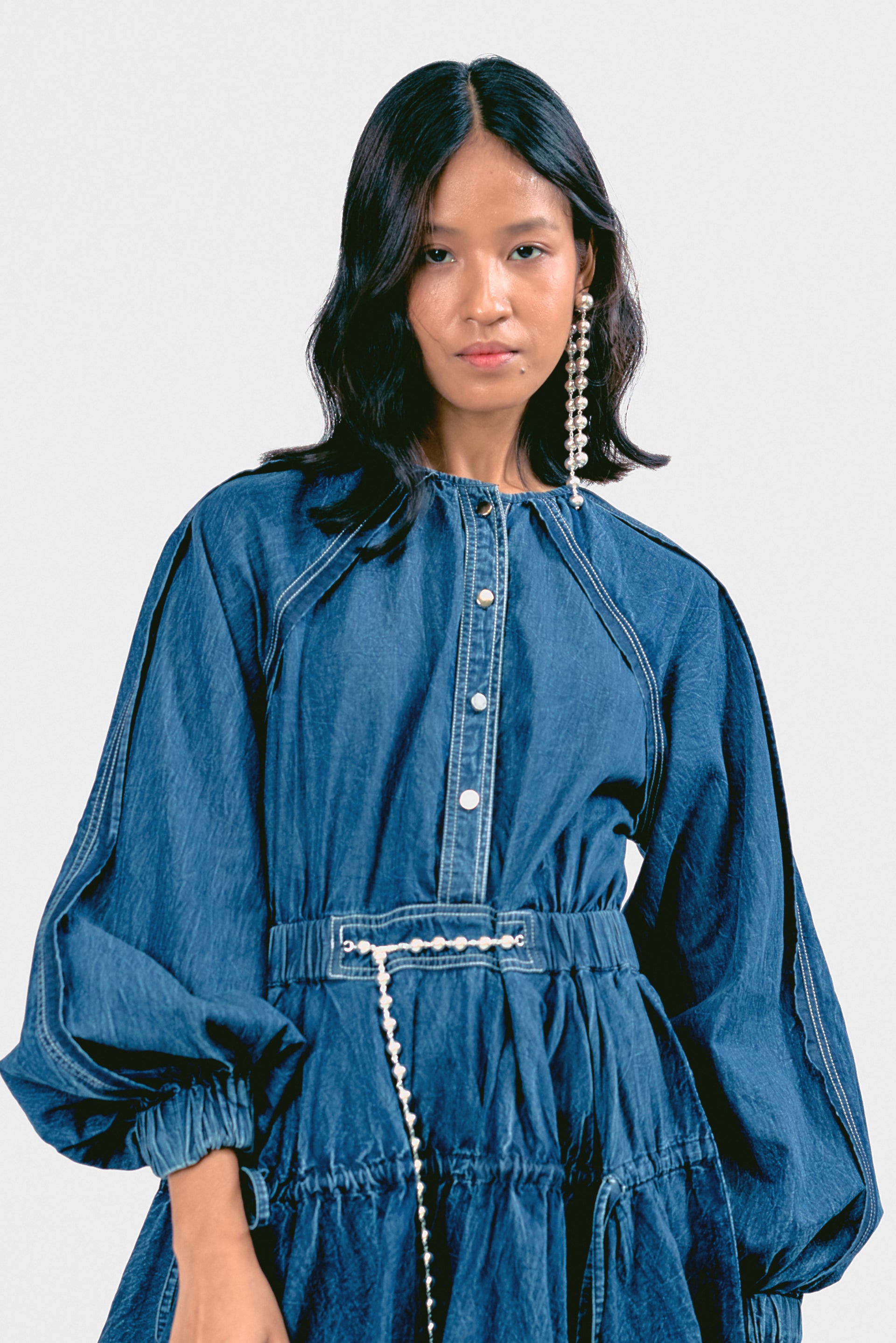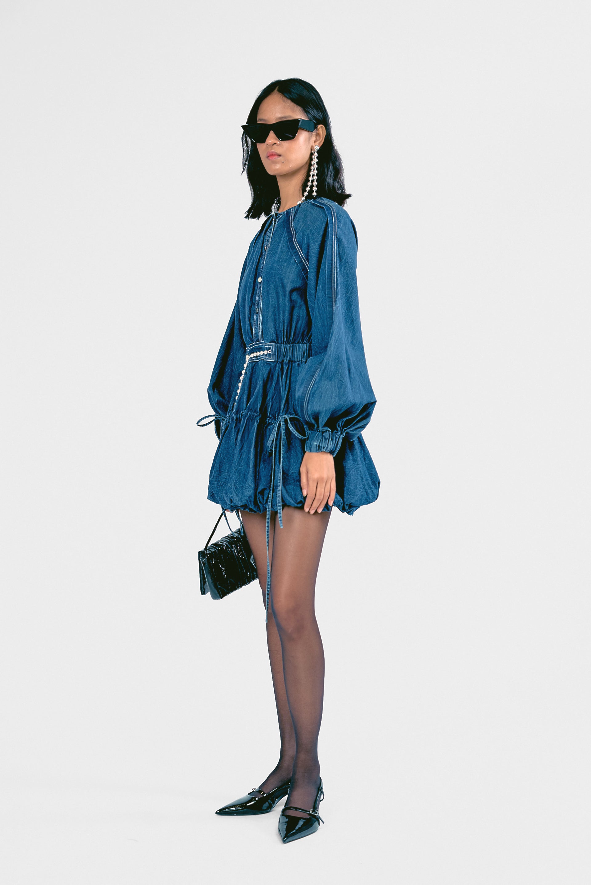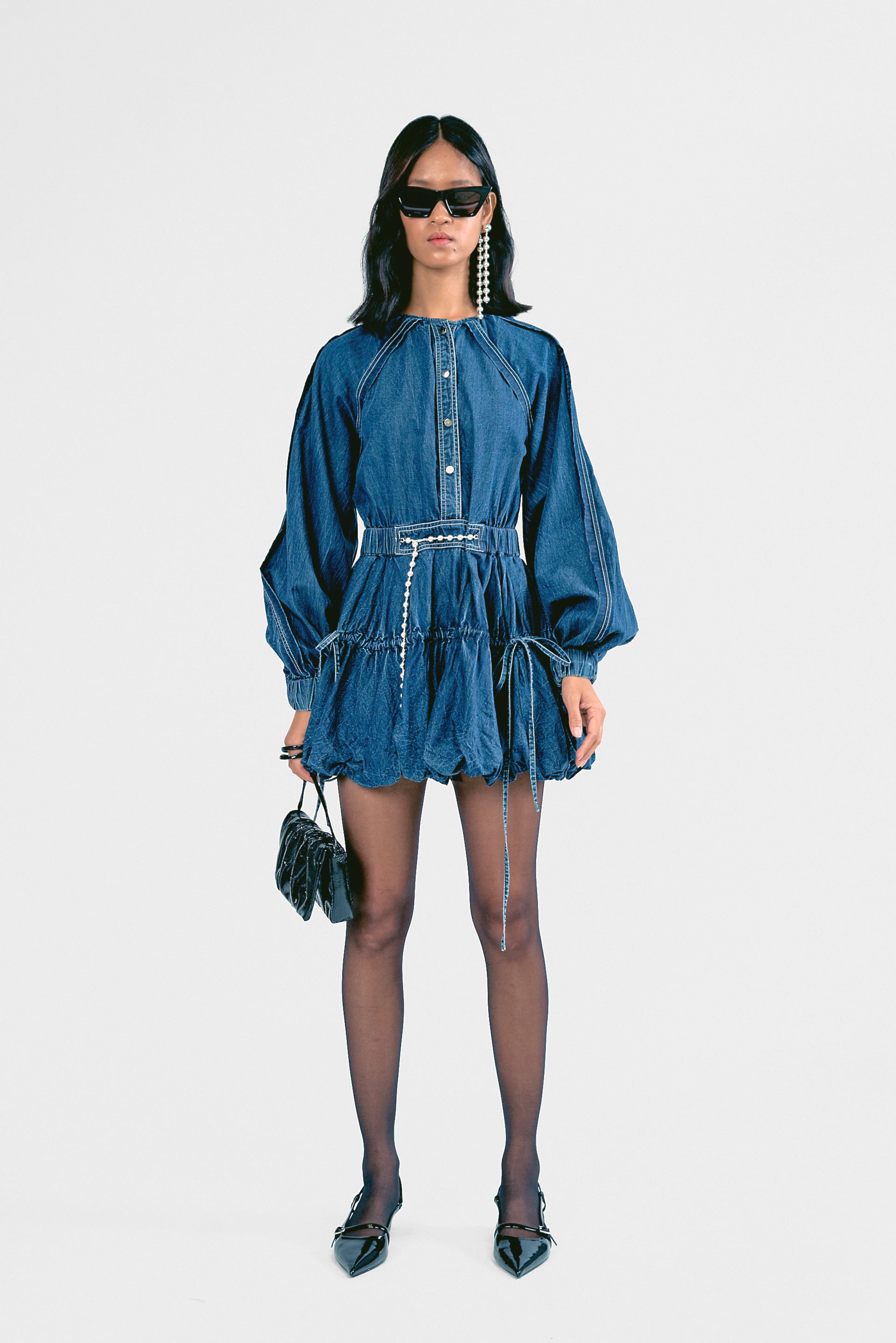 Step out in style with this Mini Denim Bounce Dress, designed for a playful yet structured look. Featuring a string belt for a cinched waist and a voluminous silhouette, it offers effortless movement and charm. Perfect for casual outings or dressed-up moments.