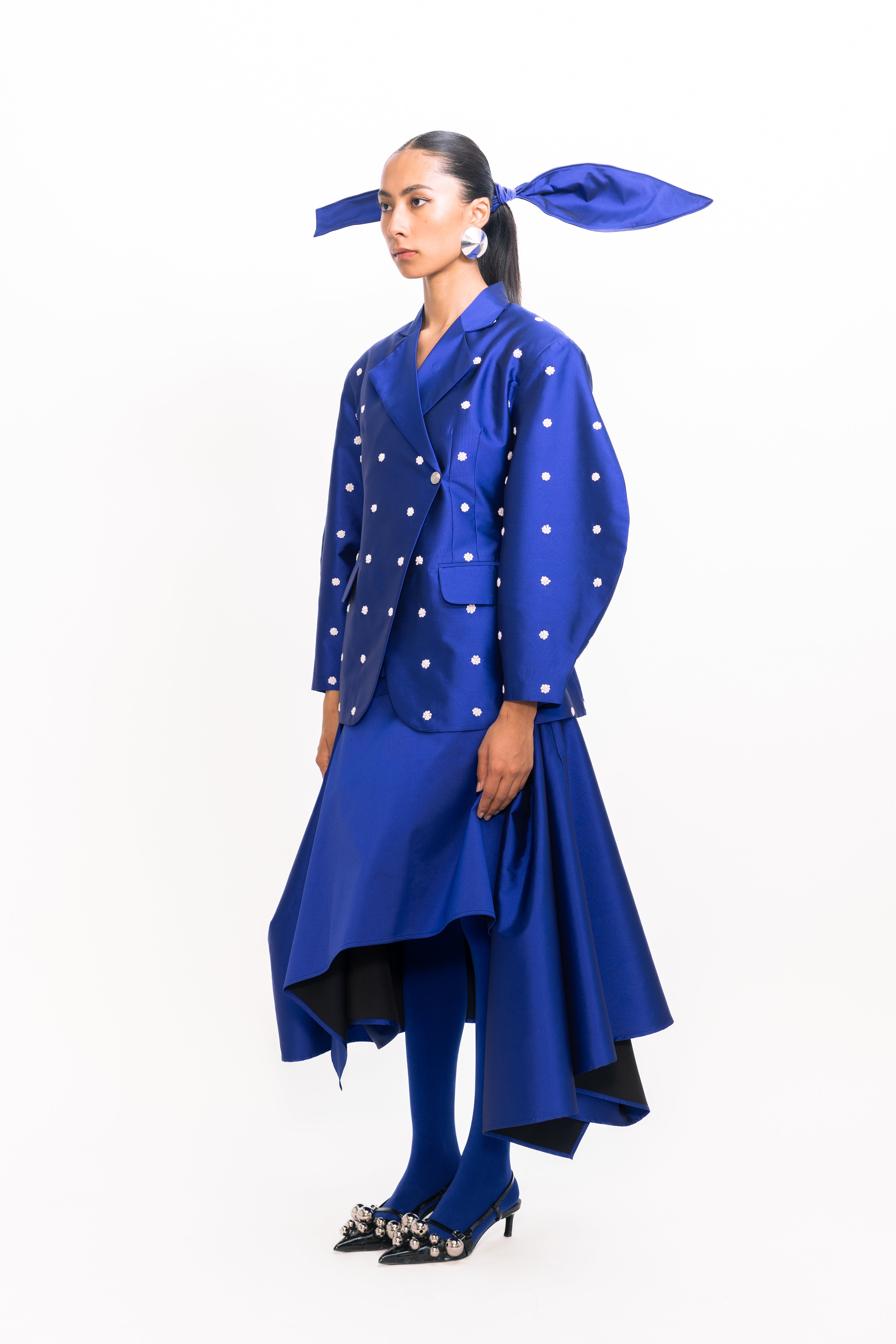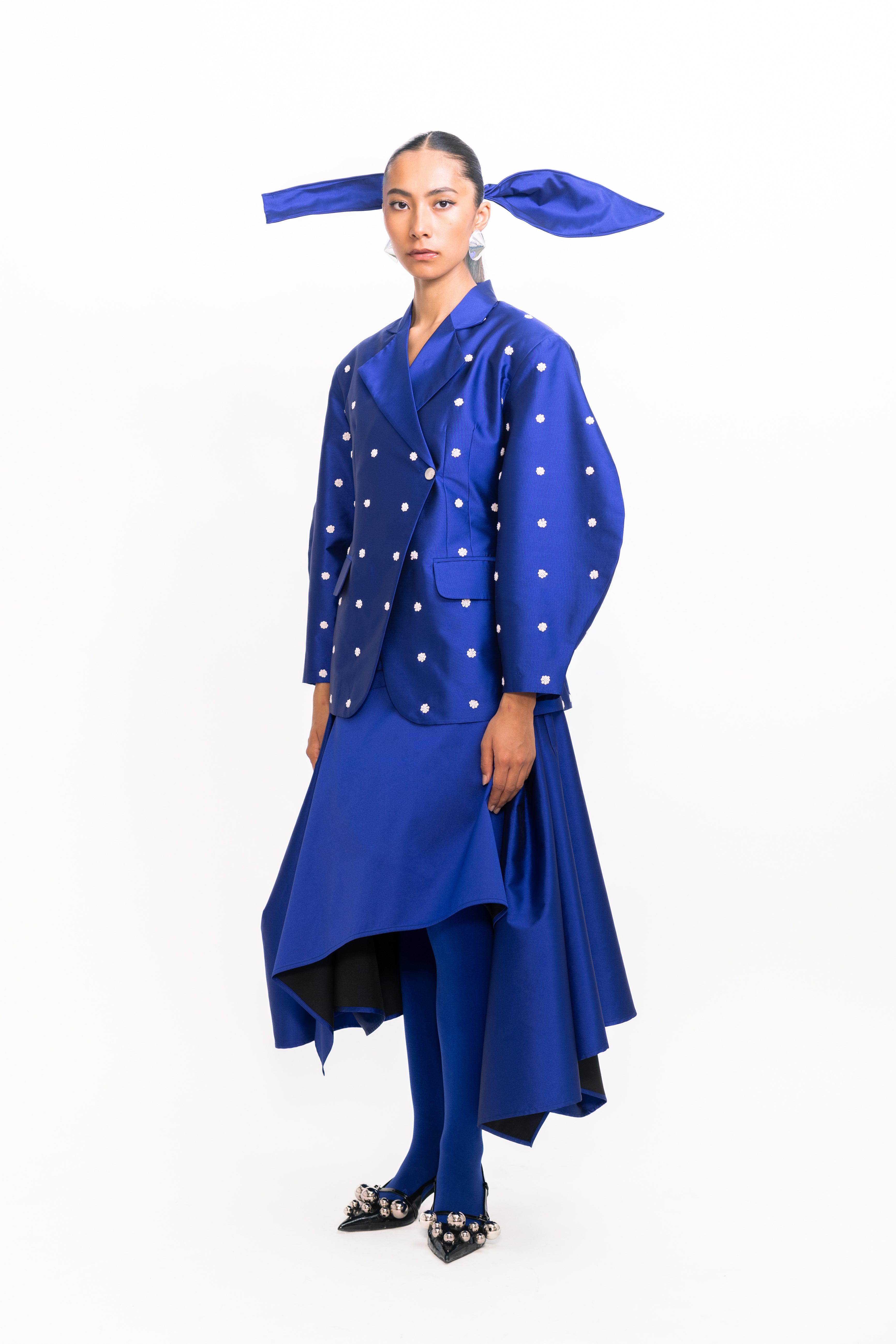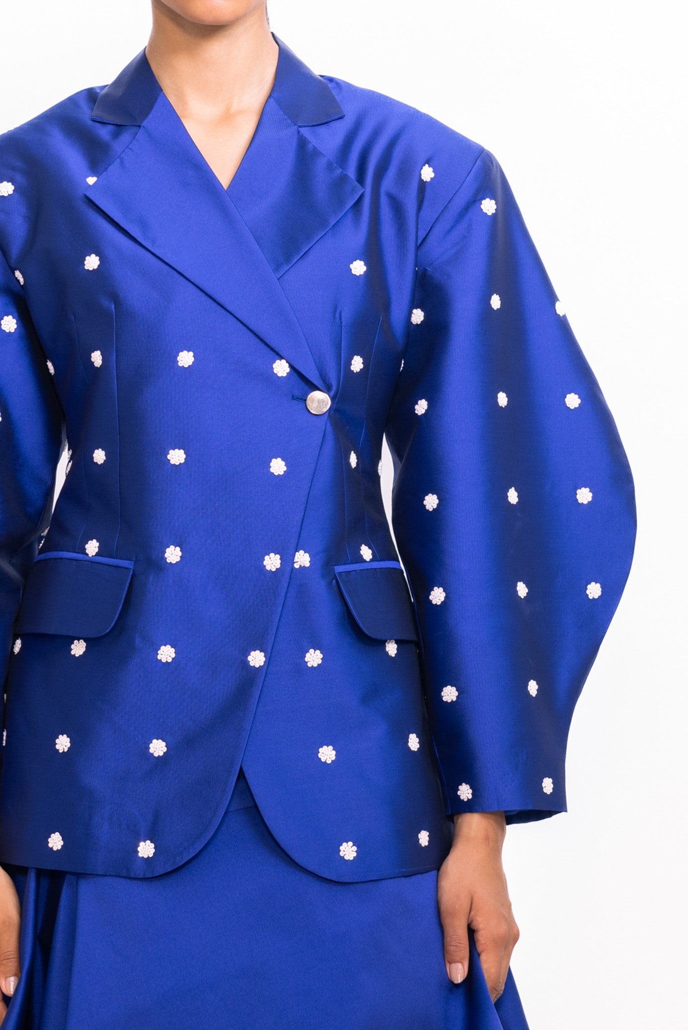 This blazer features an extended shoulder silhouette that adds a bold, architectural edge to a classic tailored form. With its crisp structure and clean lines, it offers a polished look with a modern twist. The subtly lustrous finish, adorned with ivory sequins, enhances its sharpness and adds a touch of understated glamour, making it a standout piece for both power dressing and elevated layering.