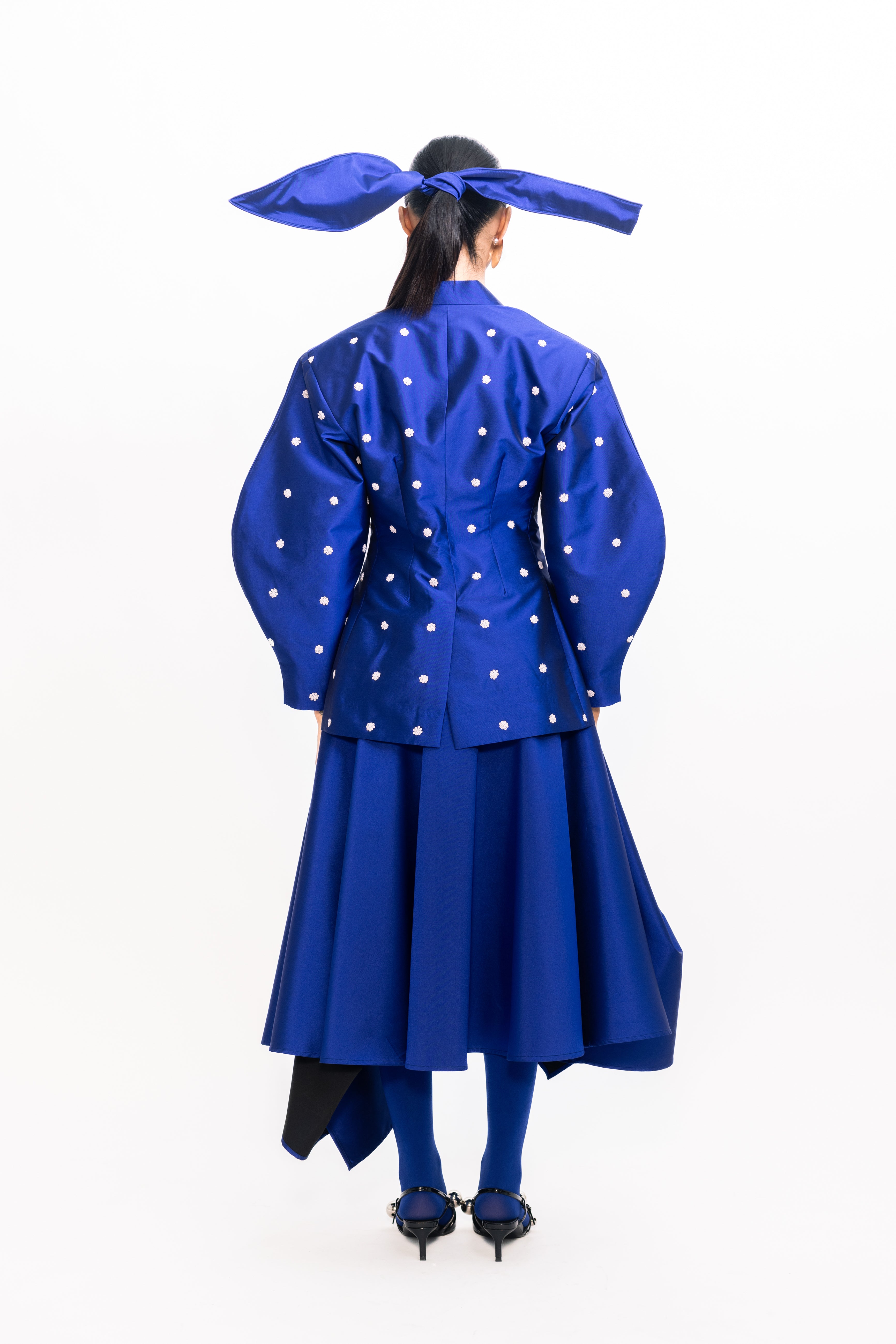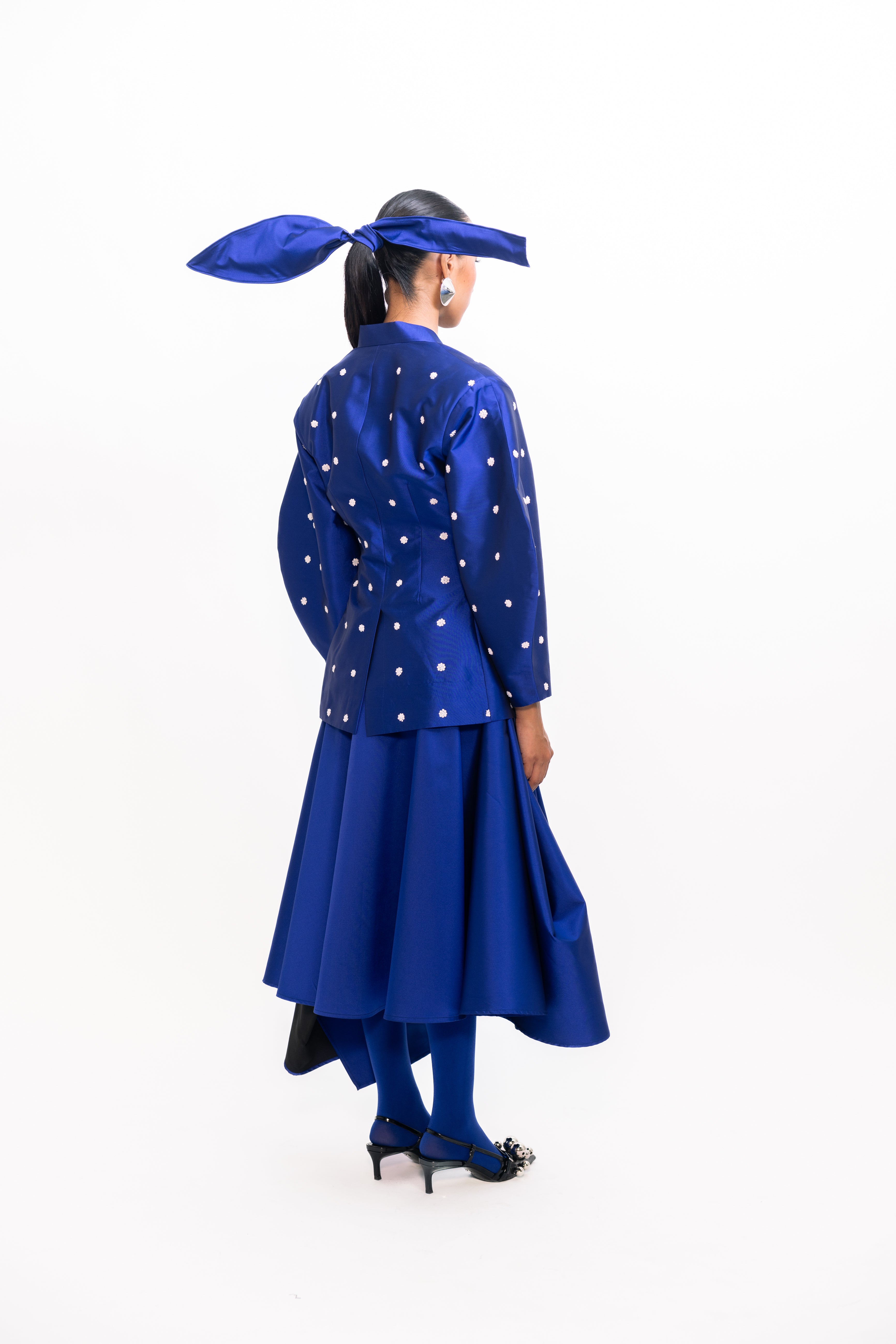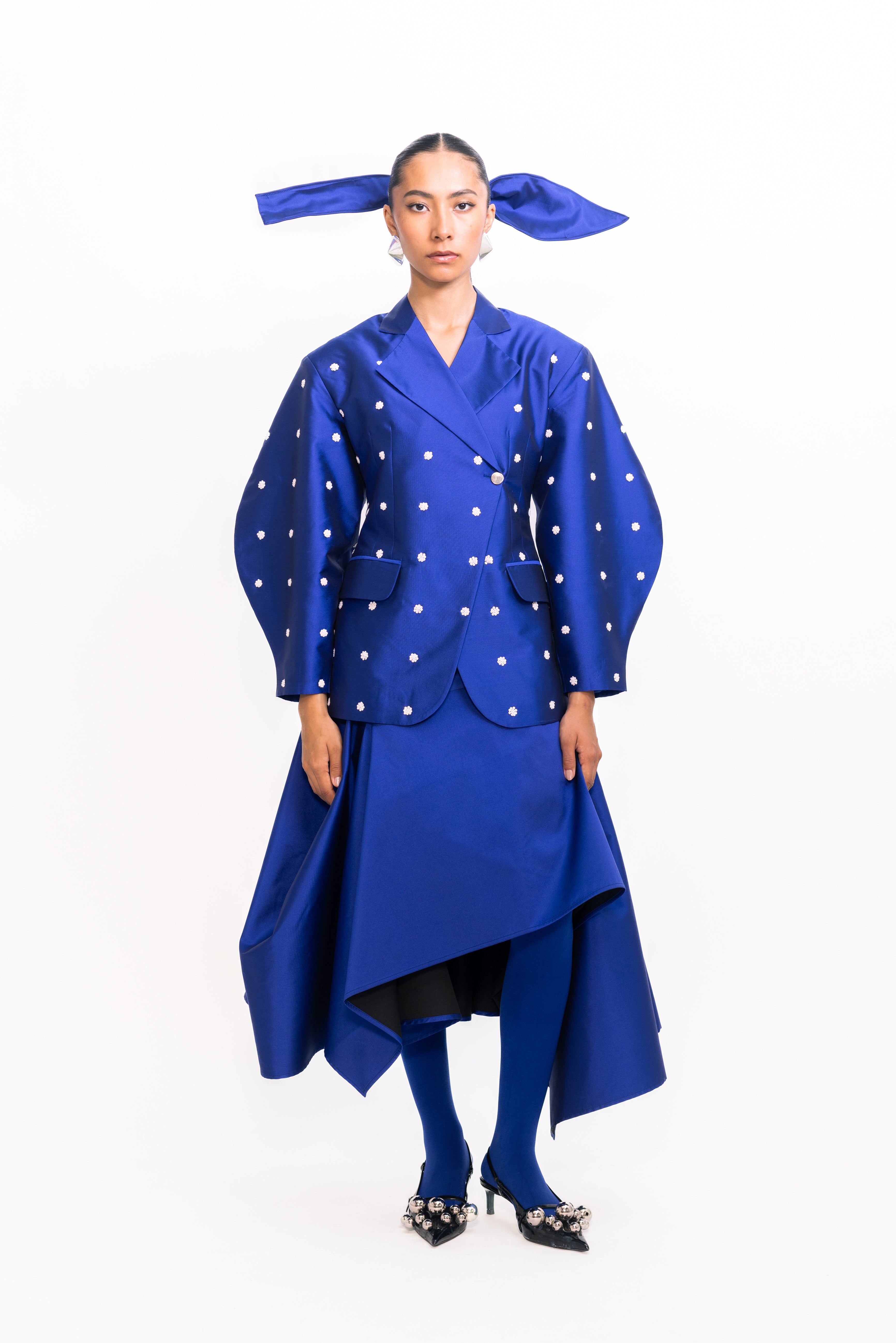 This blazer features an extended shoulder silhouette that adds a bold, architectural edge to a classic tailored form. With its crisp structure and clean lines, it offers a polished look with a modern twist. The subtly lustrous finish, adorned with ivory sequins, enhances its sharpness and adds a touch of understated glamour, making it a standout piece for both power dressing and elevated layering.
