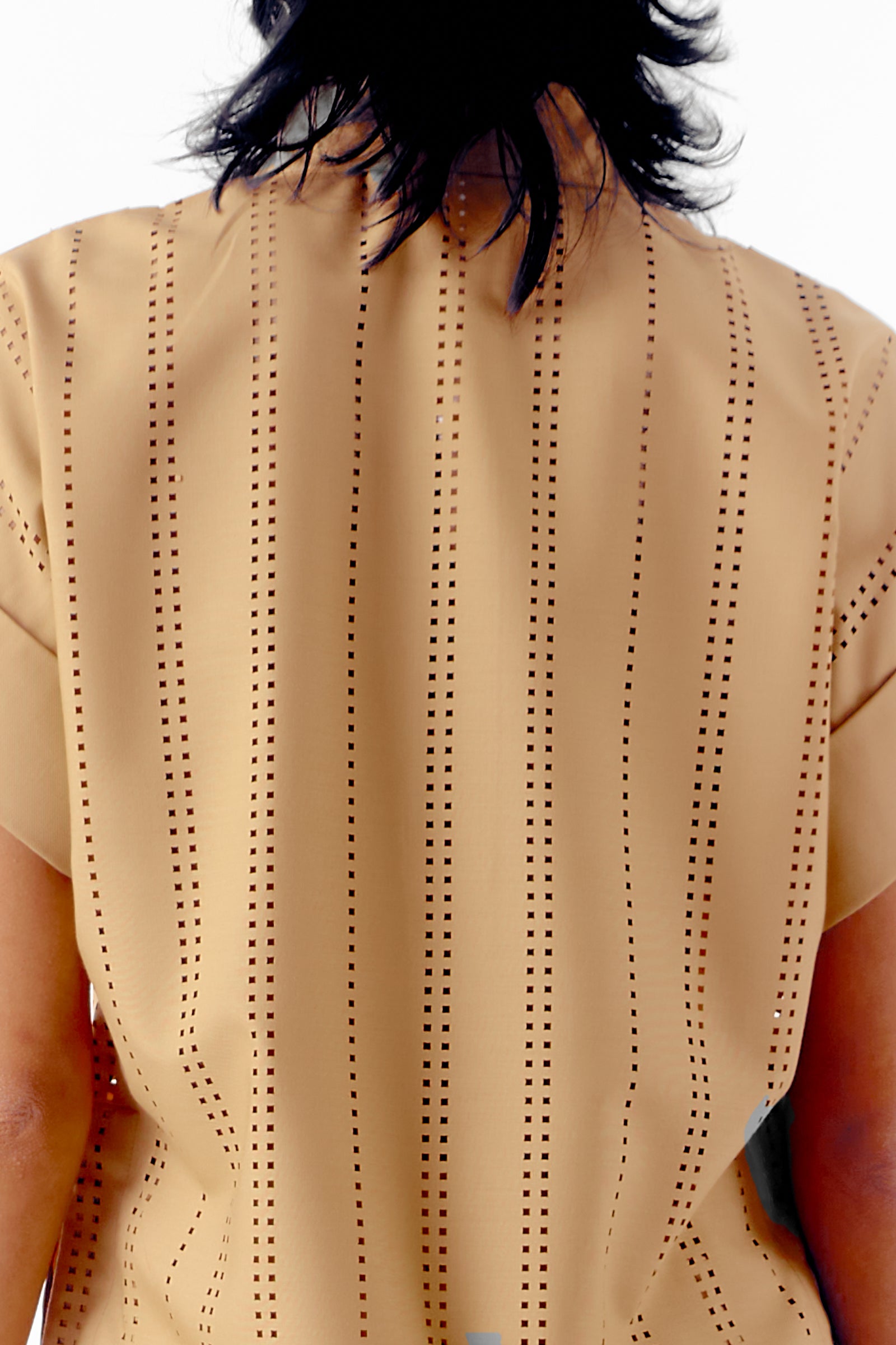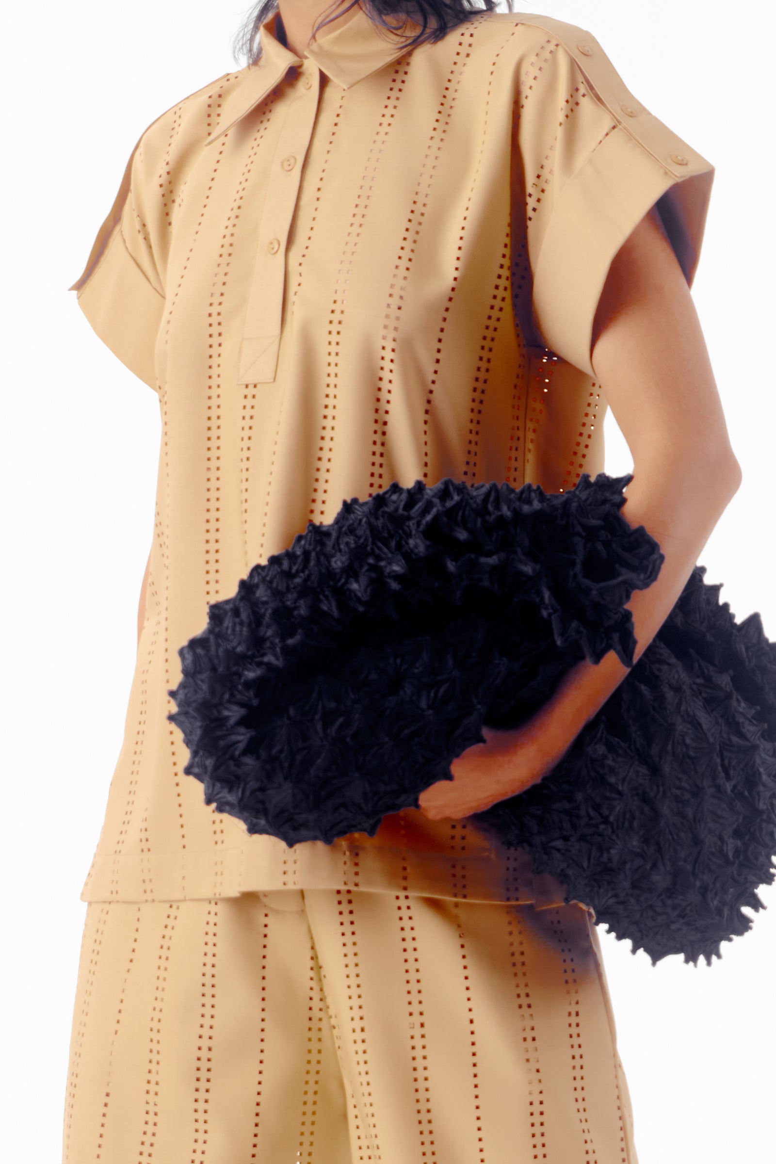 Intricate detailing takes center stage in this coordinated look, where precision meets polish. The structured collar and placket offer a refined counterpoint to the delicate laser-cut patterns above. Paired with flared bottoms that mirror the same intricate technique, the fitted waist anchors the silhouette. The result is a bold yet balanced ensemble that fuses technical craft with contemporary flair.