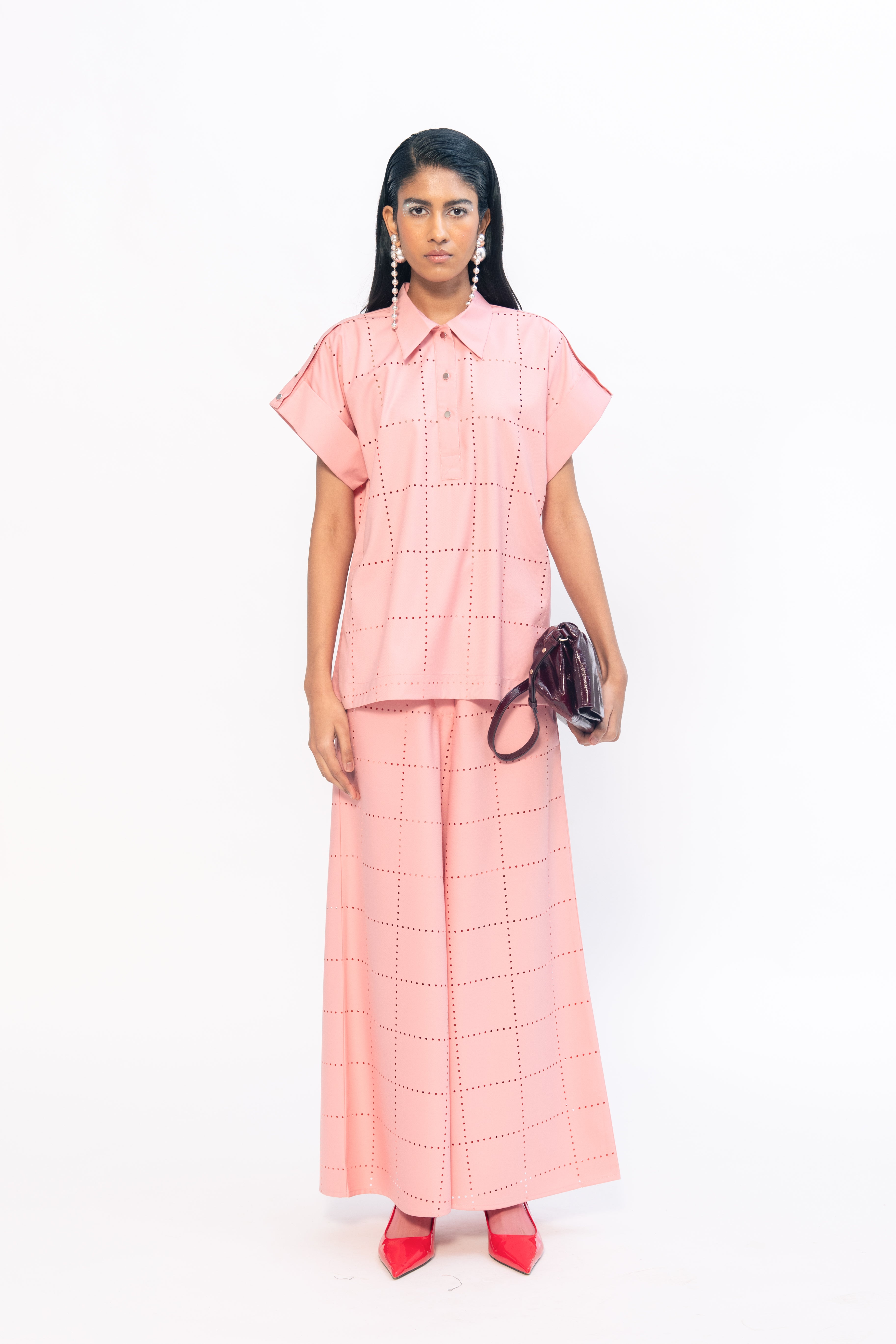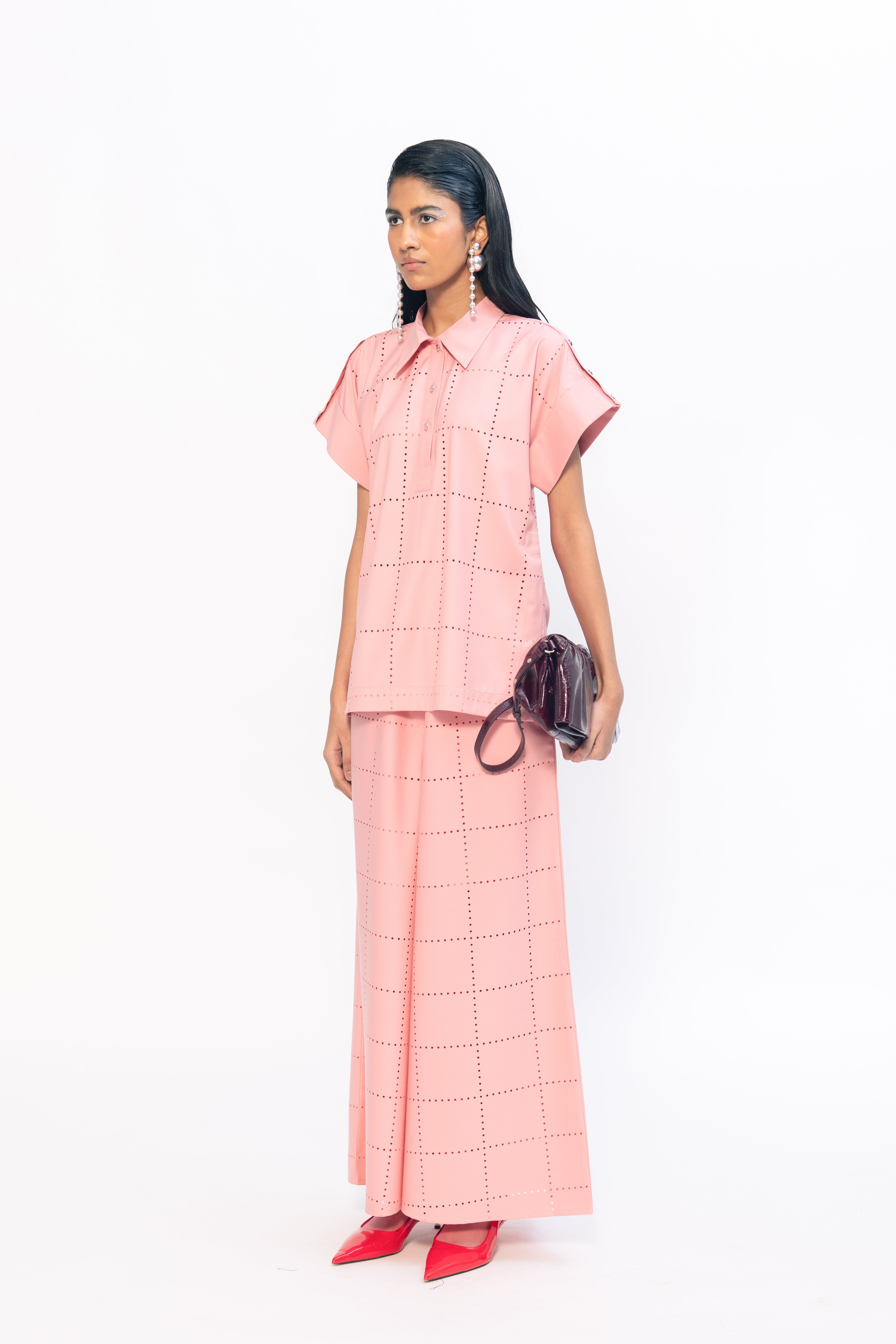Intricate precision meets modern tailoring in this sharply detailed pairing. Up top, structured elements like the collar and placket ground the delicacy of laser-cut patterns, offering contrast and control. Below, the fluid flare introduces movement, while the fitted waist keeps the look streamlined. Together, they form a cohesive statement—technical, refined, and effortlessly forward.