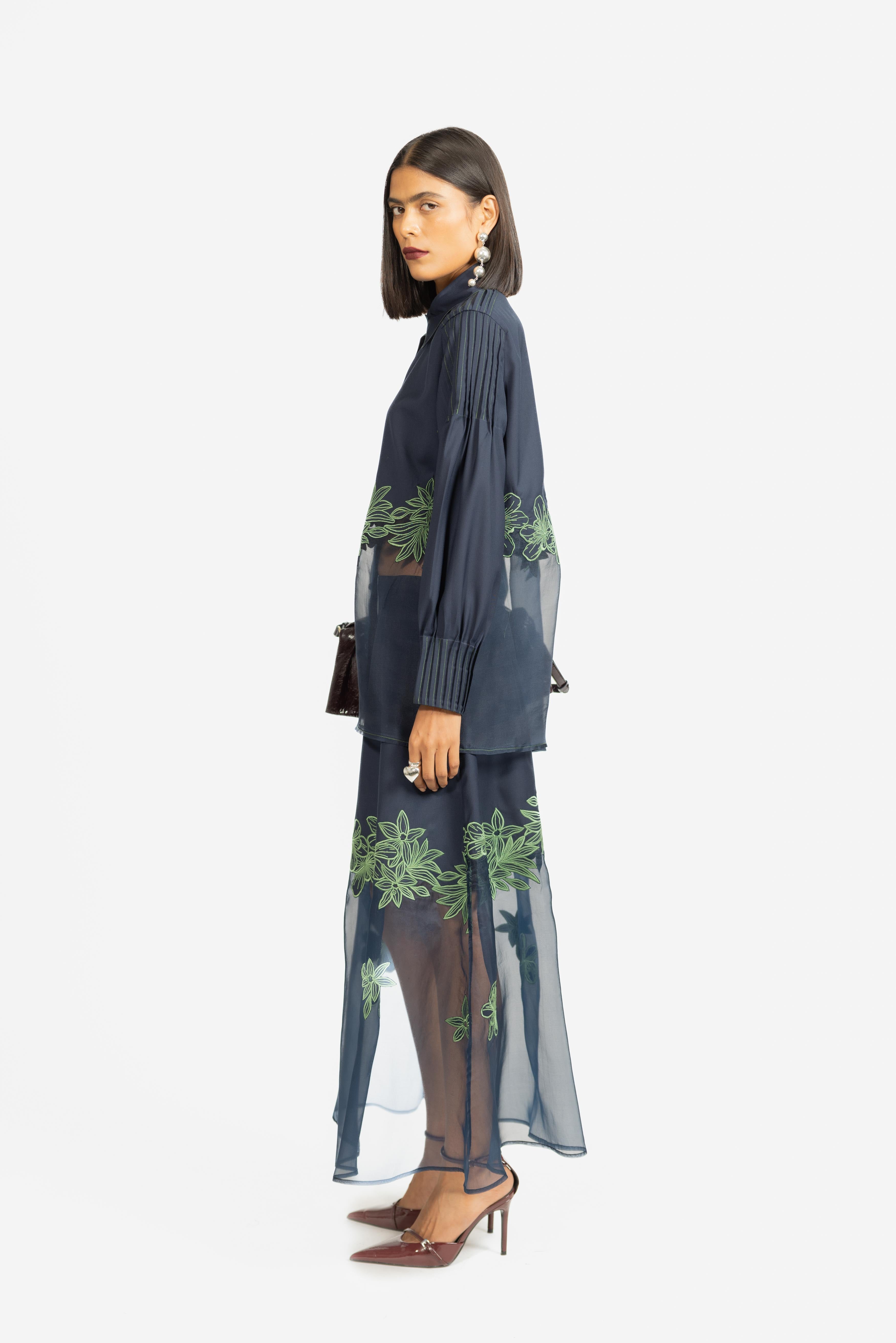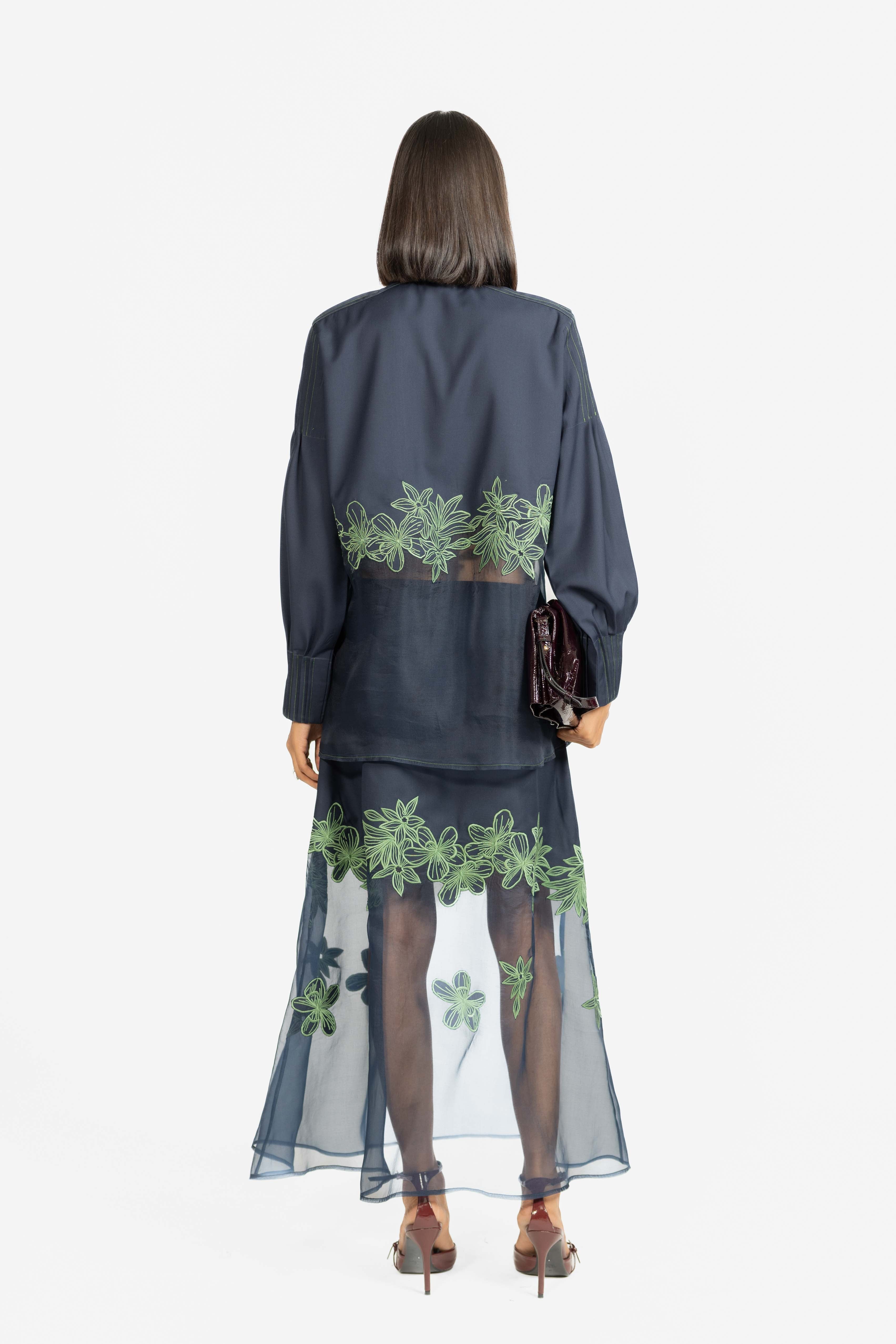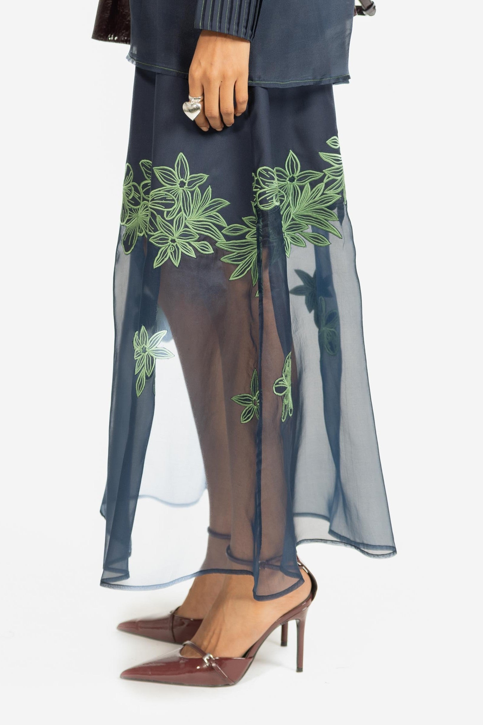 A graceful skirt featuring delicate embroidery set against sheer panel detailing.