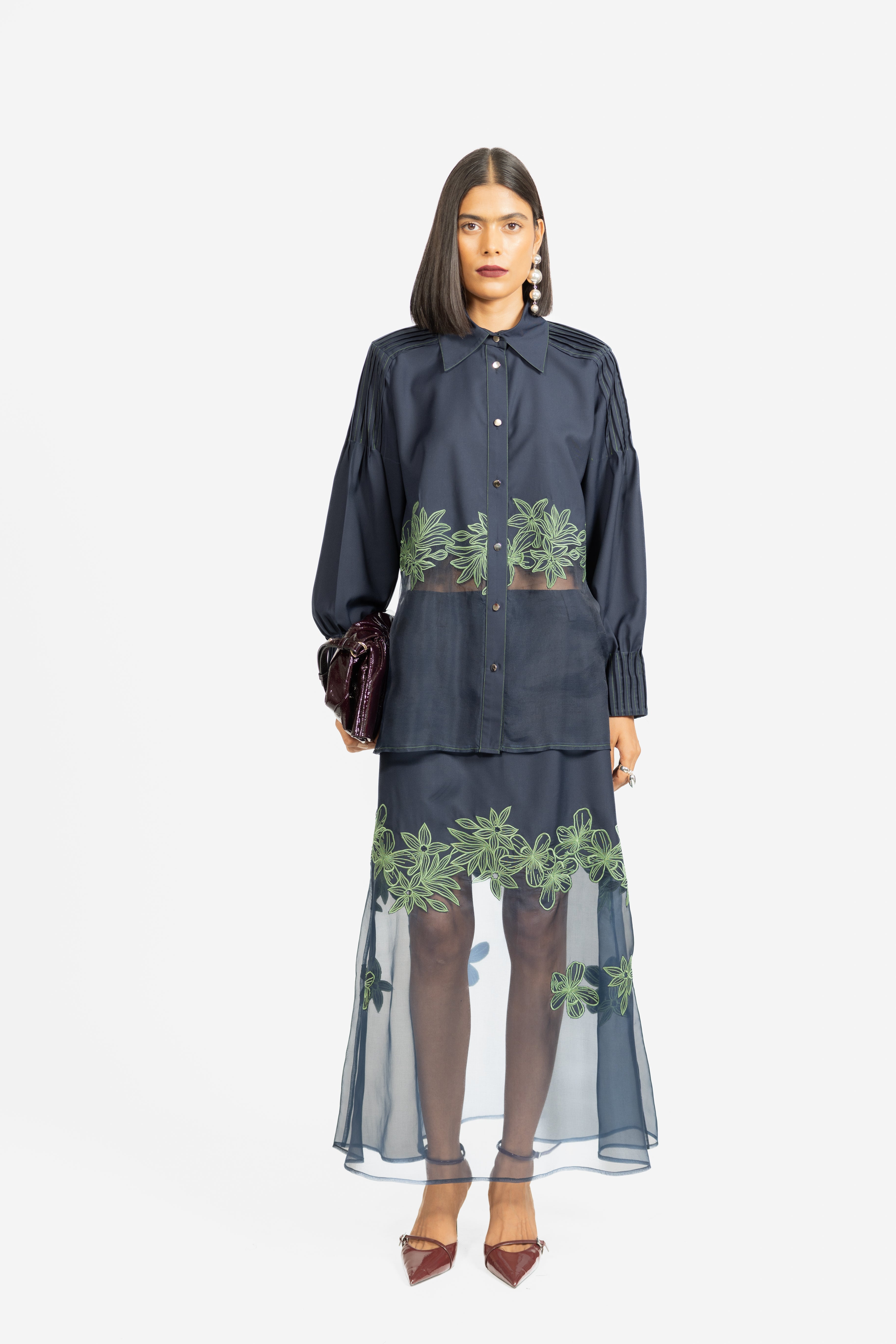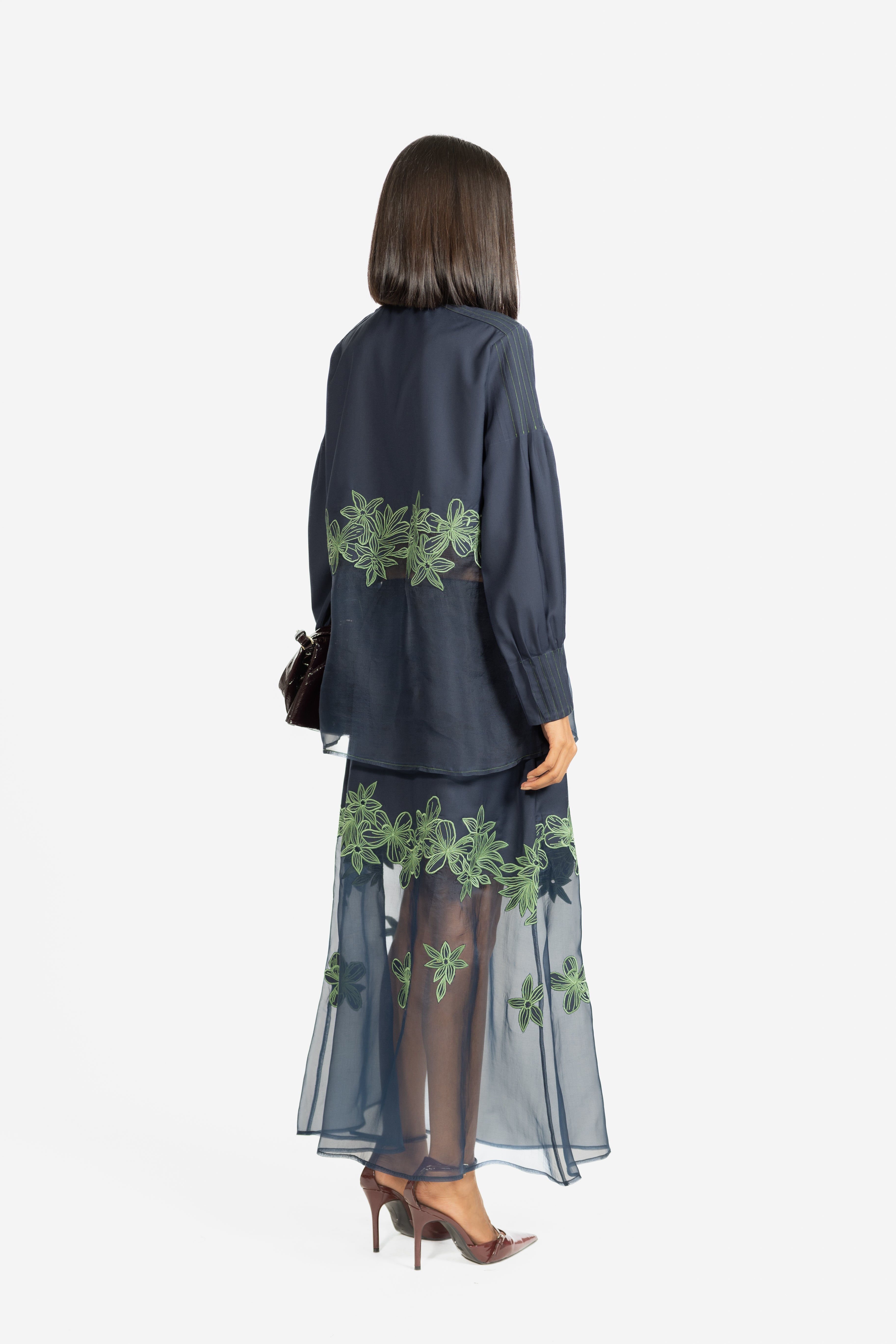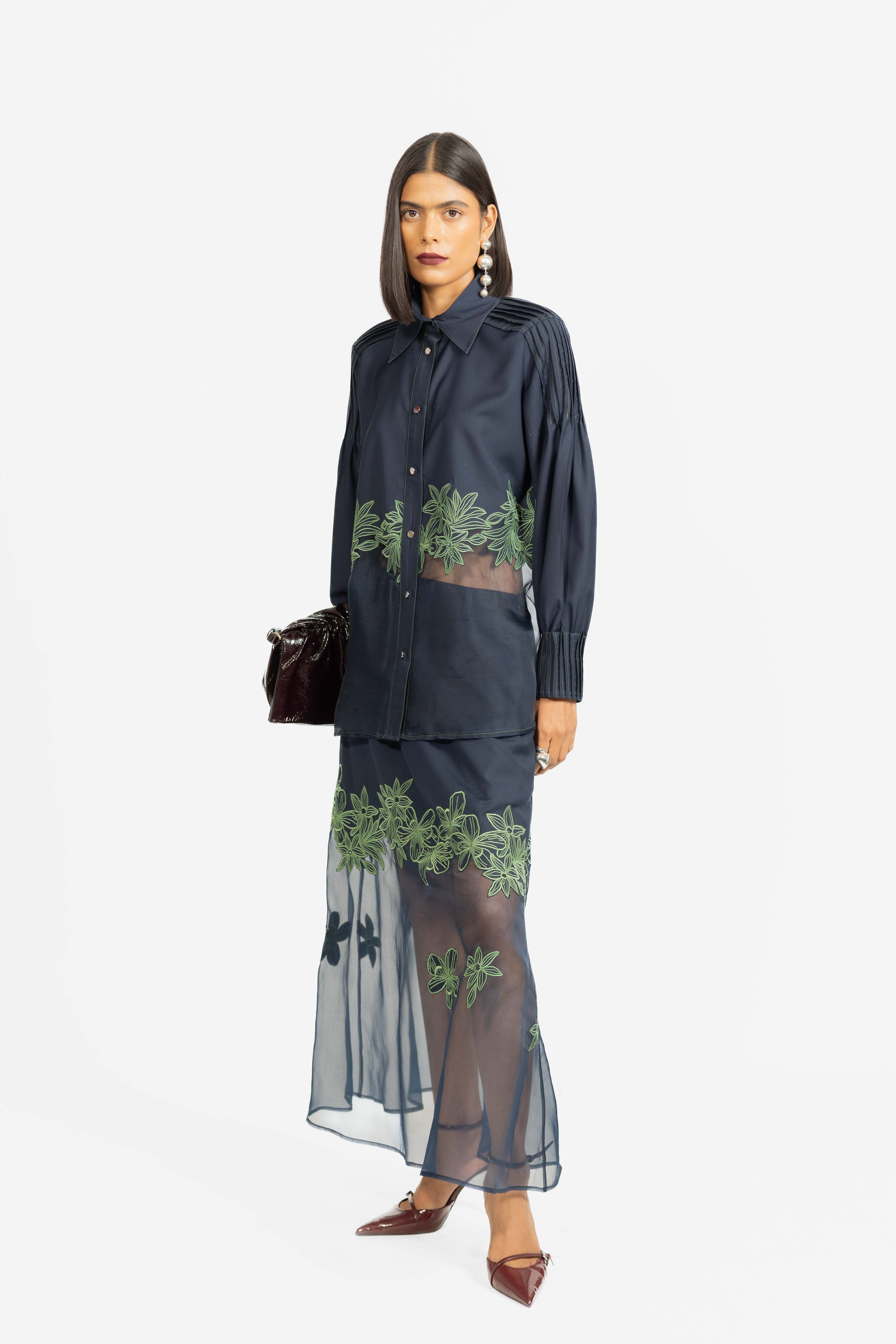 A graceful skirt featuring delicate embroidery set against sheer panel detailing.