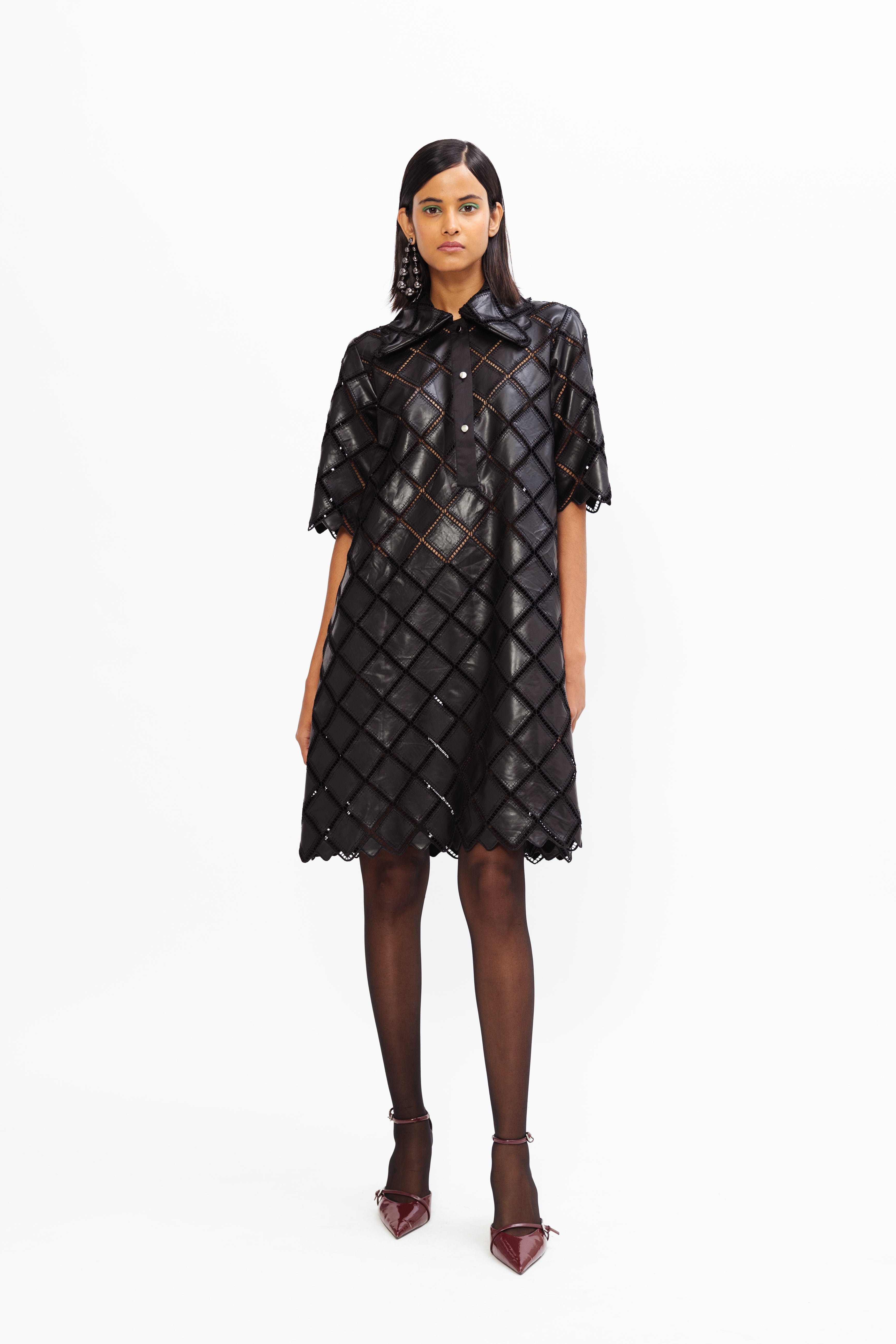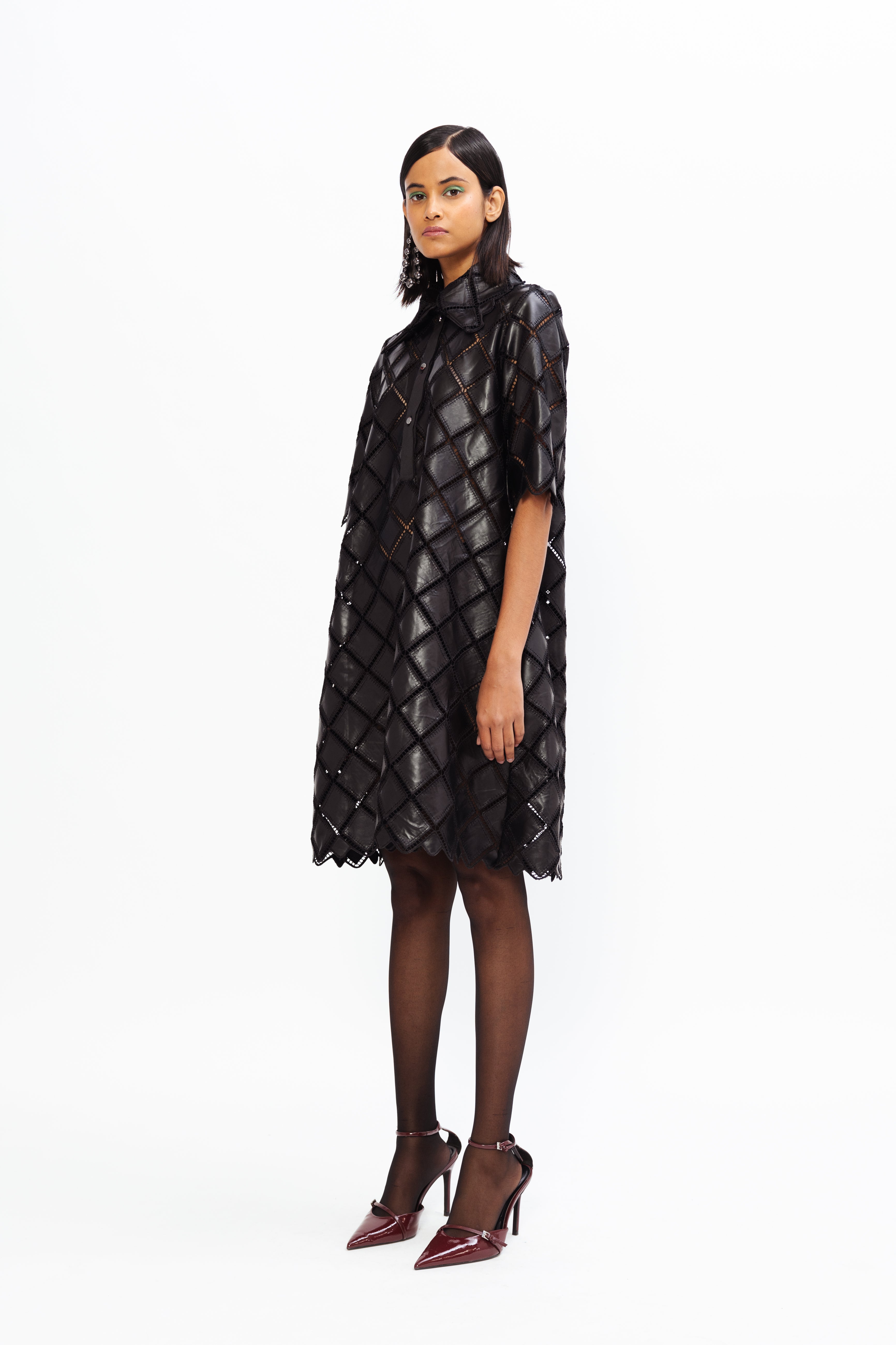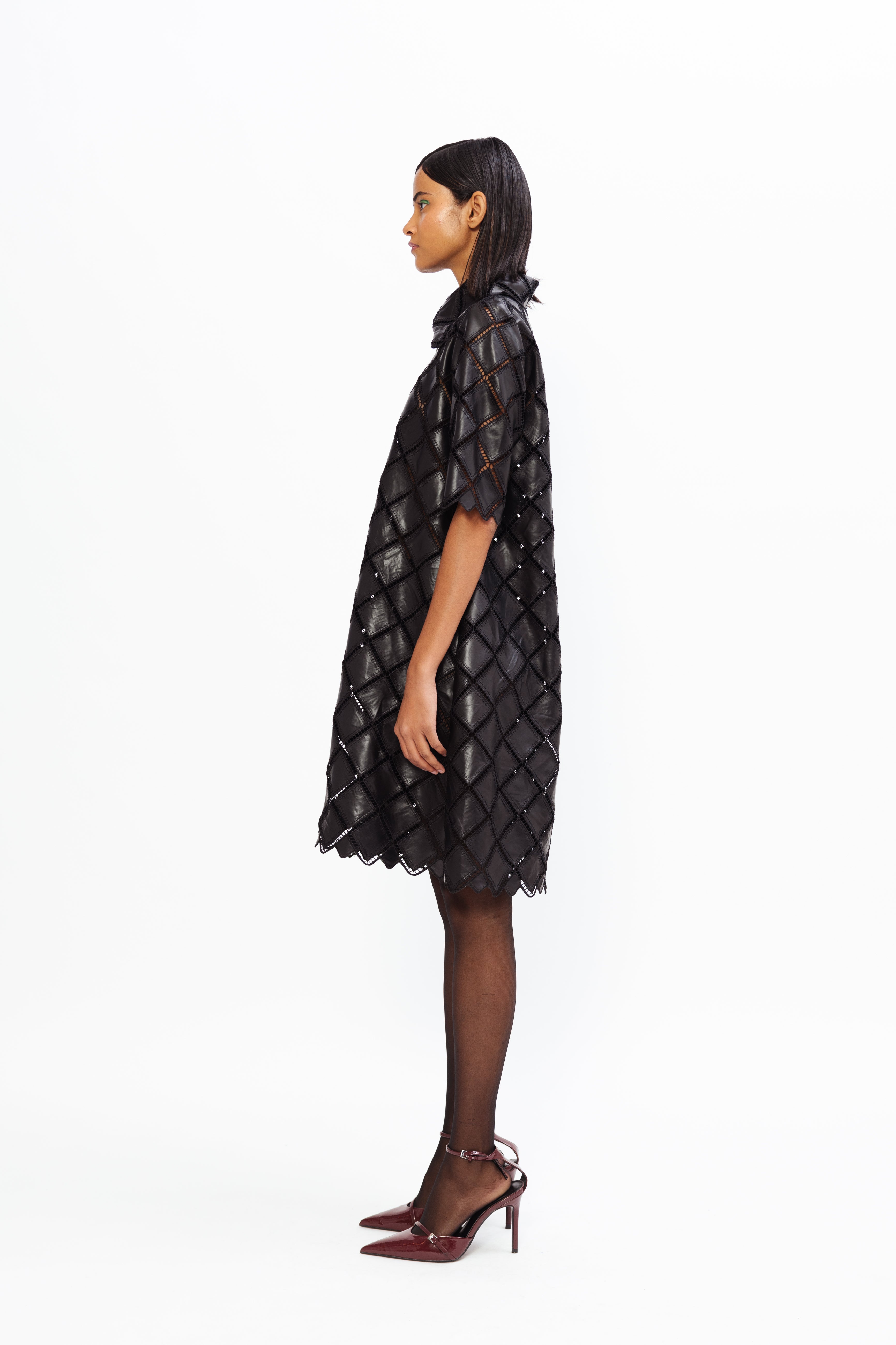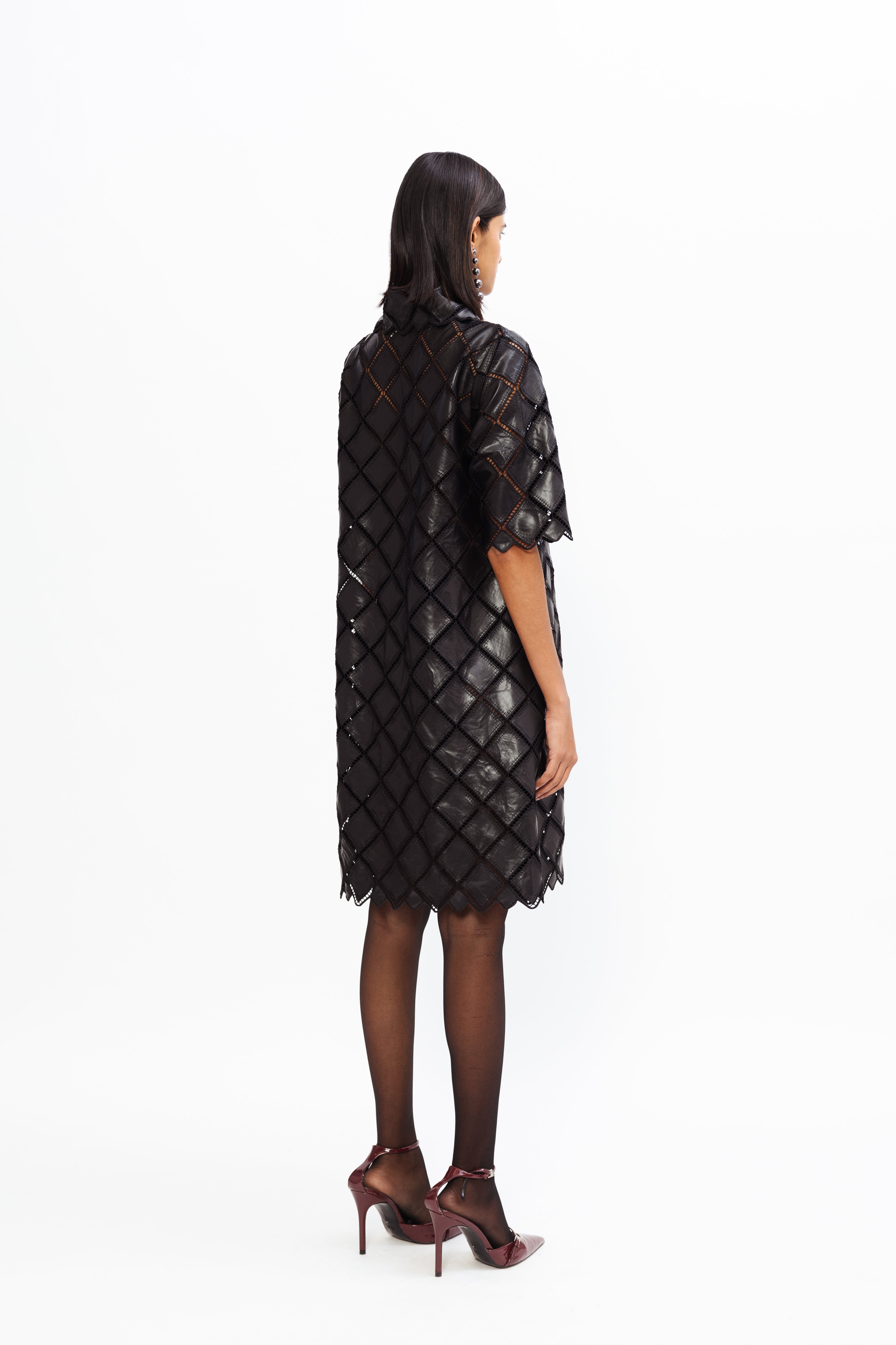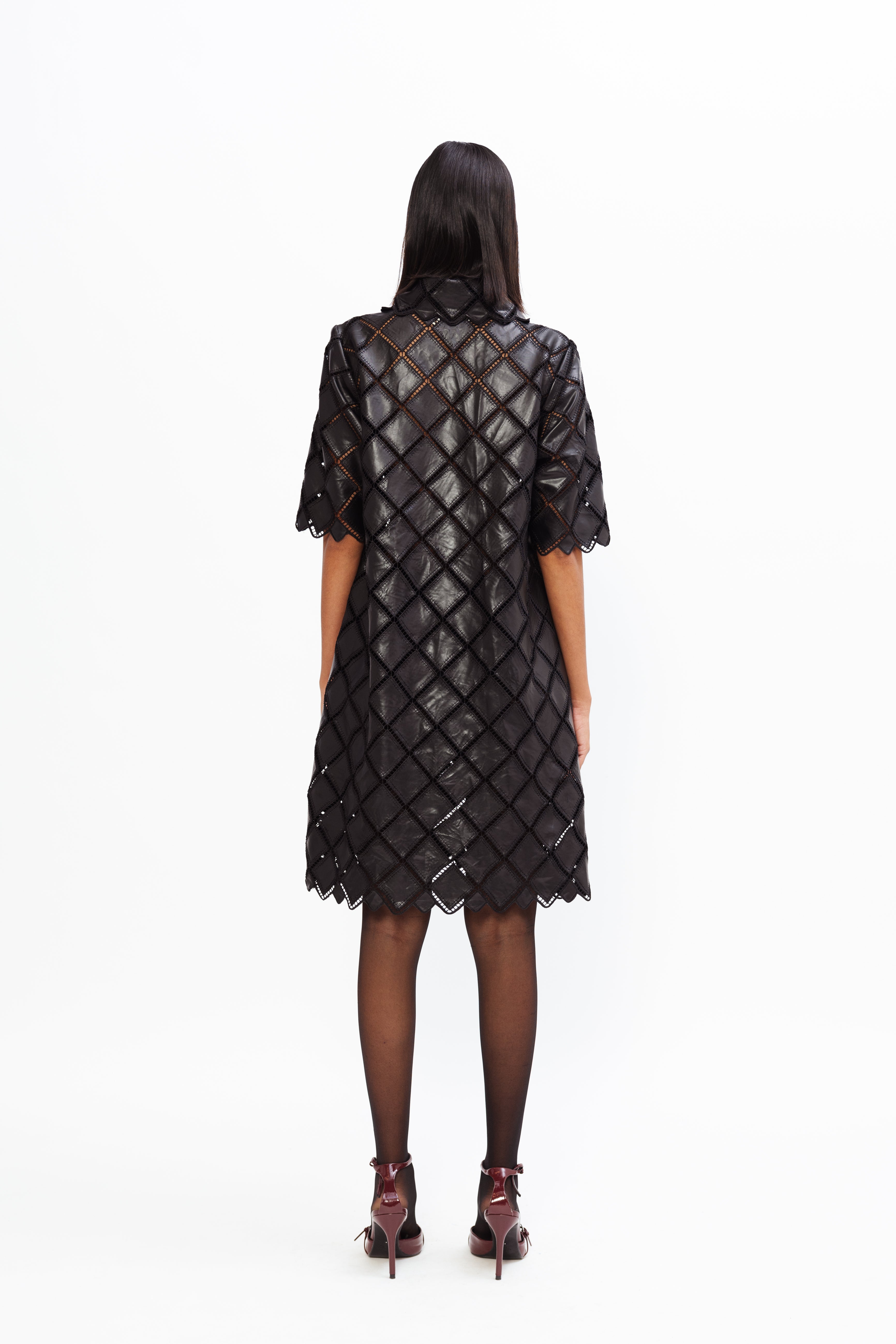 A midi dress crafted in luxurious lozenge leather mesh, rendered in a deep onyx hue. The fitted silhouette and intricate texture create a striking balance of elegance and modern allure, making it a perfect choice for refined evenings and sophisticated occasions.