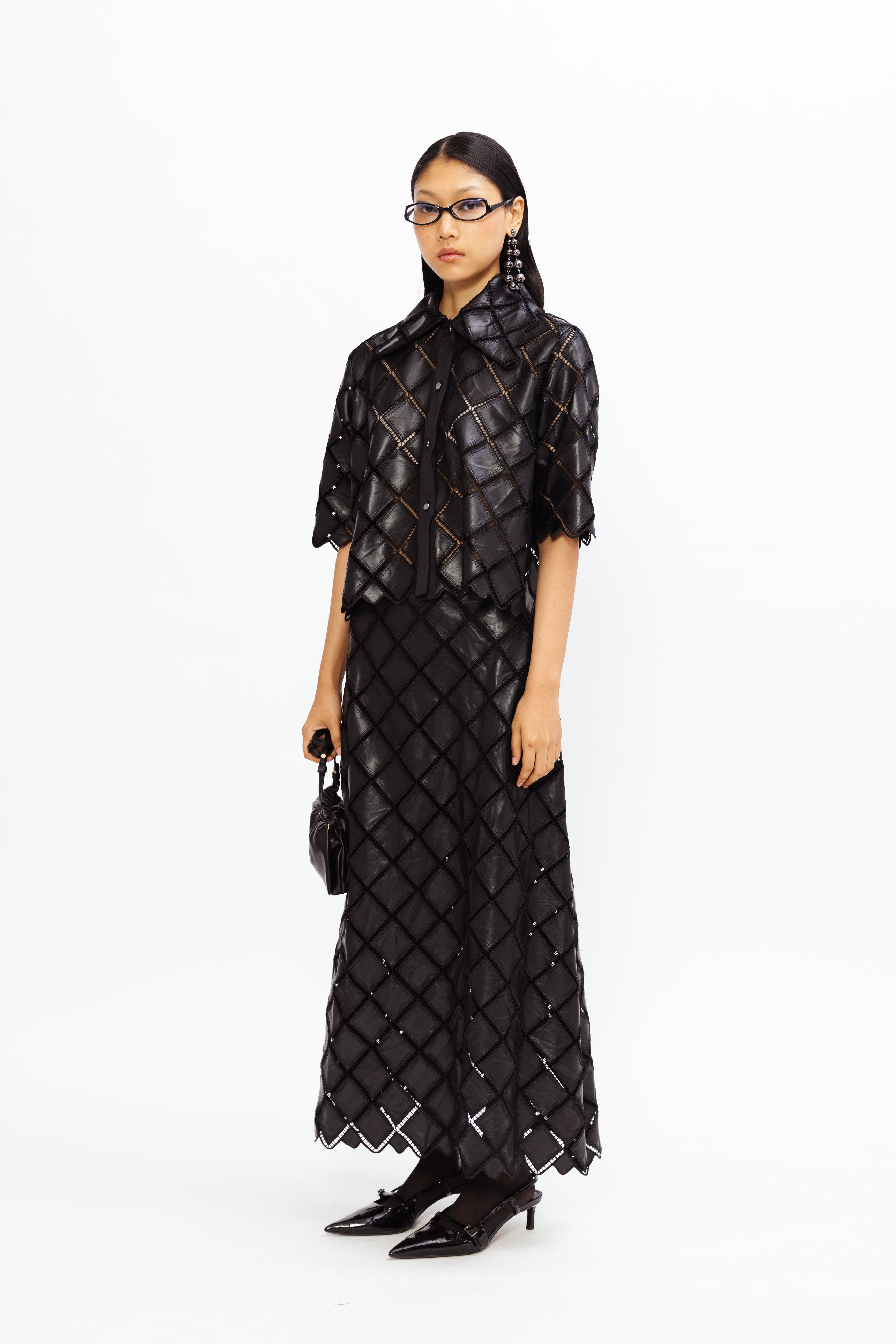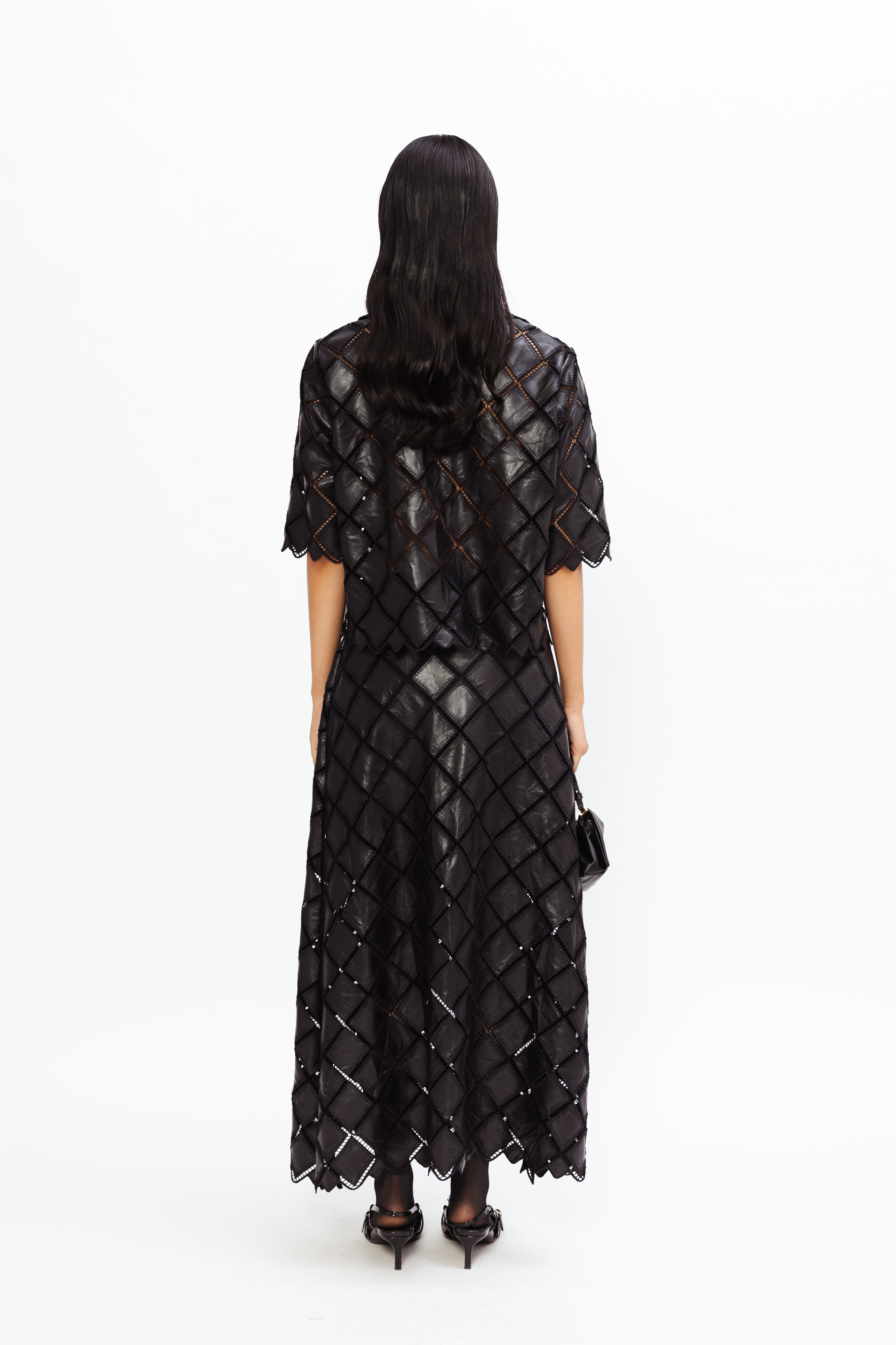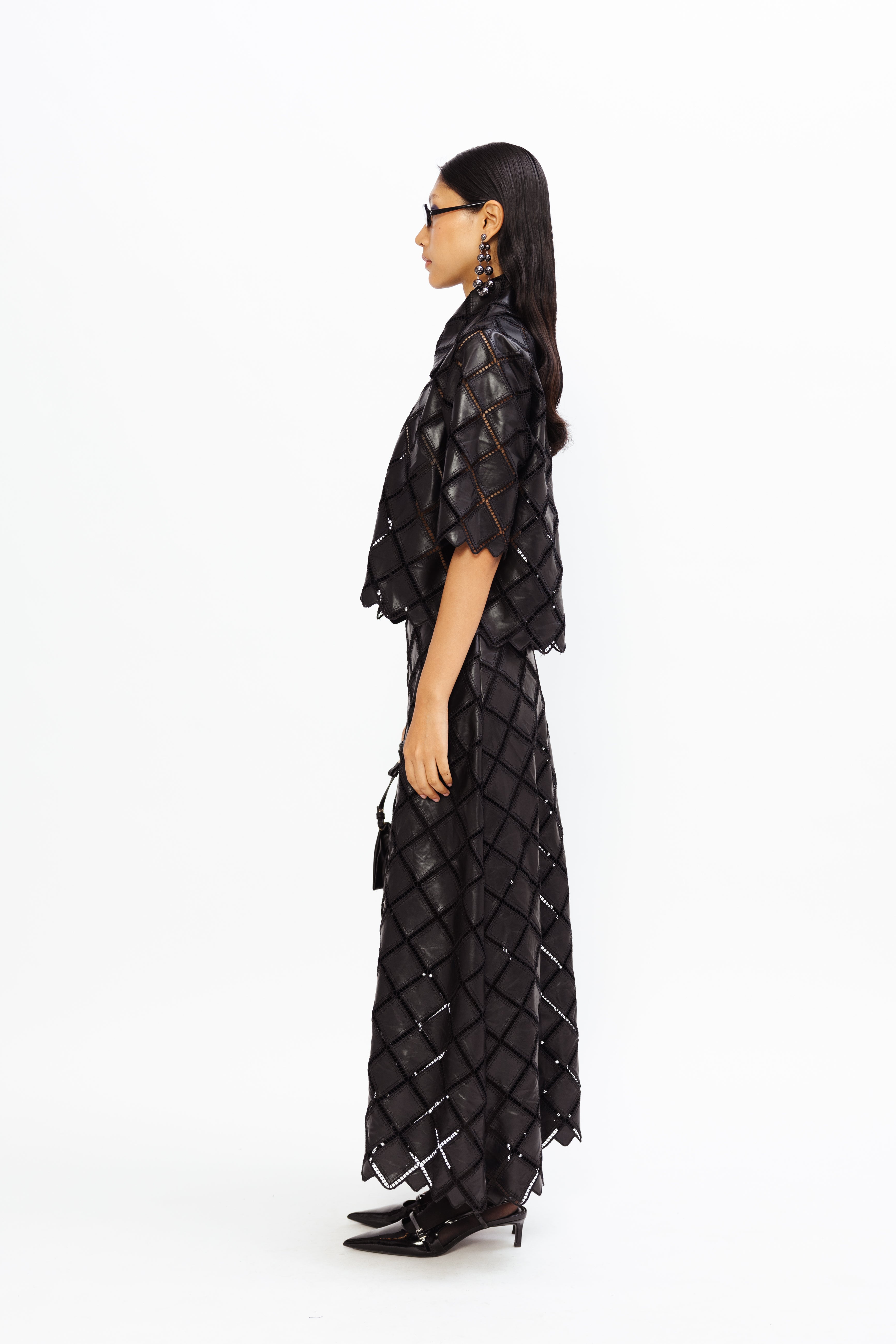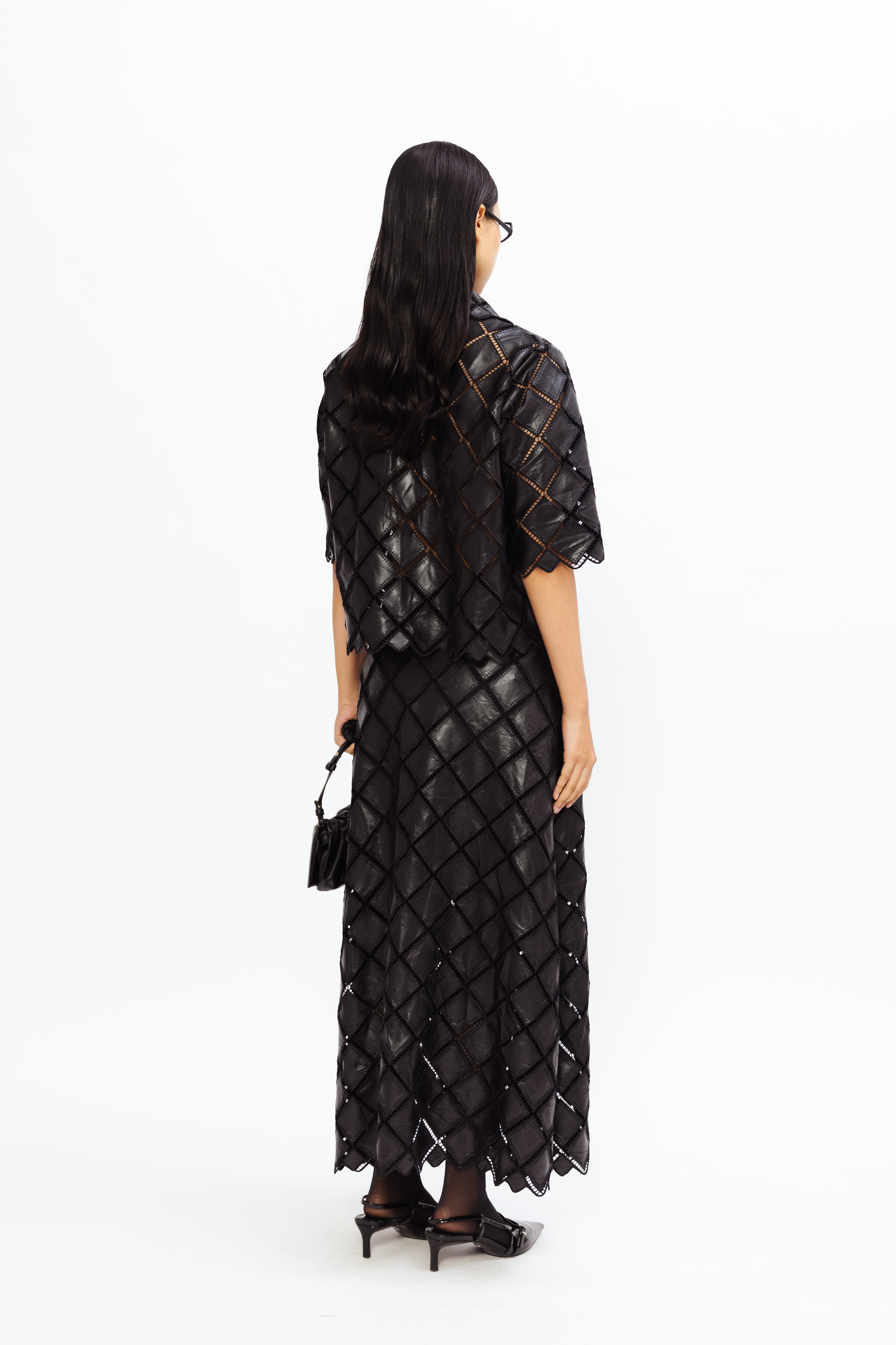 A shirt crafted in luxurious lozenge leather mesh styled with midi skirt, rendered in a deep onyx hue. Defined by its intricate texture and sleek structure, it exudes sophistication and modern edge, making it a timeless choice for elegant evenings and refined occasions.