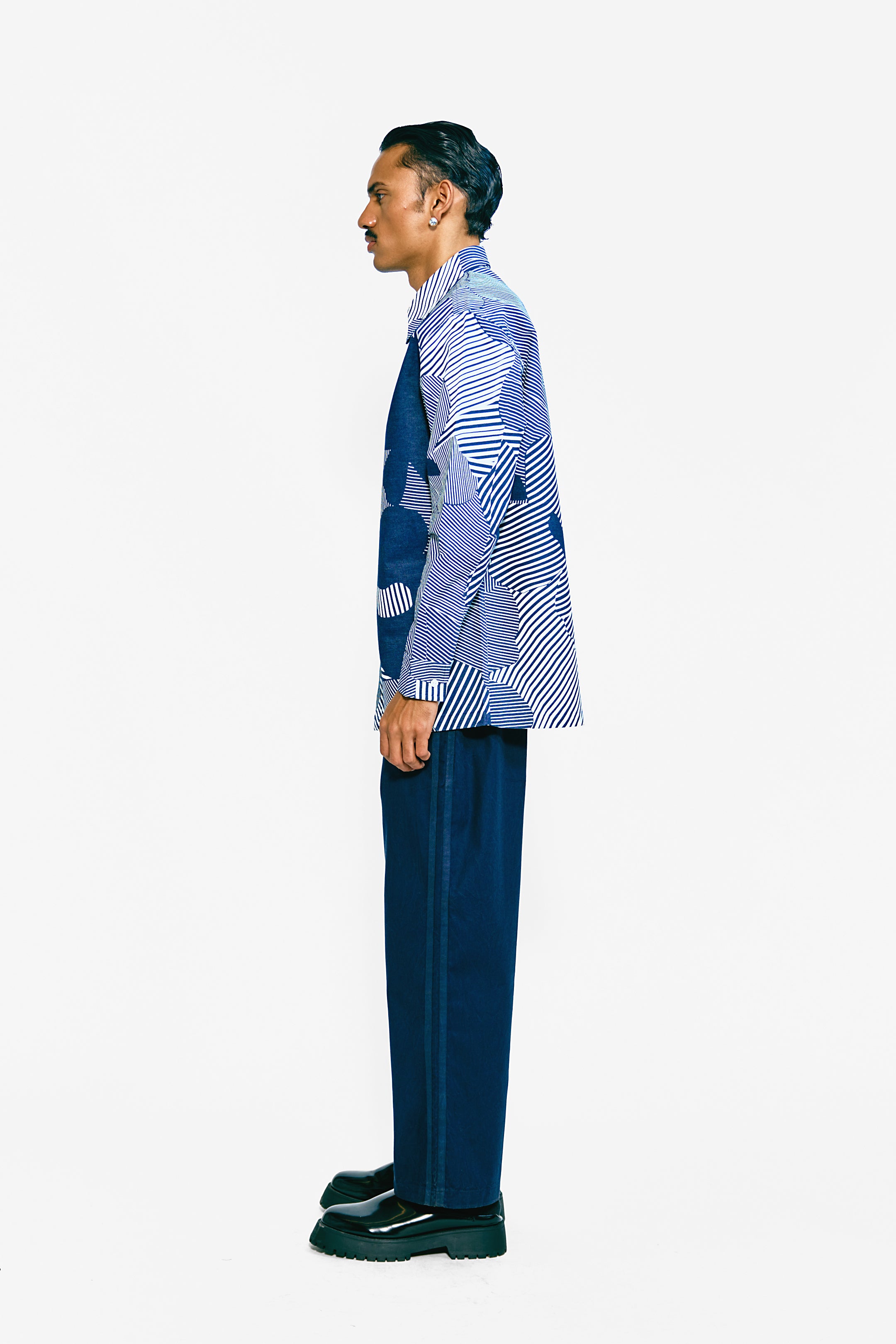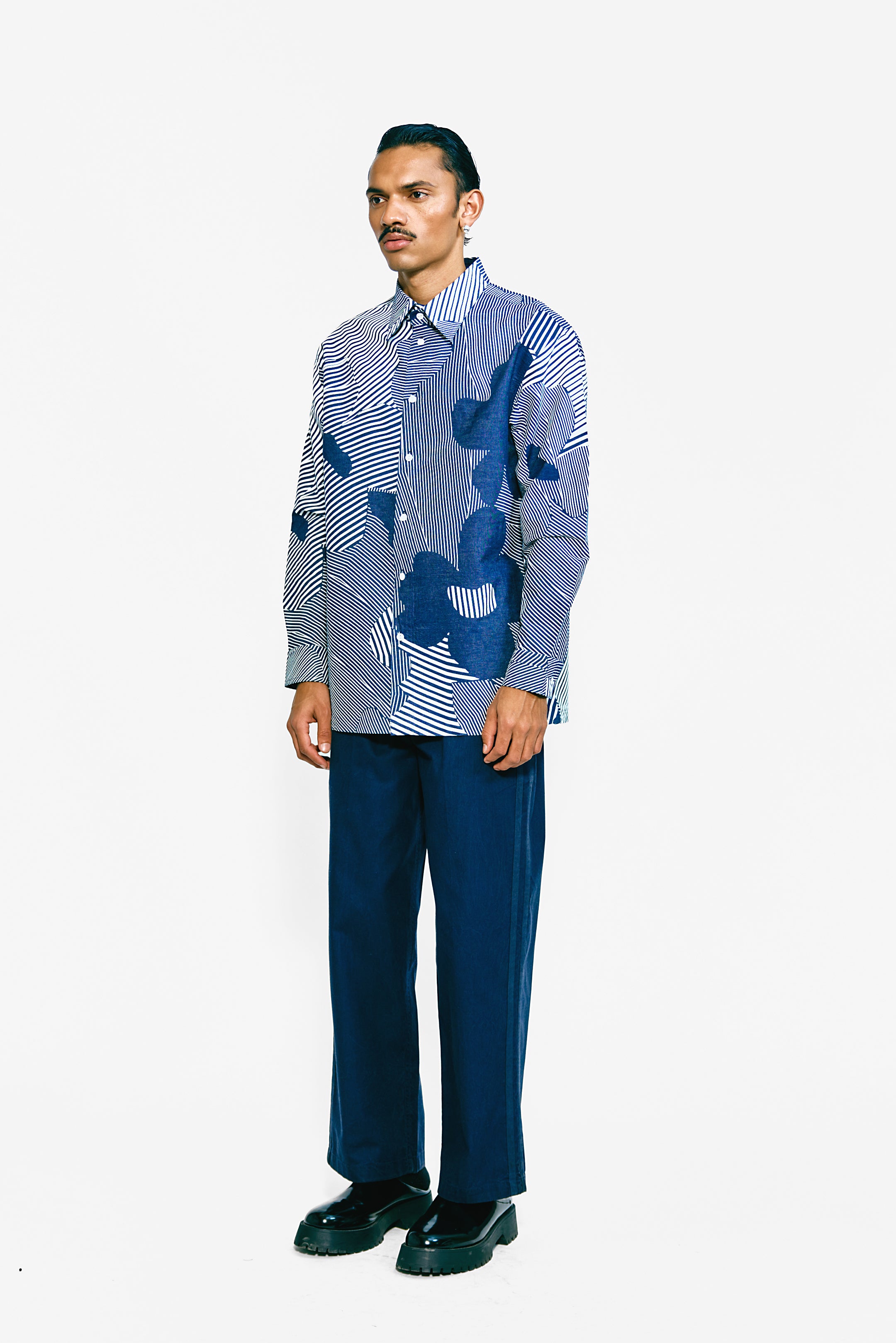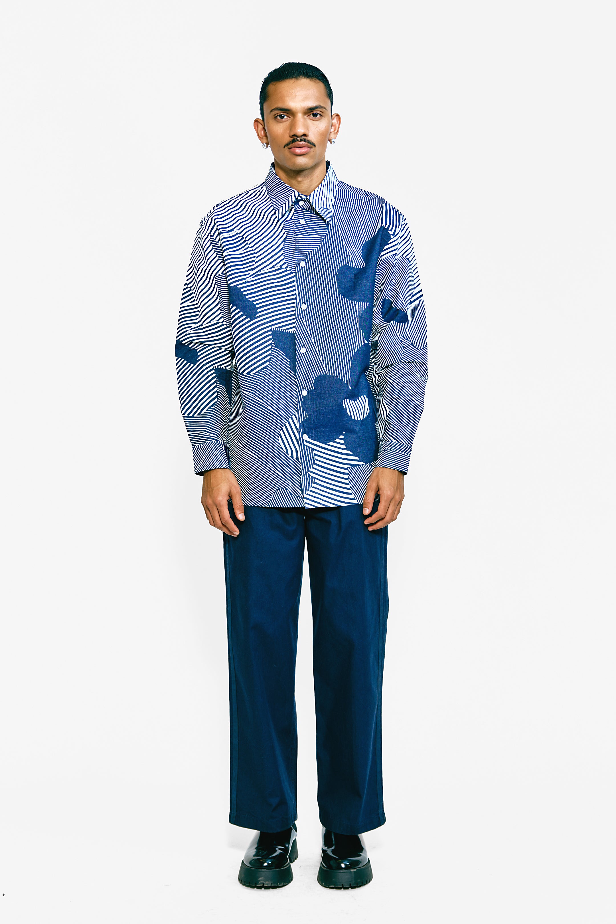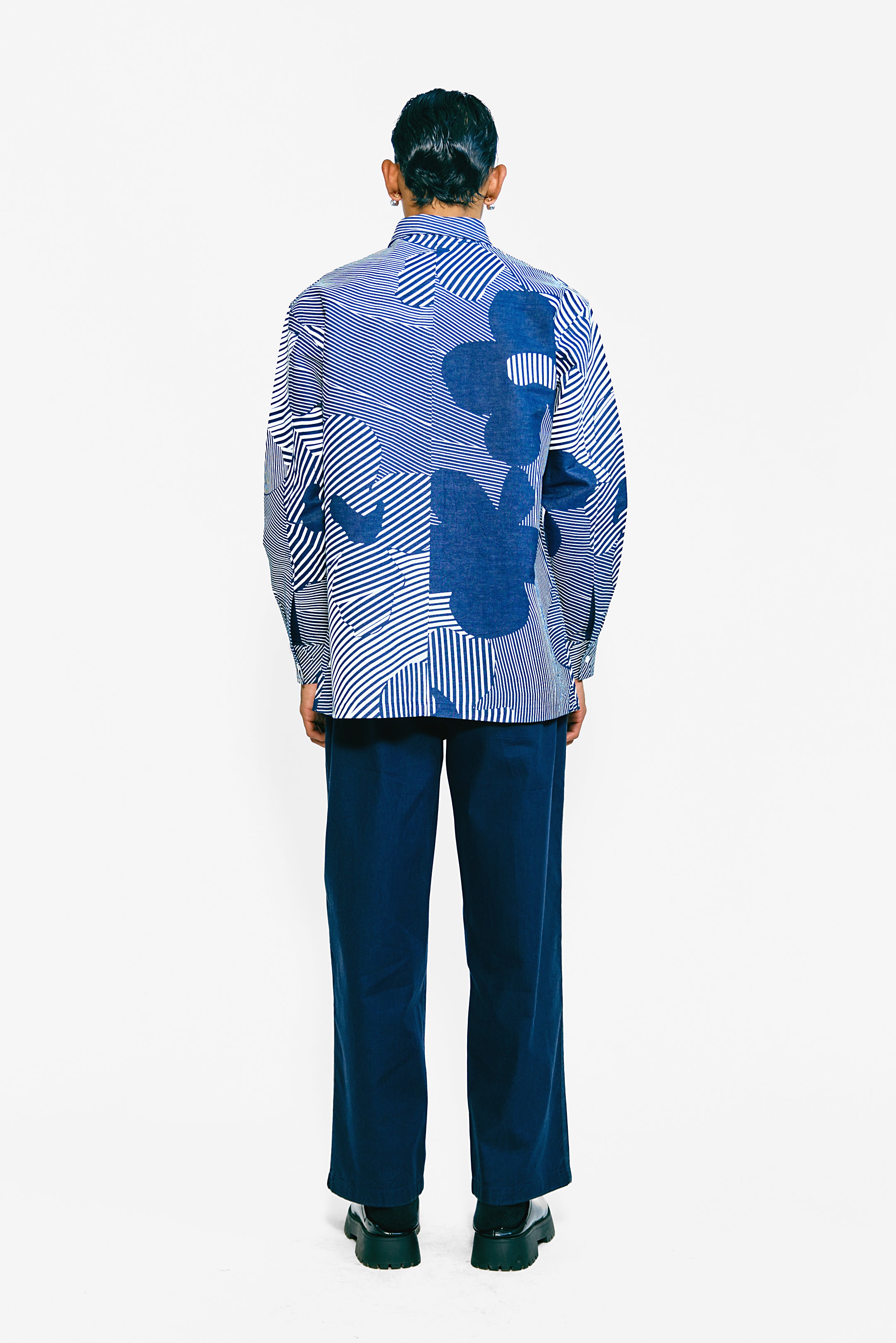 - A modern take on denim shirts, combining artistic detailing with everyday wearability.