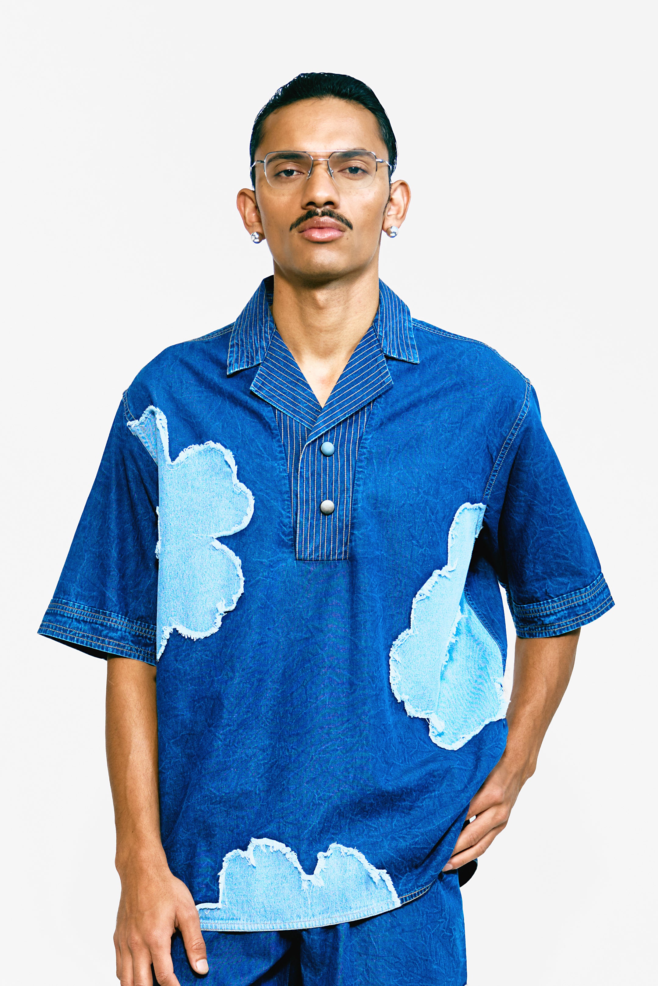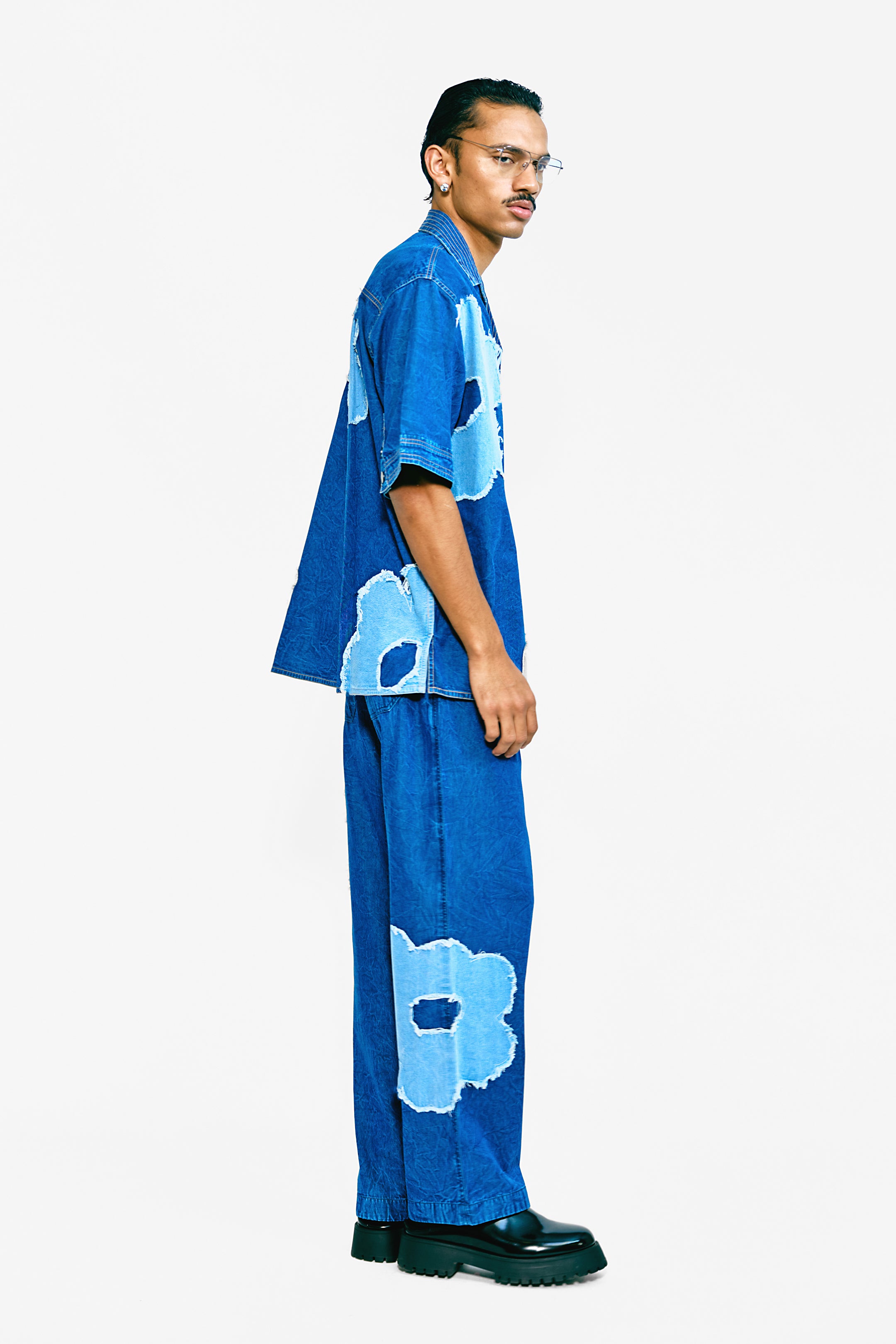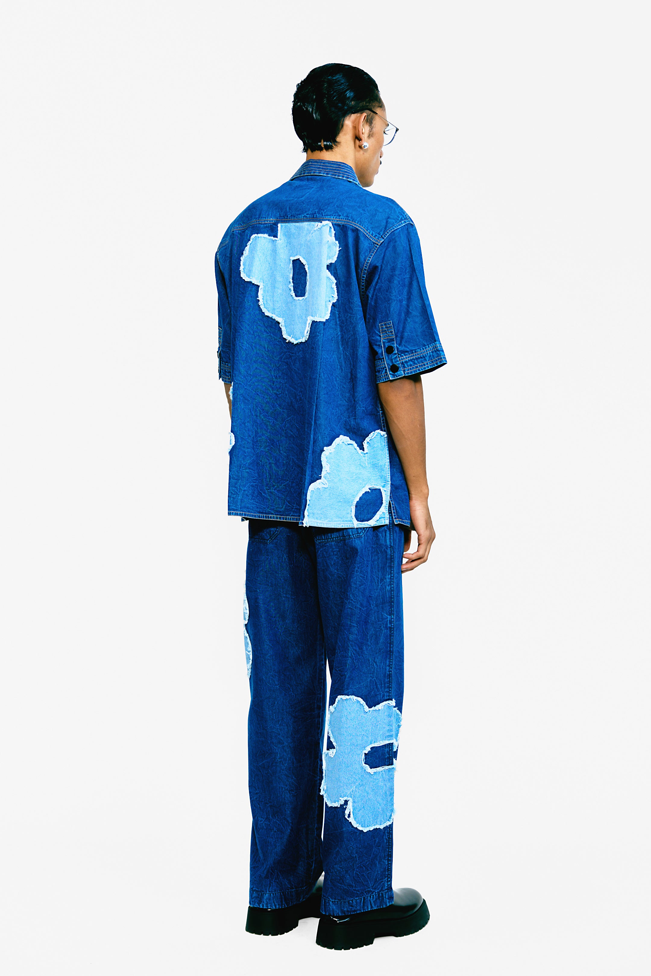 - Oversized floral motifs in a lighter wash add a bold, artistic element.
