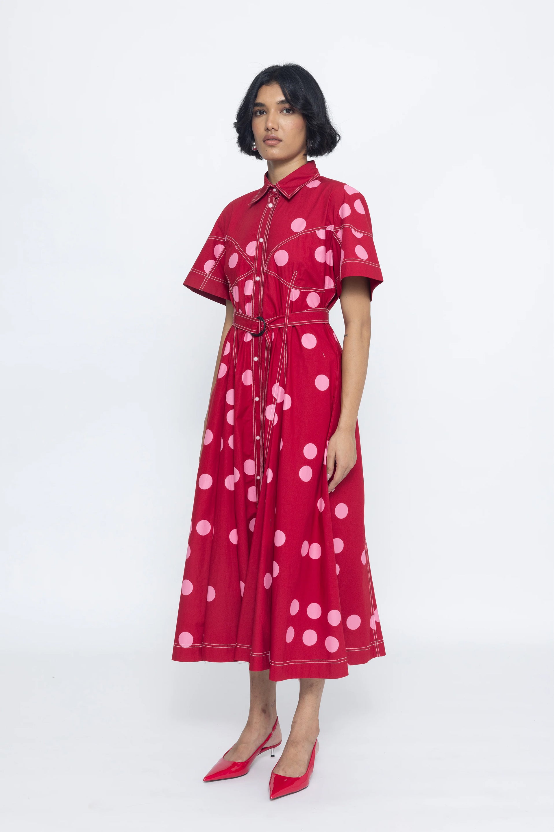 This shirt dress with corset stitch details is a sophisticated and chic garment. The corset stitch detailing adds structure and definition to the waist, creating a flattering silhouette. Paired with a belt, it enhances the waist further, offering versatility in styling. This dress combines the classic appeal of a shirt dress with modern detailing, making it a stylish choice for both casual and dressier occasions.