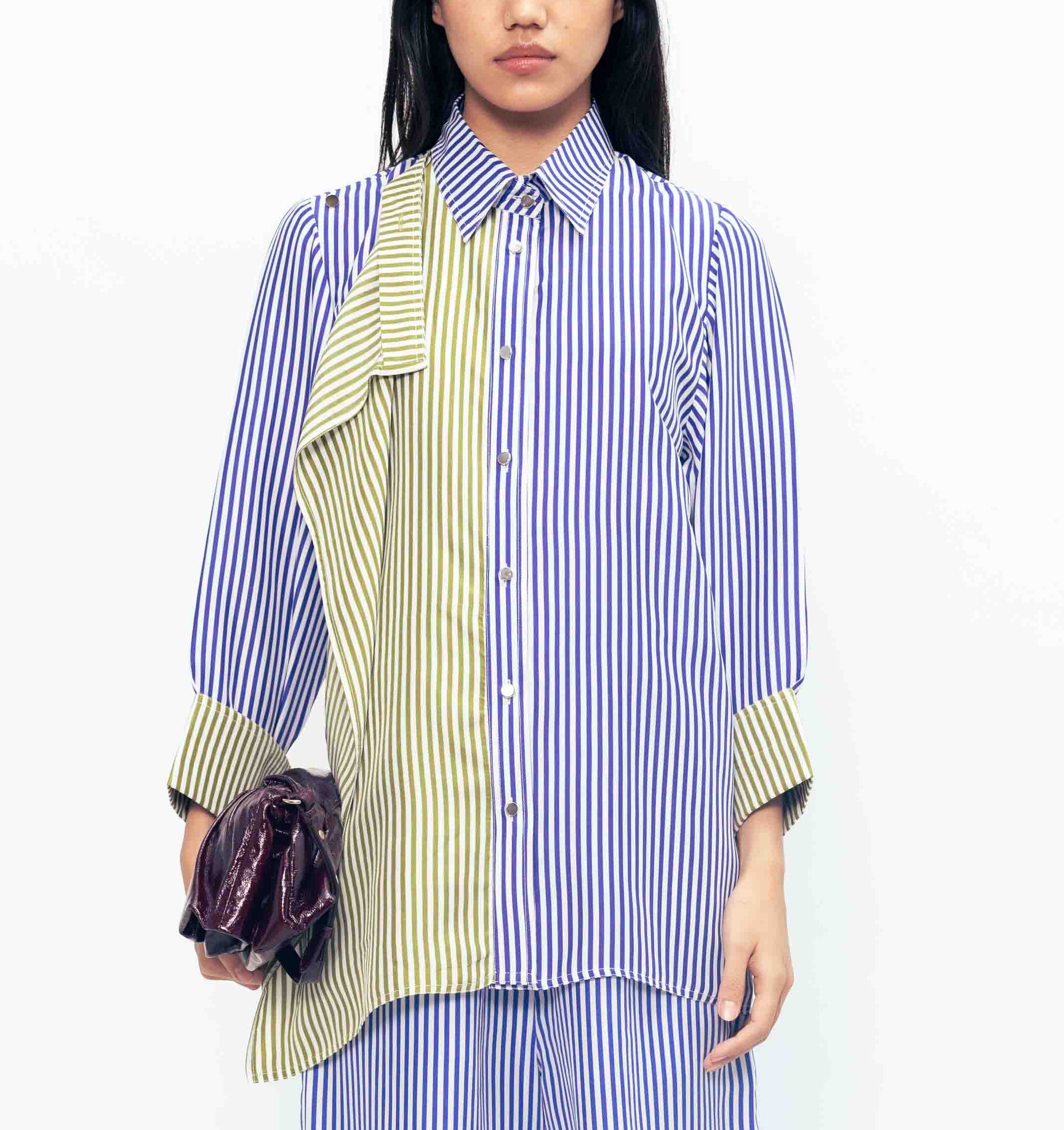 The classic juxtaposed button-down flap shirt offers a fresh spin on timeless shirting. Designed with asymmetrically placed flaps and a clean button-down front, it plays with proportion while maintaining a flowy, soft silhouette.