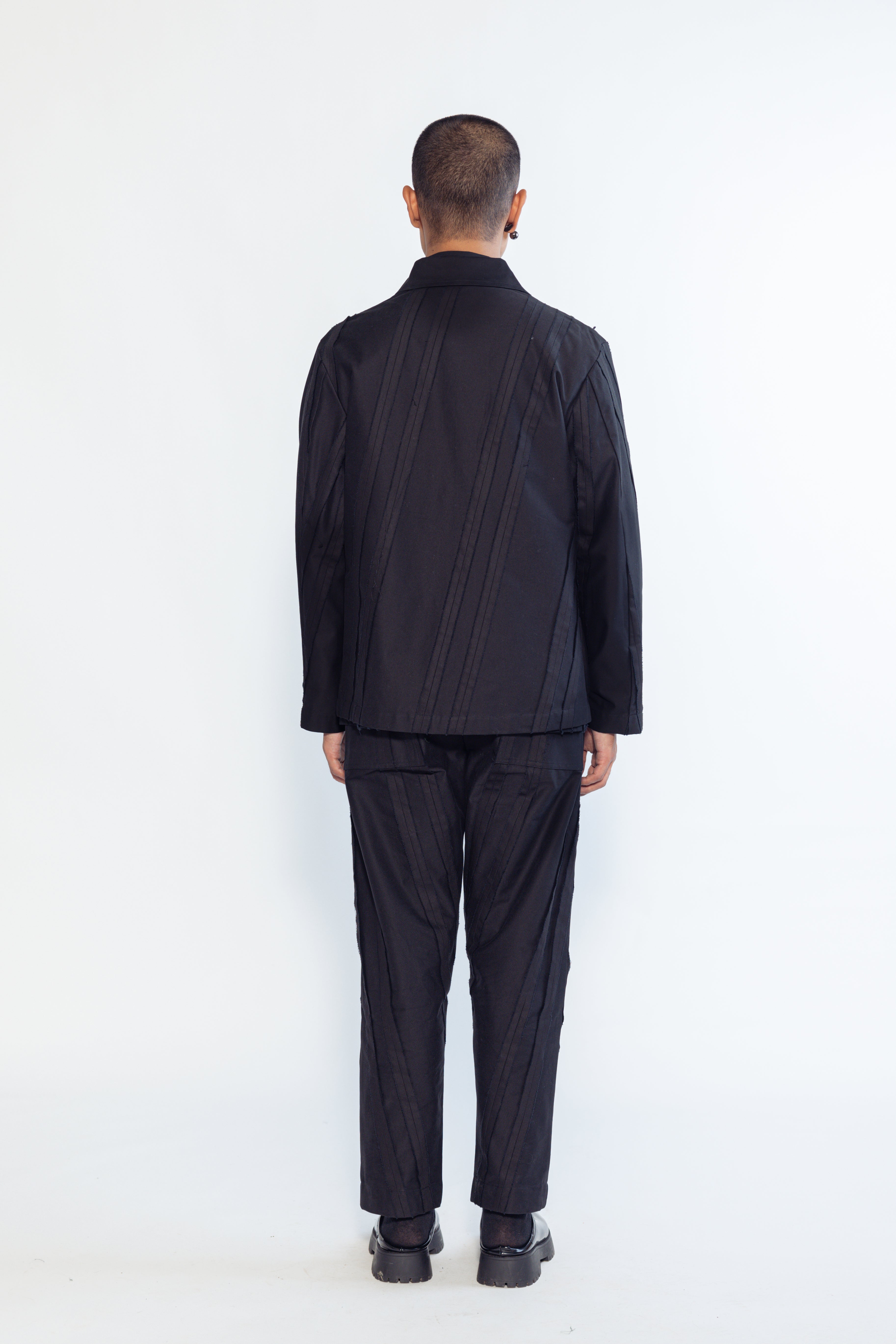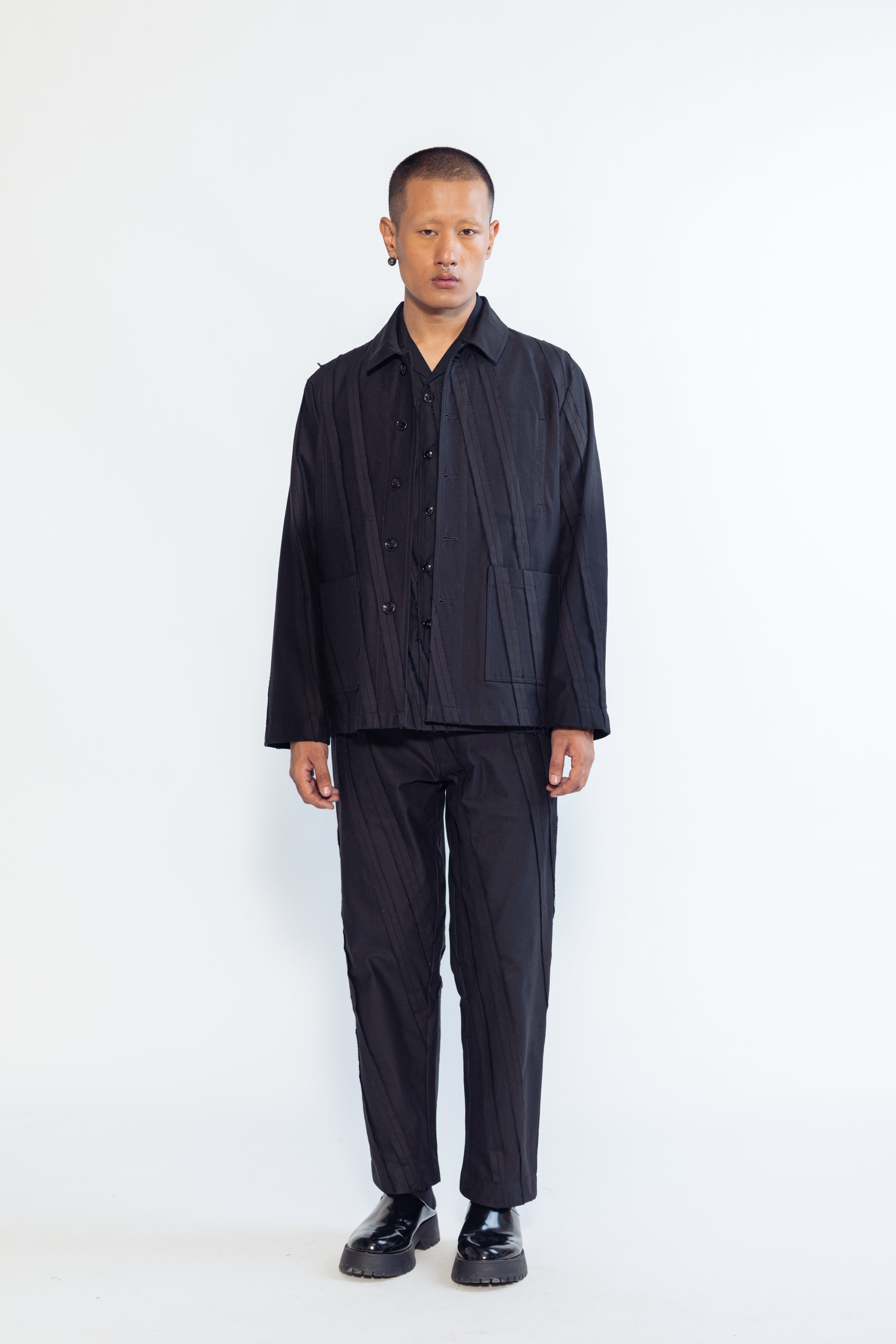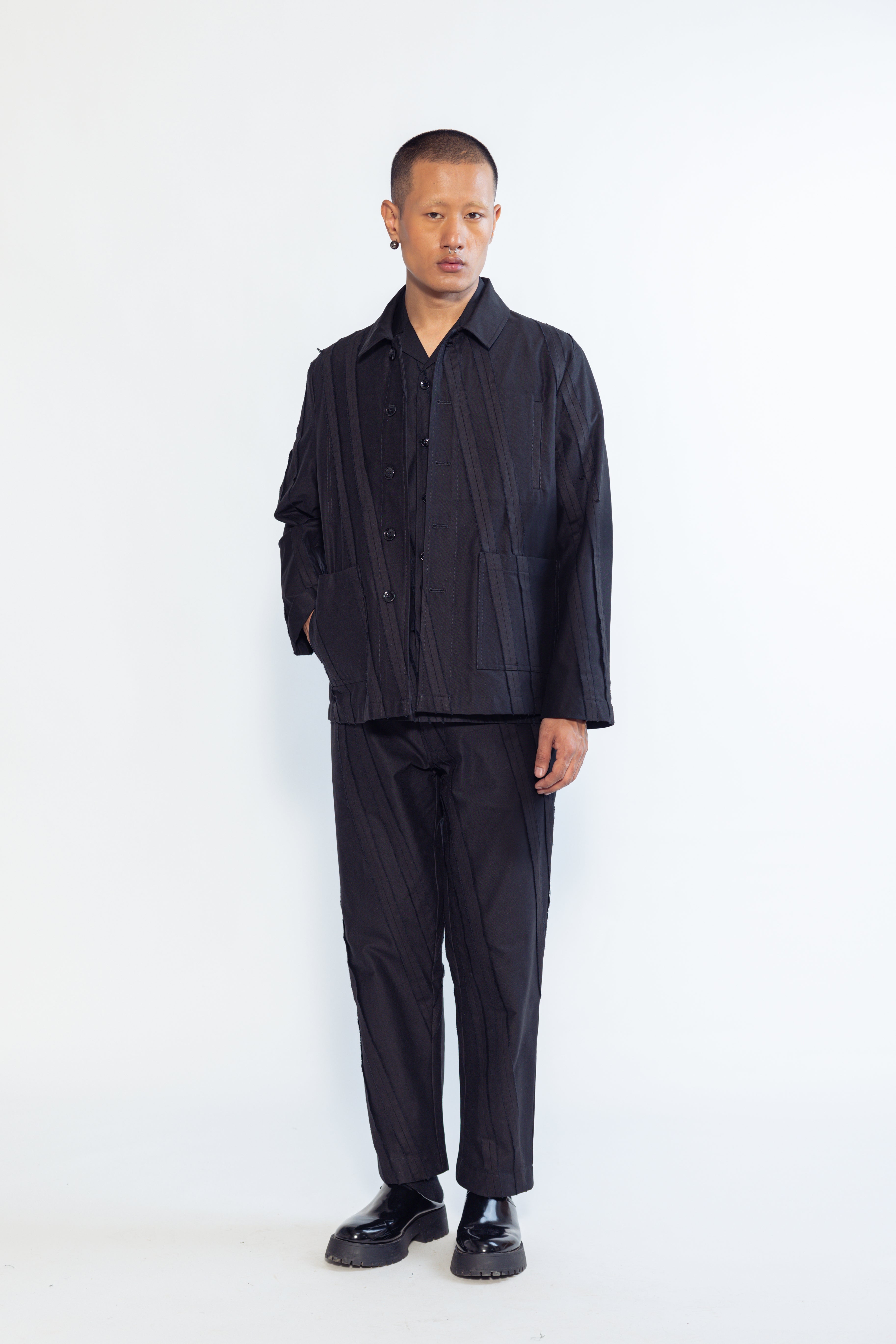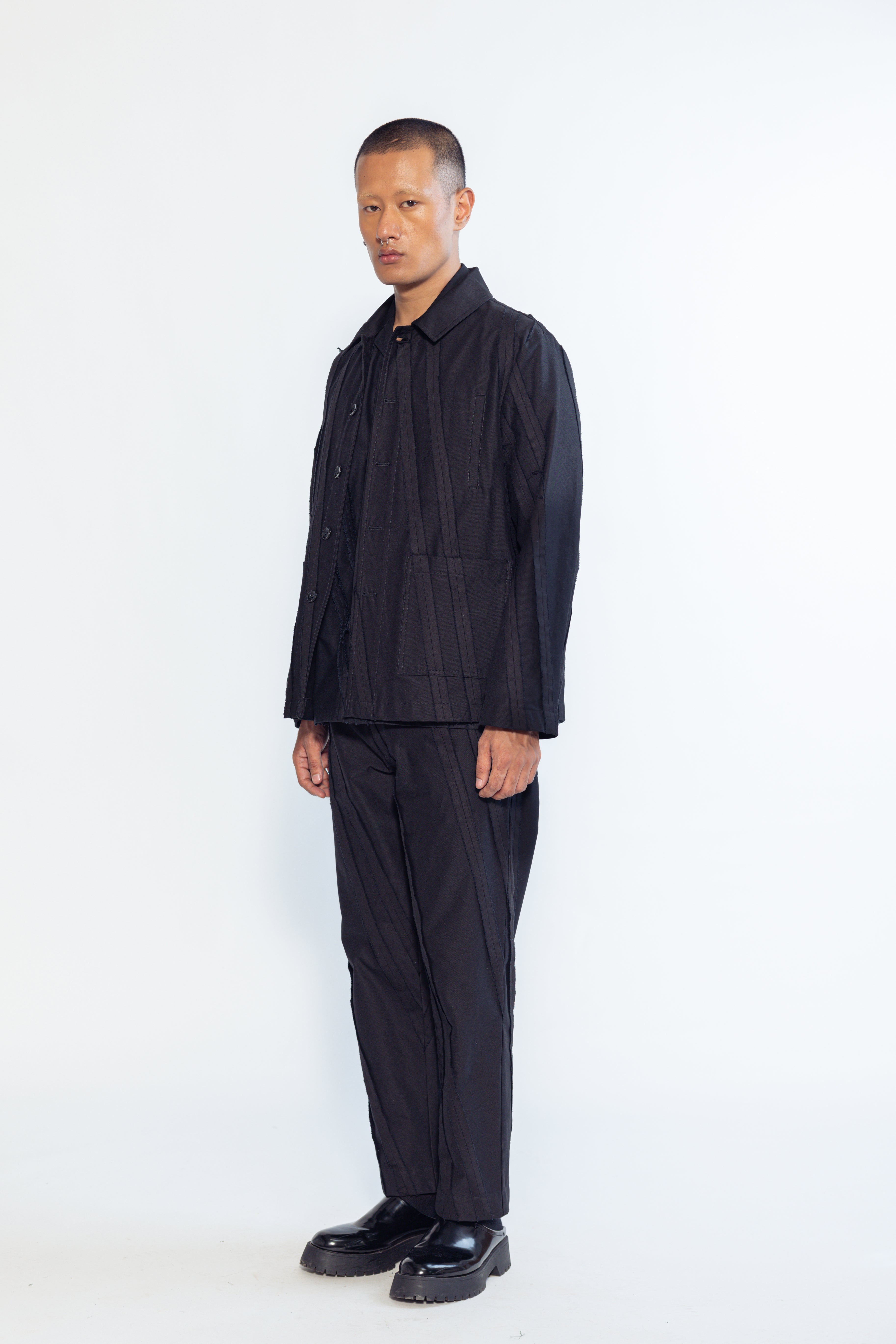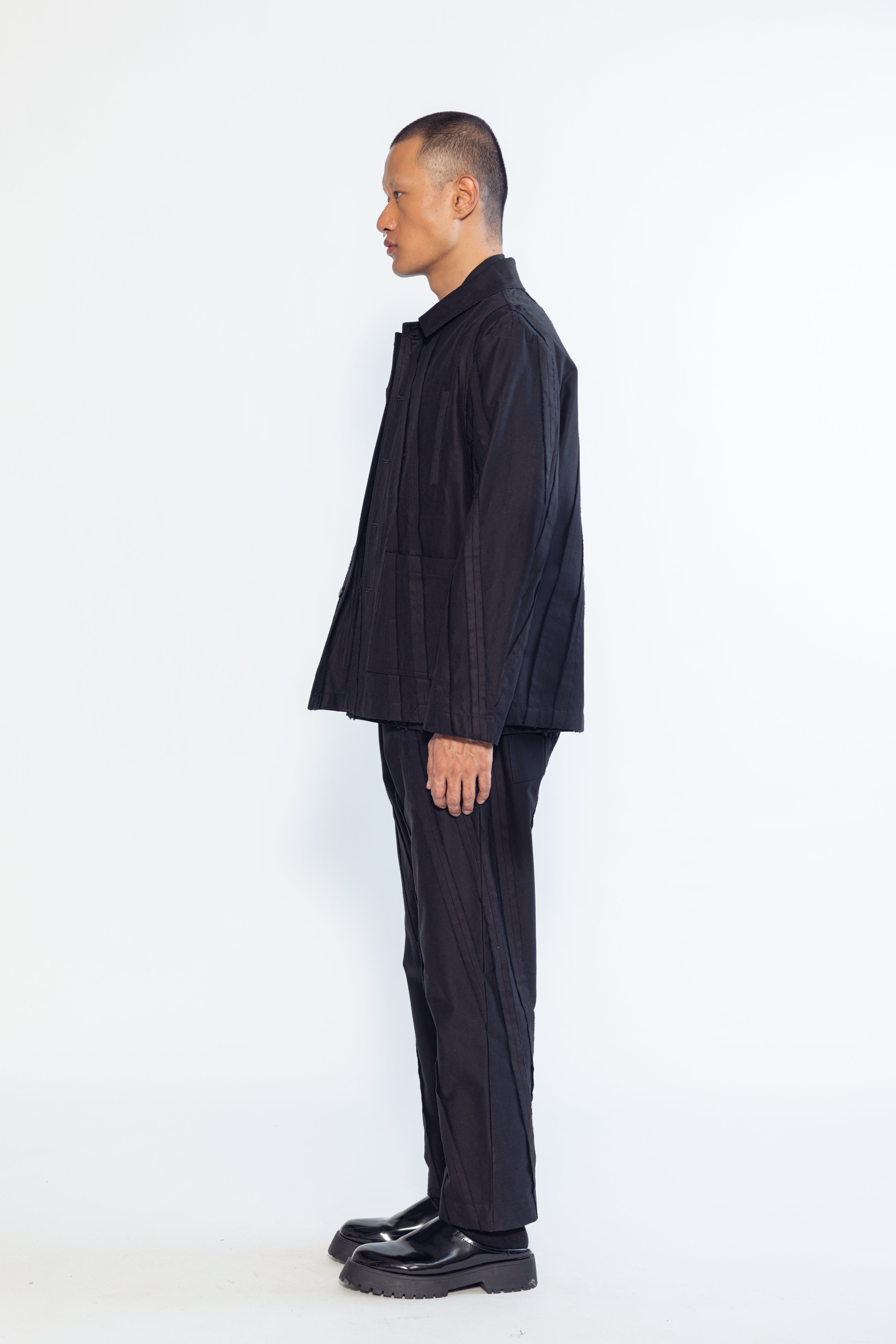 Designed with a relaxed cut and full-length sleeves, this jacket features a signature frayed angled seam finishes with raw edges for quiet contrast, echoing through the jacket. The surface has a structured, weighty feel with a clean matte finish that holds its shape. Functional details include two patch pockets, reinforcing its utility-driven roots. The overall tone is deep and uniform, giving it a sharp, pared-back presence. A minimal layer with subtle tension in the construction.