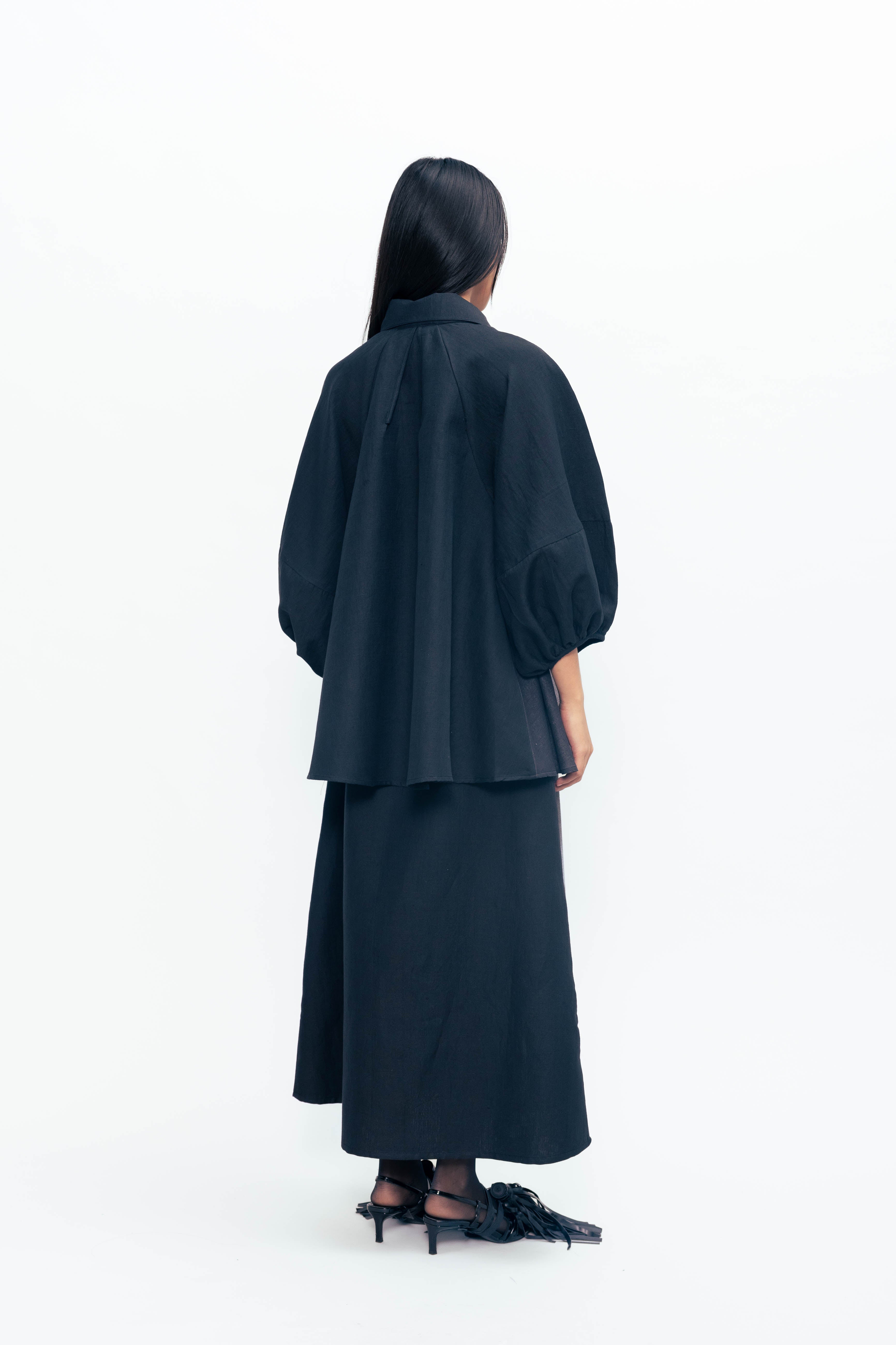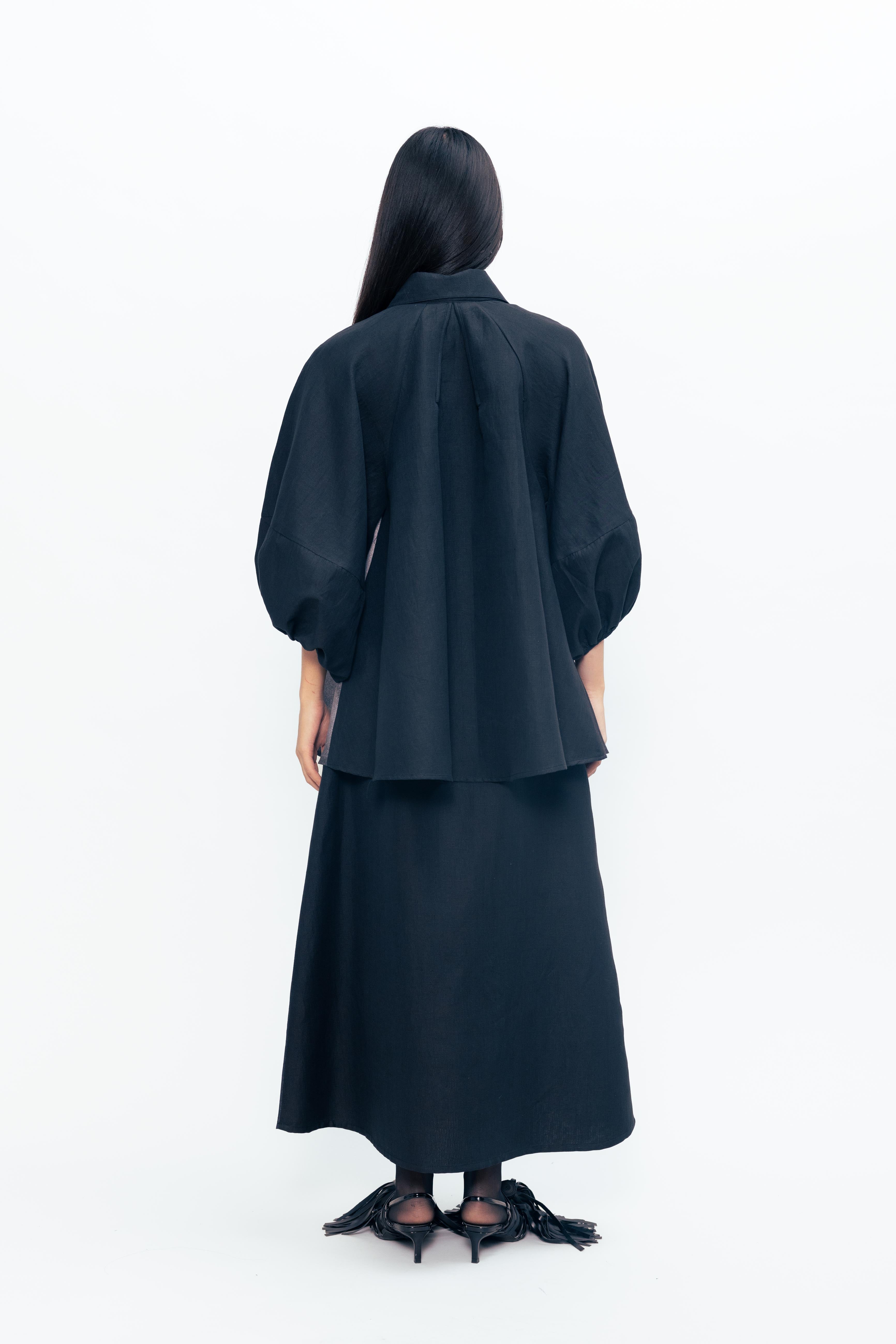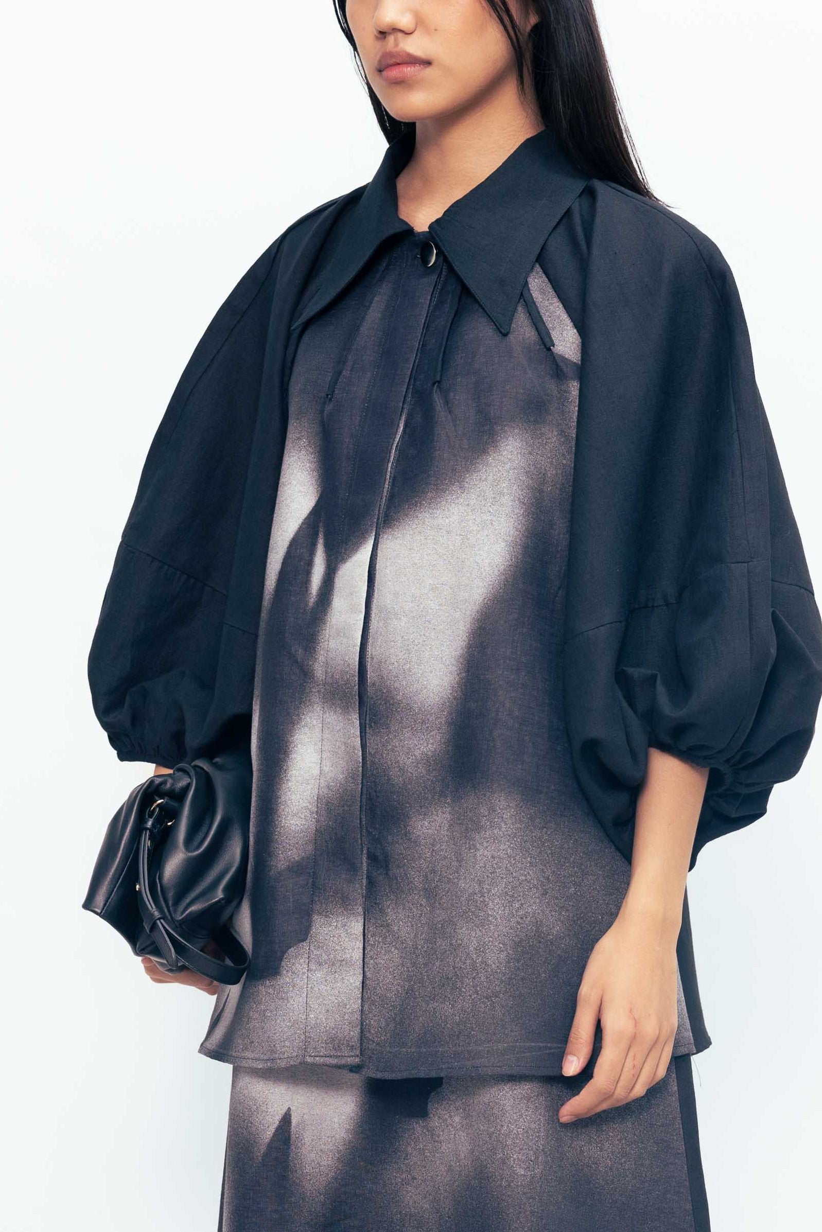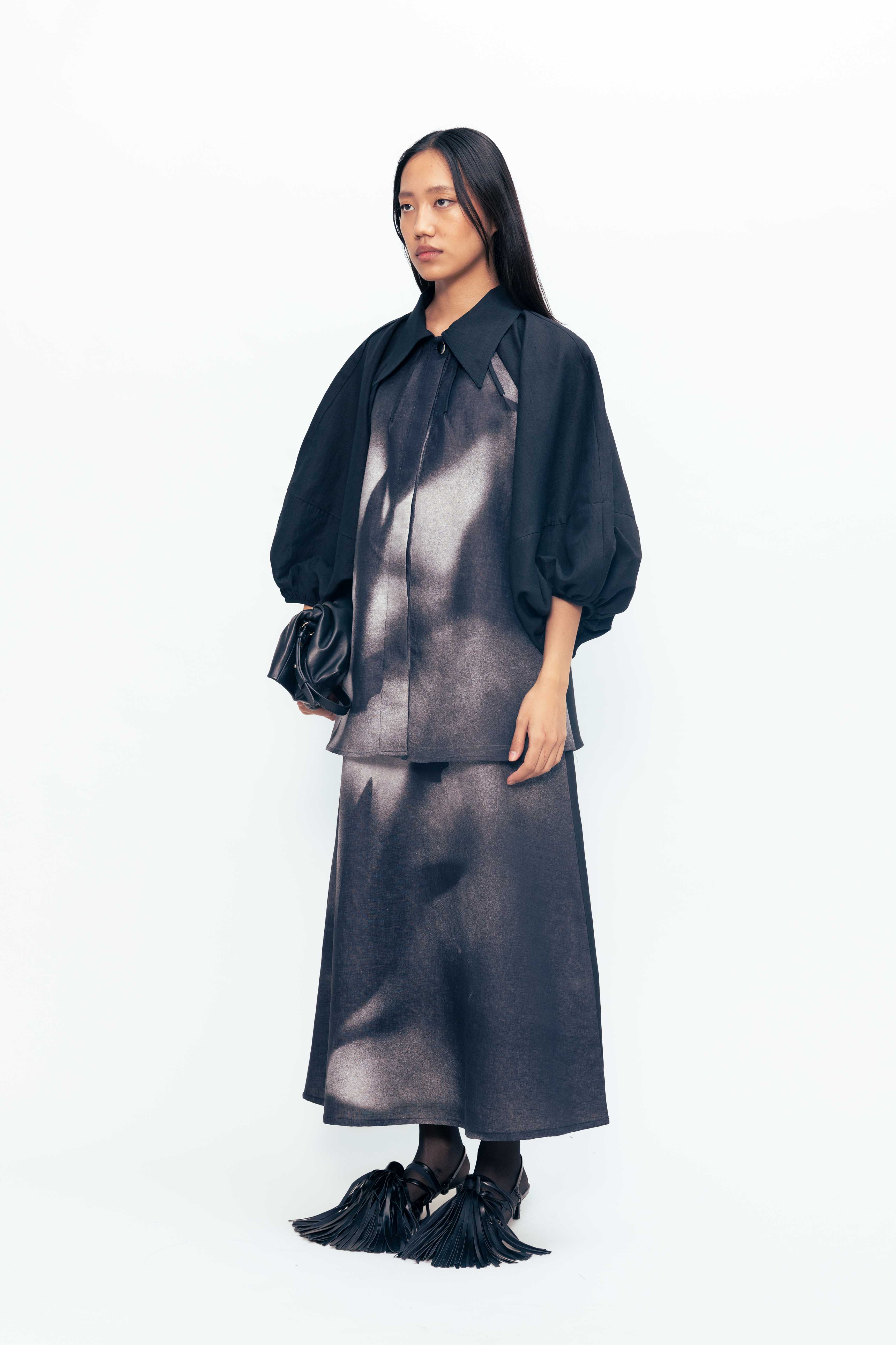 This shirt blends crisp tailoring with soft drama, featuring a classic button-down front contrasted by voluminous sleeves that add fluidity and shape. The subtle all-over print introduces a layer of visual interest, giving the piece an understated yet expressive edge.