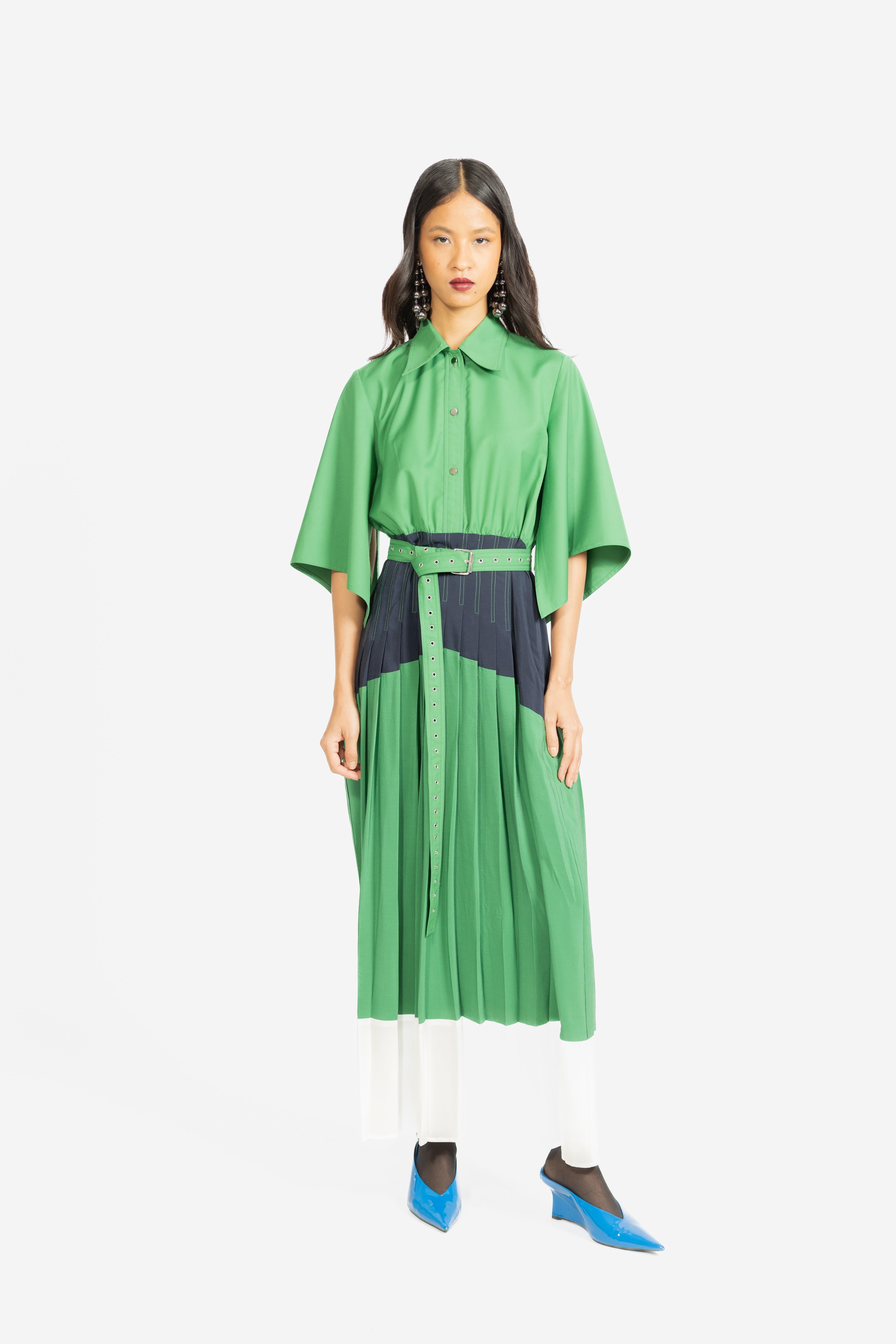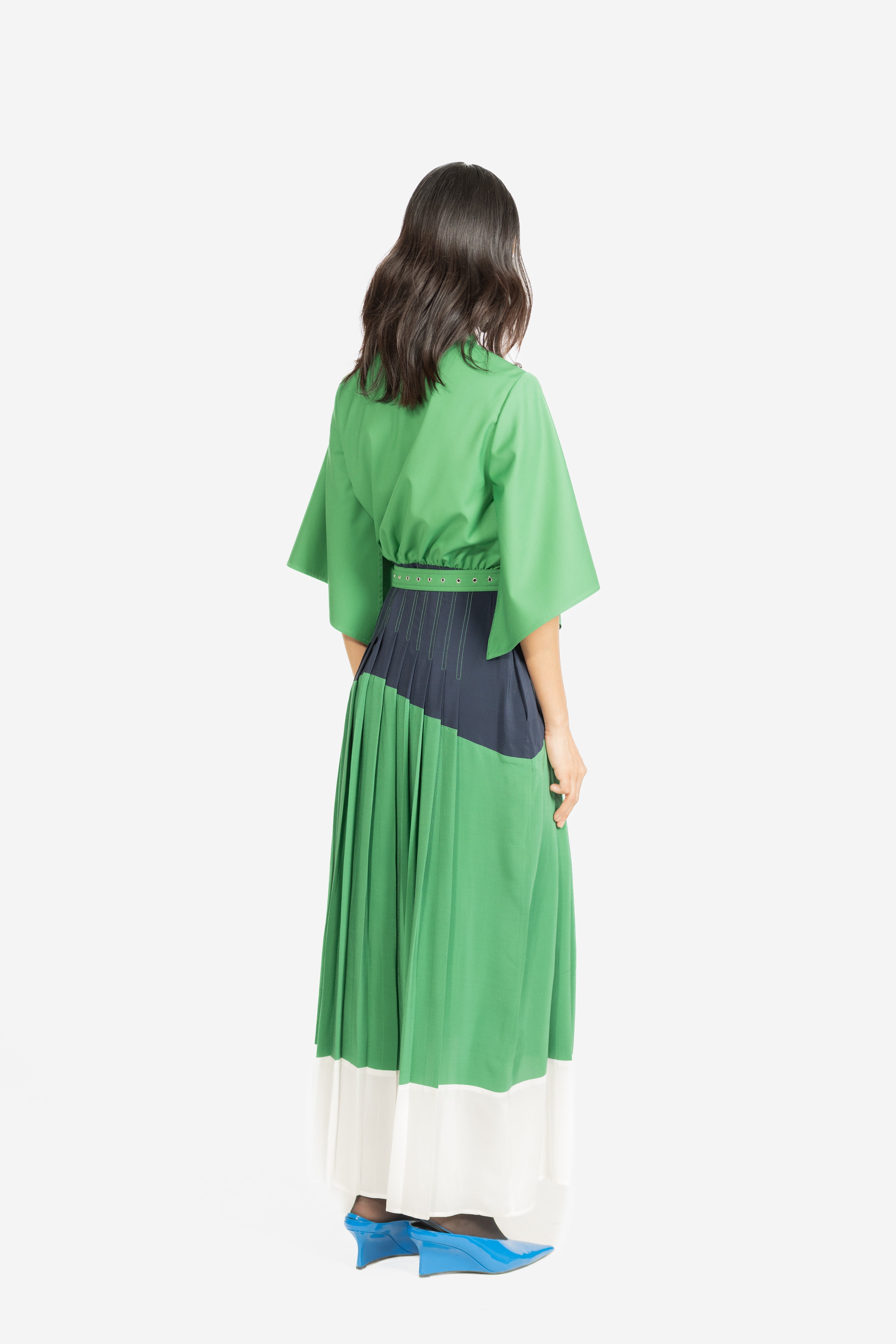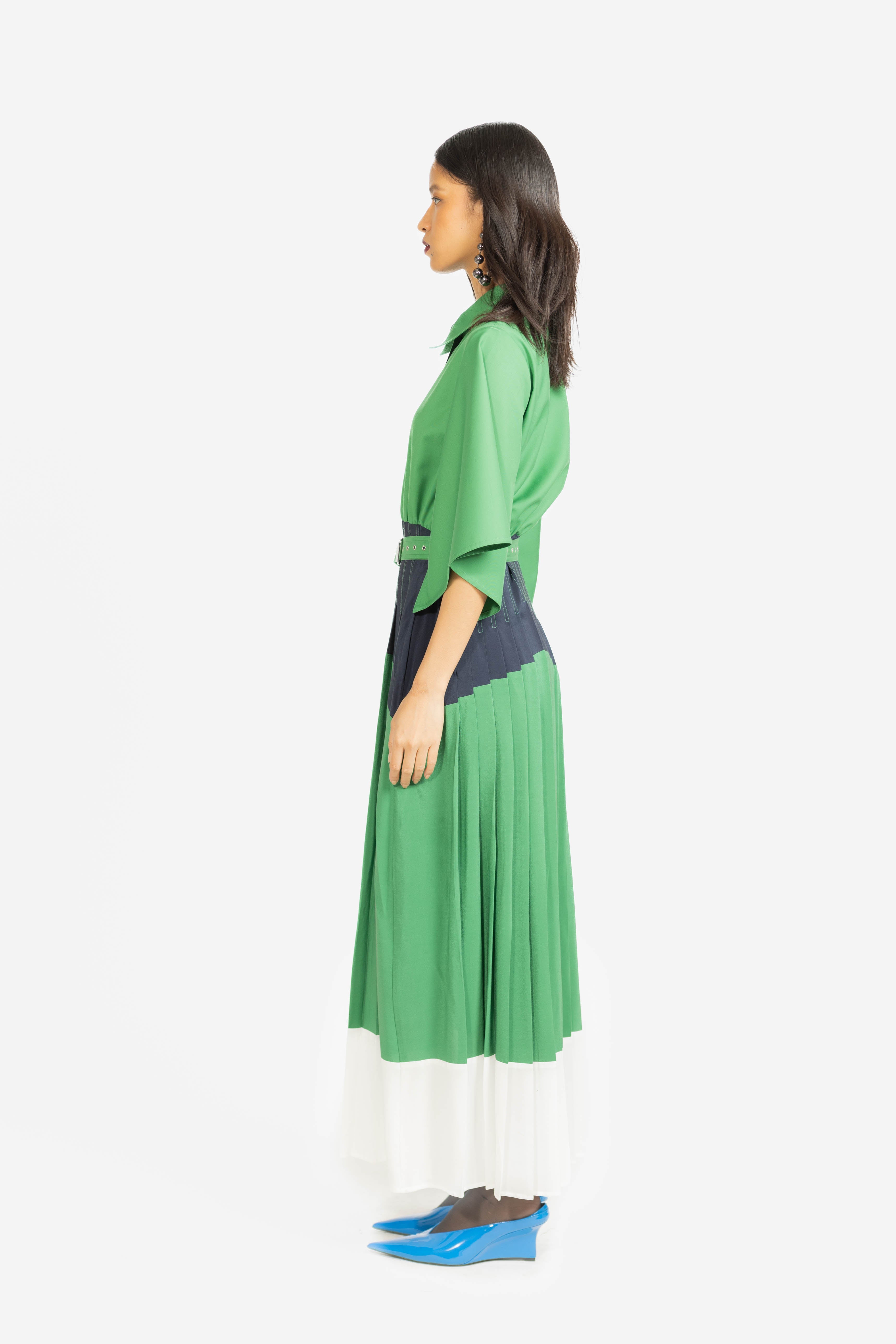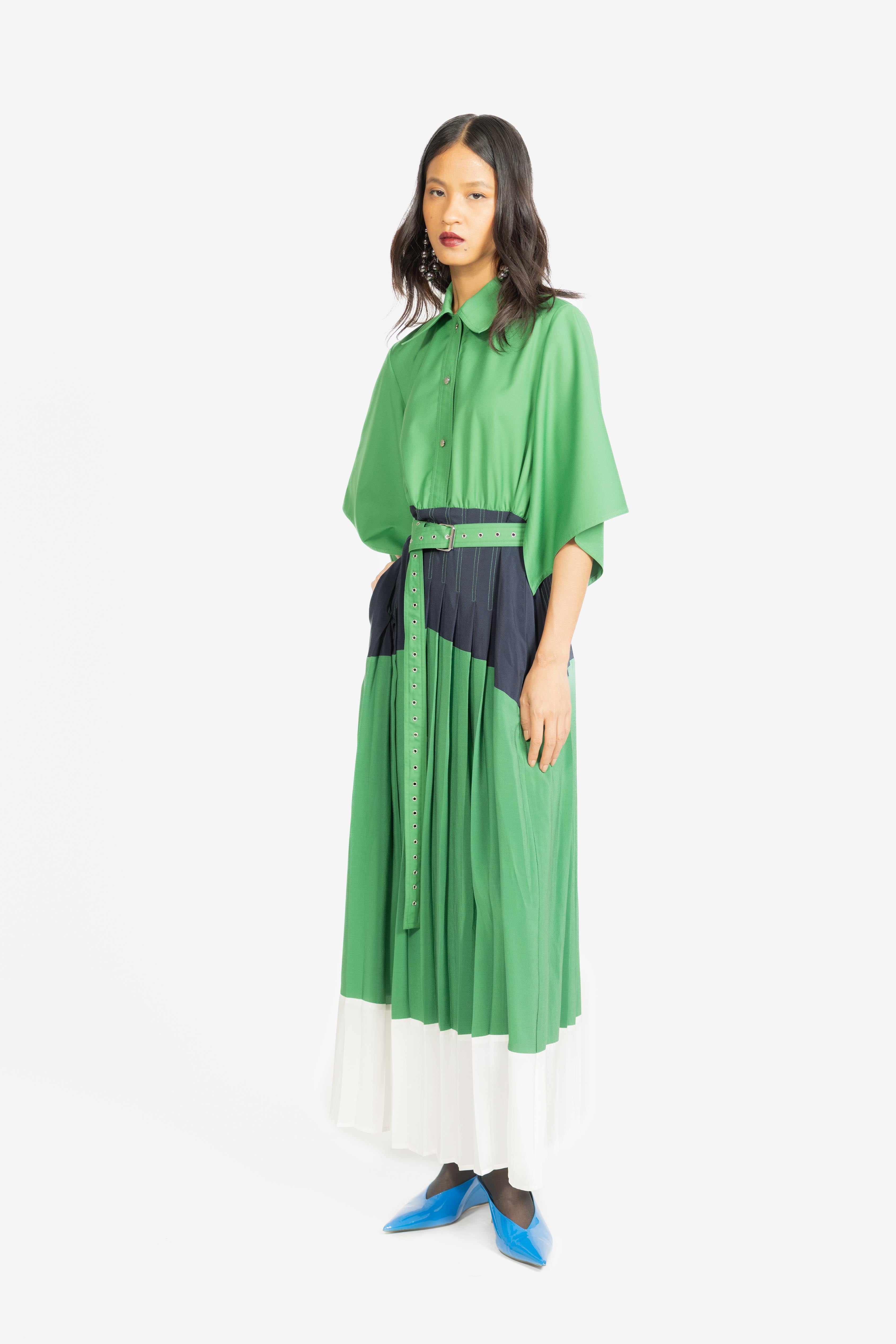 A sophisticated shirt dress featuring a refined three-tone palette with elegantly pleated panels for added movement and depth. Designed with a classic shirt silhouette, it blends structured tailoring with contemporary color blocking for effortless style.