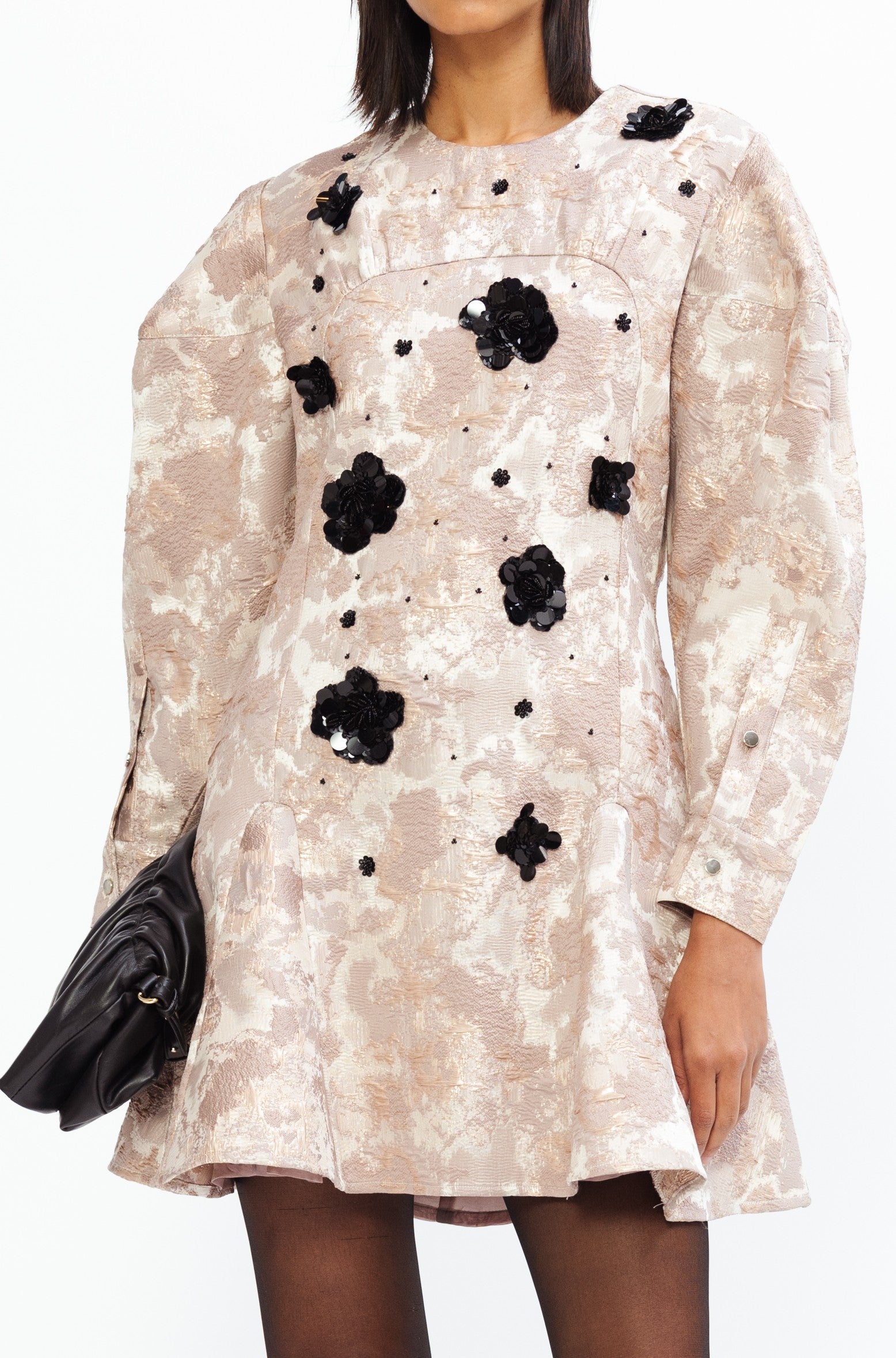 This tailored mini dress strikes the perfect balance between modern elegance and playful edge. Featuring full-length sleeves for a refined look, the silhouette is both structured and flattering. Finished with striking black appliqué detailing, it adds depth and a touch of drama to your ensemble.