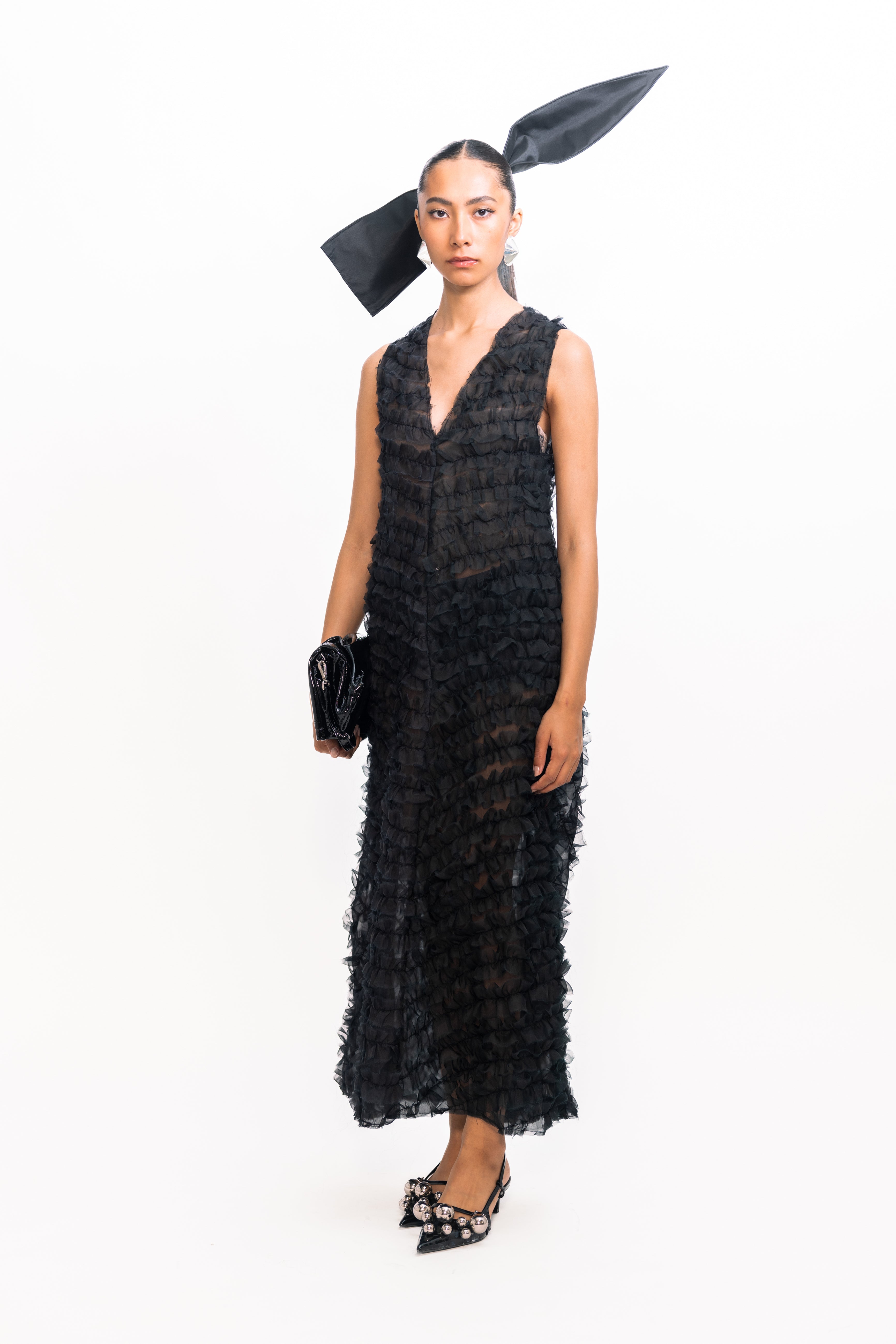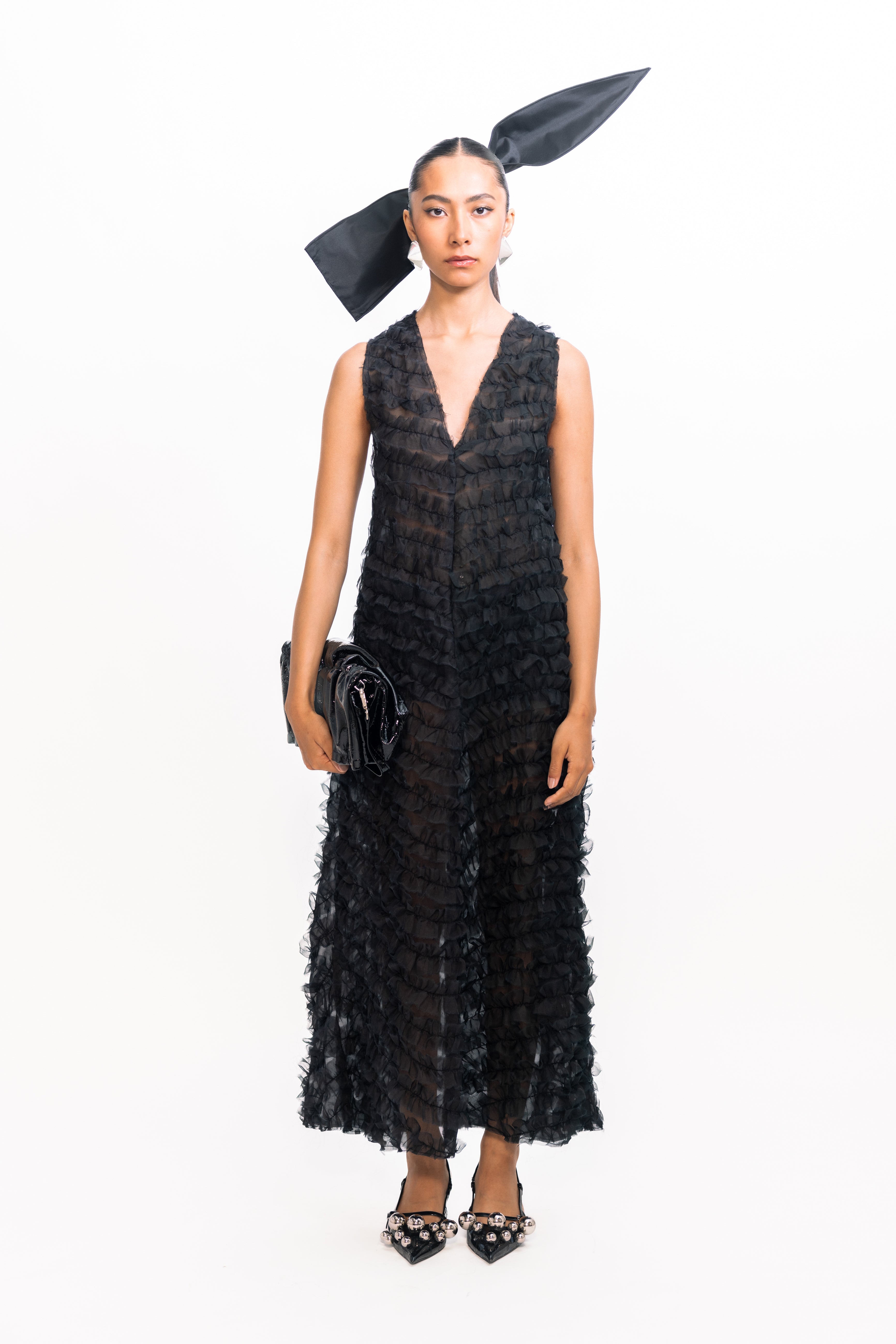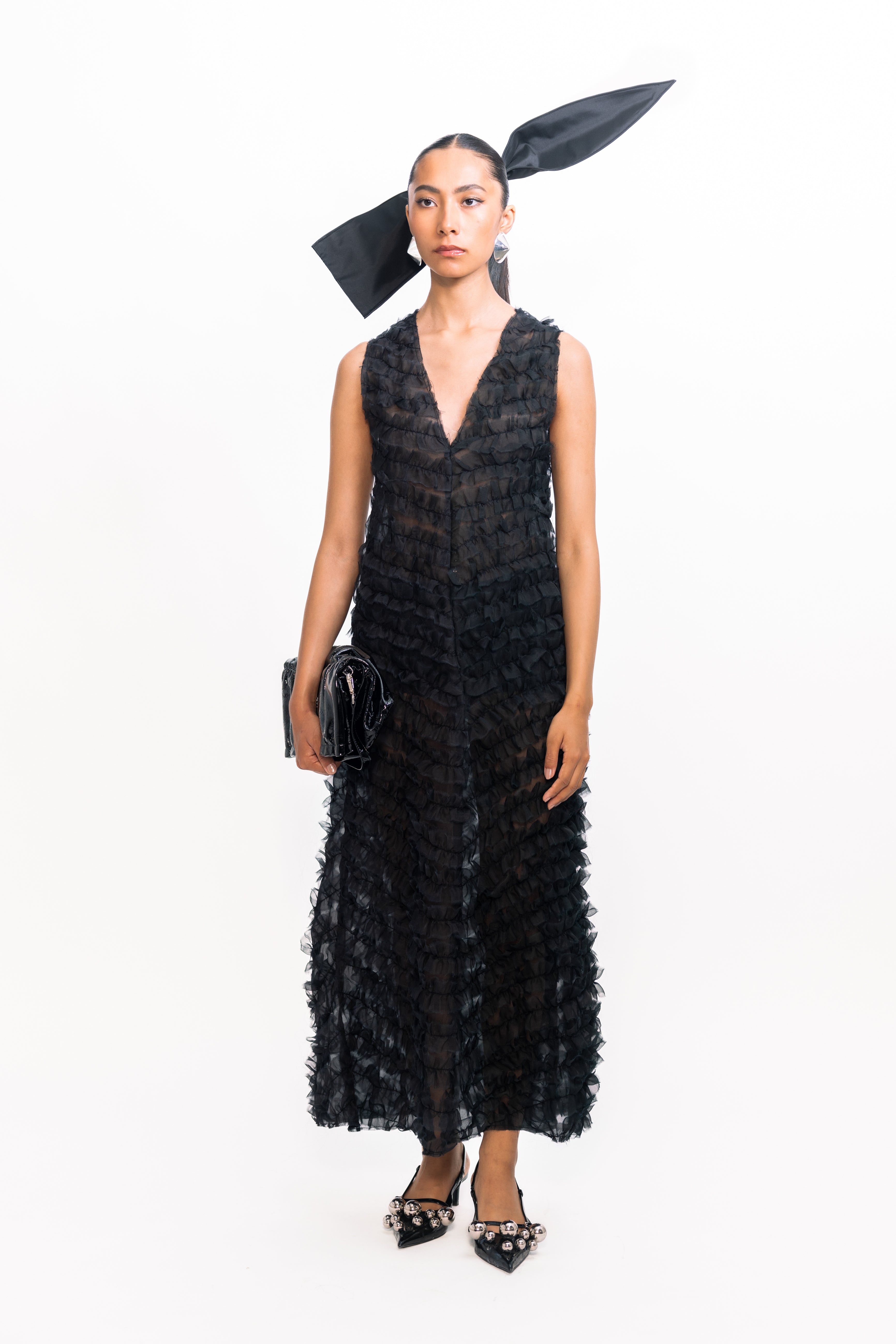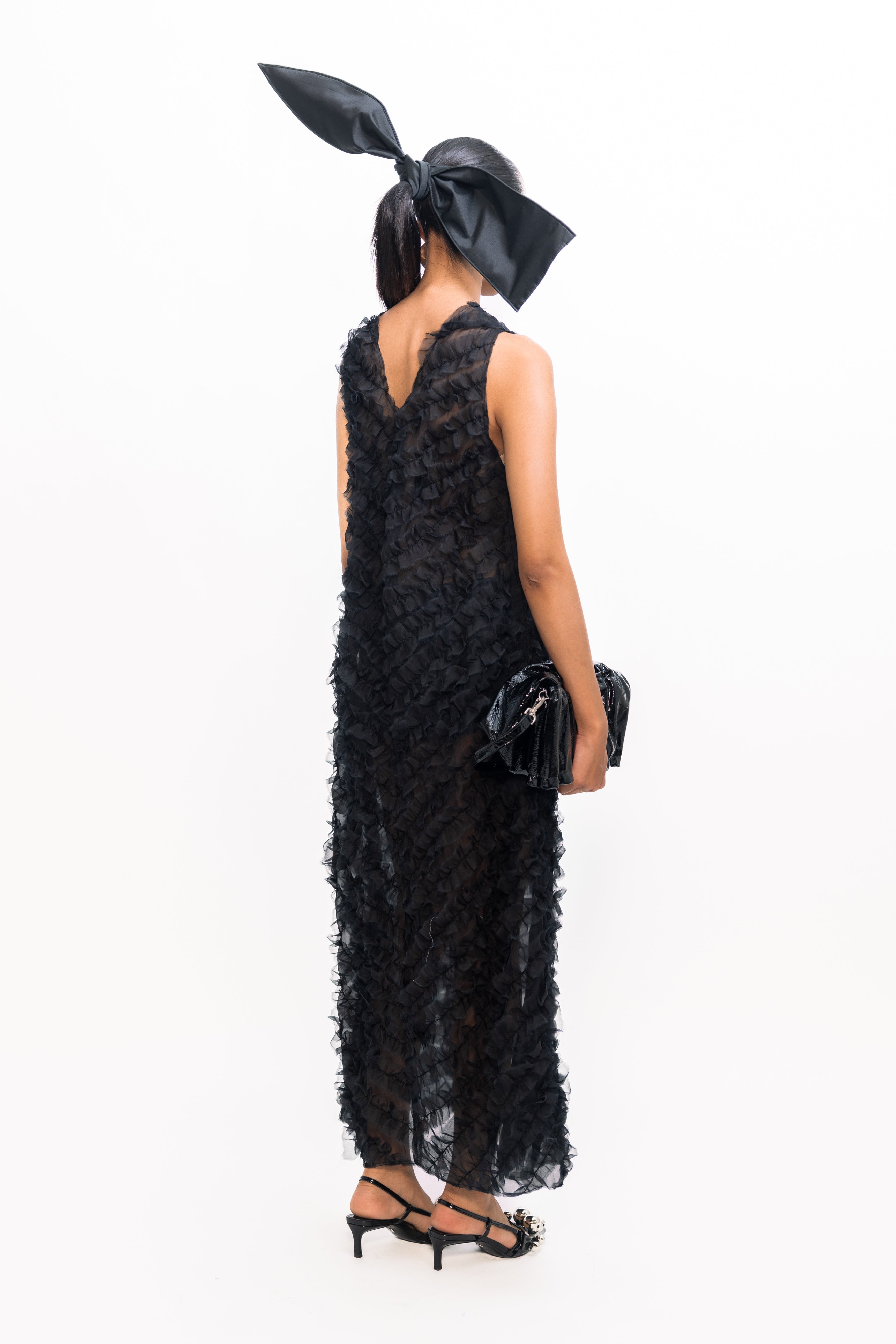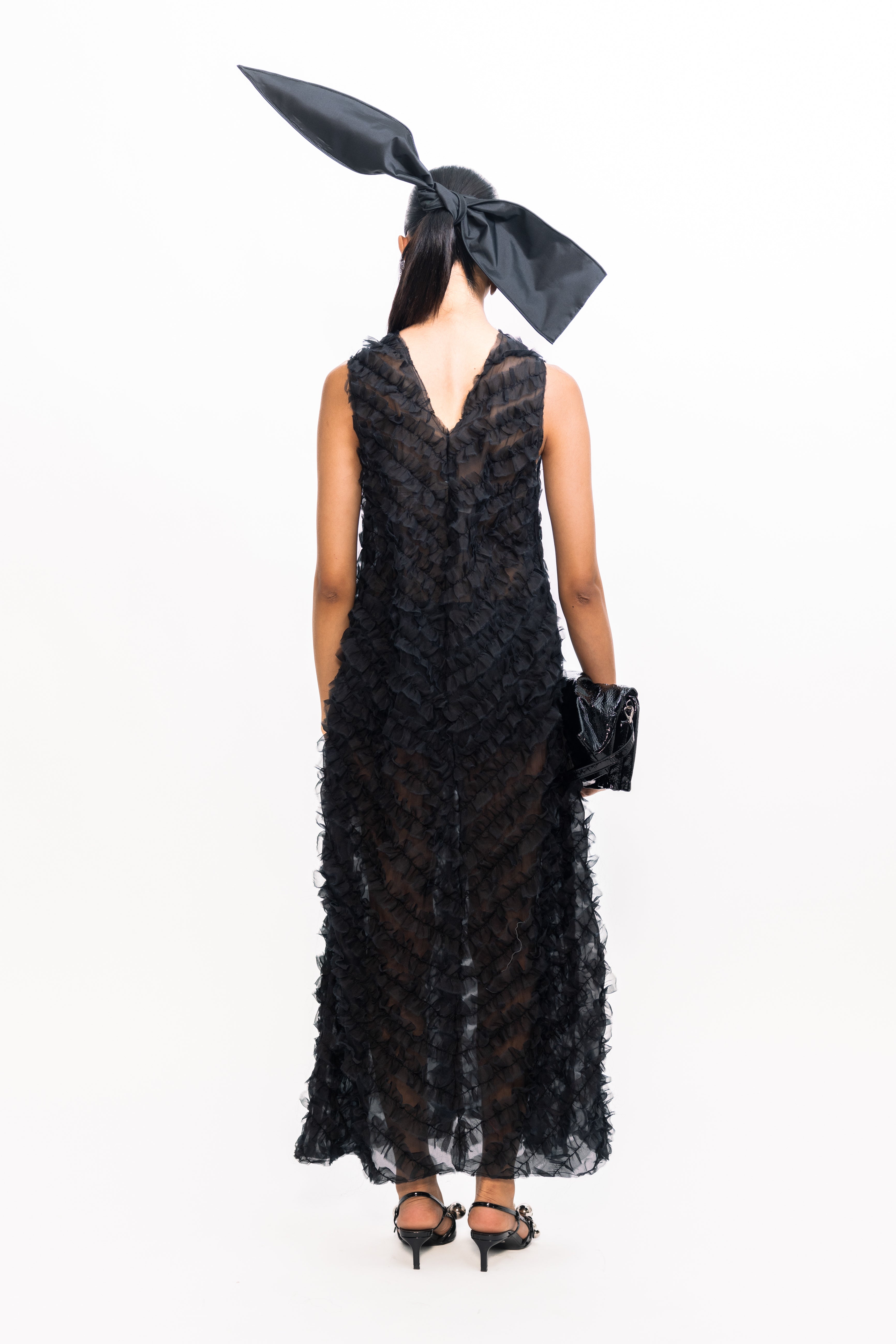 Effortlessly feminine, this sleeveless dress features a flattering V-neckline and delicate diagonal ruffles that create beautiful texture across the bodice and skirt. Cut in a sleek straight silhouette, it offers a modern alternative to classic fit-and-flare styles, perfect for both daytime celebrations and evening occasions.