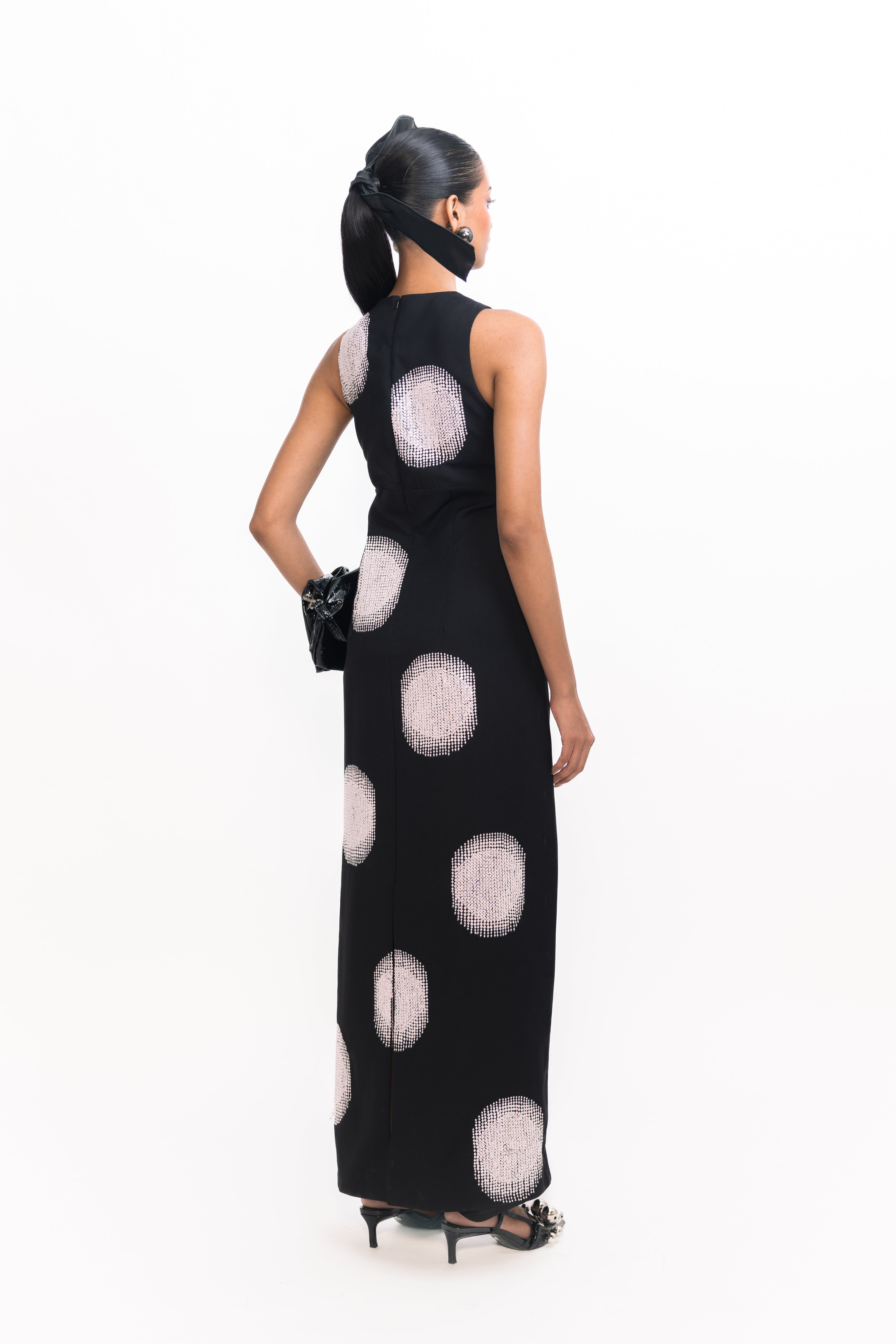 The sleeveless design keeps the look effortlessly sleek, while the floor-skimming length adds a note of drama—perfect for cocktail parties, black-tie celebrations, or any evening affair that calls for understated glamour.