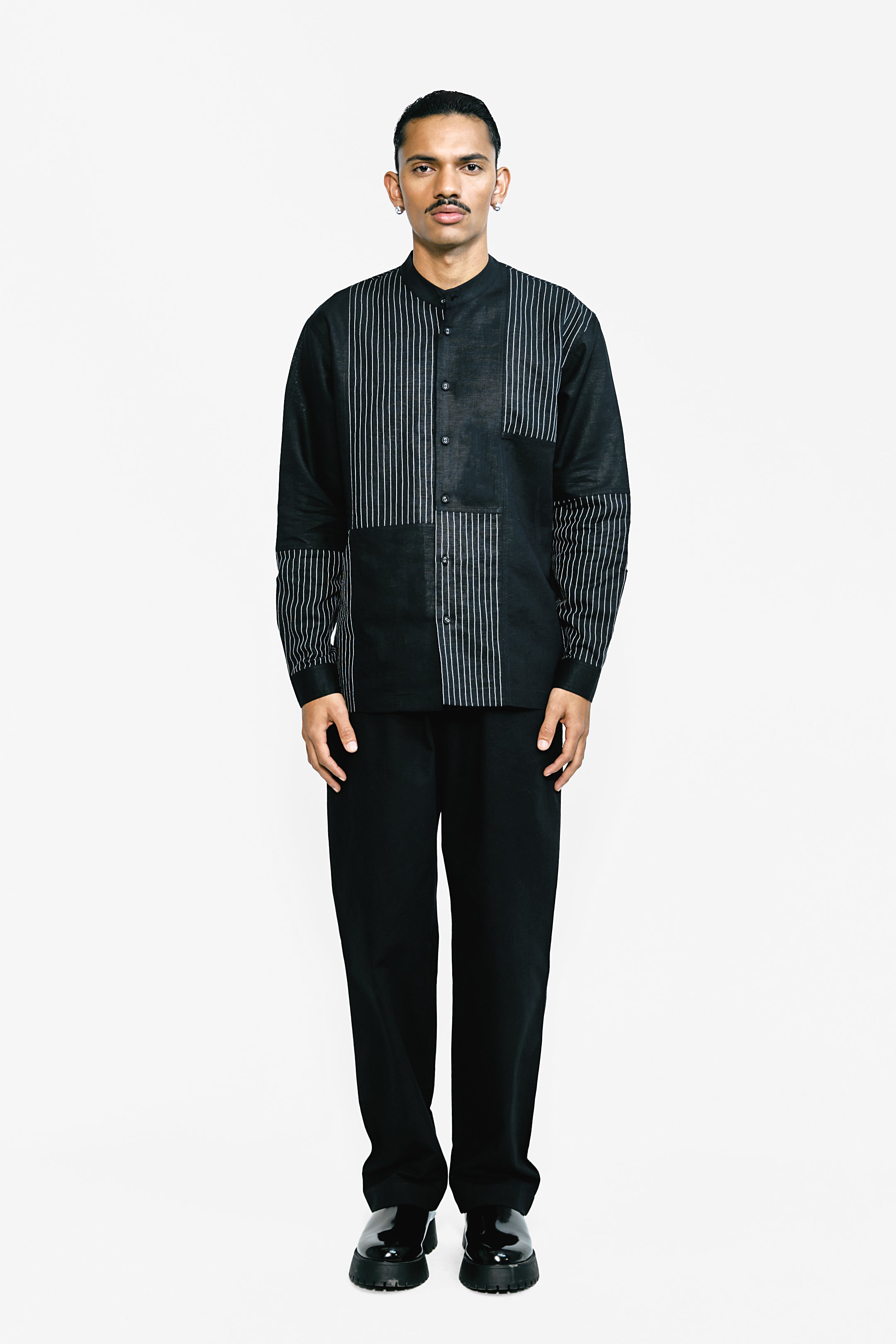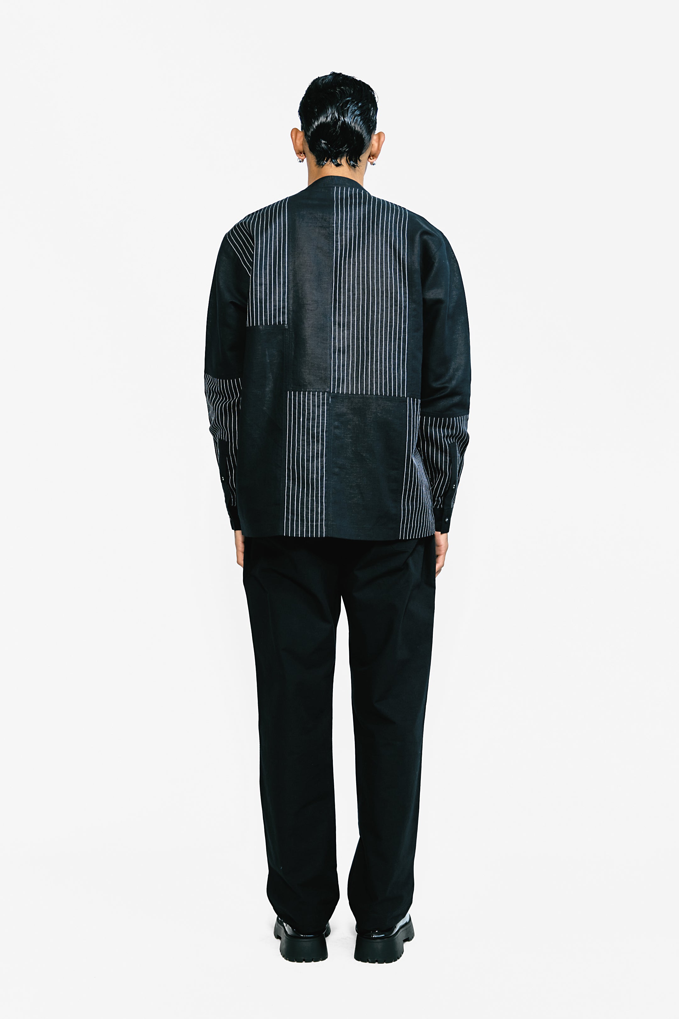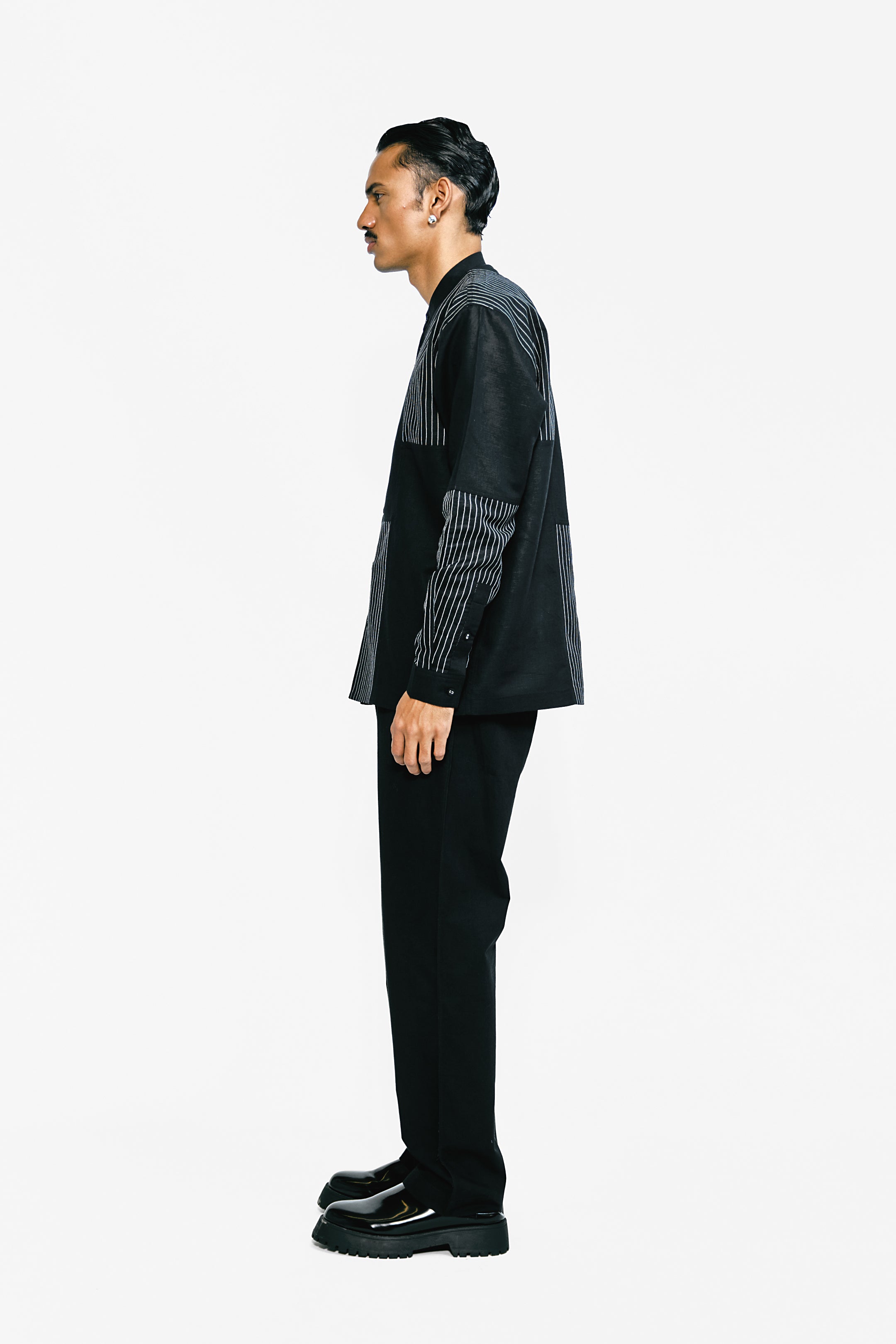 - Asymmetrical pinstripe paneling, adding a contemporary edge to a classic black silhouette.