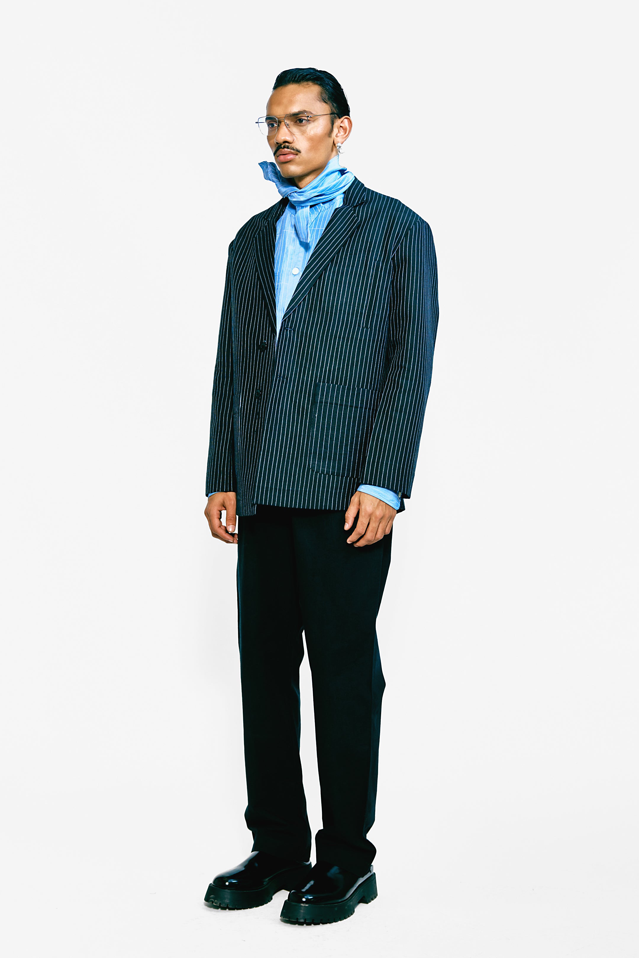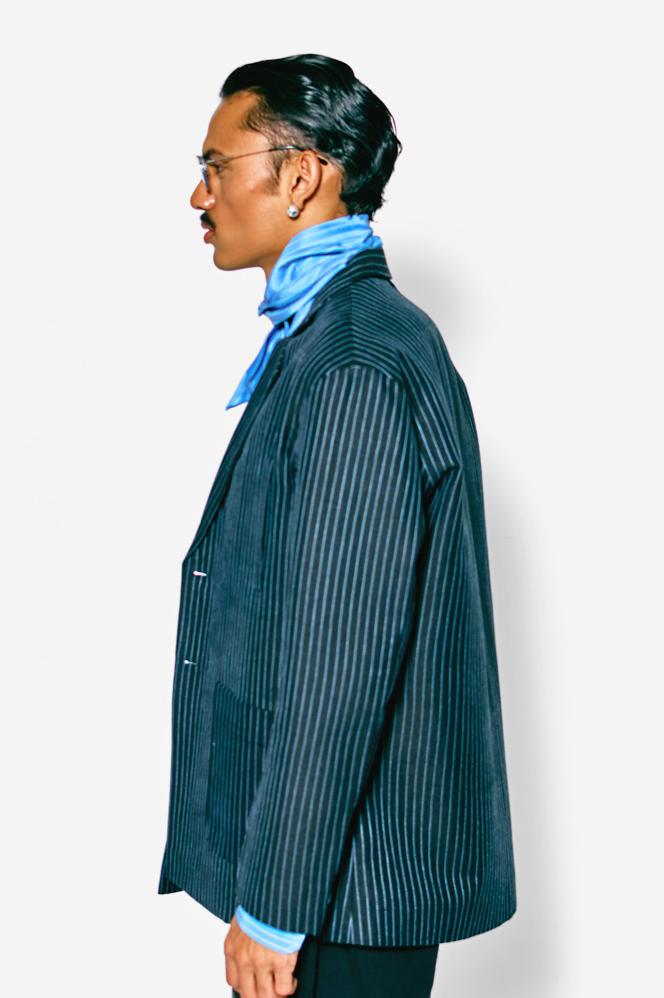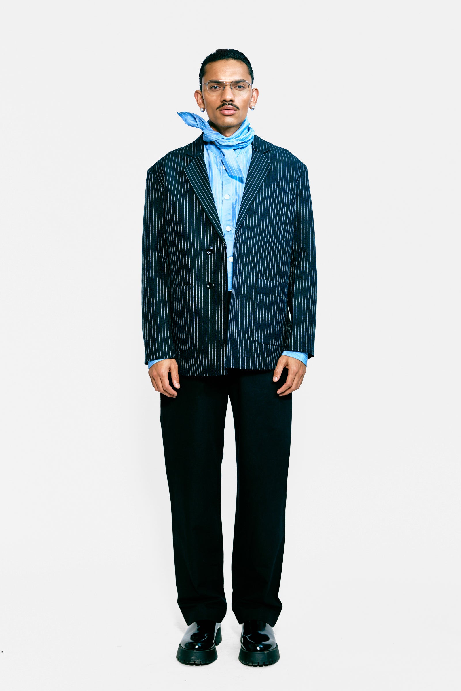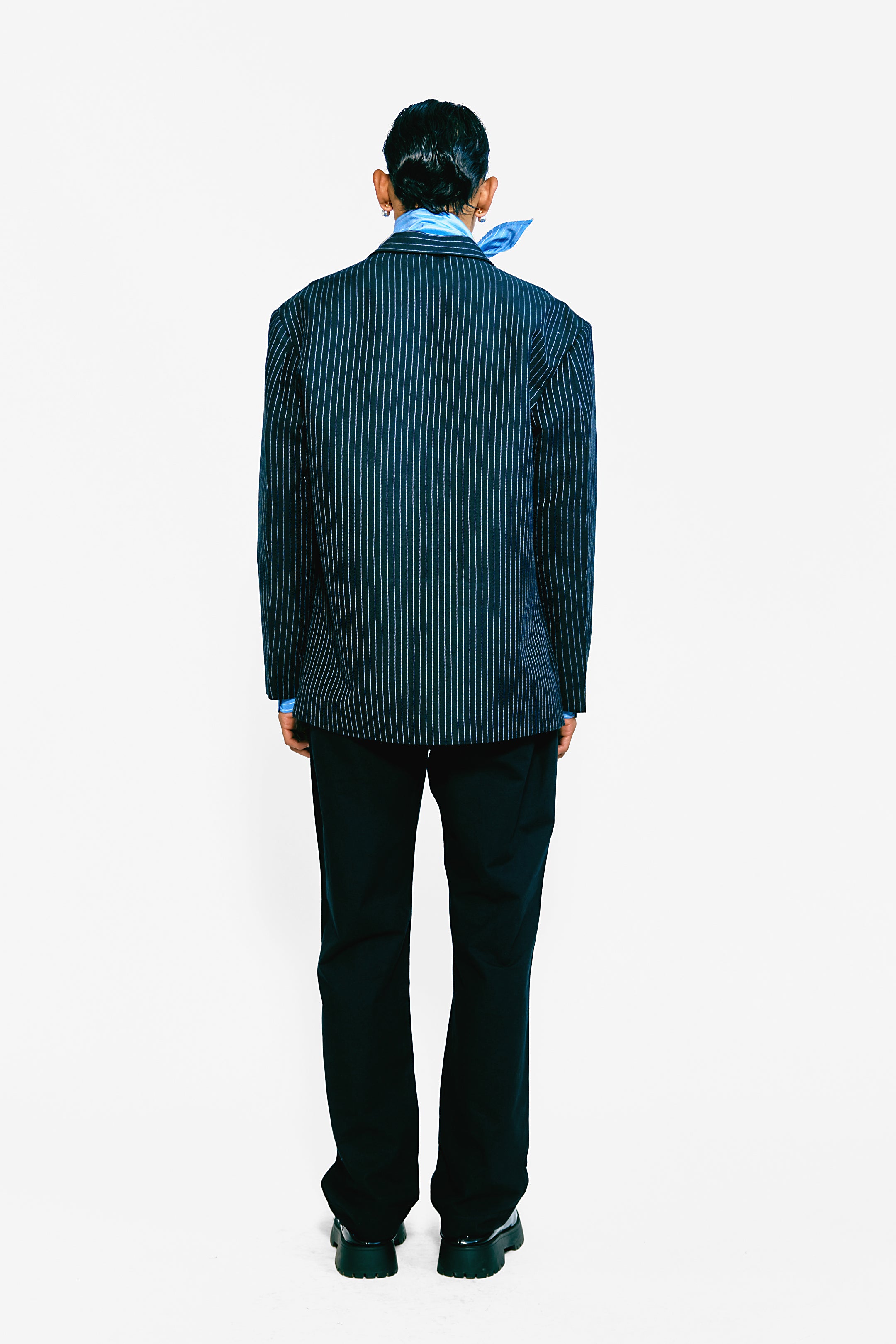 - Features a classic pinstripe pattern on a deep navy base, adding a timeless elegance to the silhouette.