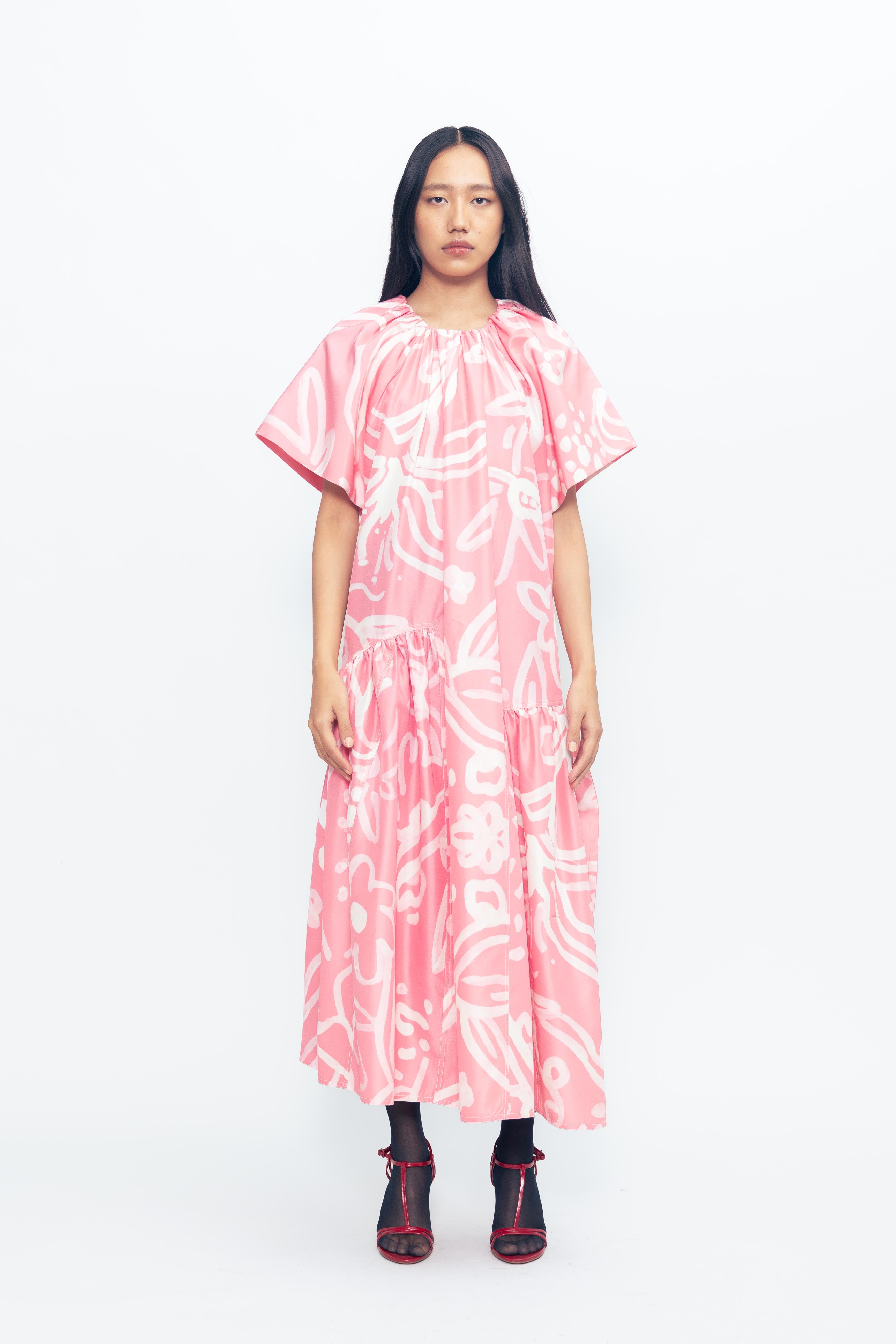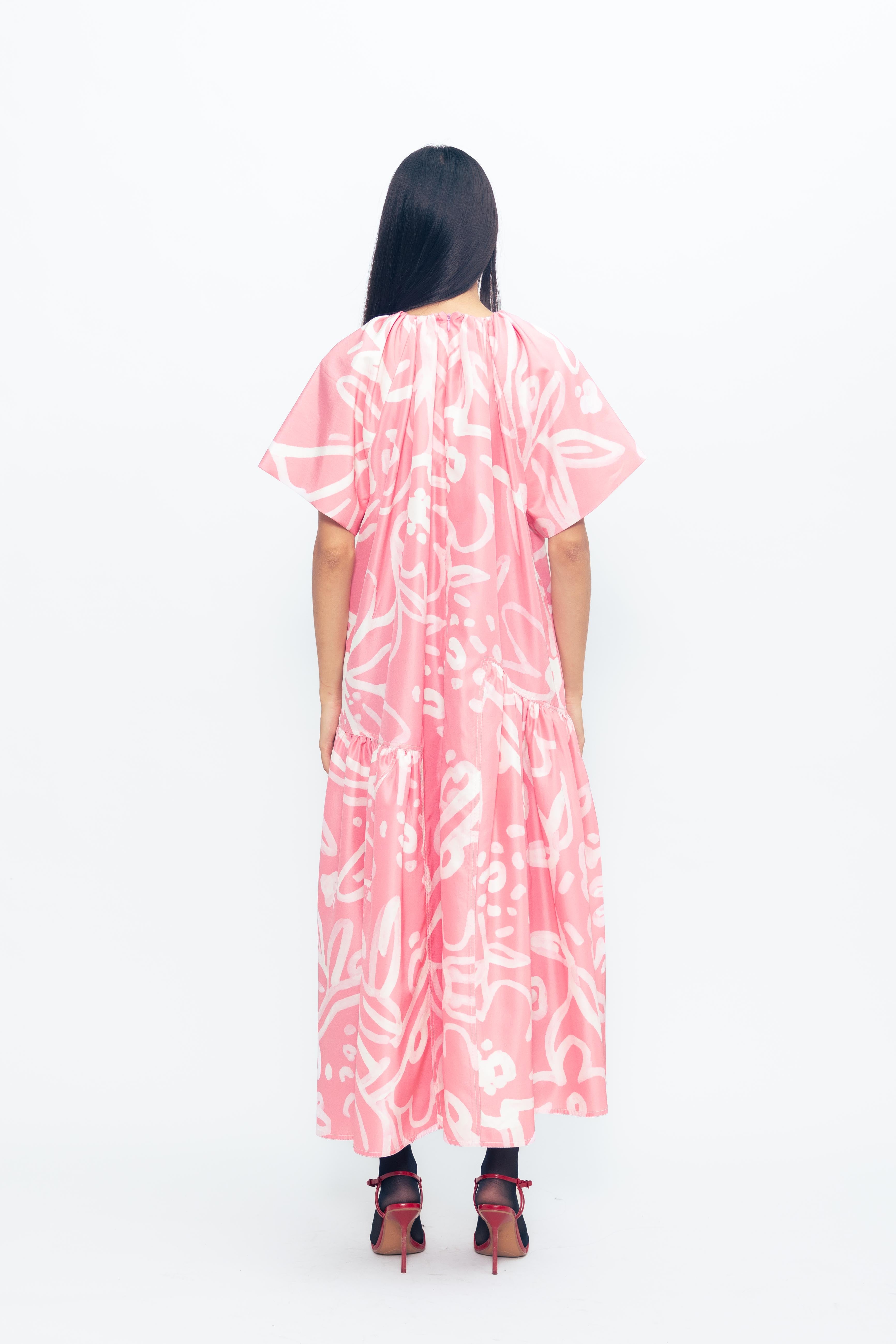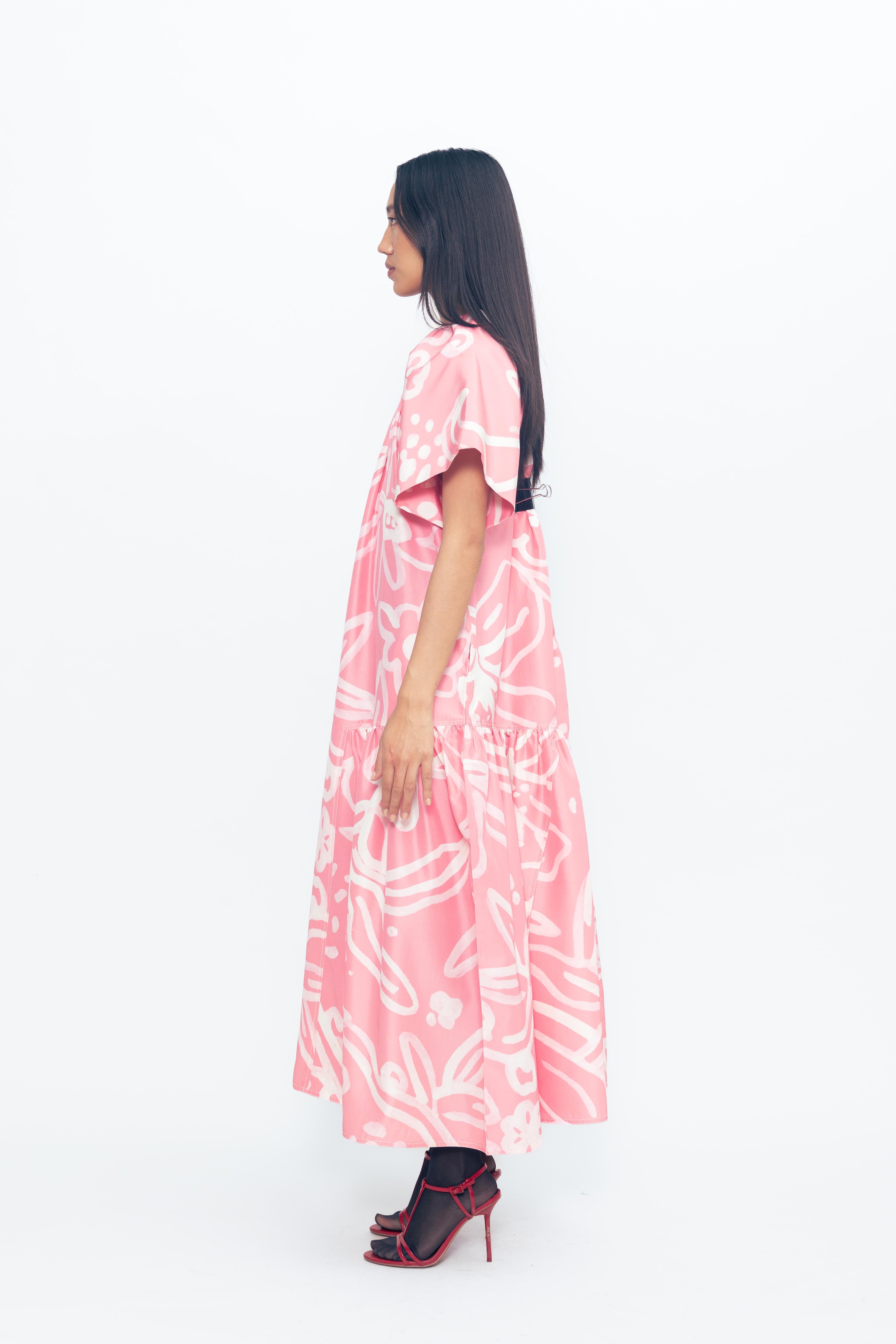 This breezy dress flows effortlessly with every step, designed for comfort without compromising on style. Asymmetrical ruffles add a playful, dynamic touch, while the fluid texture enhances its graceful movement. Featuring a whimsical all-over print, it captures a sense of lightness and creativity—perfect for days when ease and expression go hand in hand.